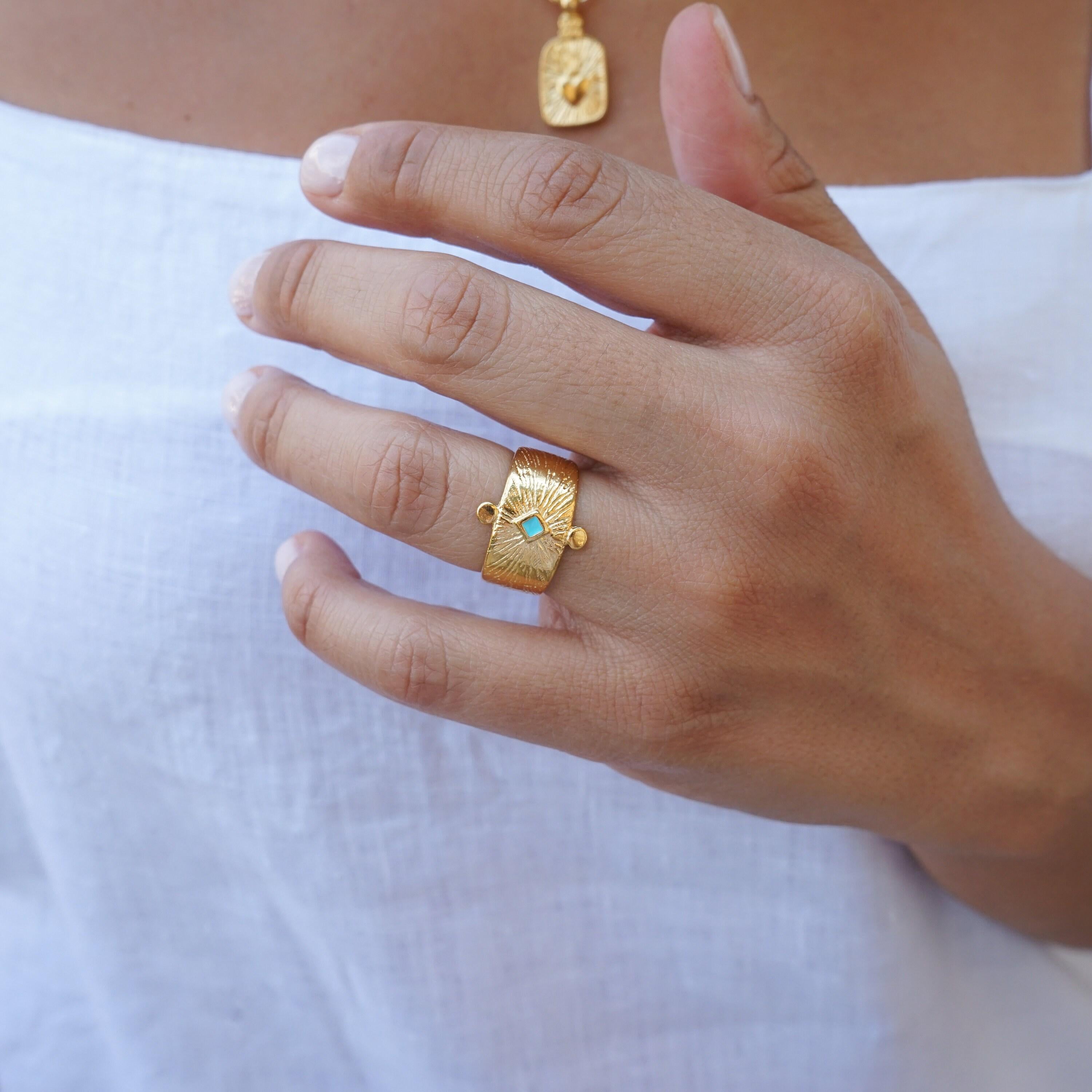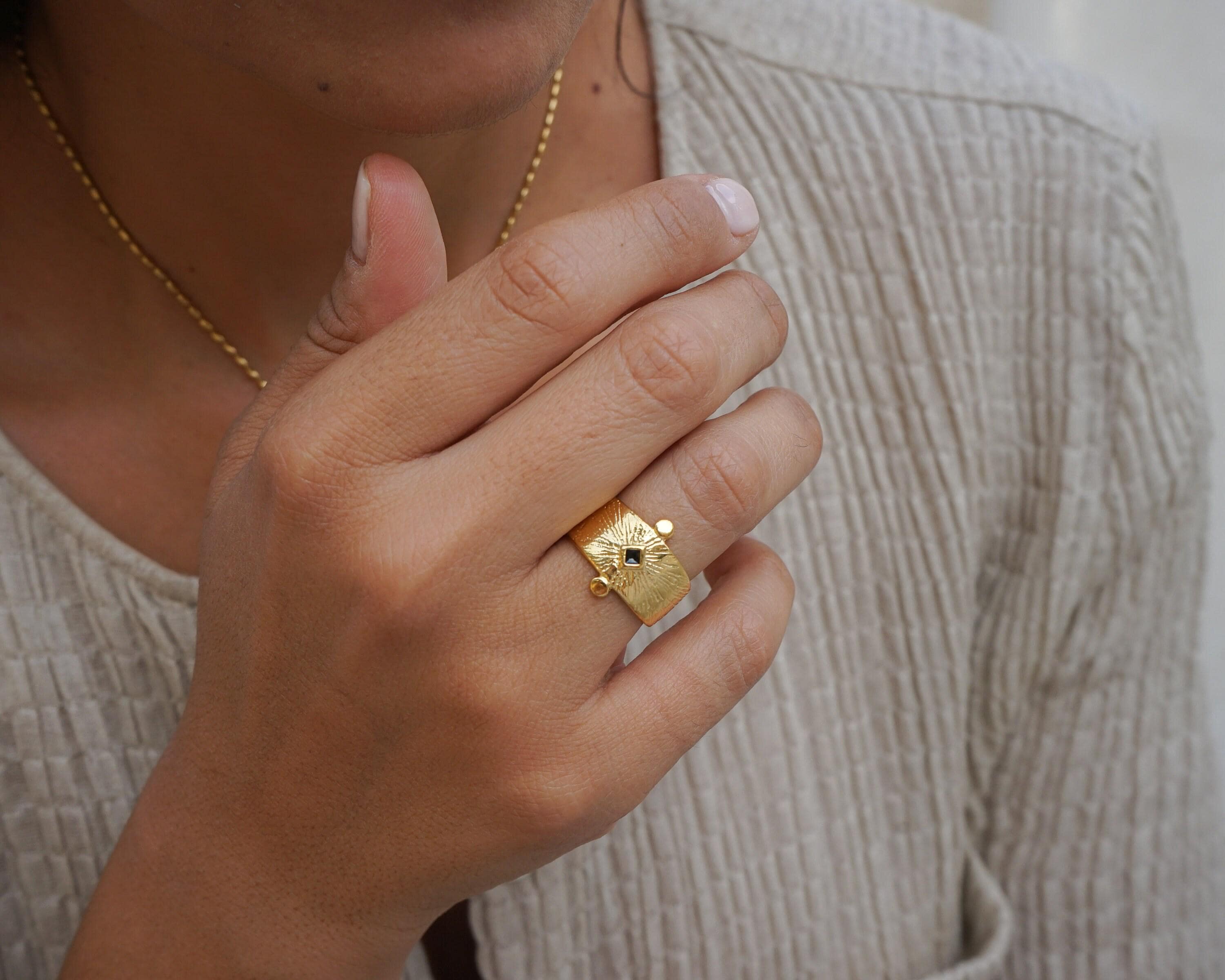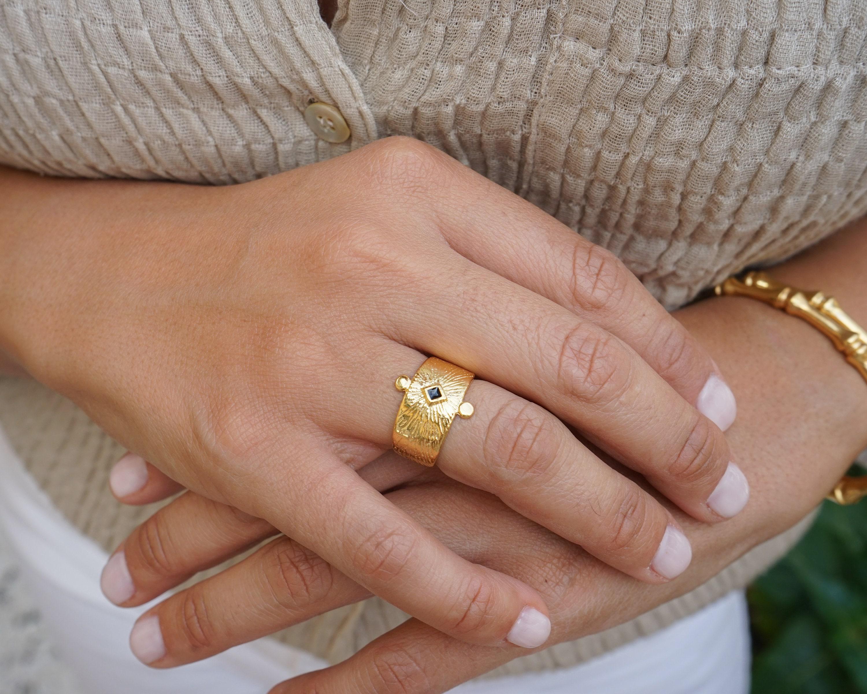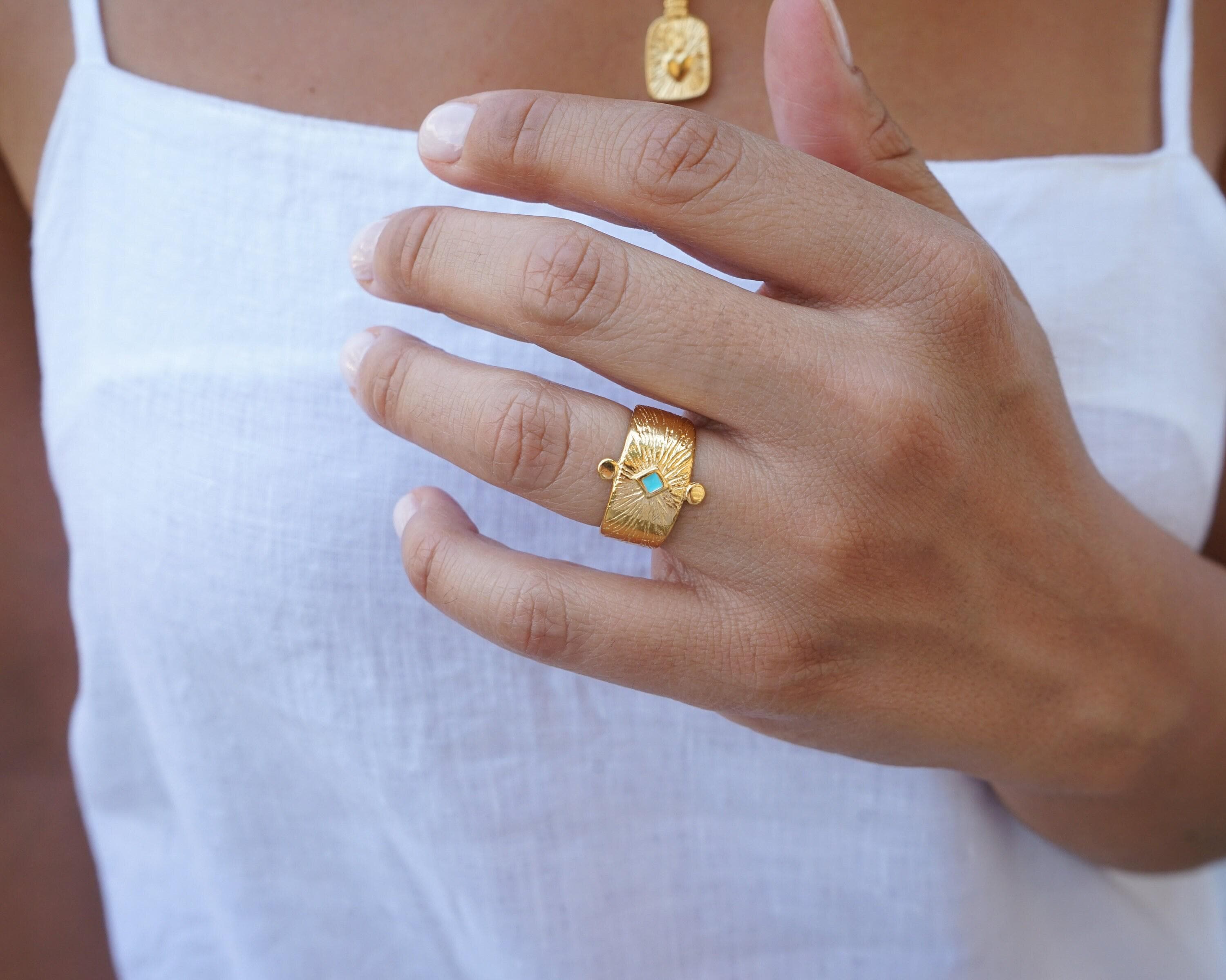 This beautiful statement ring offers an ethnic, bohemian flare to every outfit. Its simple design makes it a stylish statement.This unique design can be worn on the index, middle or ring finger. Wear it alone or in combination with other rings.• Adjustable size, Ring fits US size 6.5-7.5 inch• Internal diameter 17mm• Ring measurements 20.6x16.5 mm / 0.811x0.649in.• 24K gold plated zamak ring, Nickel Free, Lead Free--------------------------->>>>>>>>>> PLEASE READ <<<<<<<<<<---------------------------Adjustable rings are thinner so that their size can change and therefore extremely sensitive. You should adjust your adjustable ring ONLY ONCE to perfectly fit your desired finger. If the ring is reshaped and resized multiple times, the band will weaken.GIFTS OF LOVE
