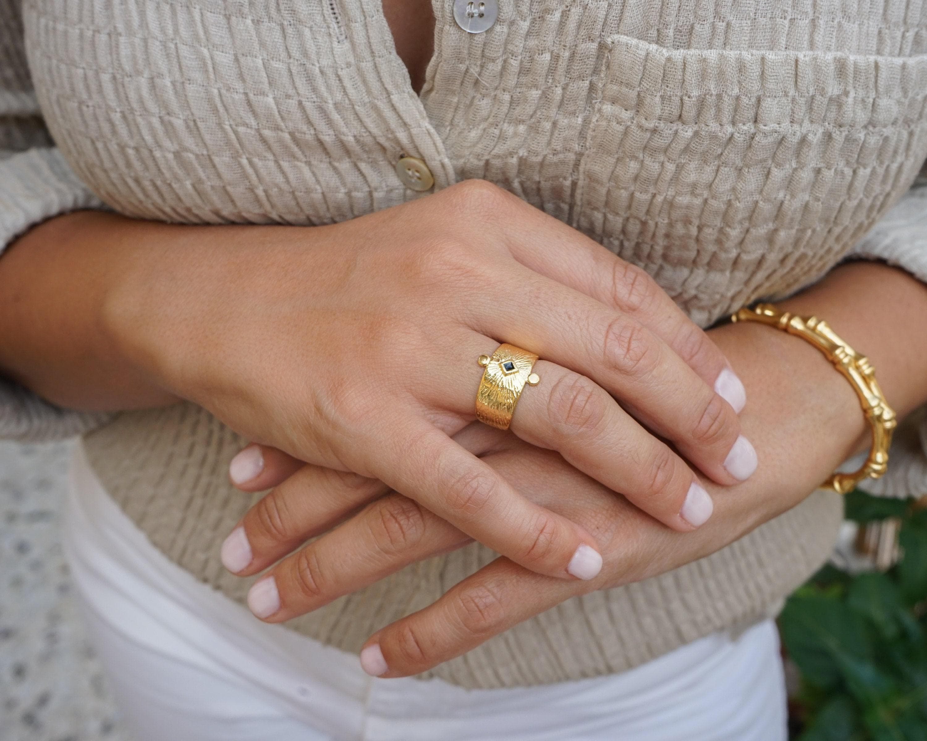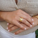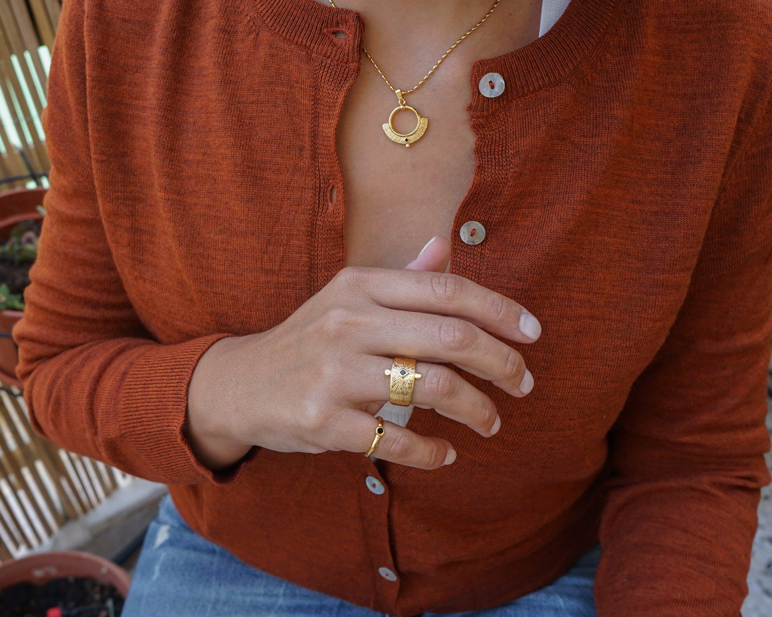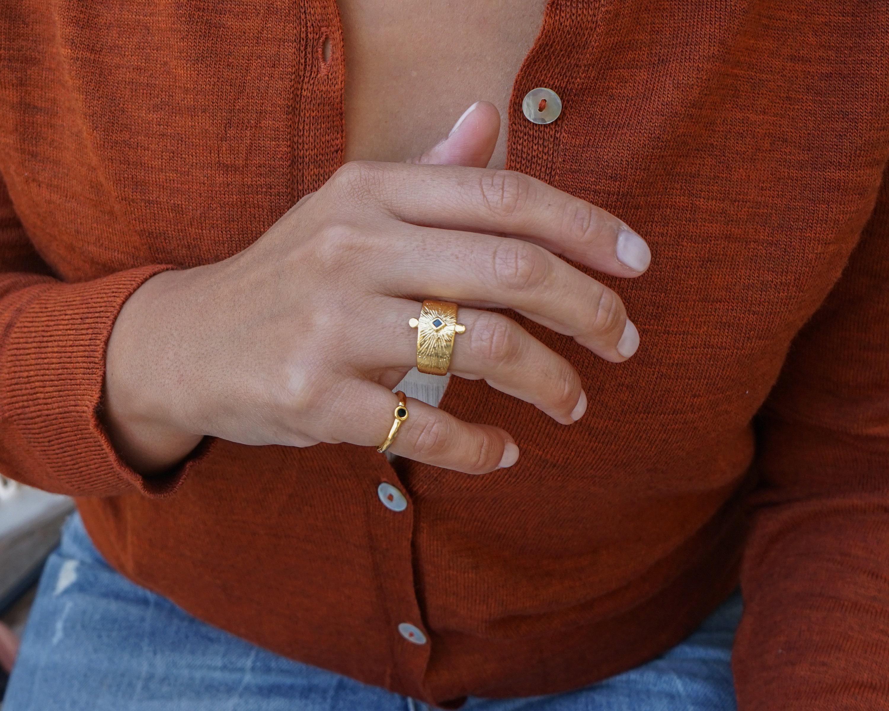 This beautiful statement ring offers an ethnic, bohemian flare to every outfit. Its simple design makes it a stylish statement.This unique design can be worn on the index, middle or ring finger. Wear it alone or in combination with other rings.• Adjustable size, Ring fits US size 6.5-7.5 inch• Internal diameter 17mm• Ring measurements 20.6x16.5 mm / 0.811x0.649in.• 24K gold plated zamak ring, Nickel Free, Lead Free--------------------------->>>>>>>>>> PLEASE READ <<<<<<<<<<---------------------------Adjustable rings are thinner so that their size can change and therefore extremely sensitive. You should adjust your adjustable ring ONLY ONCE to perfectly fit your desired finger. If the ring is reshaped and resized multiple times, the band will weaken.GIFTS OF LOVE