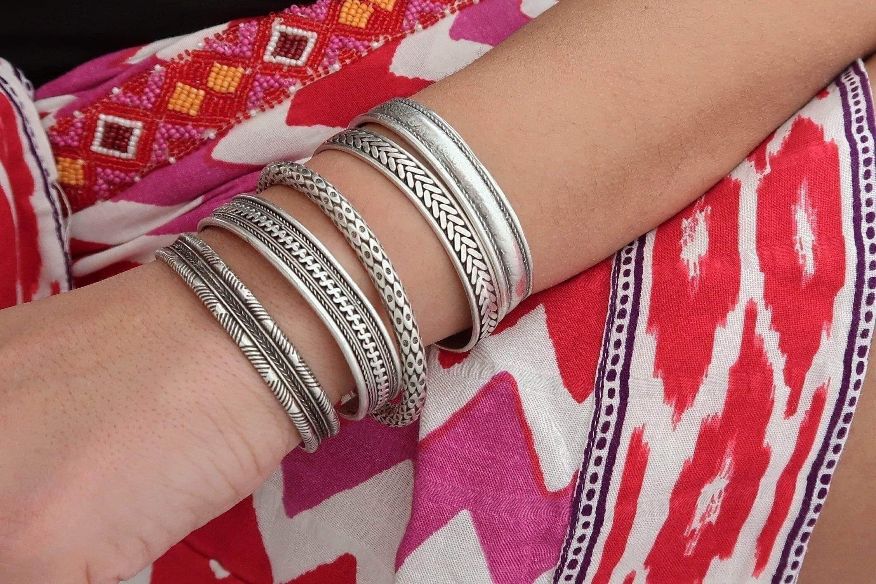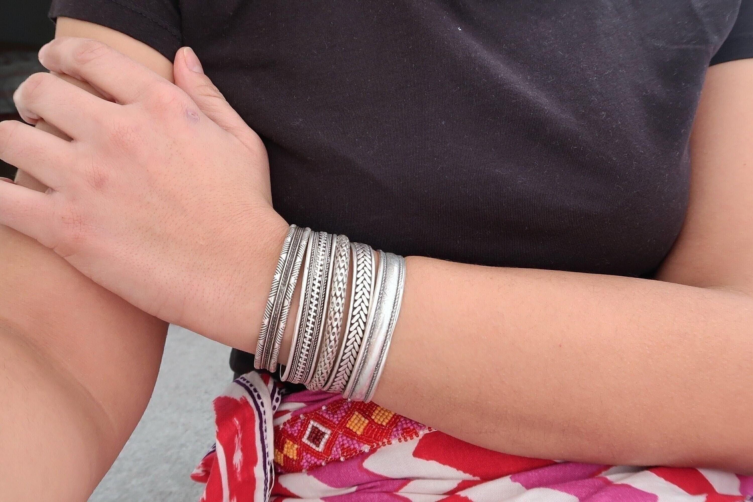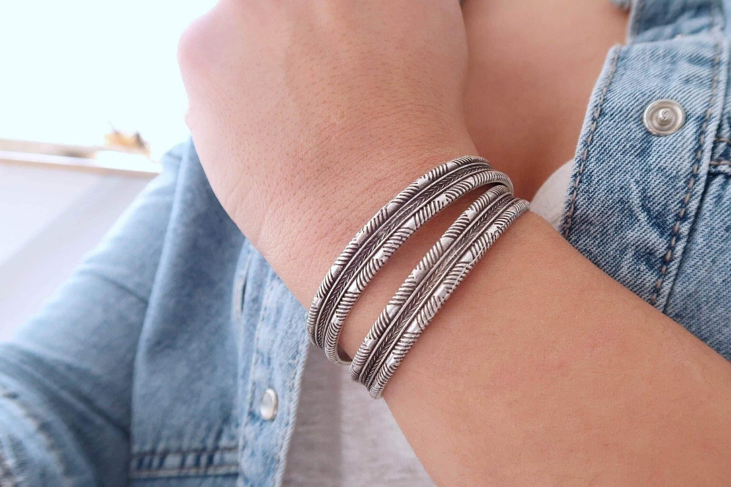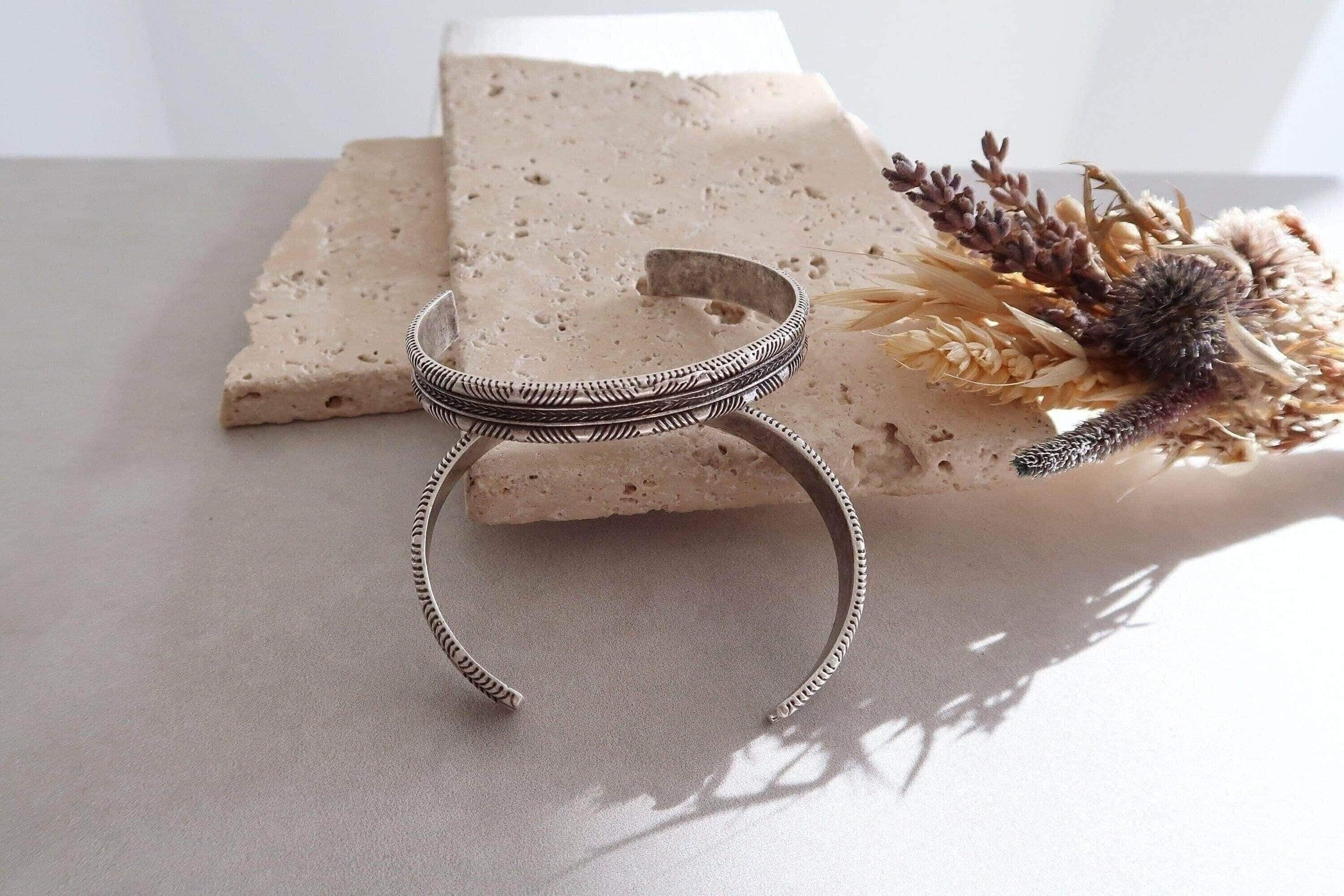This silver-plated cuff bracelet, crafted with an antique vintage look, features a unique Native American-inspired design that exudes timeless elegance and cultural charm. The intricate detailing, combined with a black patina finish, gives this piece a distinctive character that complements both modern and traditional styles.