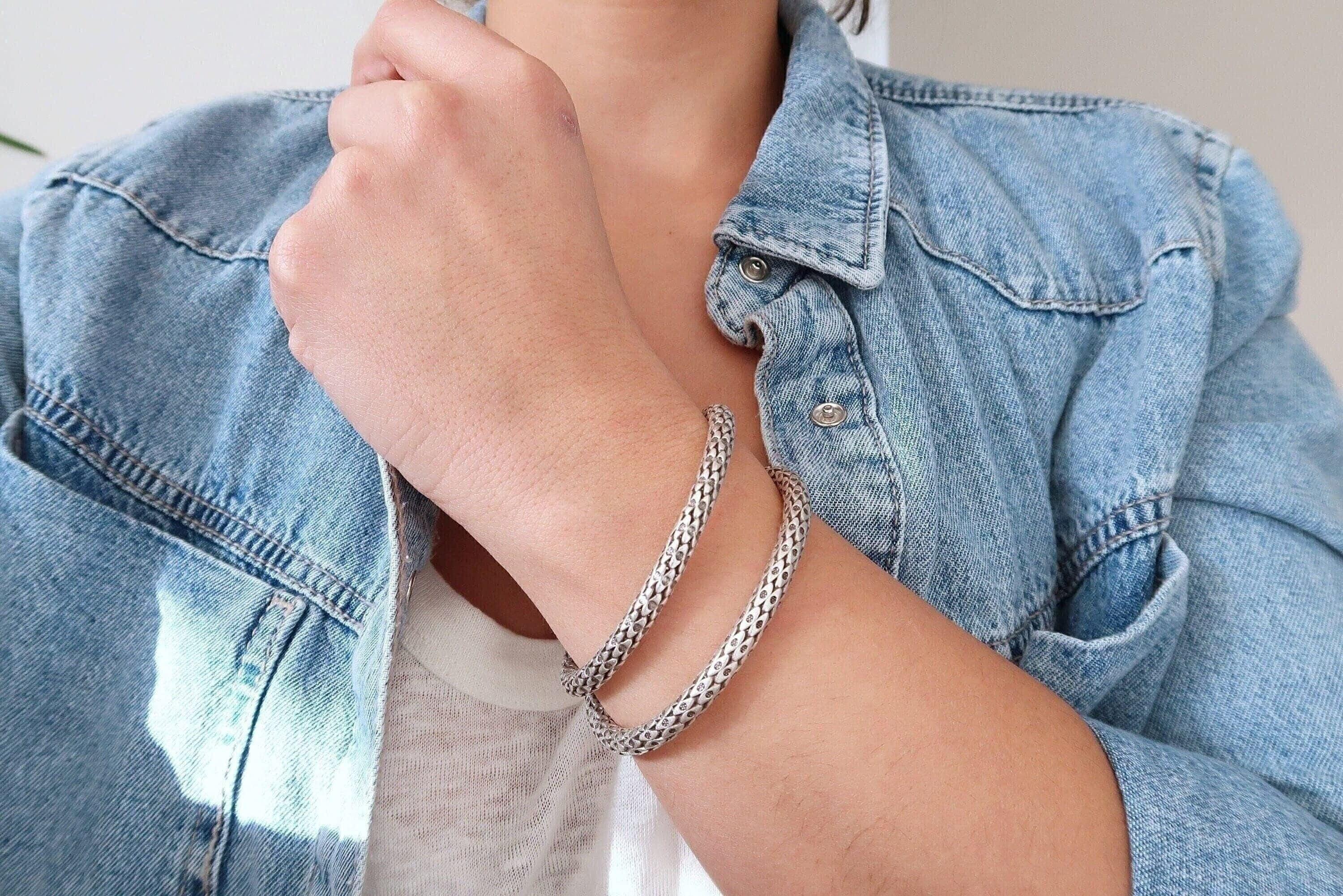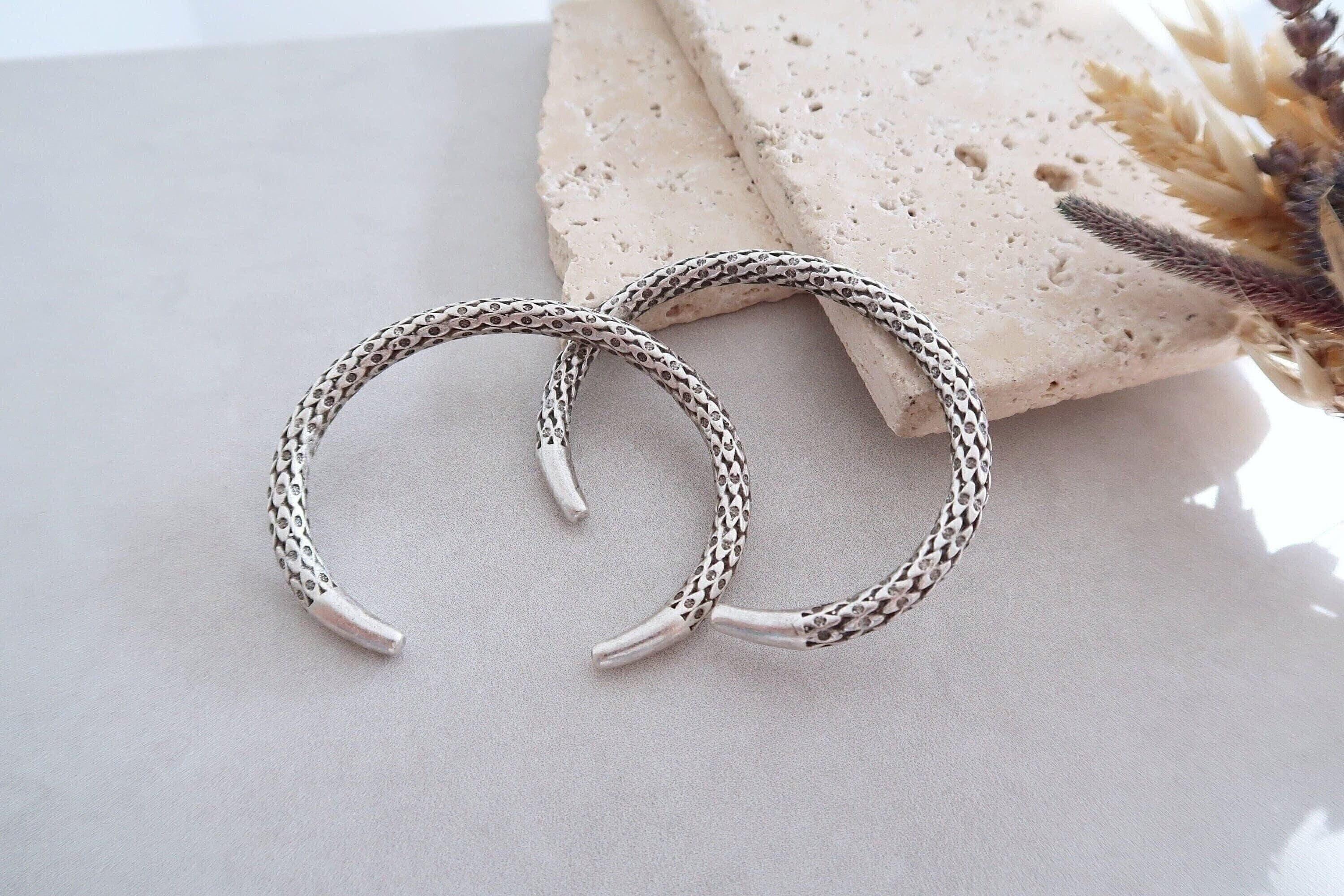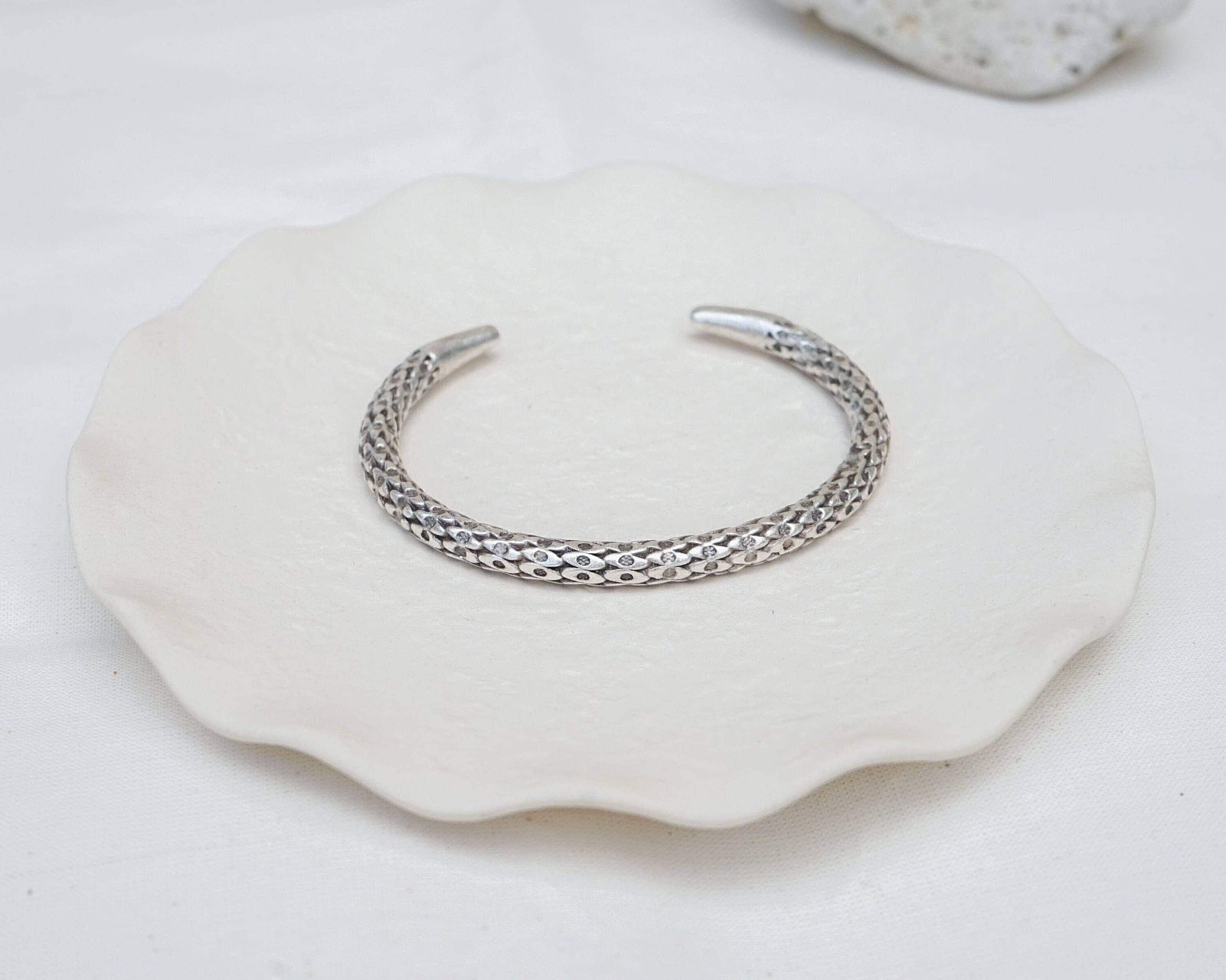 This silver-plated cuff bracelet, crafted with an antique vintage look, features a unique and intricate snakeskin design. The black patina finish enhances its textured details, giving it a bold and sophisticated character that stands out in any jewelry collection.