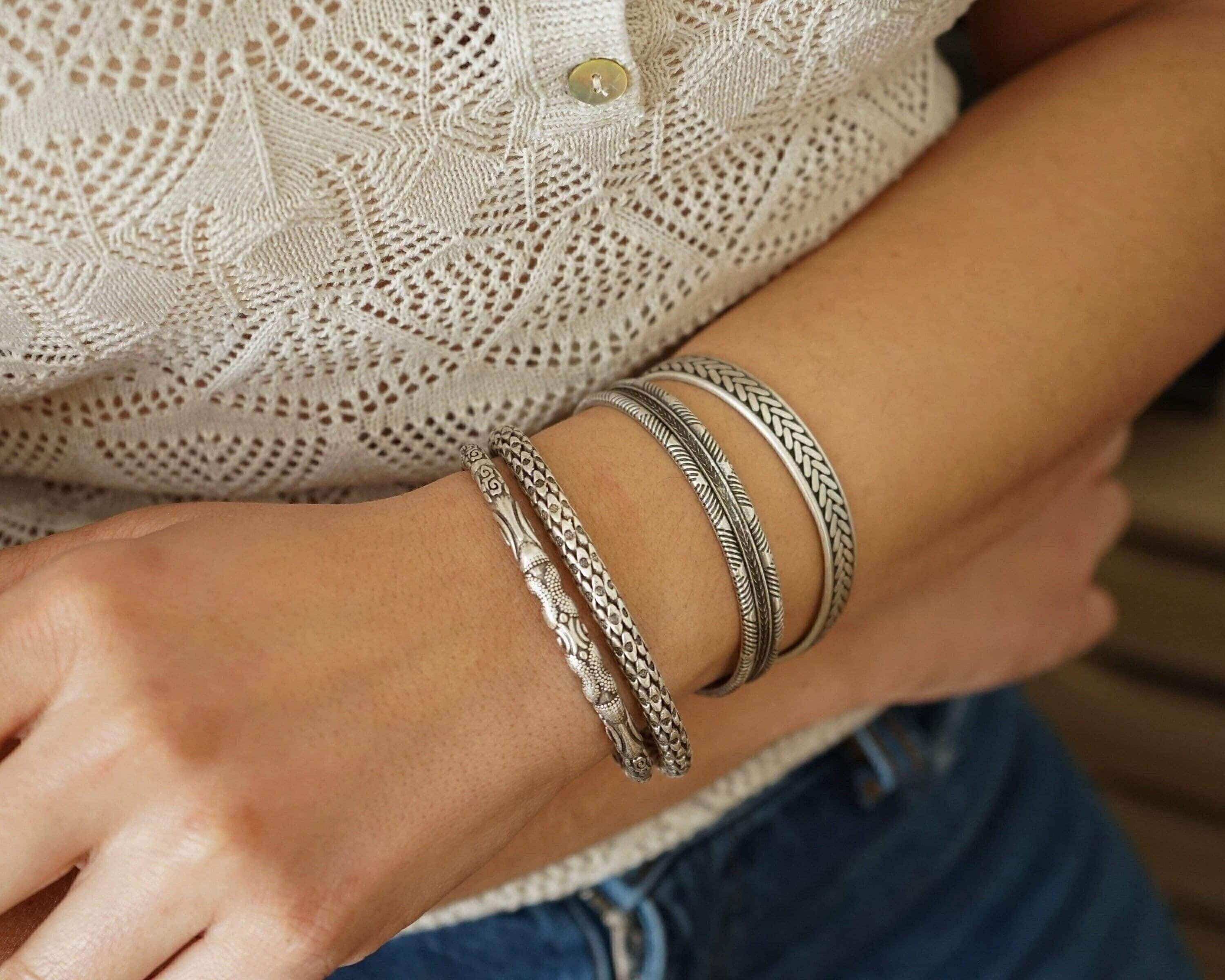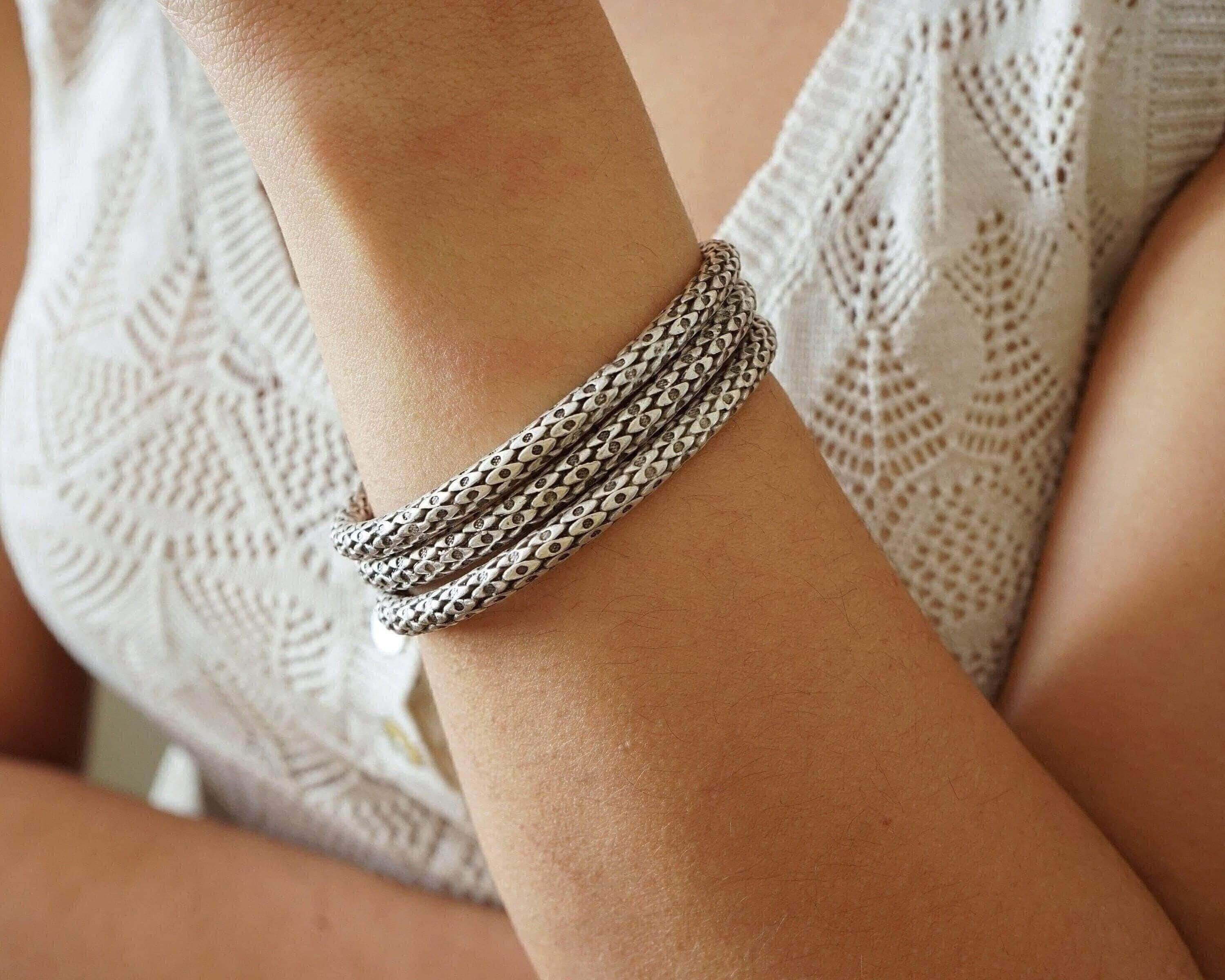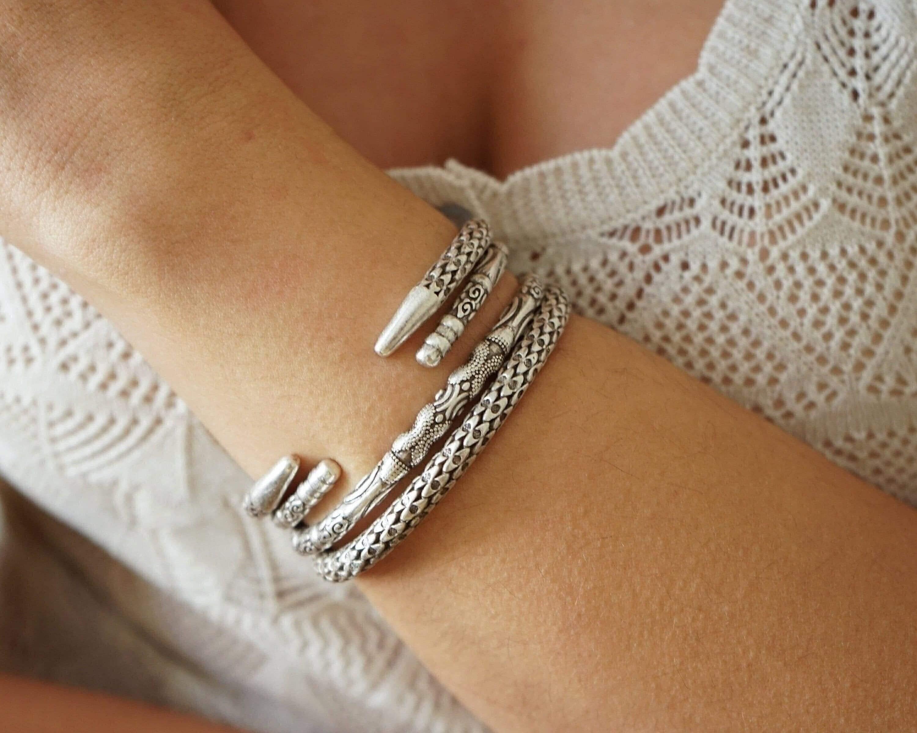 This silver-plated cuff bracelet, crafted with an antique vintage look, features a unique and intricate snakeskin design. The black patina finish enhances its textured details, giving it a bold and sophisticated character that stands out in any jewelry collection.