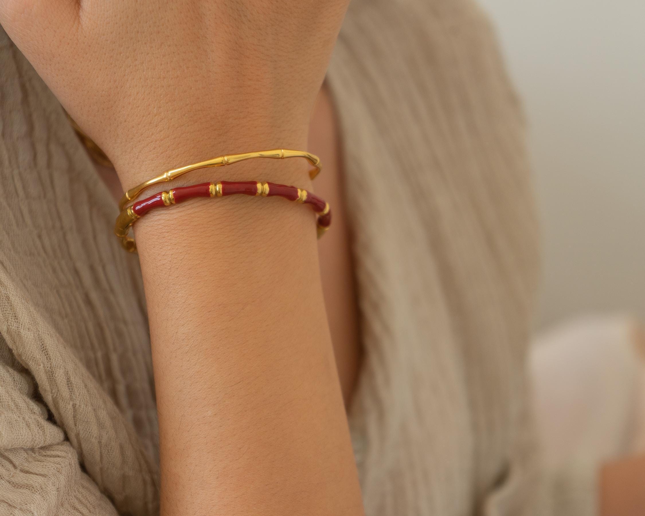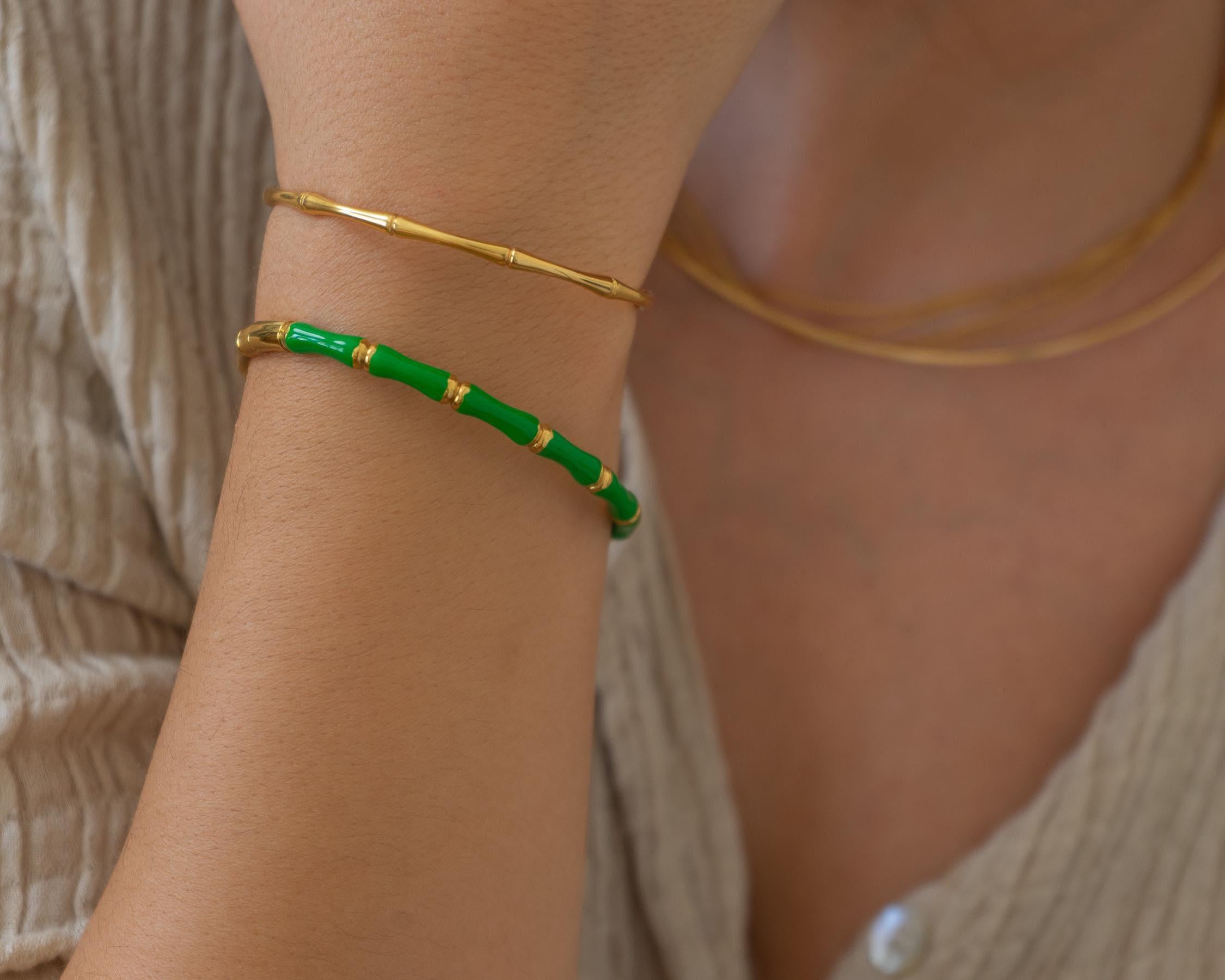 This beautifully crafted Bamboo Bracelet, accented with vibrant colored enamel, combines elegance with a celebration of nature. Inspired by the delicate stem of the bamboo plant, its design reflects minimalism and eco-consciousness. Choose your favorite color from the dropdown menu to personalize this unique accessory.