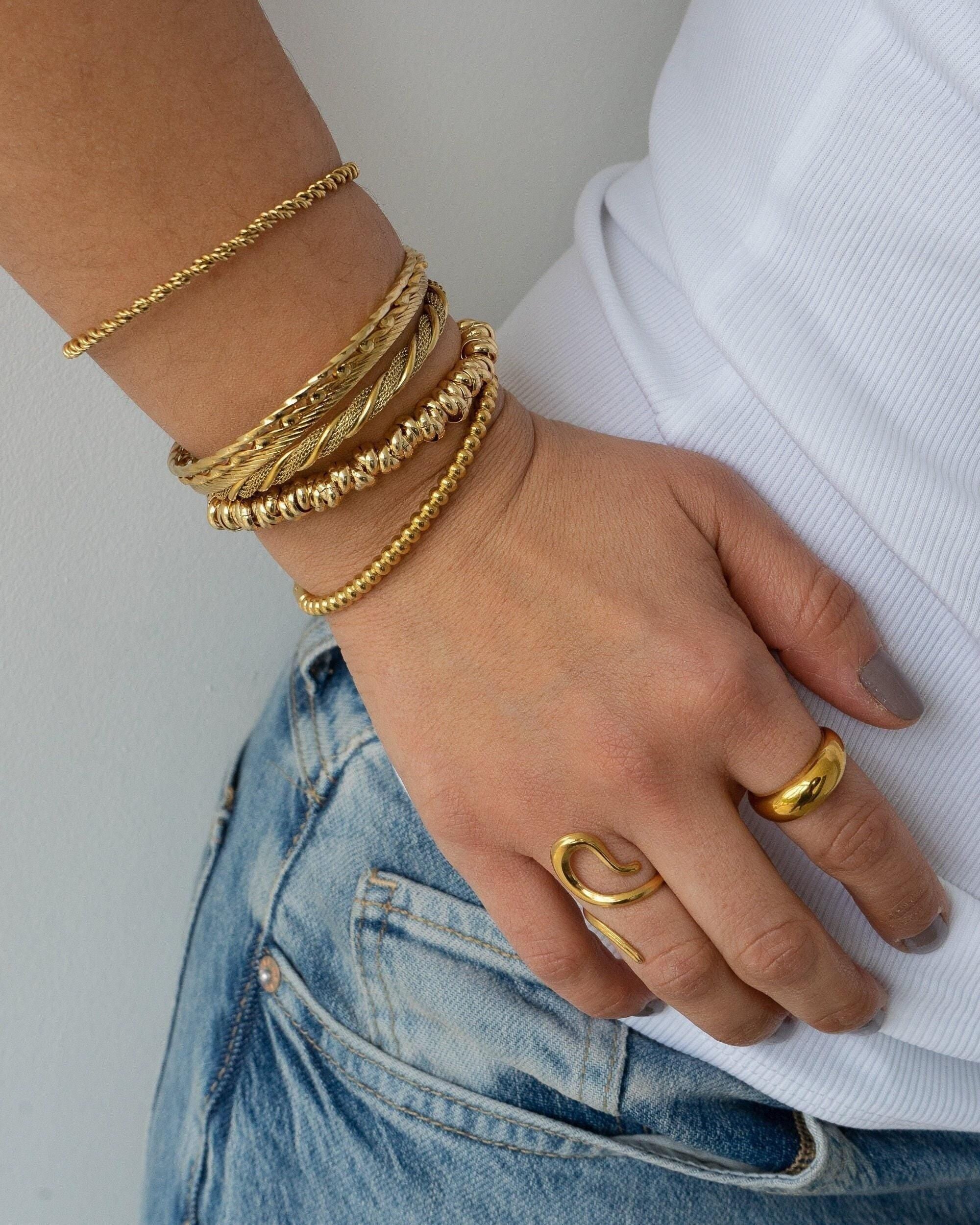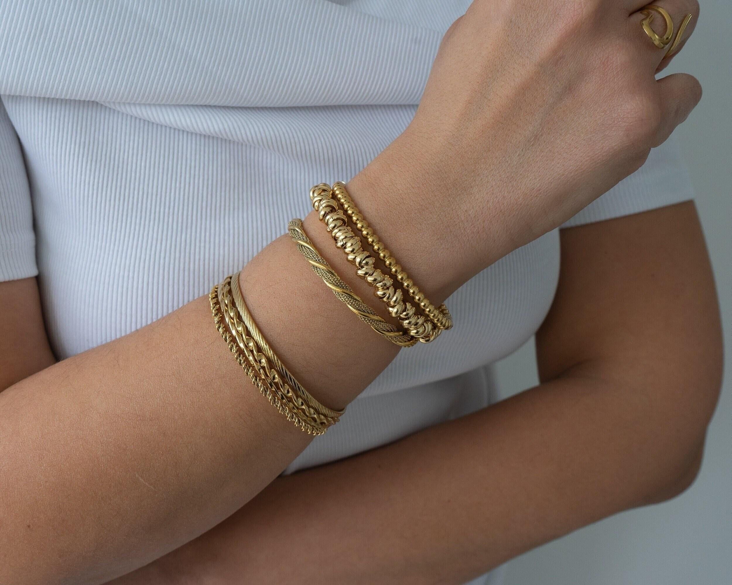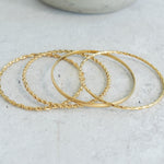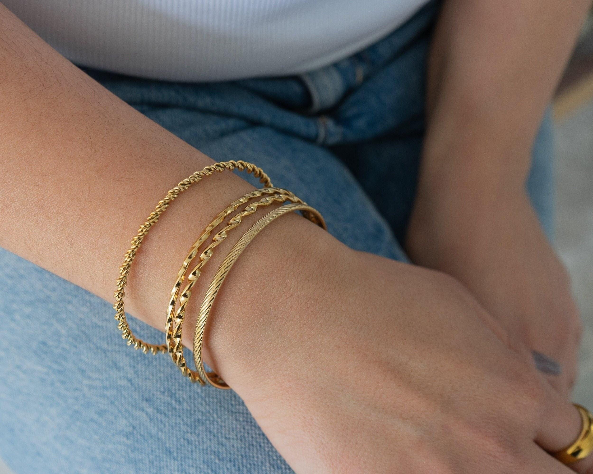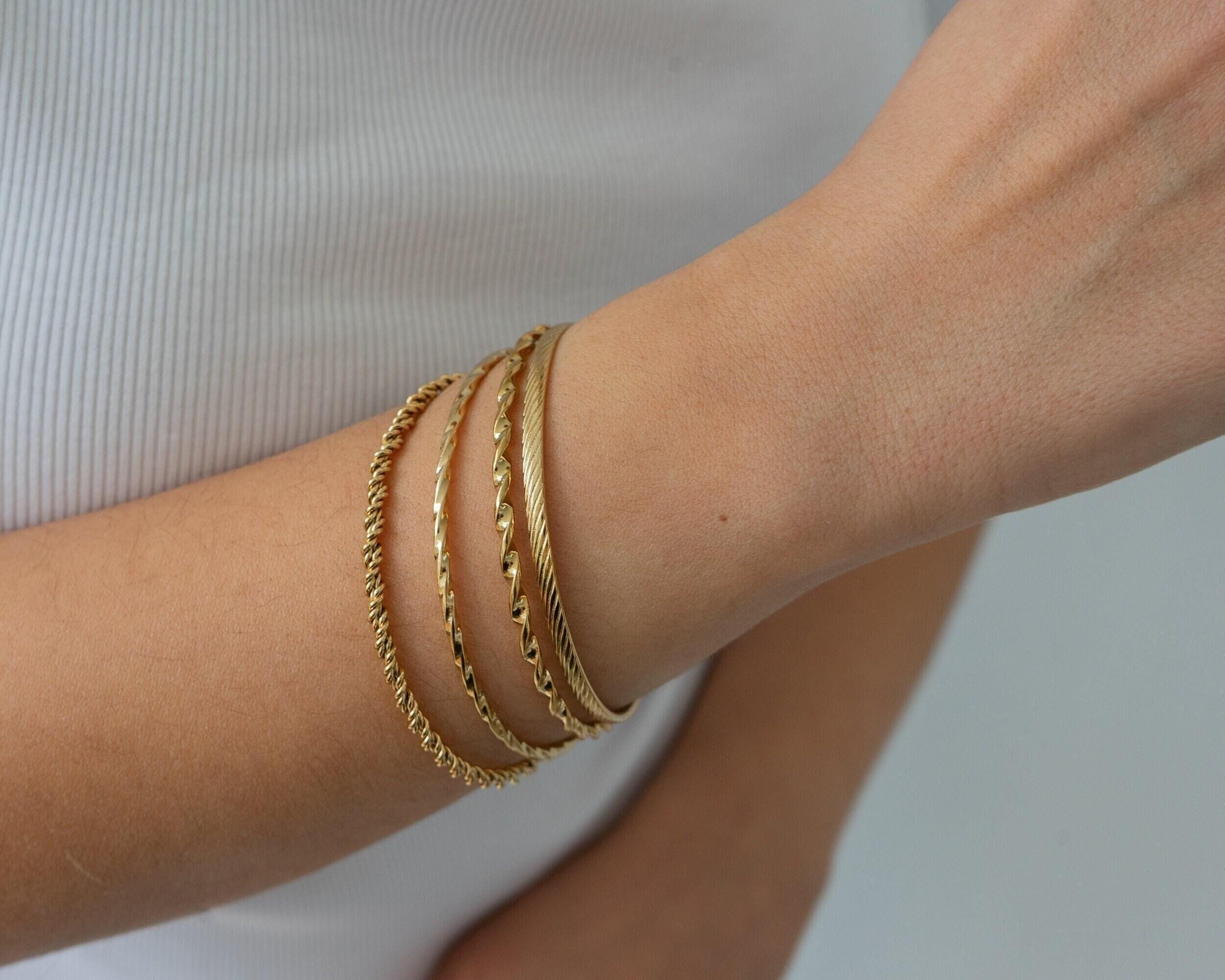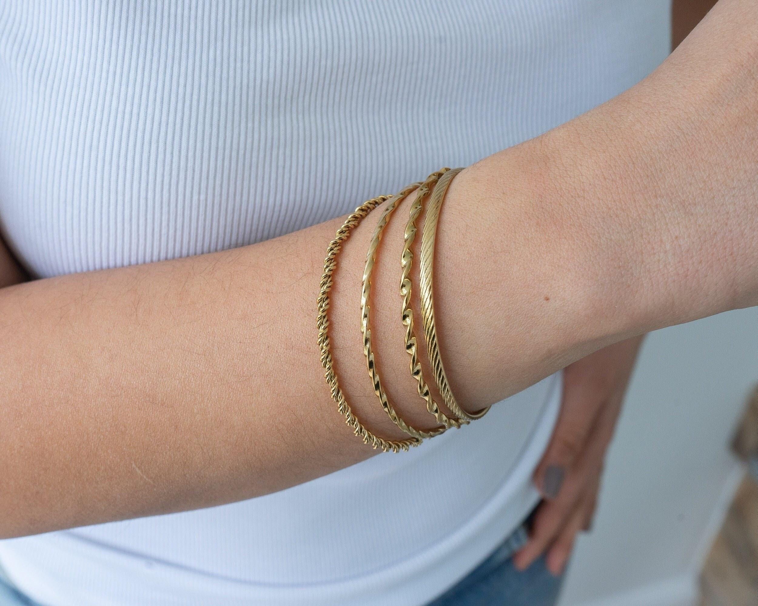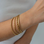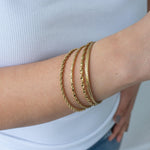 This thin, dainty gold braided bangle is a timeless addition to any bracelet collection. Available in four unique designs, it offers versatility and elegance that make it perfect for mixing and matching with other cuffs and bangles. Its sleek braided texture adds a touch of sophistication, making it a must-have accessory for both casual and formal occasions.