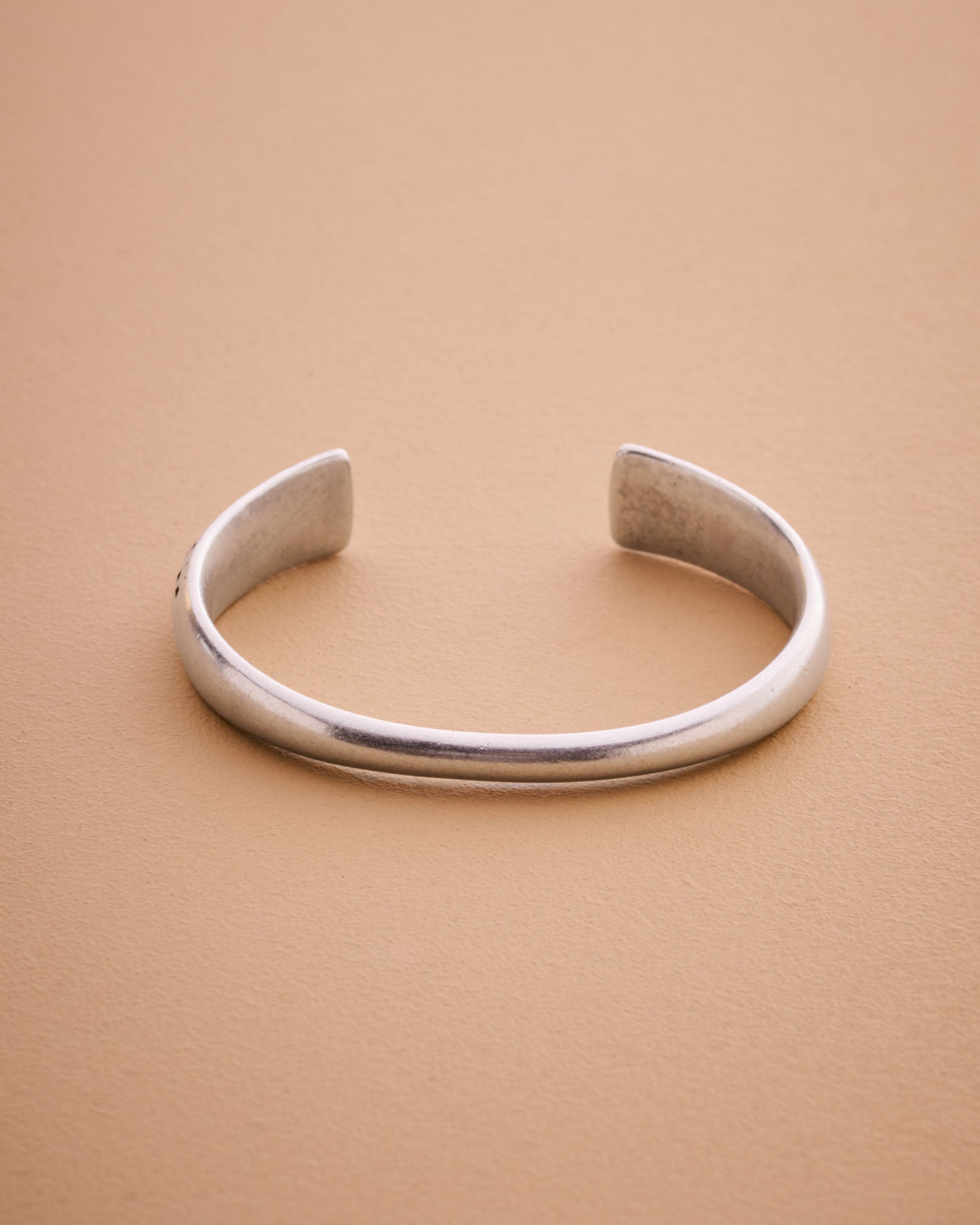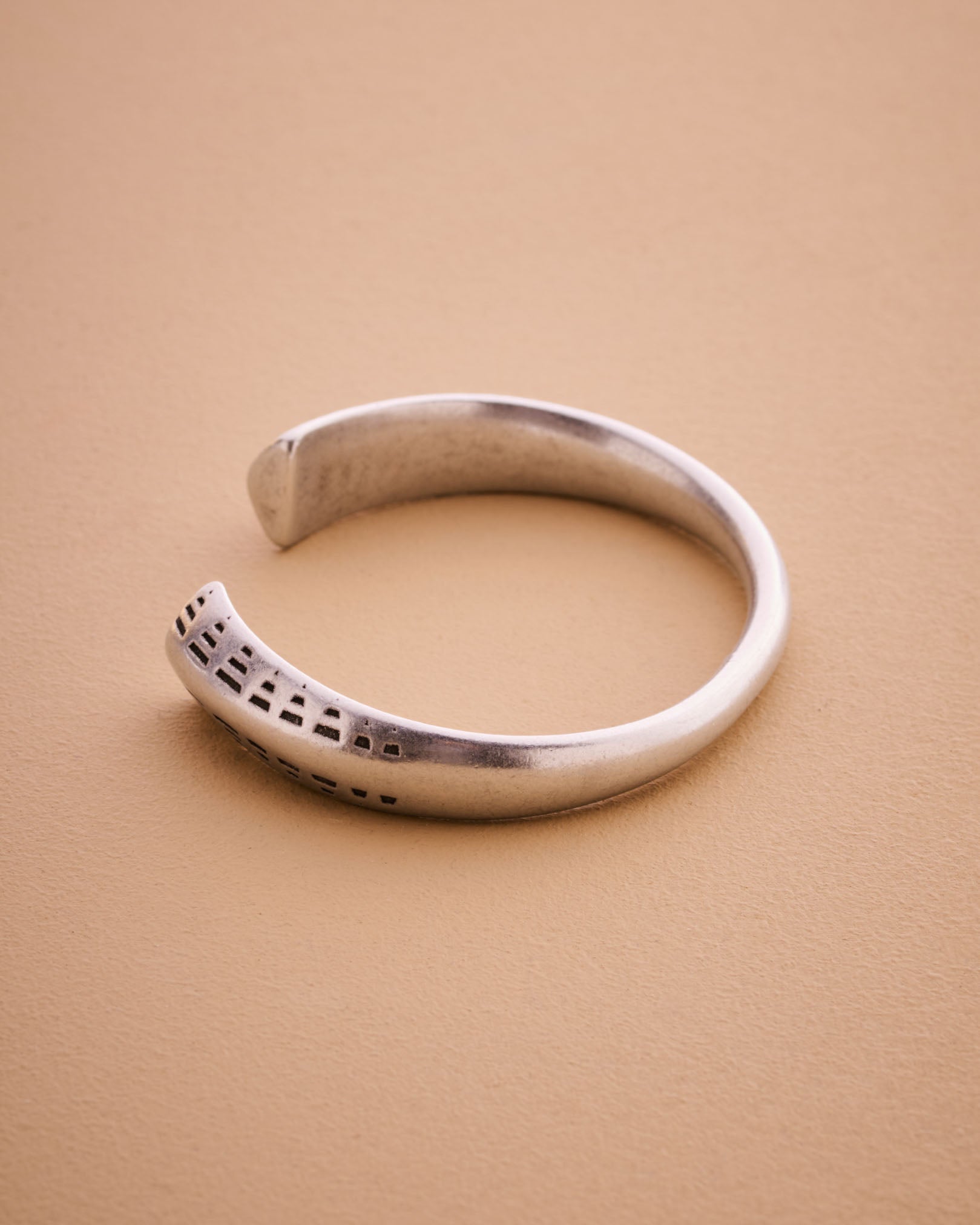 This silver-plated cuff bracelet features an antique vintage look with engraved ethnic tribal details. Its open design and black patina plating enhance its timeless charm, making it a standout accessory. Perfect for mixing and matching with other cuffs and bangles, this piece adds a touch of elegance and individuality to any outfit.