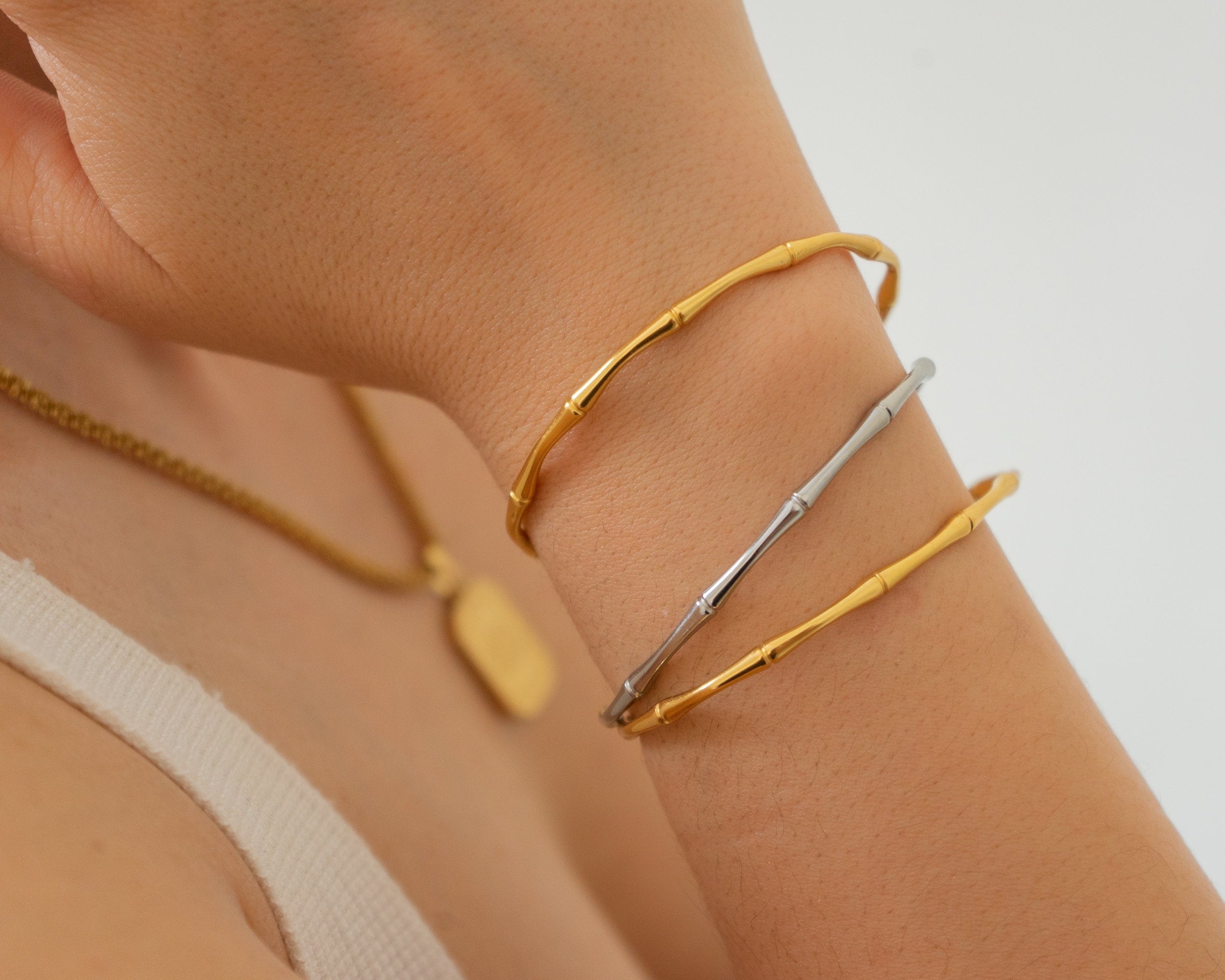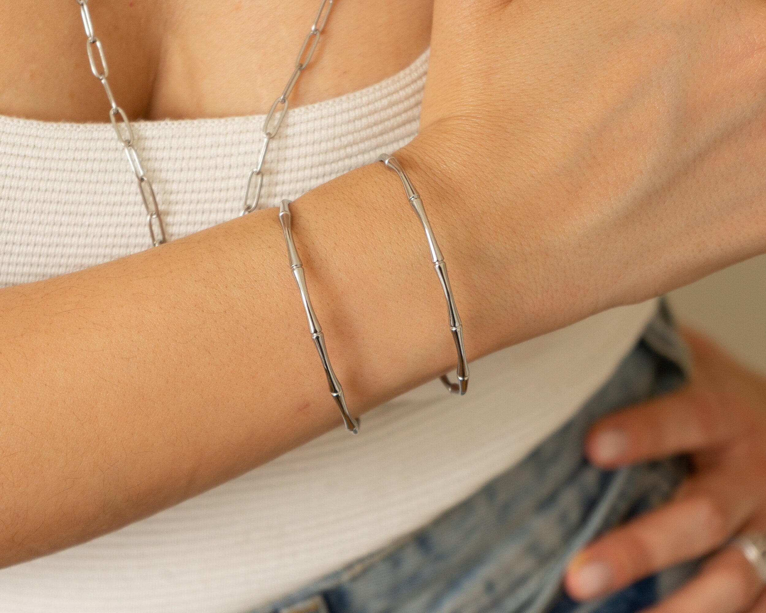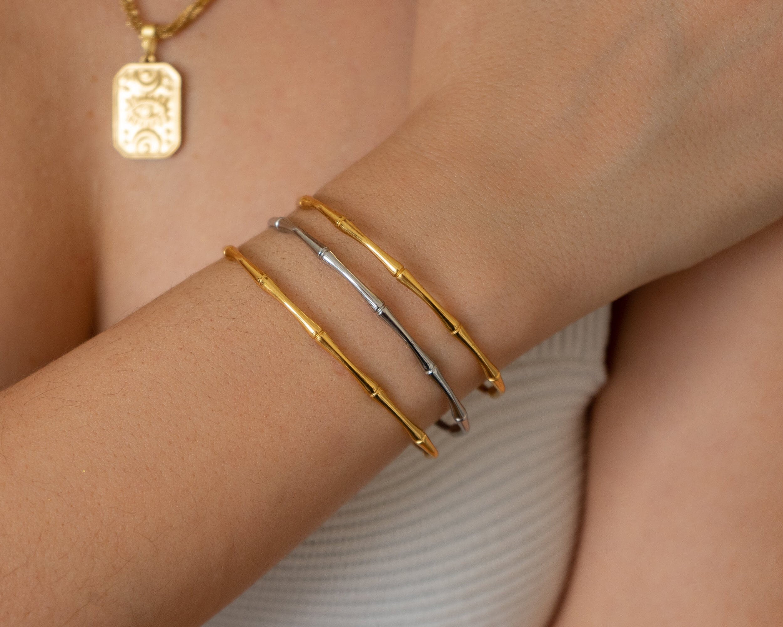 This beautifully crafted Bamboo Bracelet draws inspiration from the elegant stem of the bamboo plant, celebrating nature and the minimalist way of life. Made from durable stainless steel, it is water-resistant and perfect for complementing your beach or bohemian style. Its sturdy design ensures durability, making it a timeless addition to your jewelry collection.