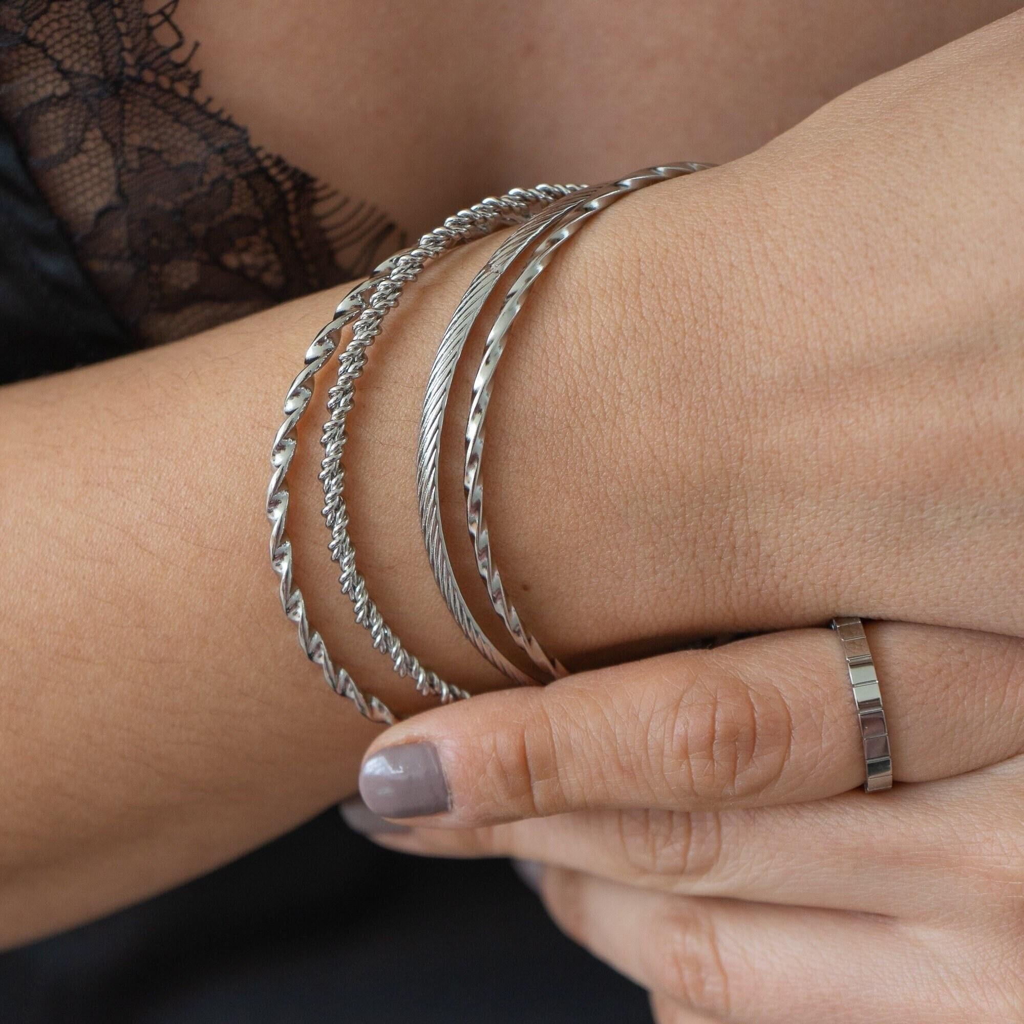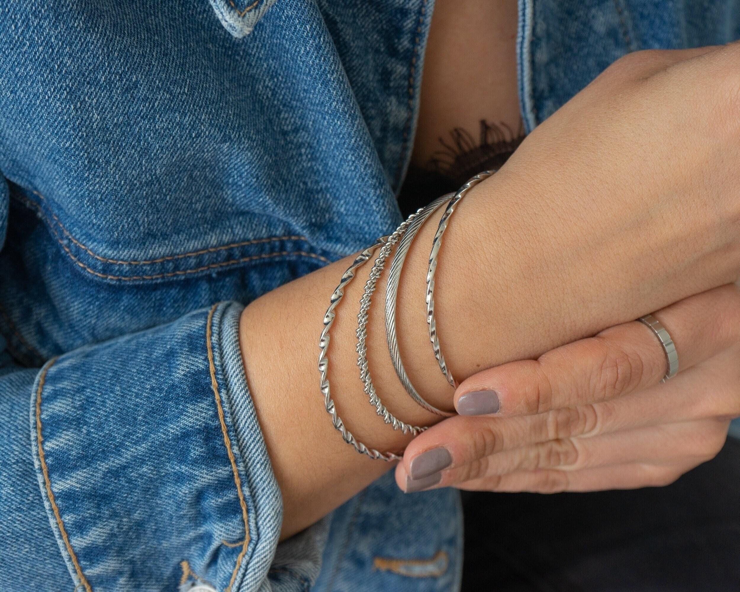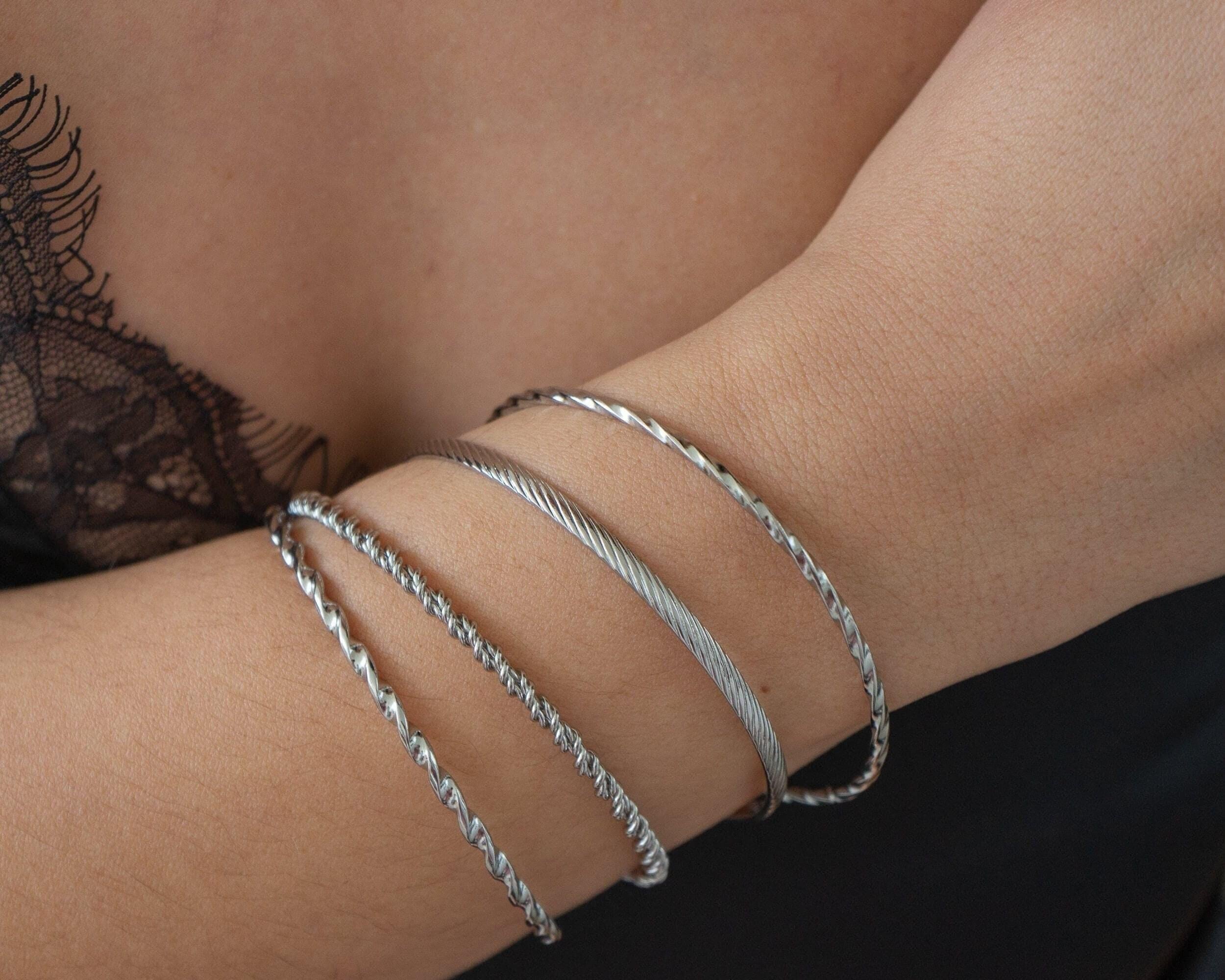 This thin, dainty silver braided bangle is a timeless staple for any jewelry collection. With its sleek and versatile design, it is perfect for mixing and matching with other cuffs and bangles to create your own unique style. Crafted from durable stainless steel, these bangles are waterproof and designed to maintain their shine, making them ideal for everyday wear.