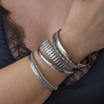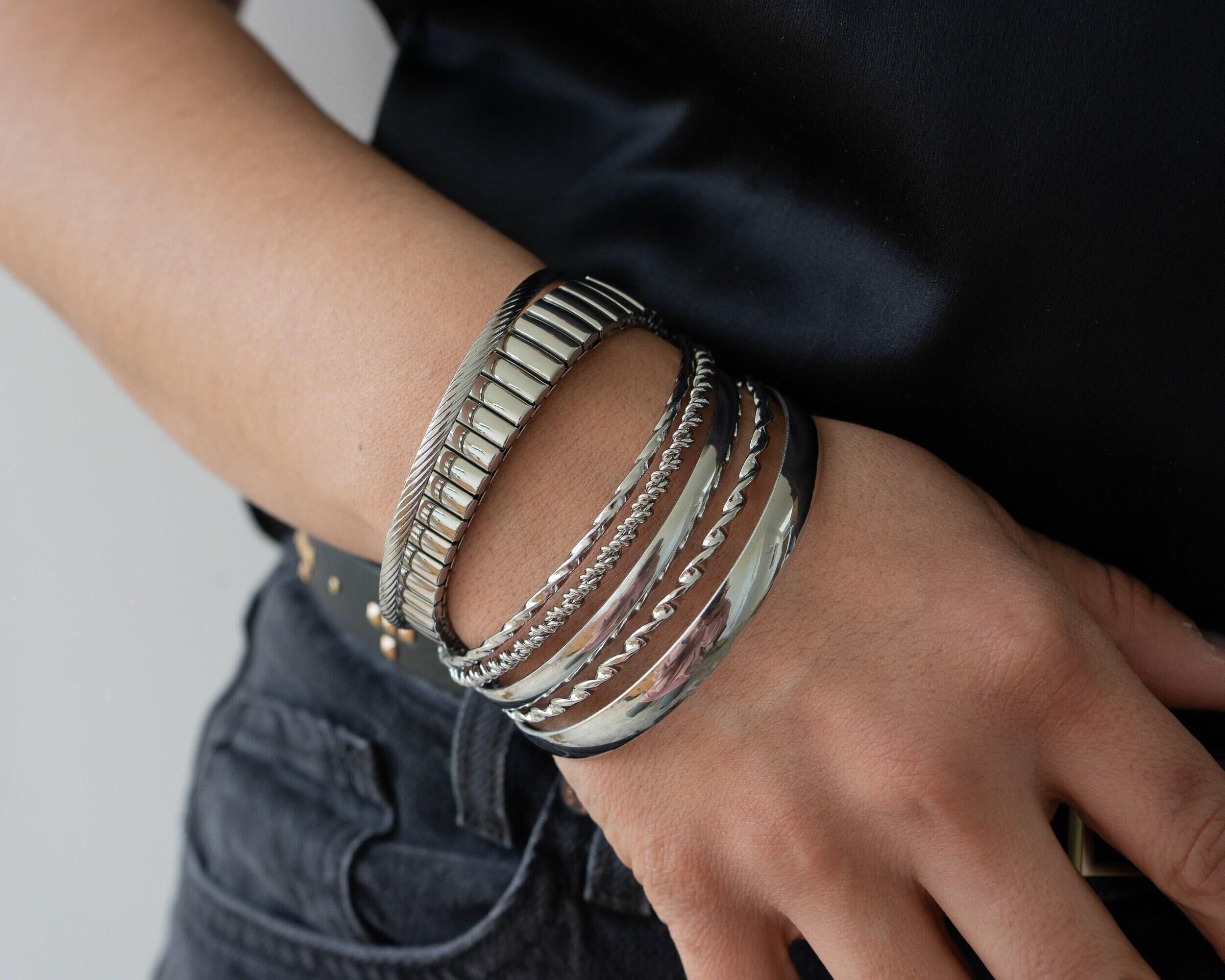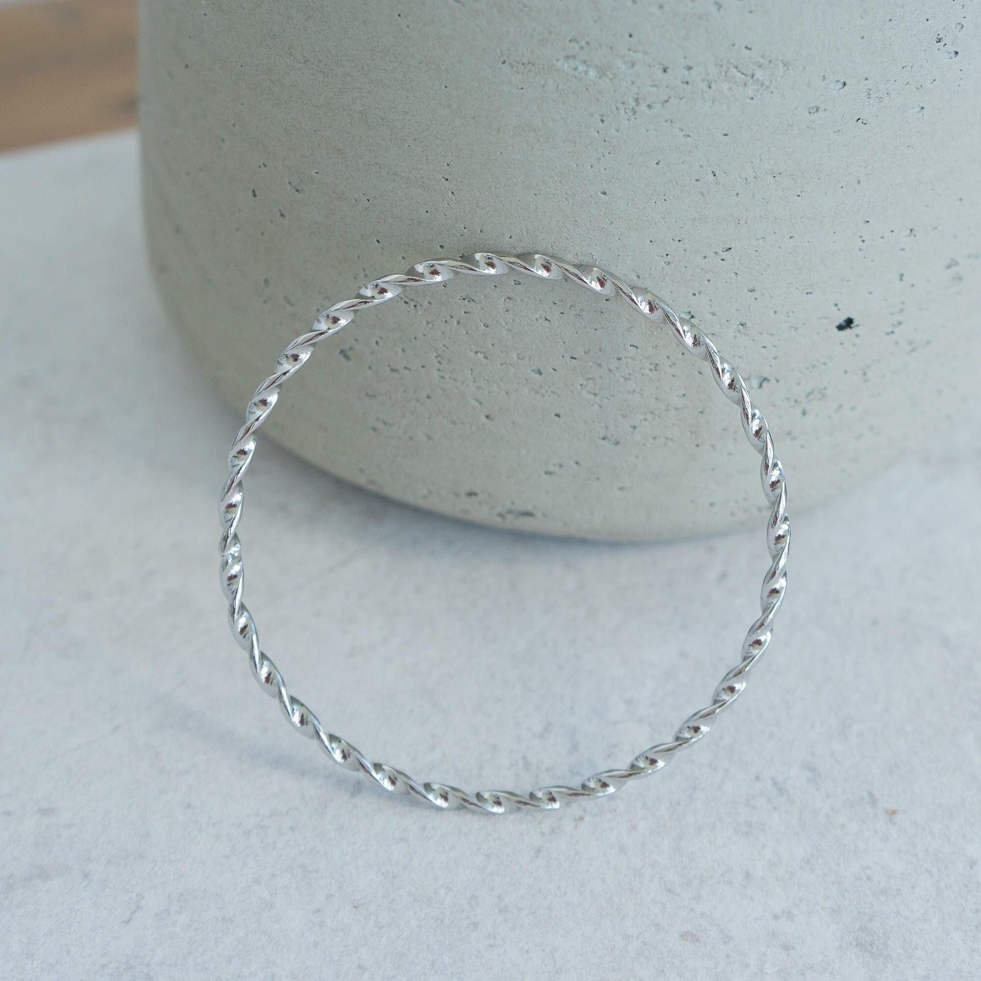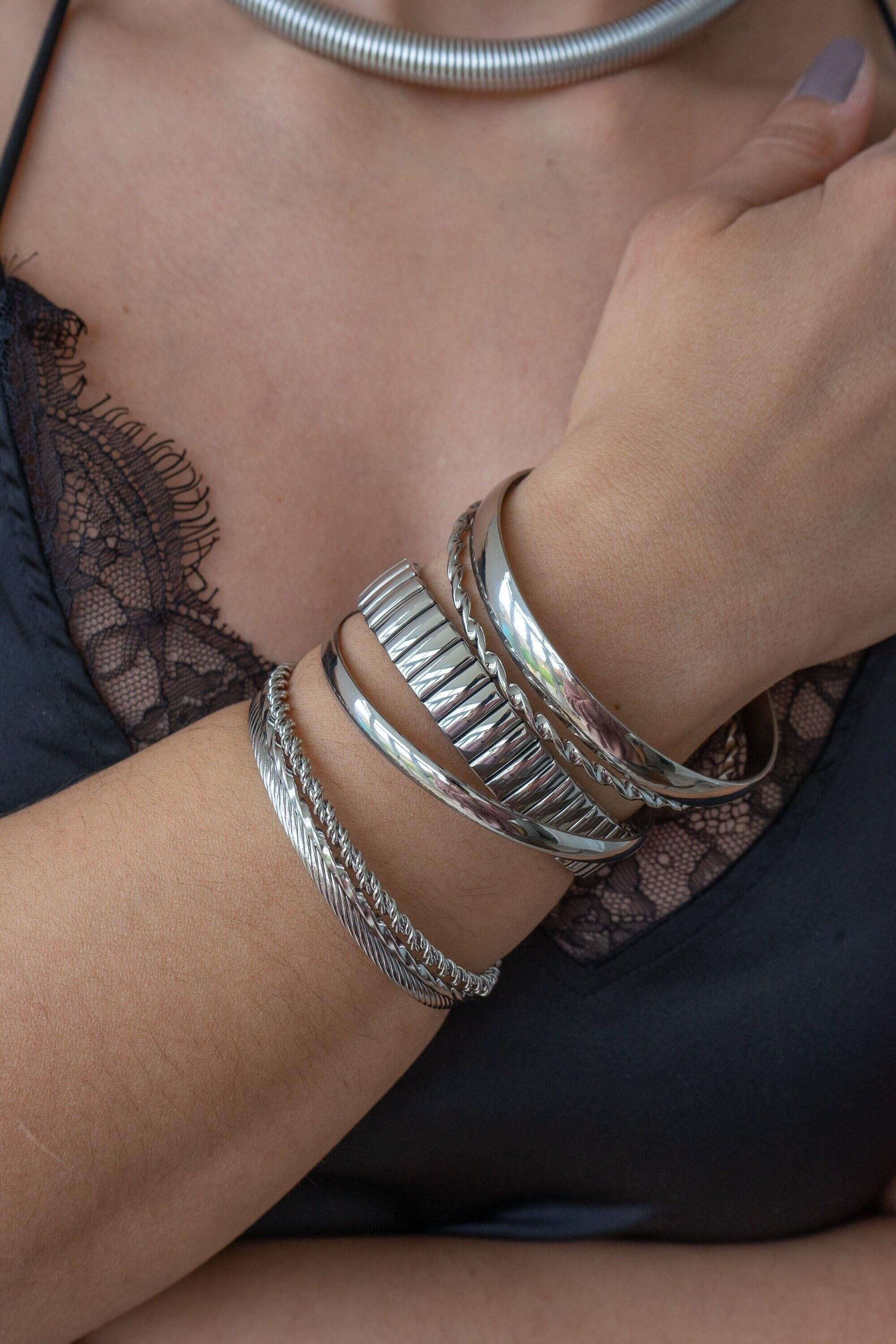 This thin, dainty silver braided bangle is a timeless staple for any jewelry collection. With its sleek and versatile design, it is perfect for mixing and matching with other cuffs and bangles to create your own unique style. Crafted from durable stainless steel, these bangles are waterproof and designed to maintain their shine, making them ideal for everyday wear.