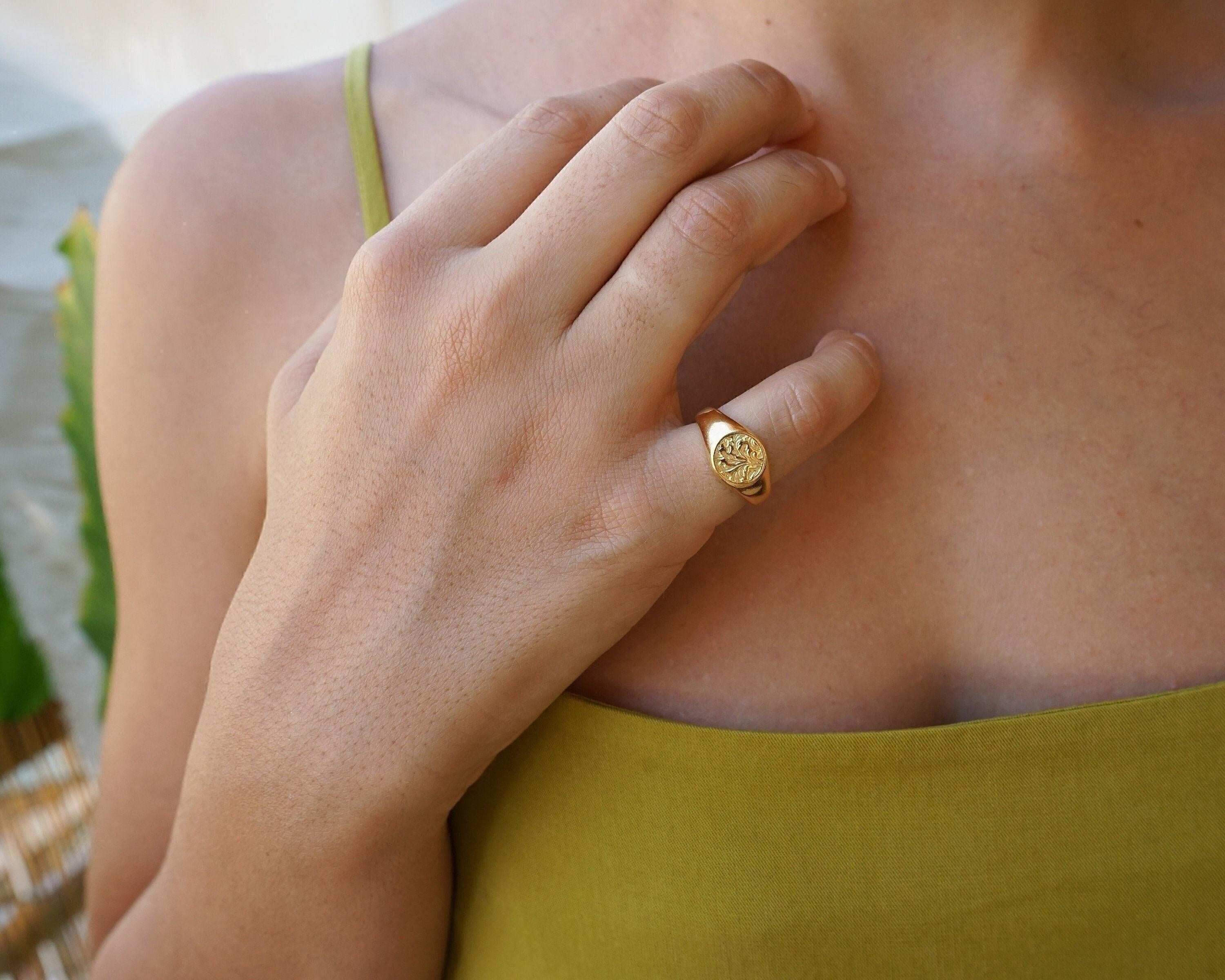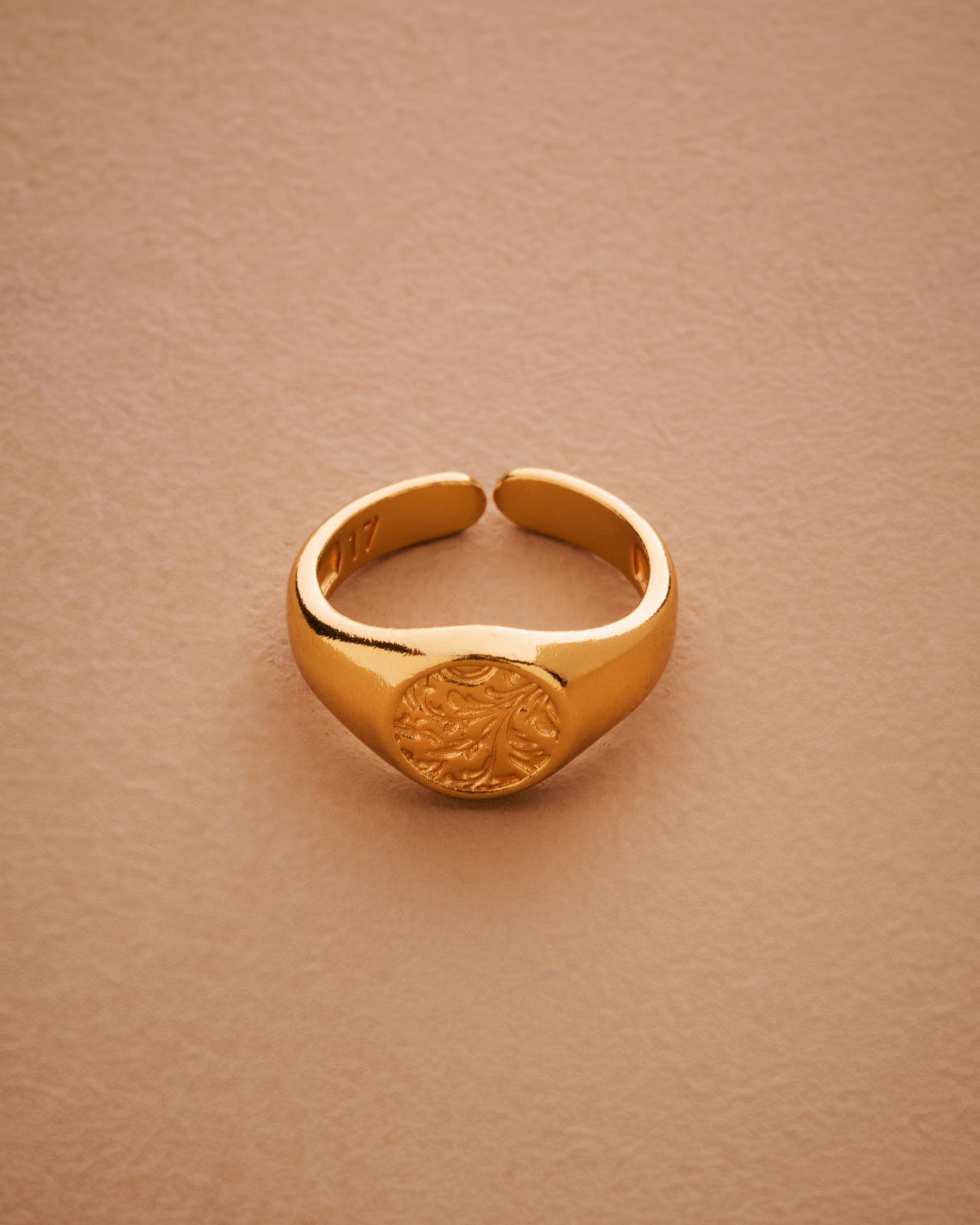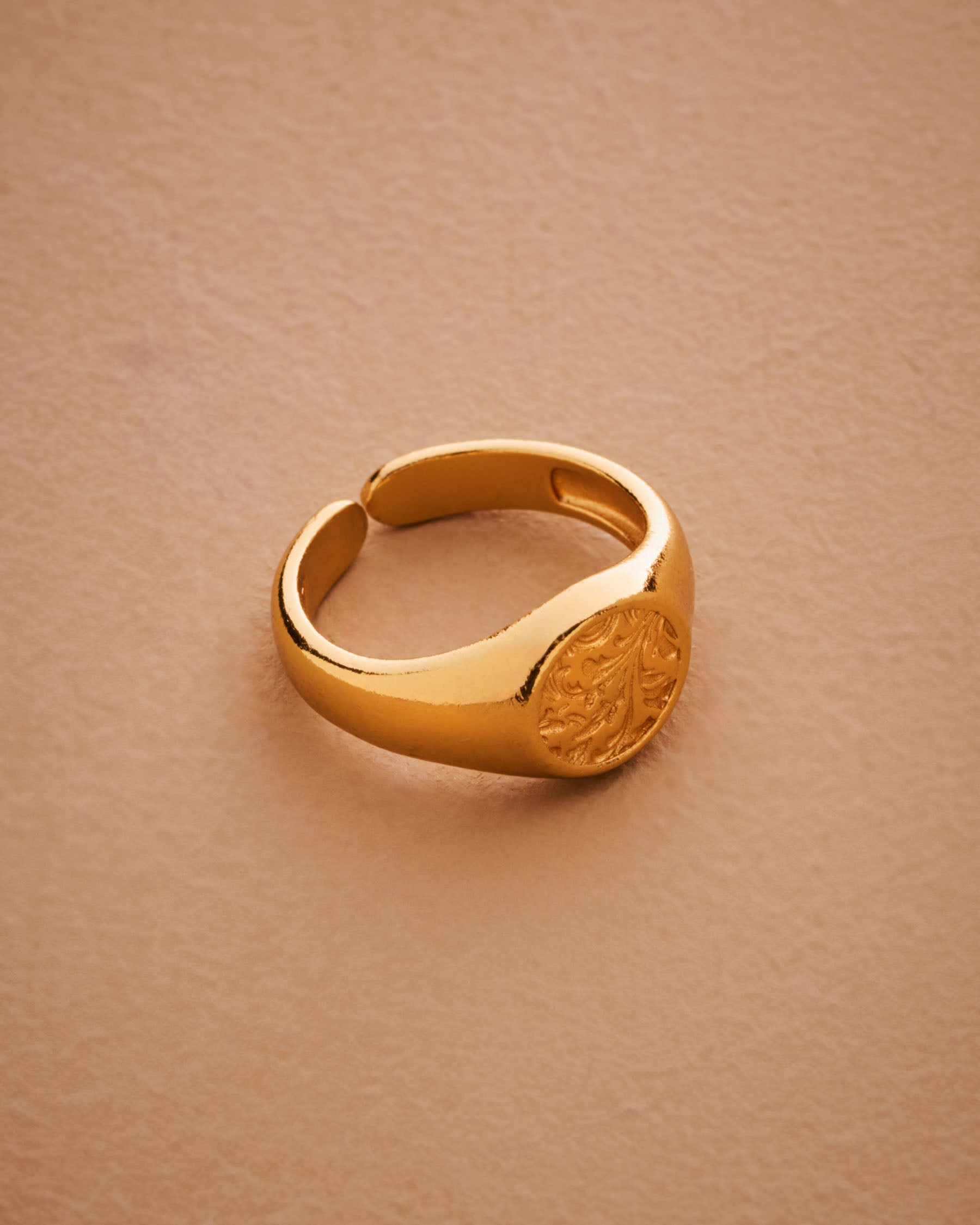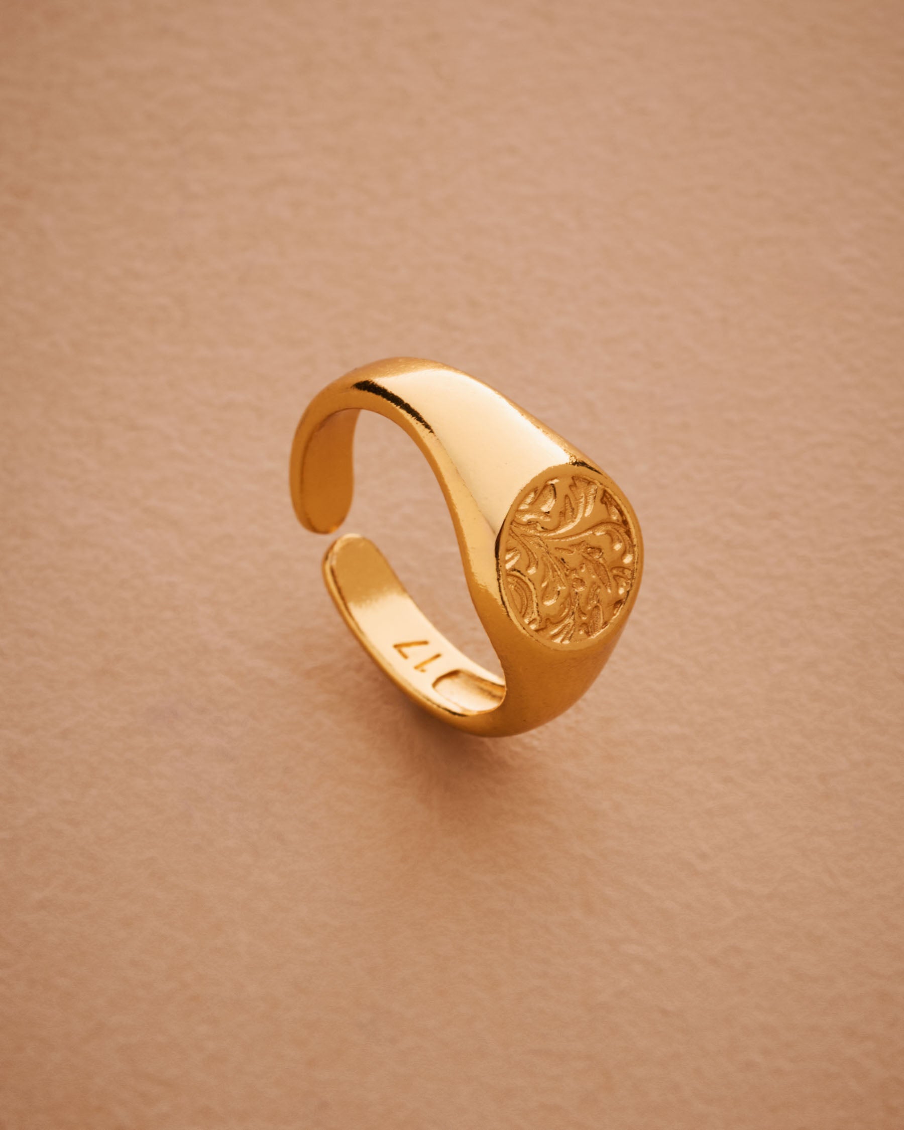 Made from 24K gold plated zamak, this FLORAL STAMP signet chevalier ring is inspired from the beauty of nature. A unique statement ring you can wear on any finger you want. Looks amazing as a chevalier ring too!
