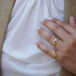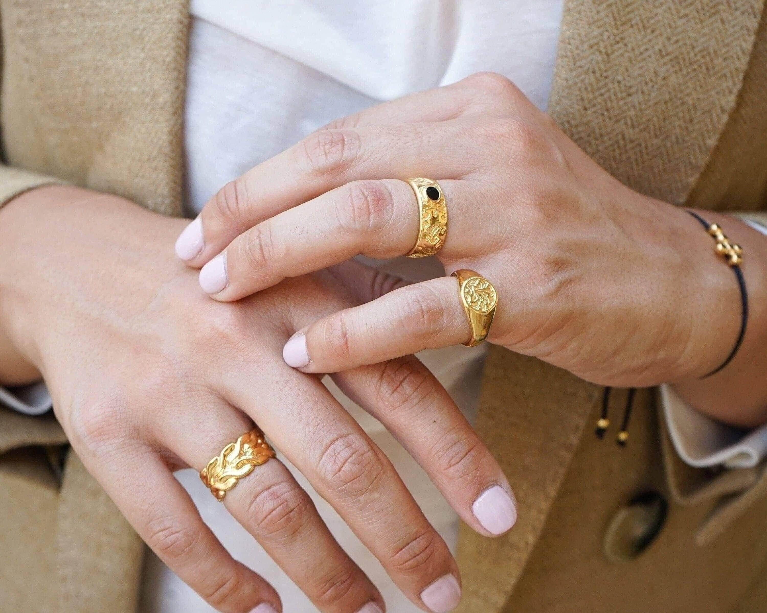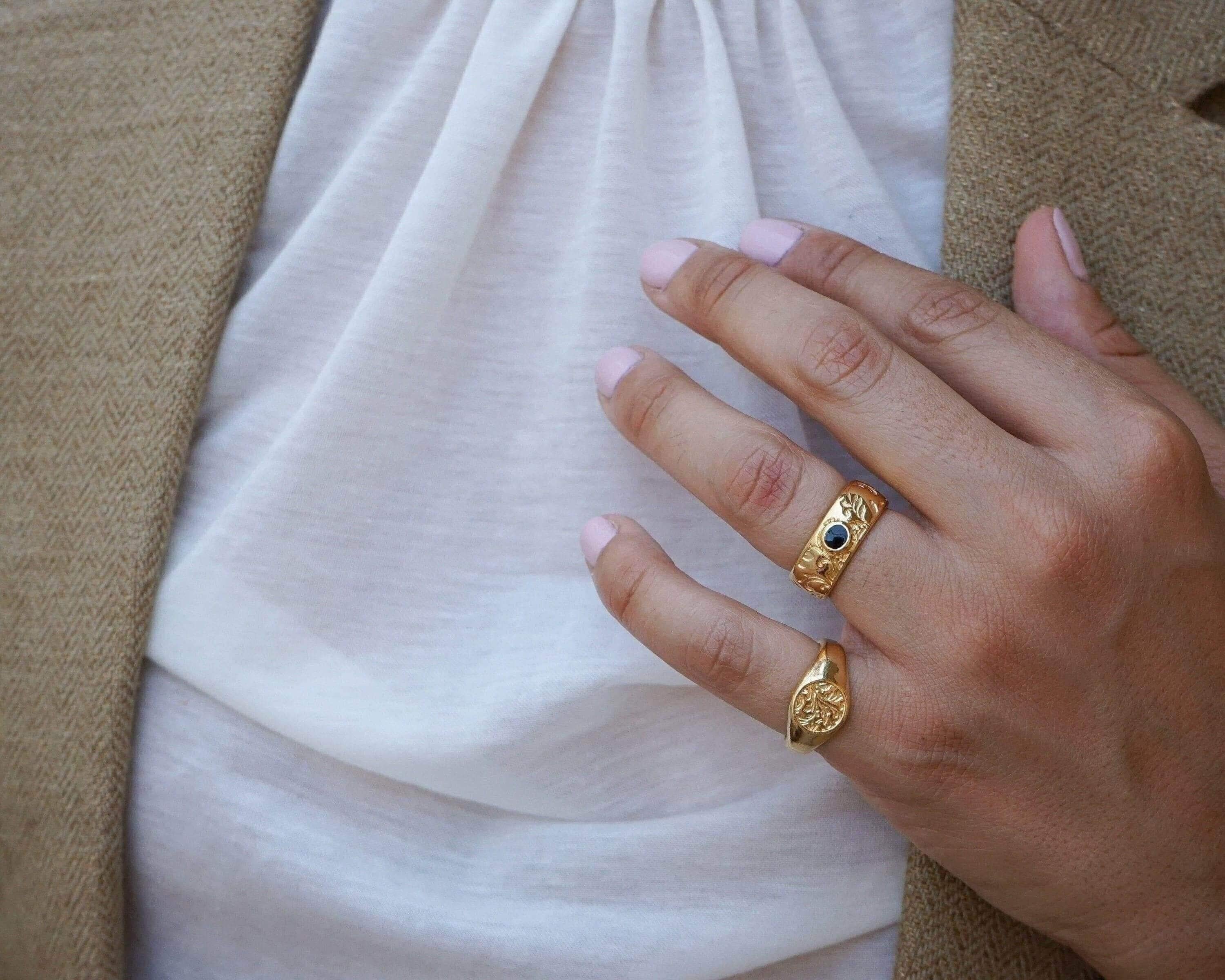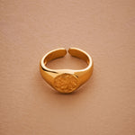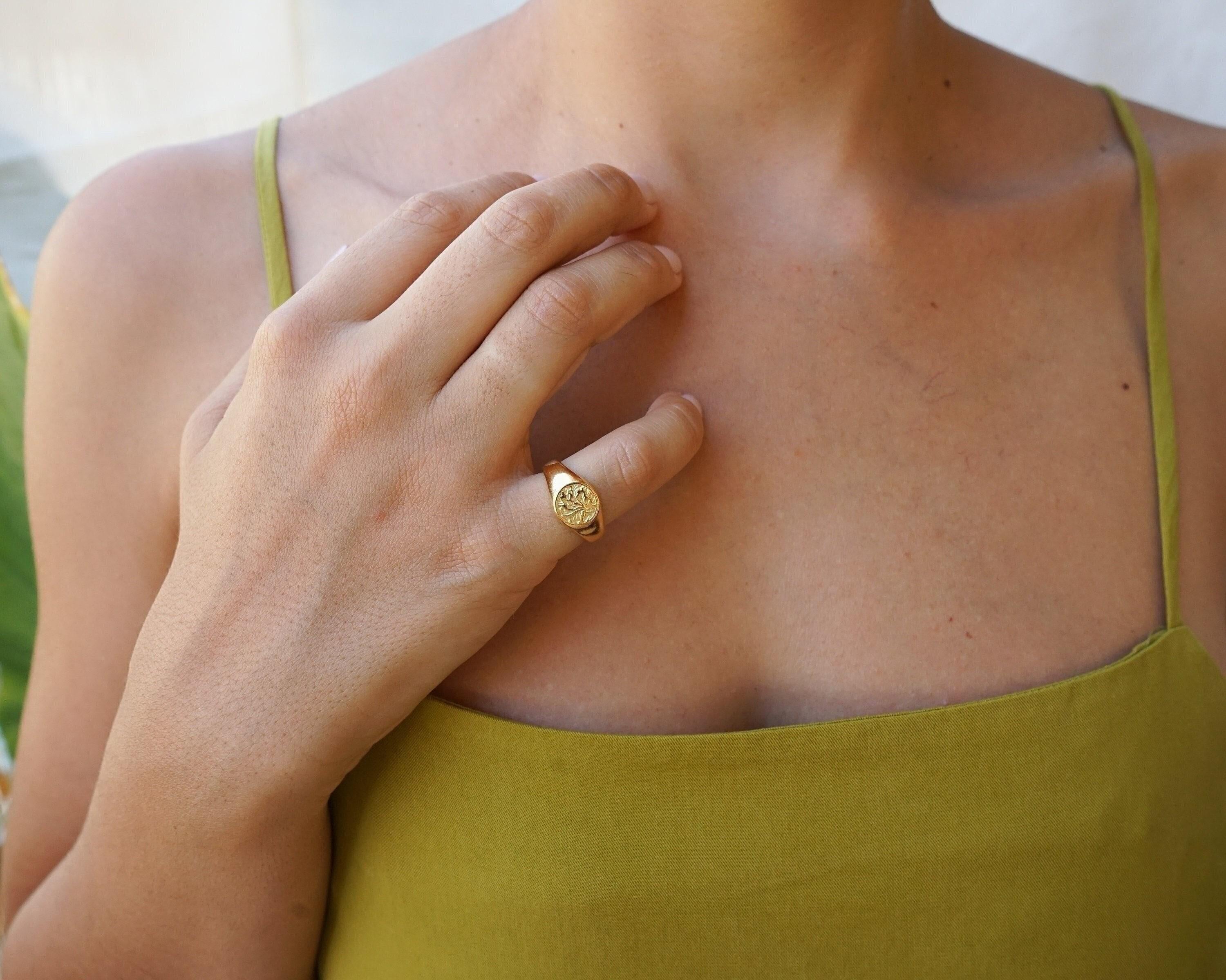 Made from 24K gold plated zamak, this FLORAL STAMP signet chevalier ring is inspired from the beauty of nature. A unique statement ring you can wear on any finger you want. Looks amazing as a chevalier ring too!