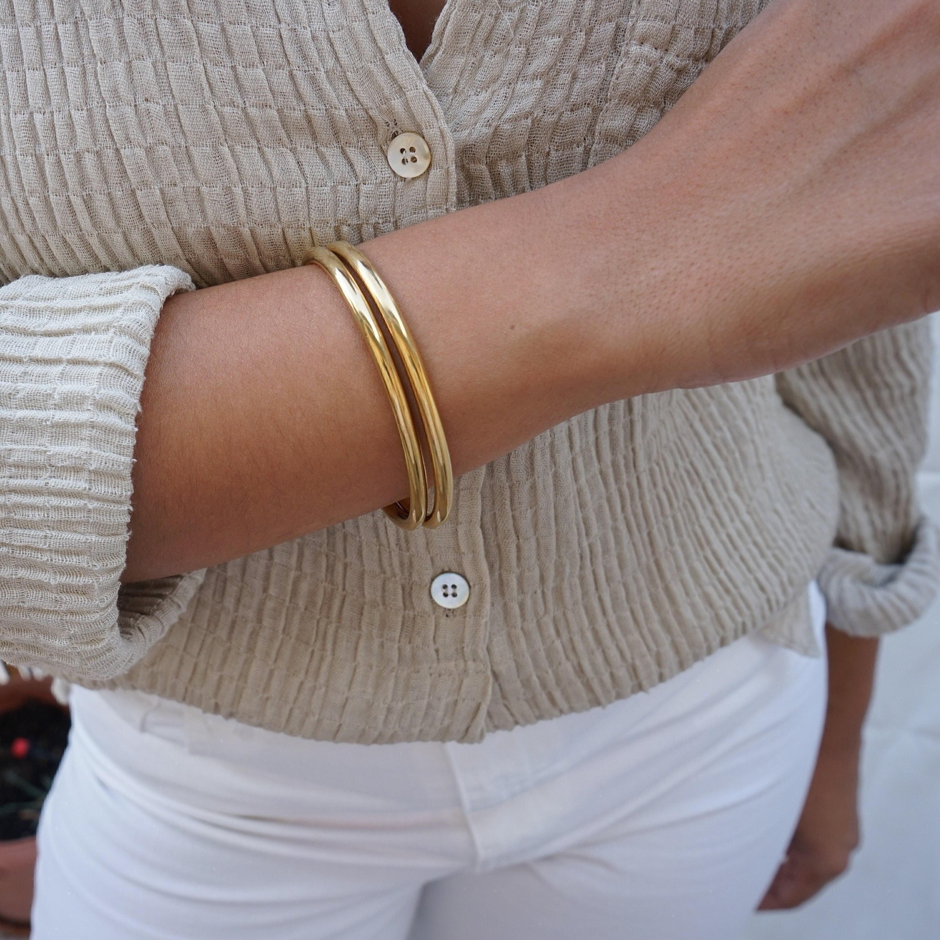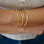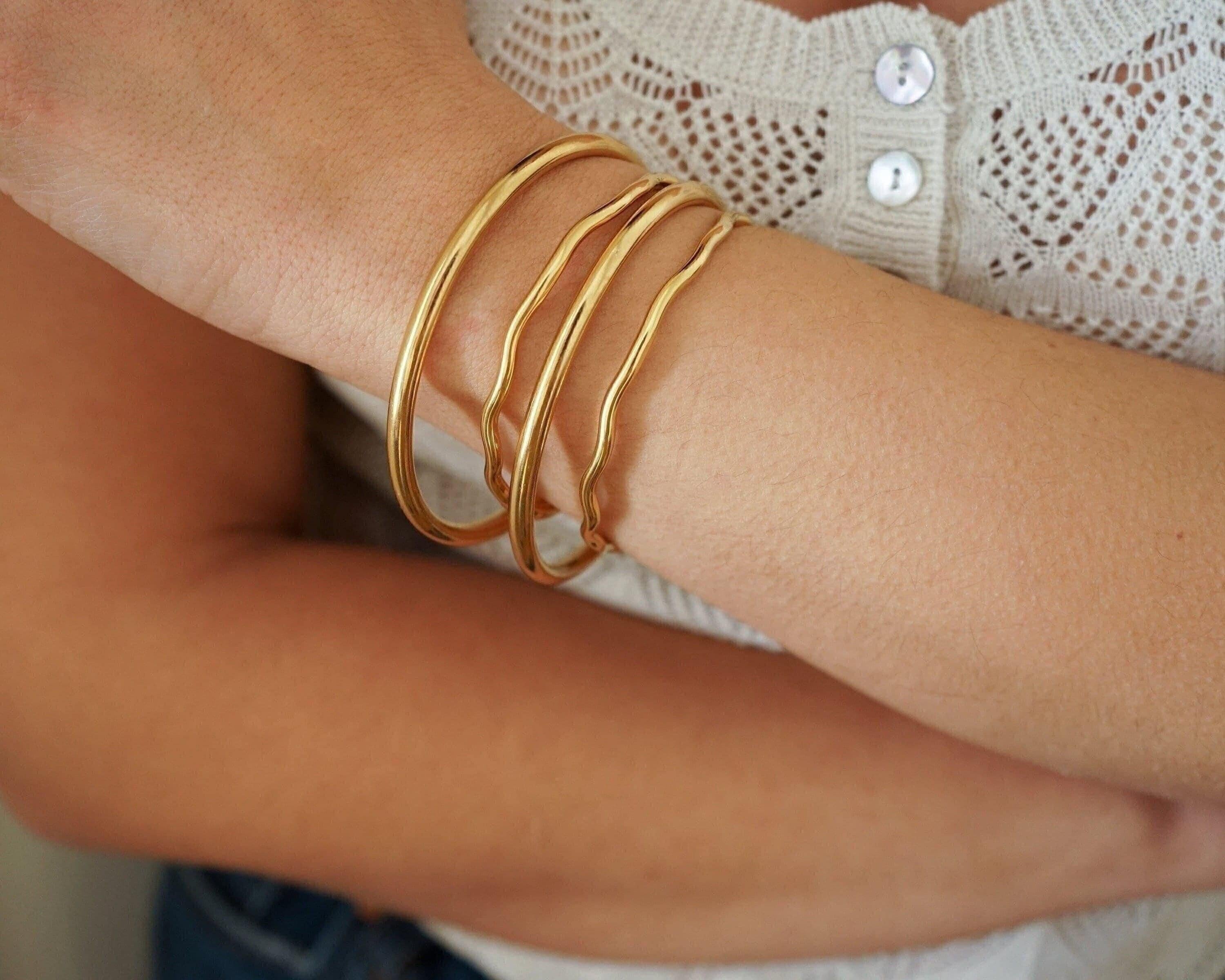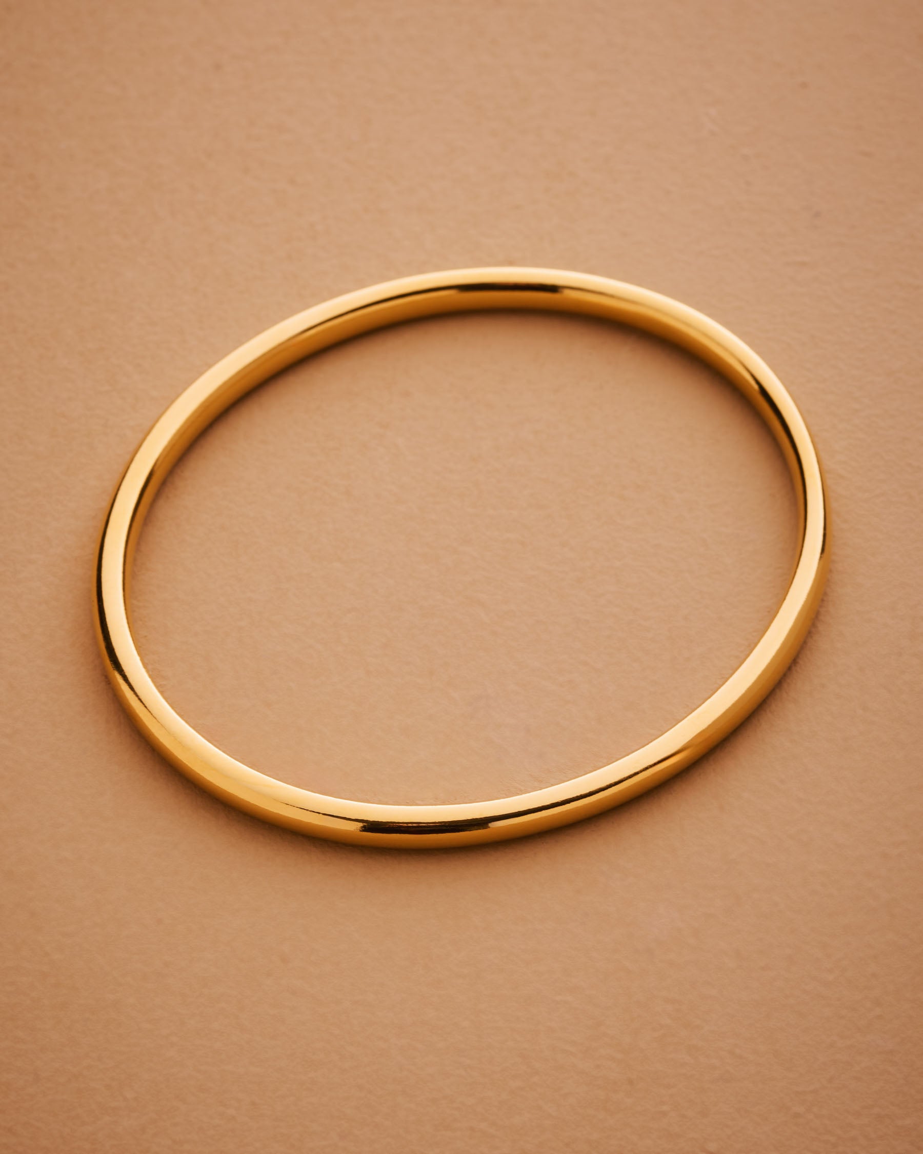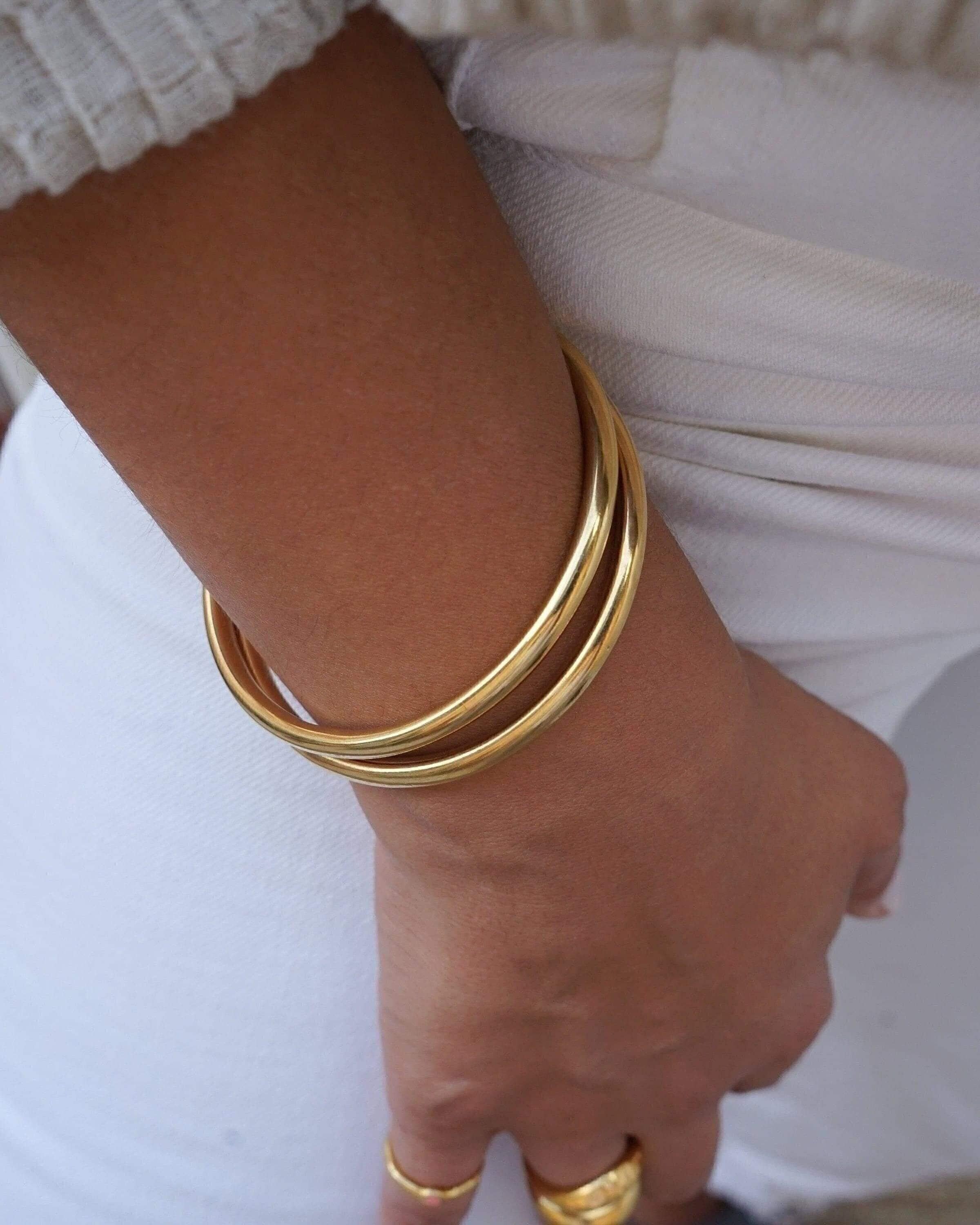 This gold-plated zamak bangle cuff features a sleek and polished design, making it a versatile accessory for any outfit. Its bold yet simple style allows it to be worn alone or effortlessly mixed with other bangles and cuffs for a layered, modern look. A timeless piece that adds a touch of sophistication to your jewelry collection.