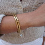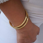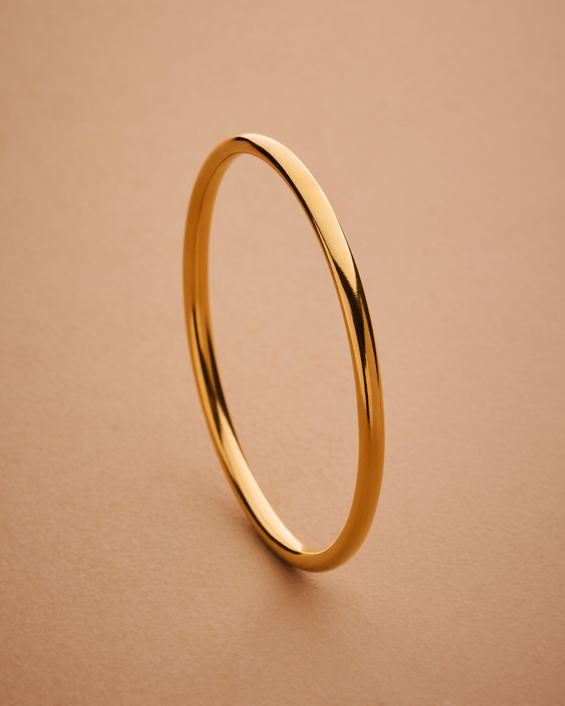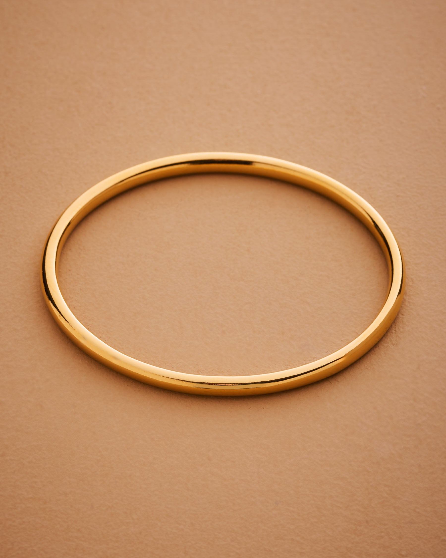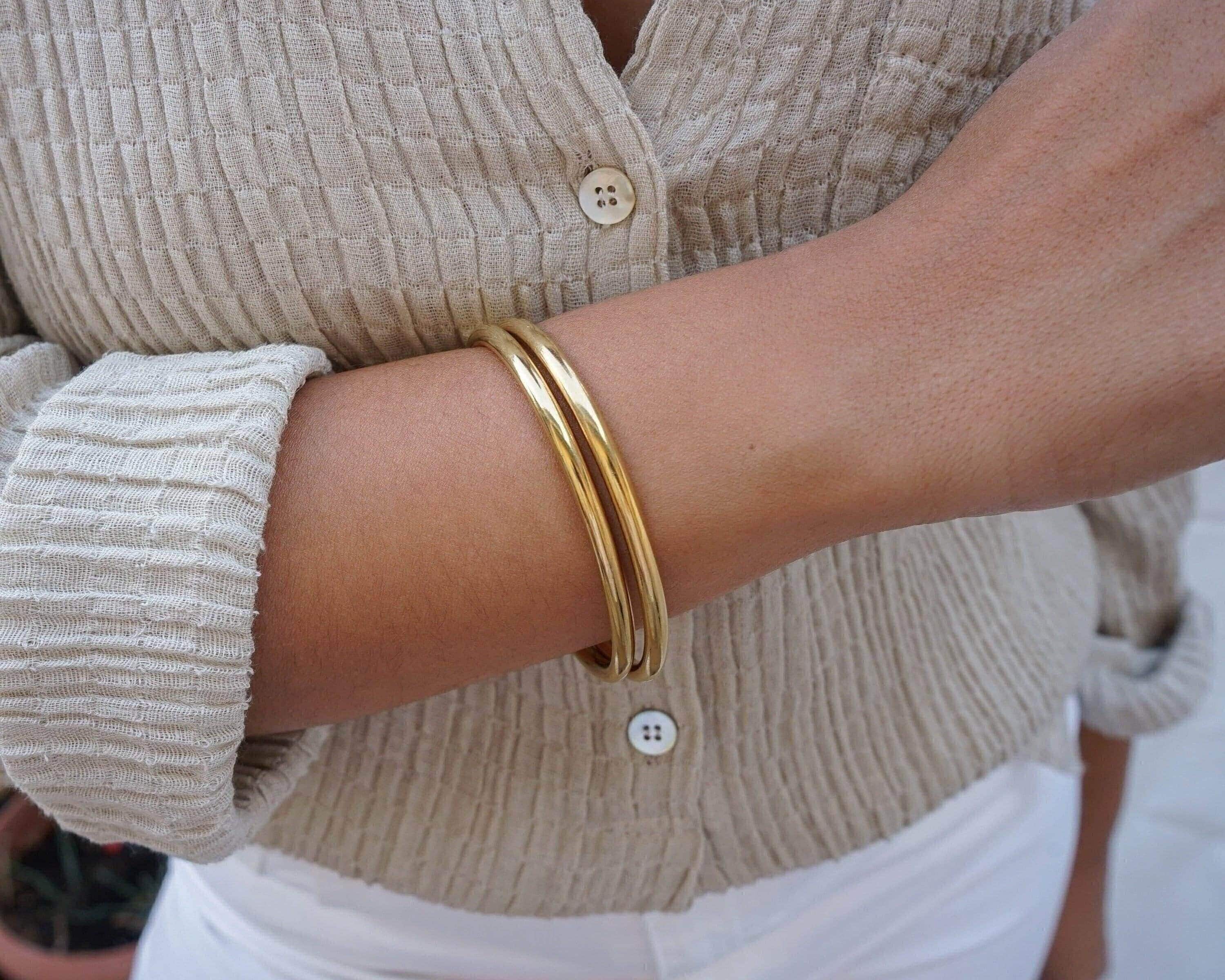 This gold-plated zamak bangle cuff features a sleek and polished design, making it a versatile accessory for any outfit. Its bold yet simple style allows it to be worn alone or effortlessly mixed with other bangles and cuffs for a layered, modern look. A timeless piece that adds a touch of sophistication to your jewelry collection.