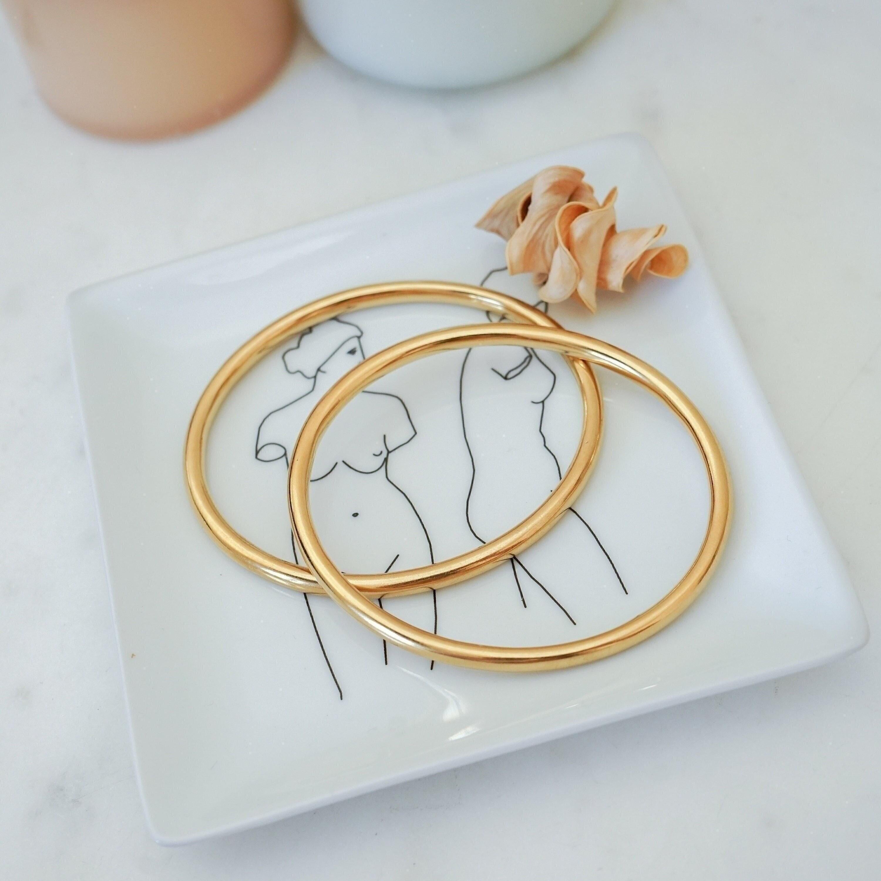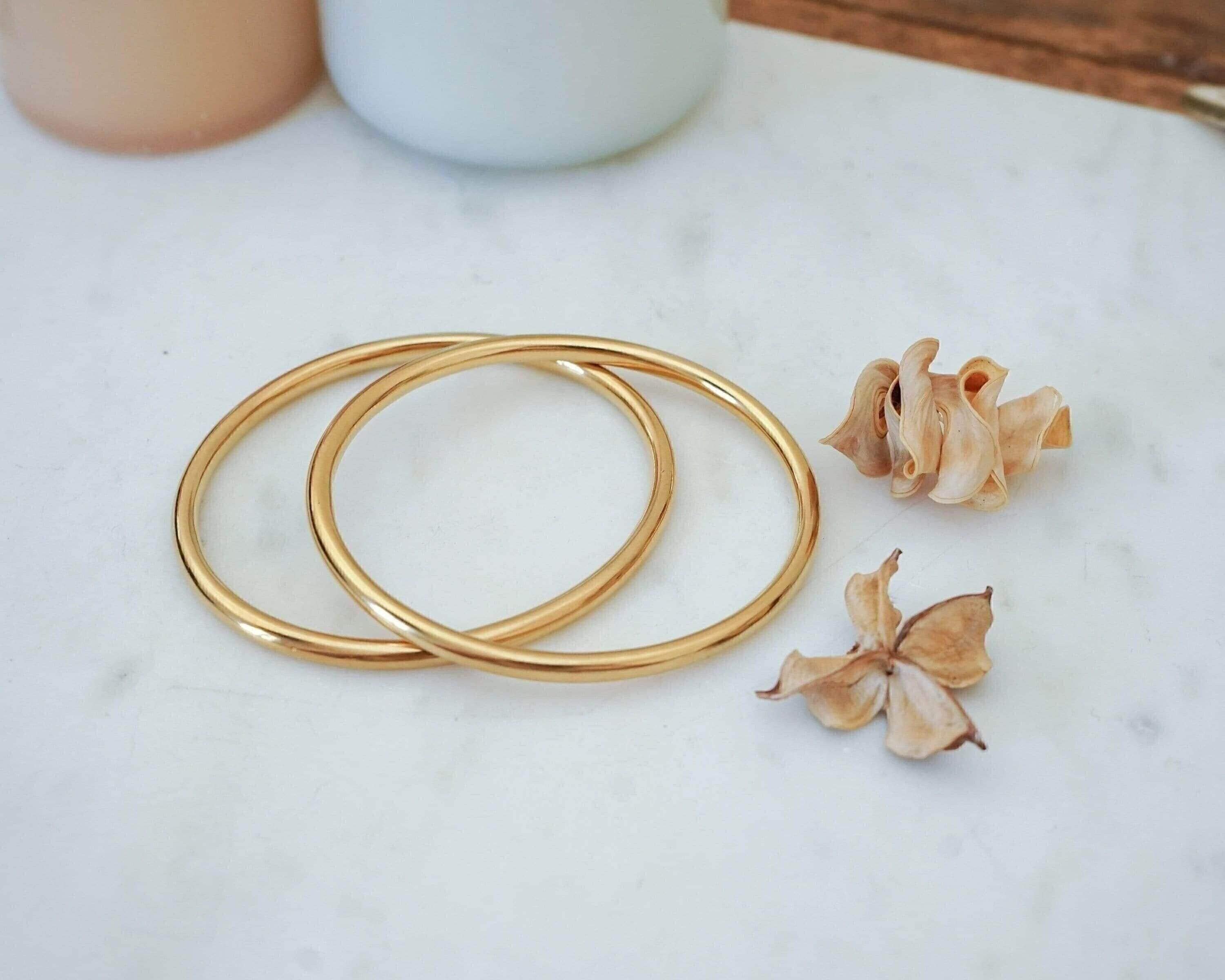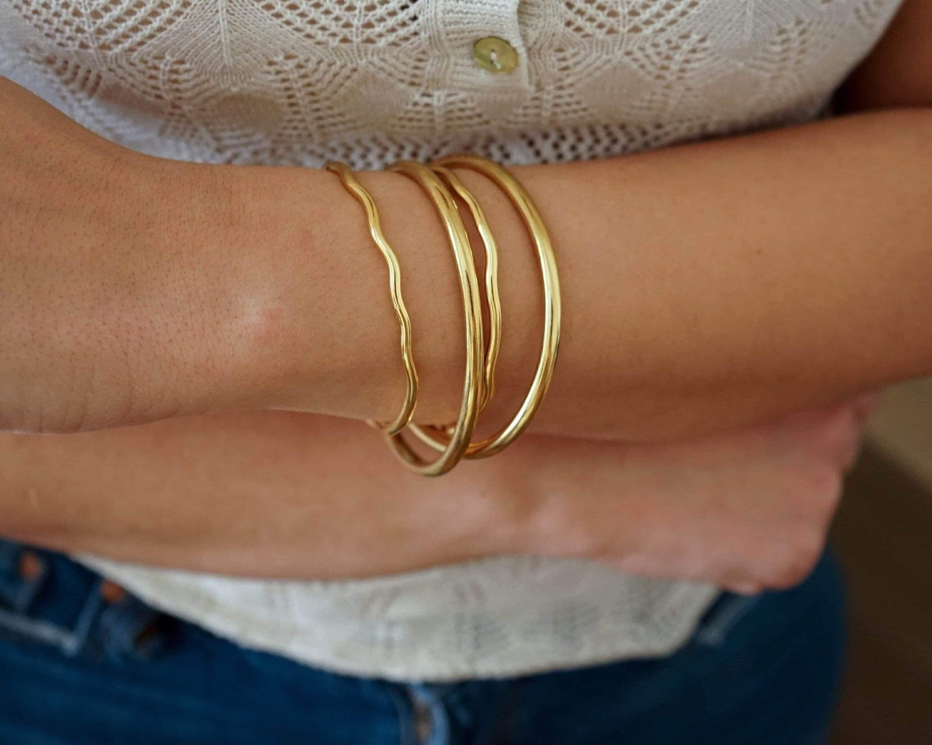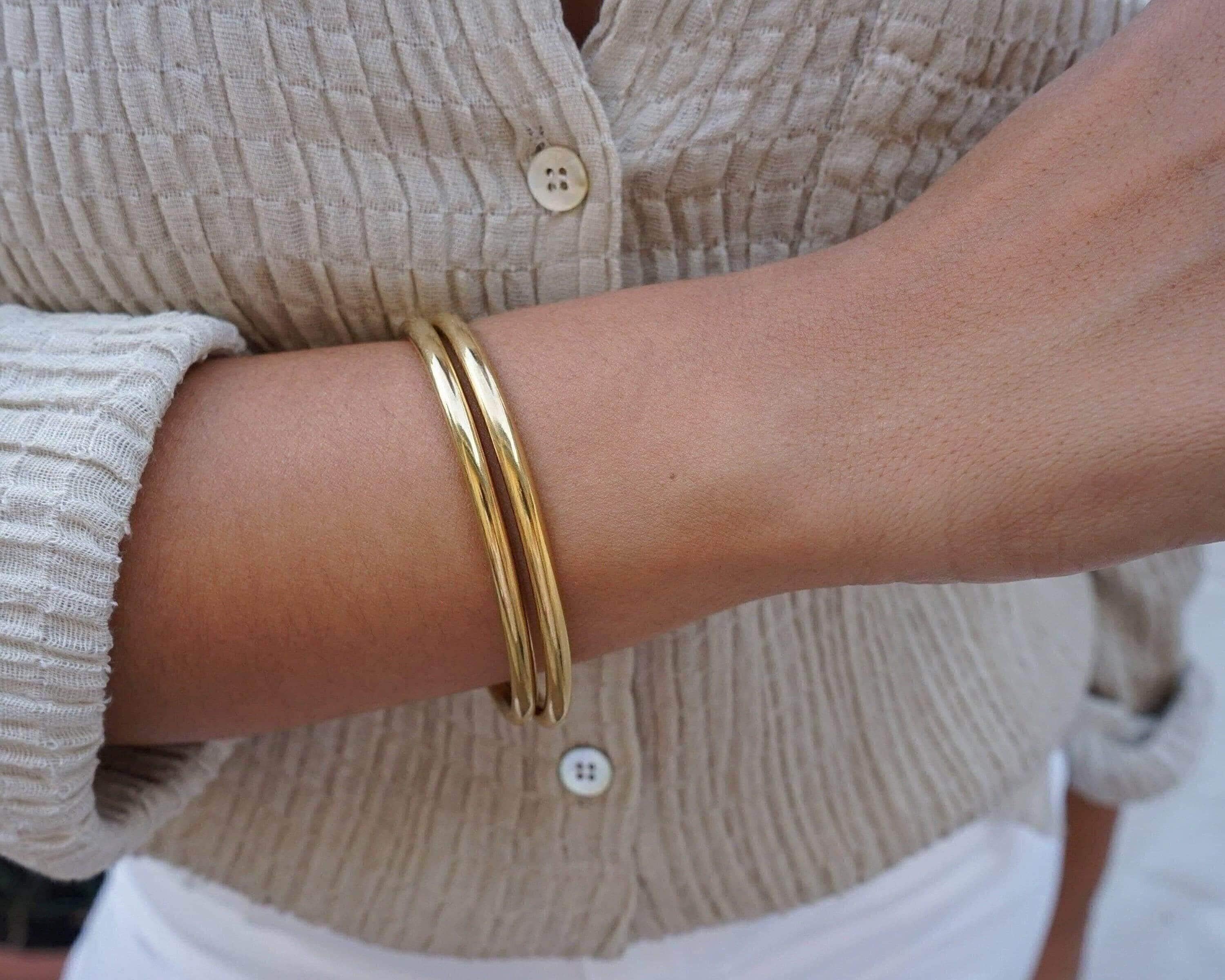 This gold-plated zamak bangle cuff features a sleek and polished design, making it a versatile accessory for any outfit. Its bold yet simple style allows it to be worn alone or effortlessly mixed with other bangles and cuffs for a layered, modern look. A timeless piece that adds a touch of sophistication to your jewelry collection.
