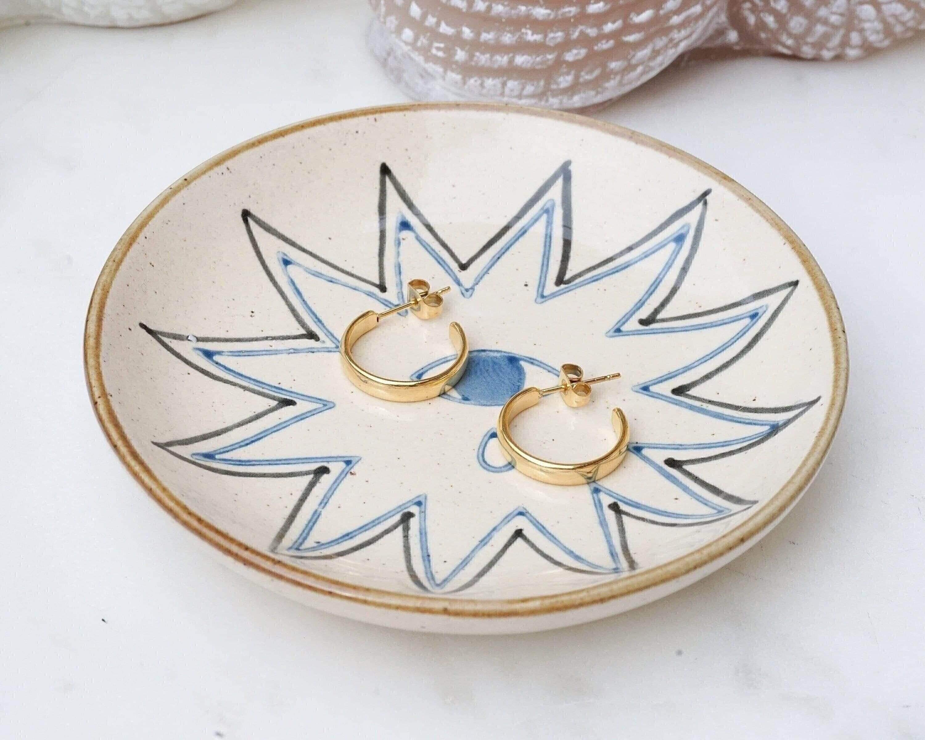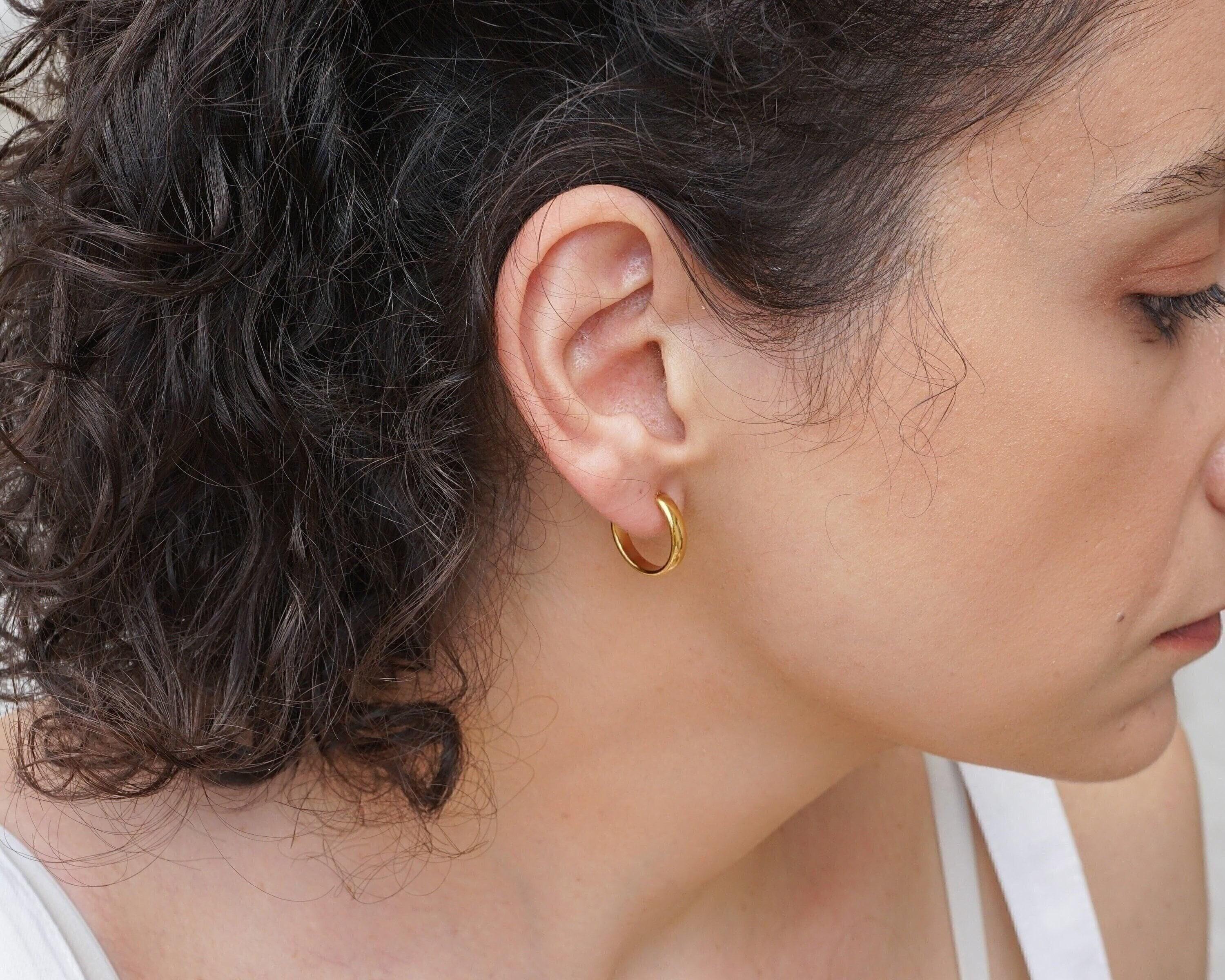 These classic gold medium hoop earrings are perfect for any style or occasion. You can wear them alone for a sophisticated look or stack them with other piercings for a more edgy vibe. They are understated, yet still make a fashion statement. Lightweight and easy to wear, they won't weigh your earlobes down. They are versatile and can easily be dressed up or down.