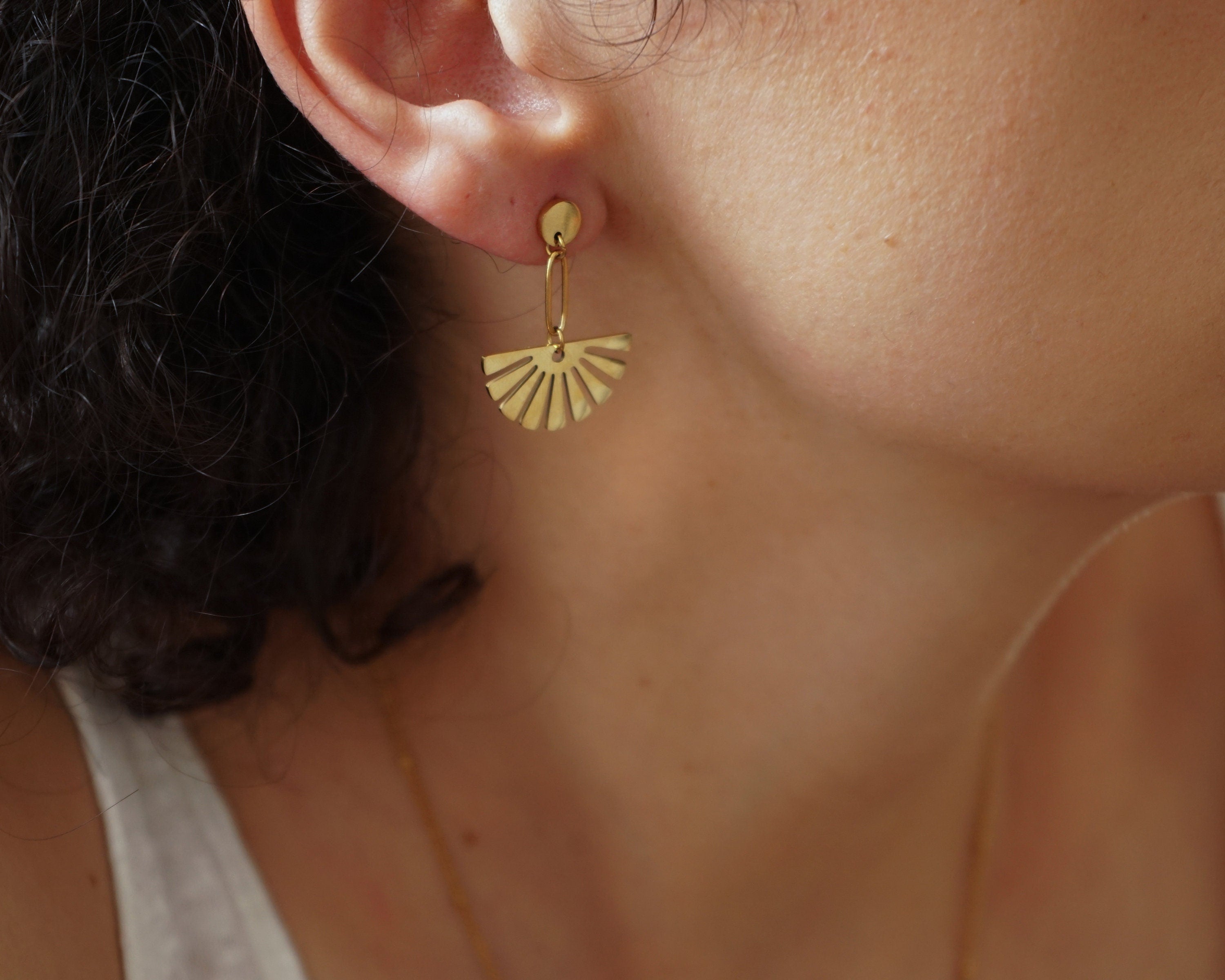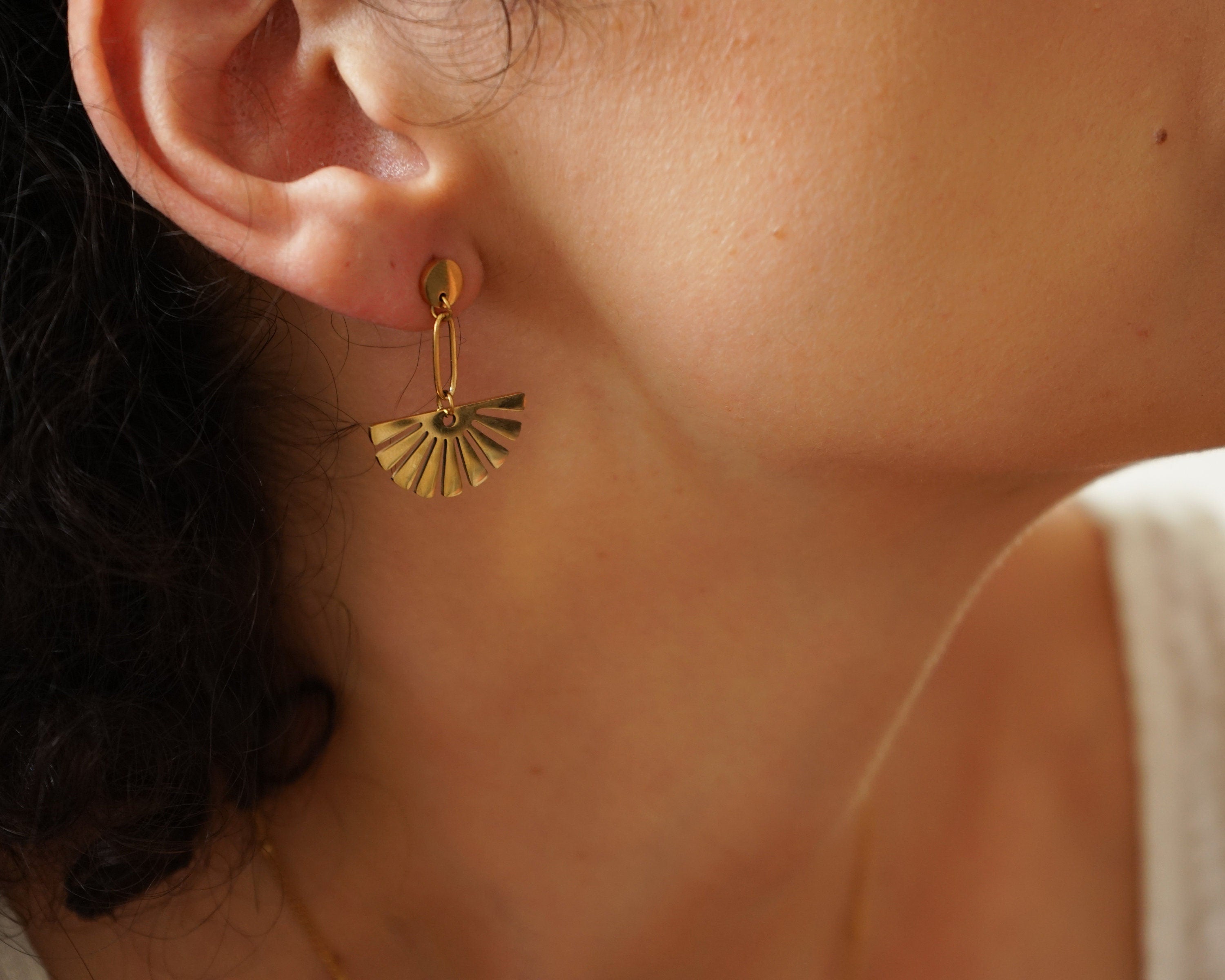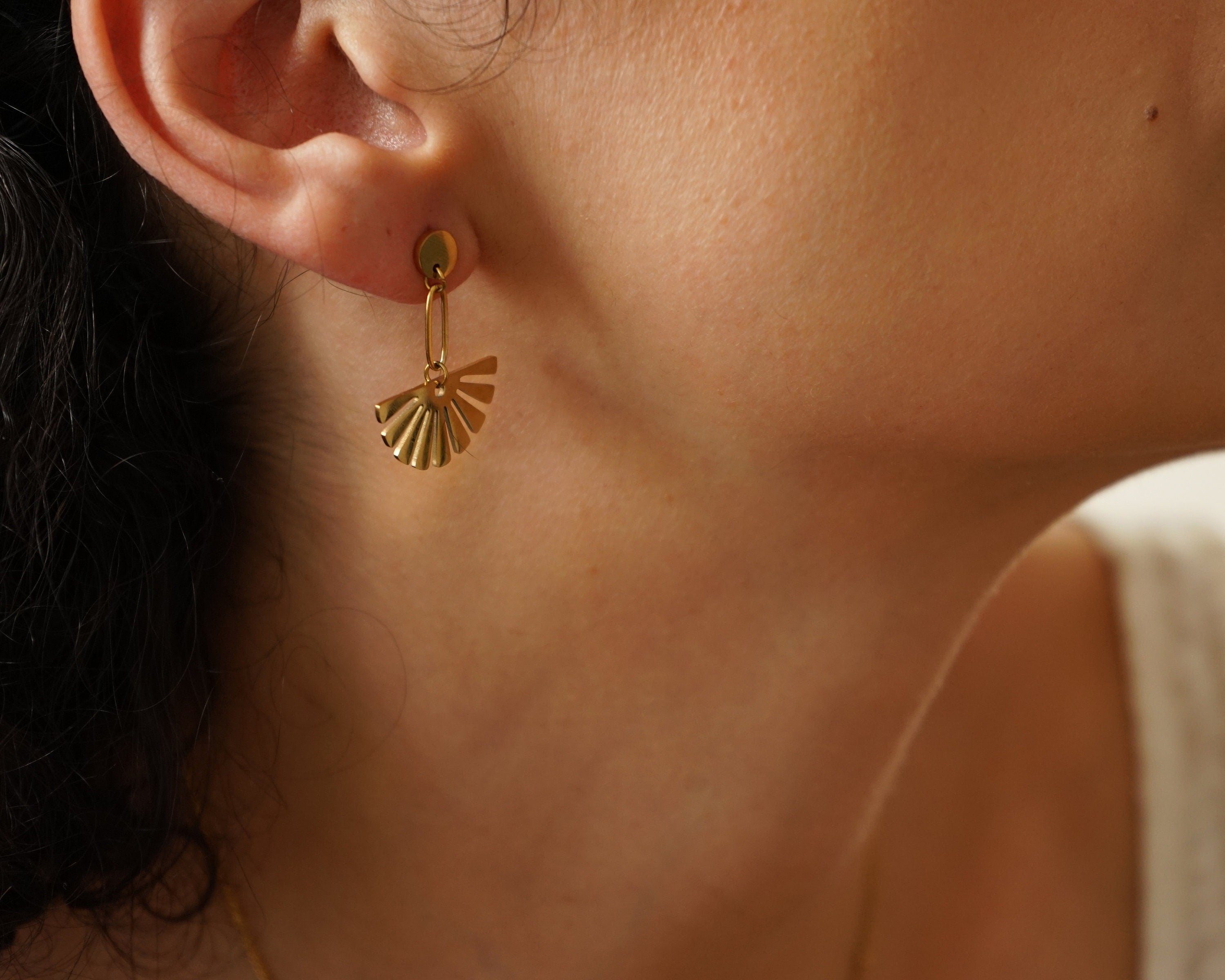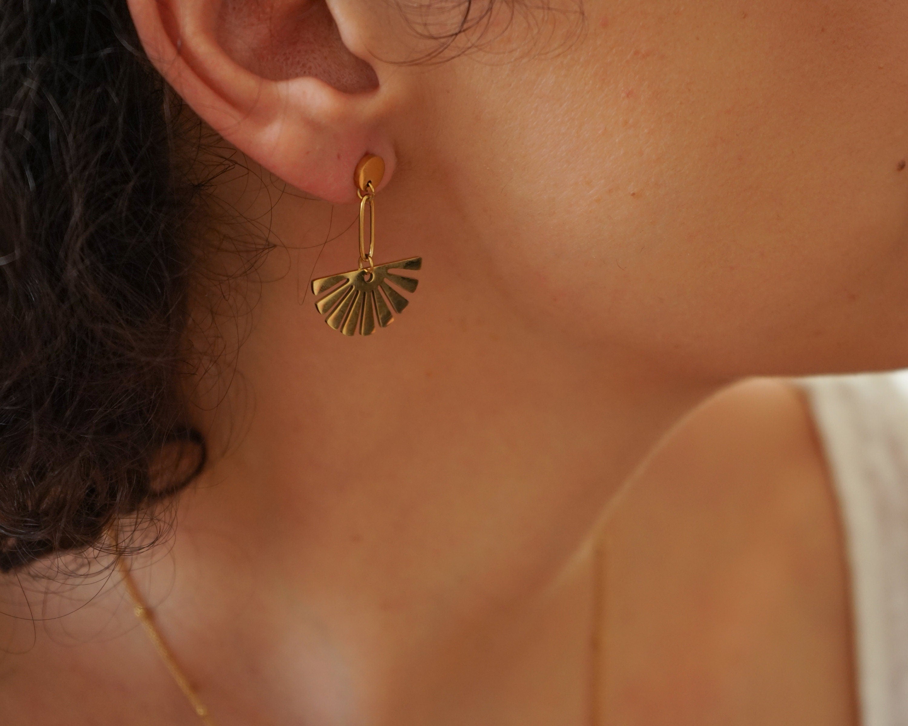 These are lovely gold plated stainless steel push back pins with a beautiful gold dangling flower.They are impressive and they create a modern, sophisticated style.