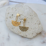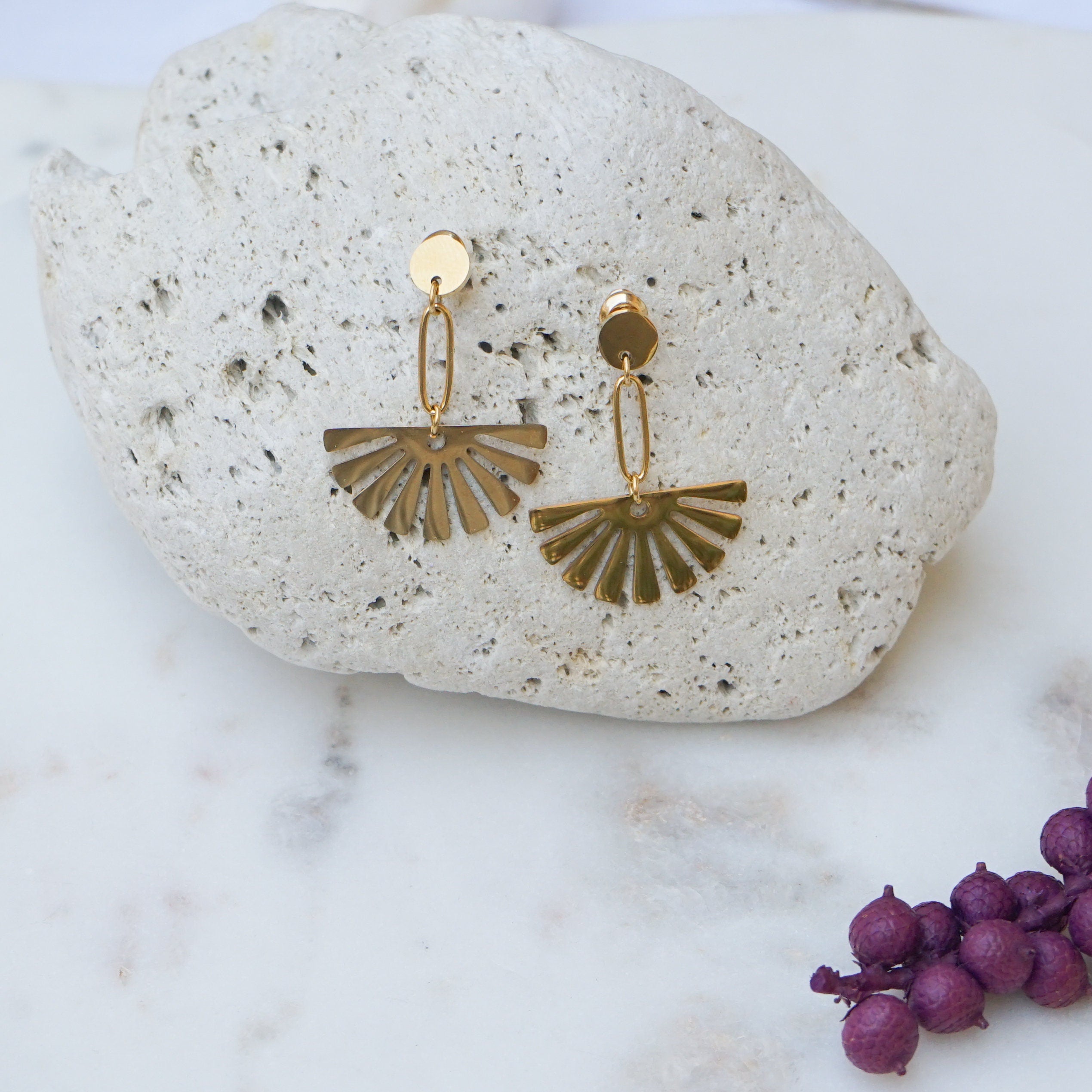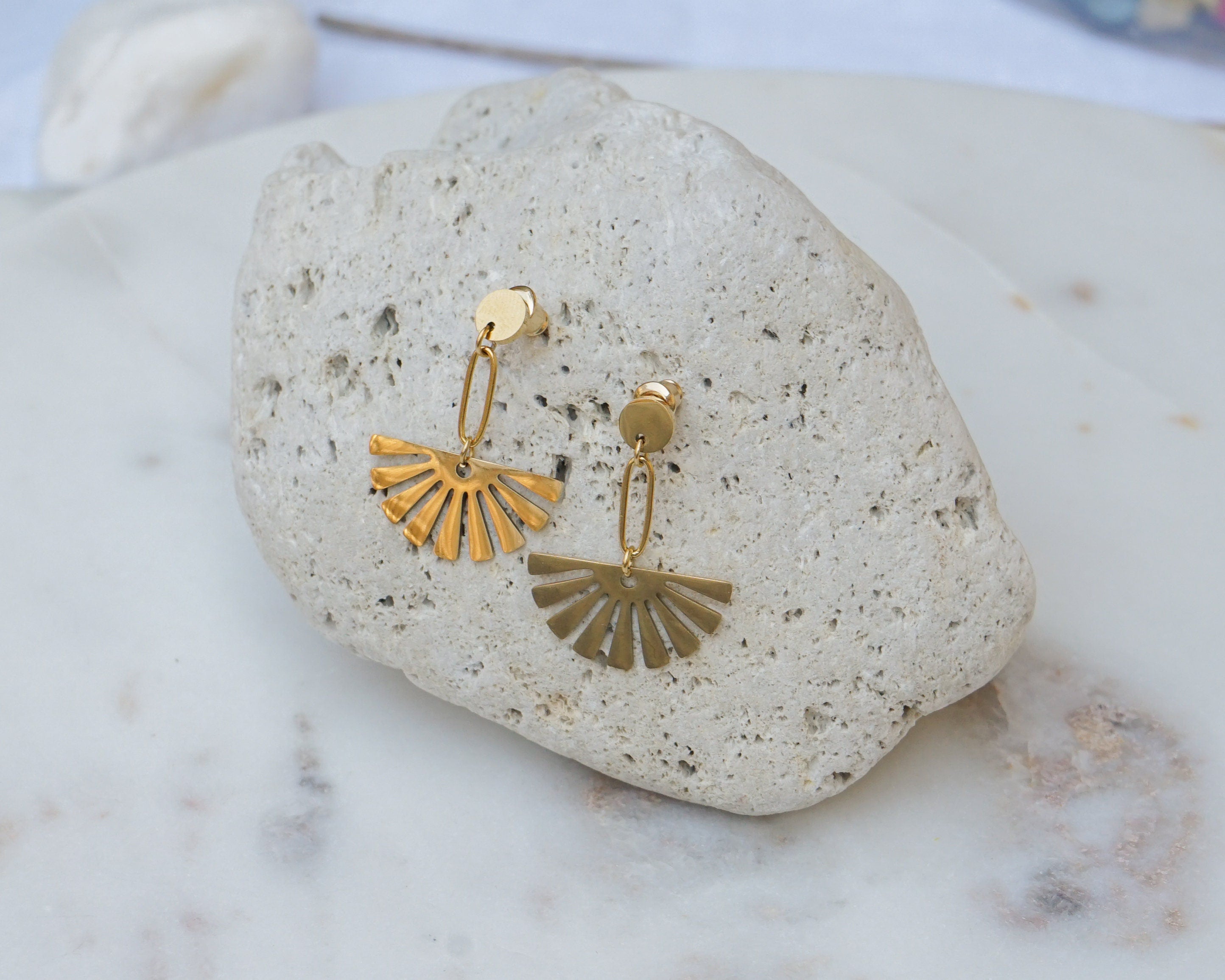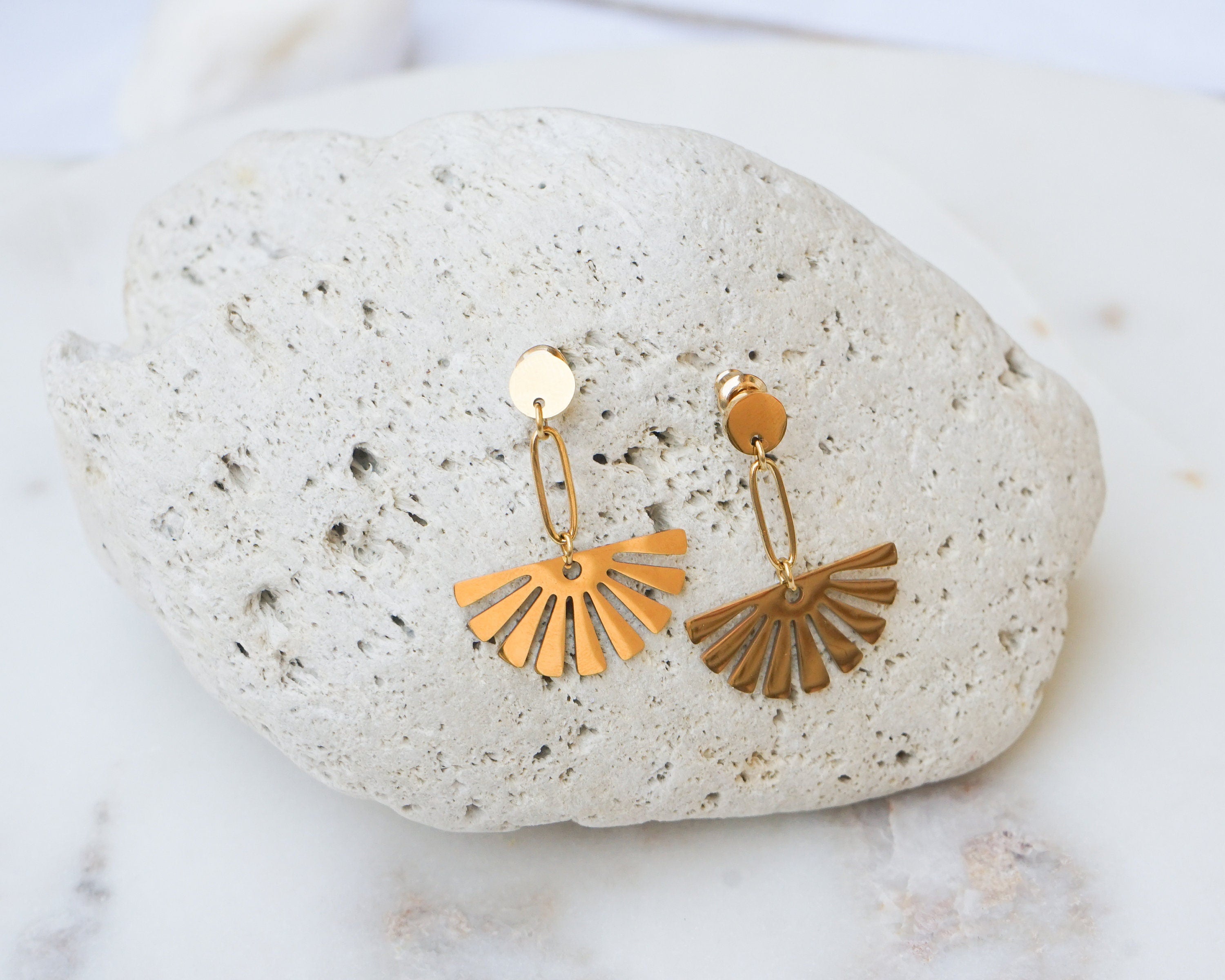 These are lovely gold plated stainless steel push back pins with a beautiful gold dangling flower.They are impressive and they create a modern, sophisticated style.