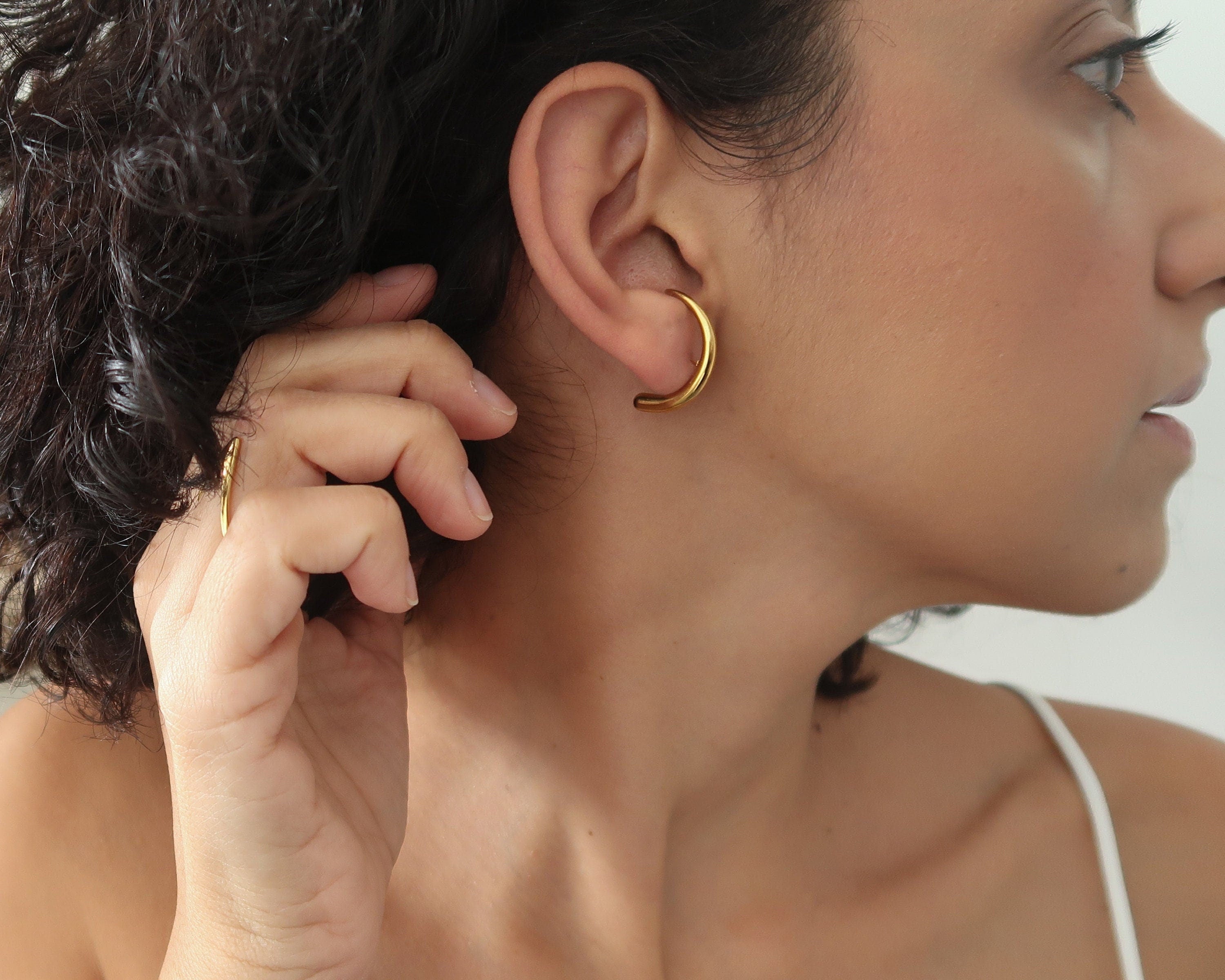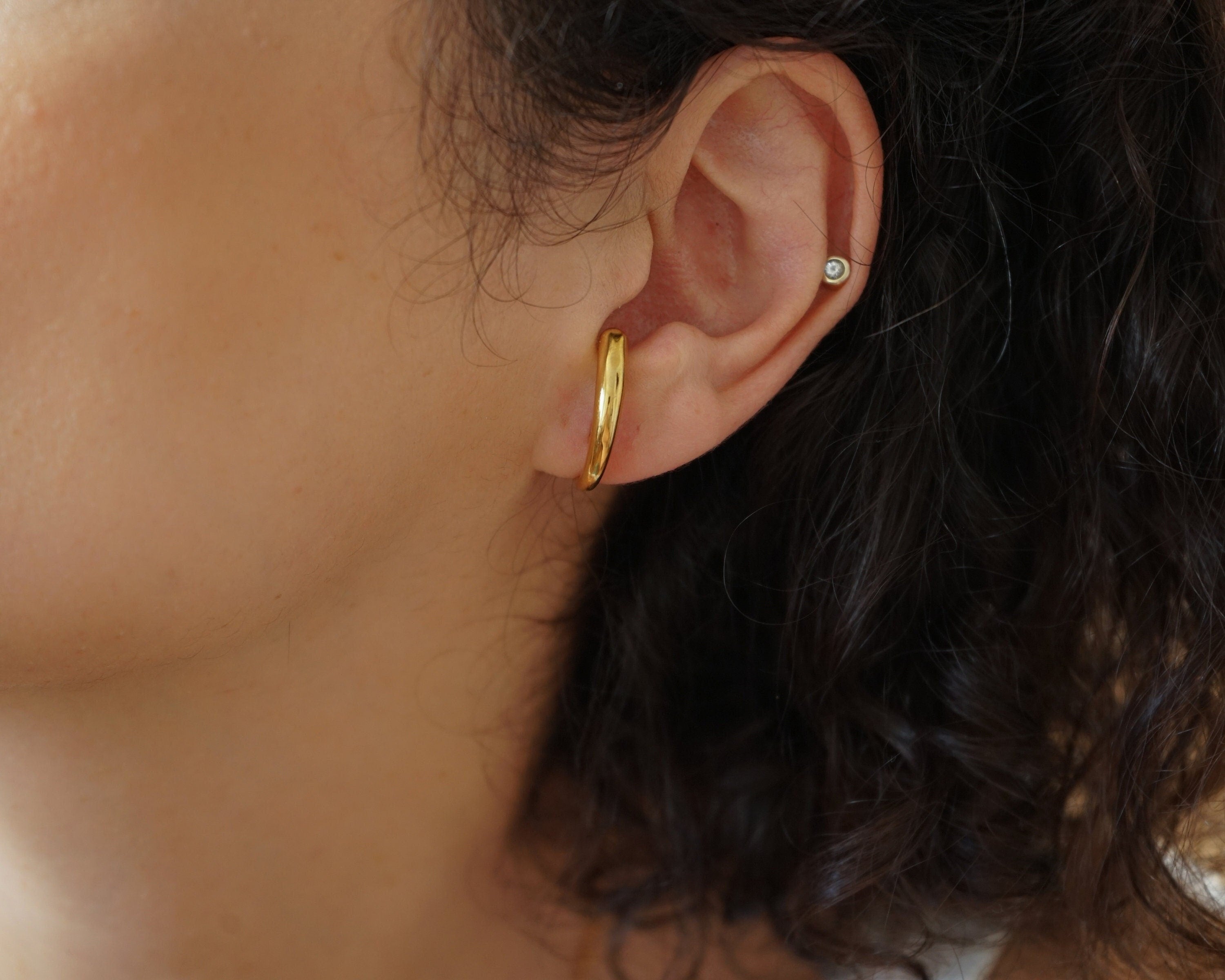 Discover a versatile addition to your jewelry collection with our exquisite Gold Long Lobe Hugger Earrings. This chic style is not only a key trend of the season but also a timeless accessory that you will treasure for years. Designed to effortlessly transition from day to night, these elegant earrings enhance a variety of outfits, adding a touch of sophistication to any look.