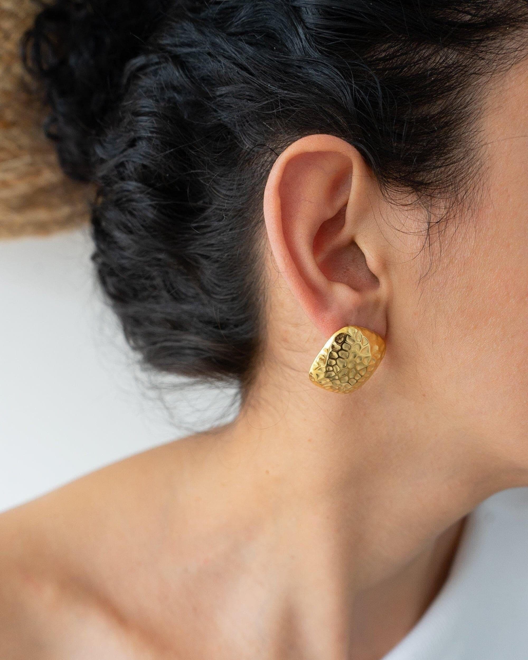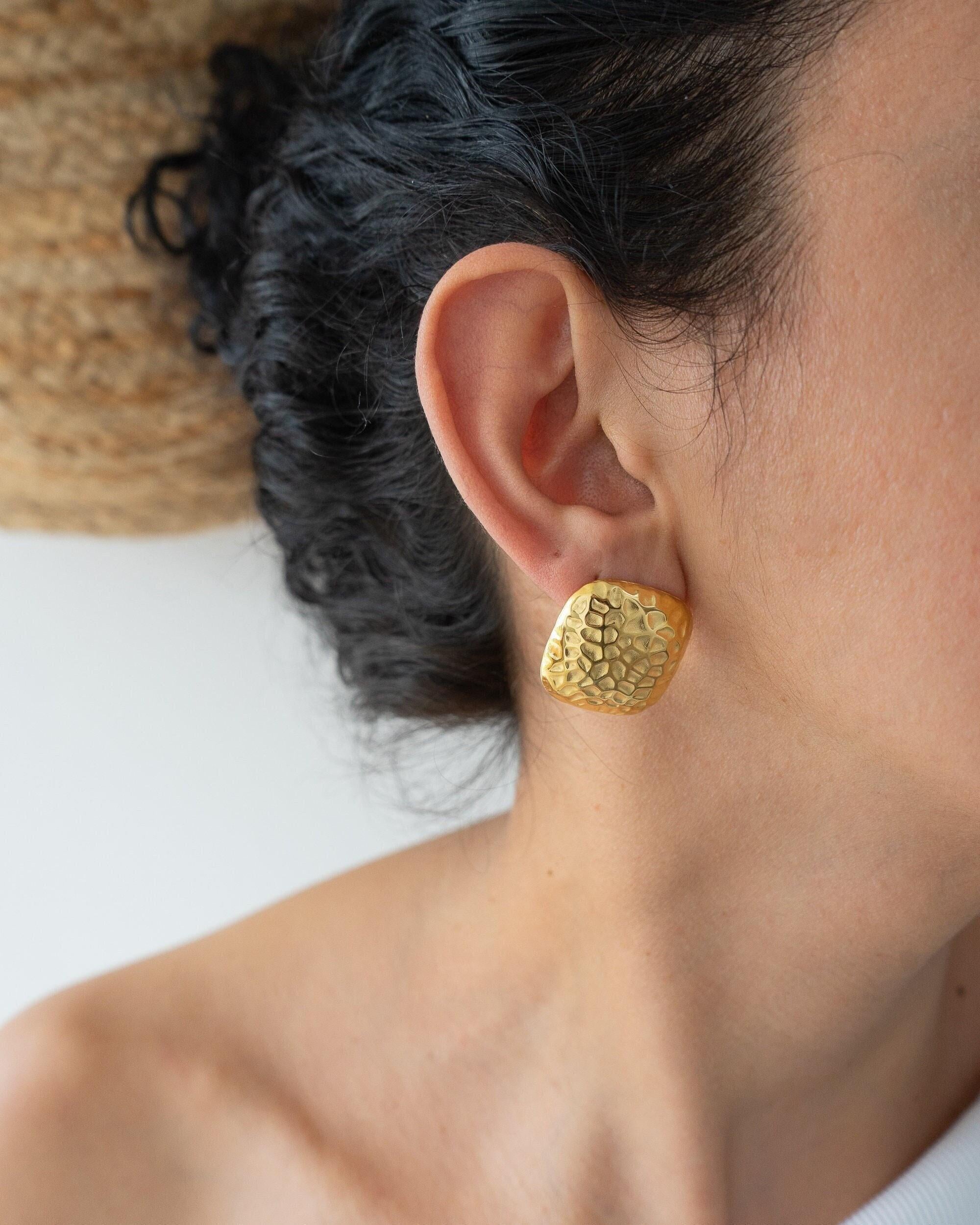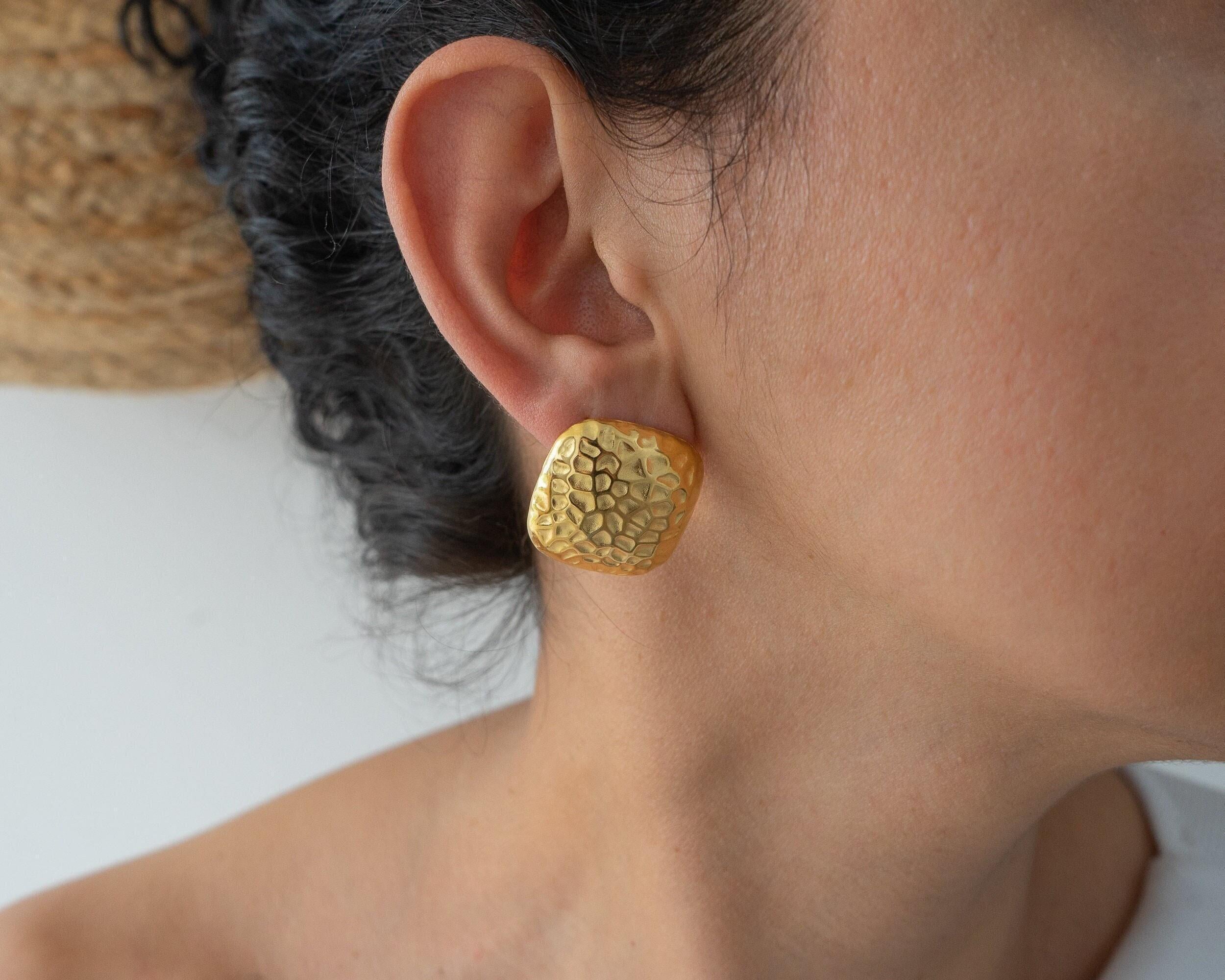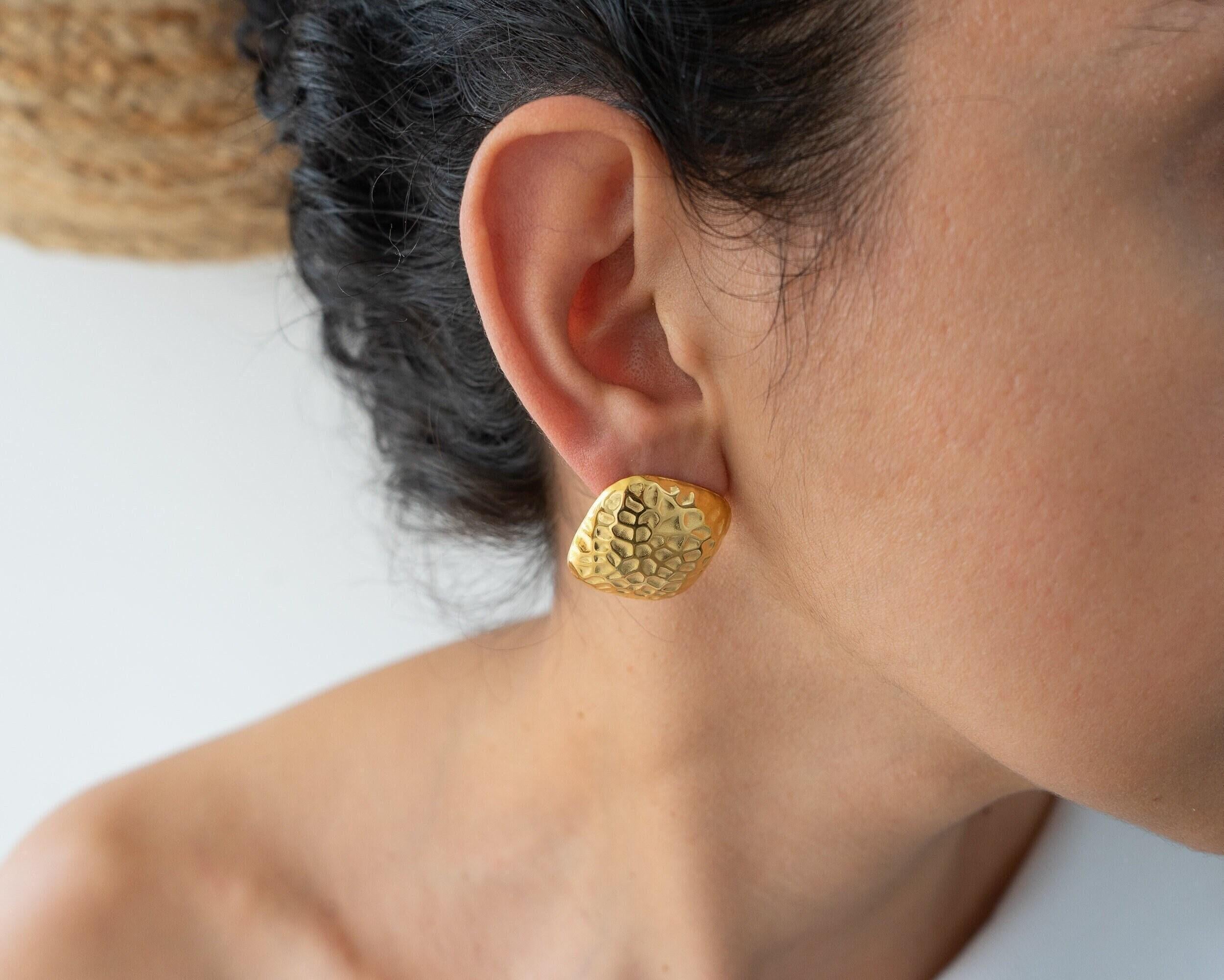 Introducing our large hammered square stud earrings, designed to be a striking accessory for any outfit. These earrings feature a unique hammered texture that adds depth and character, making them perfect for both everyday wear and special occasions. Crafted for durability and waterproof protection, they can withstand daily activities while maintaining their polished look.
