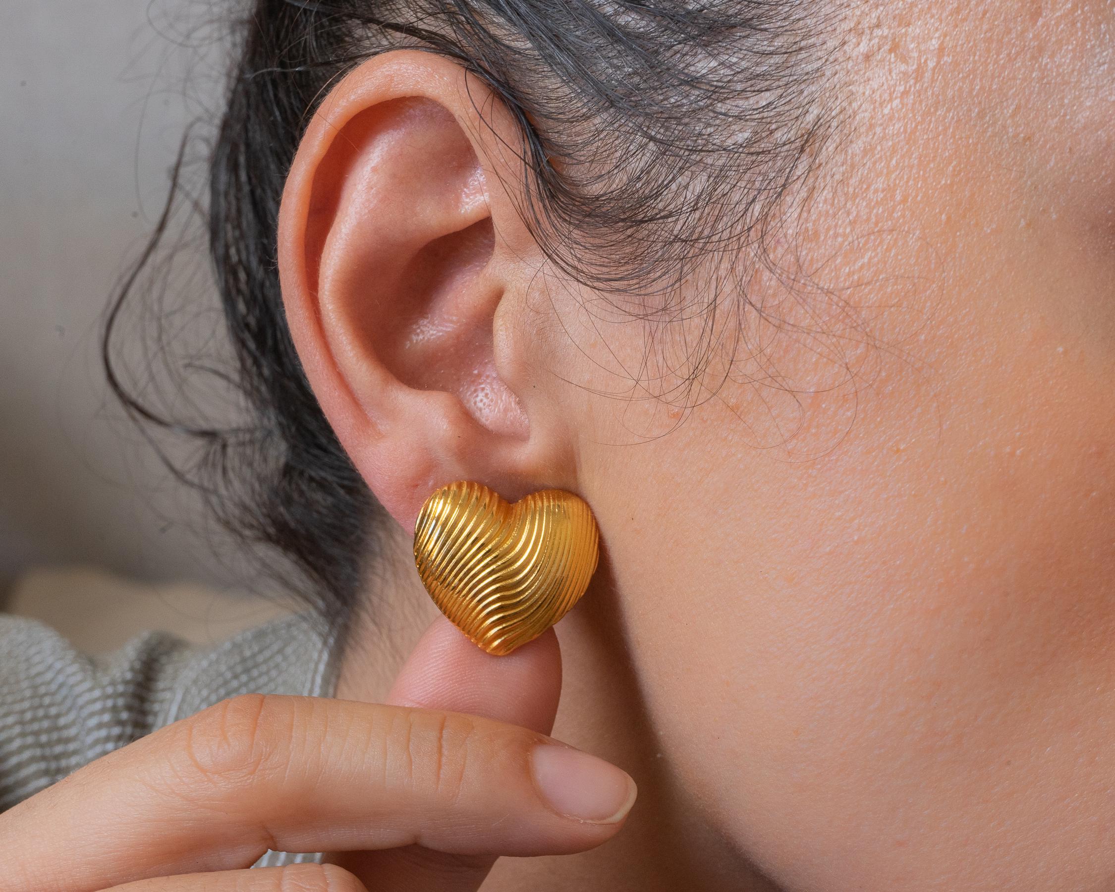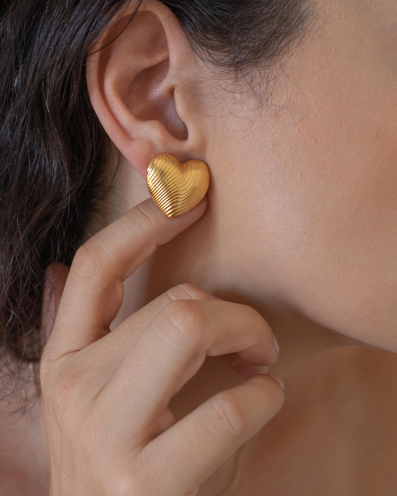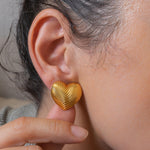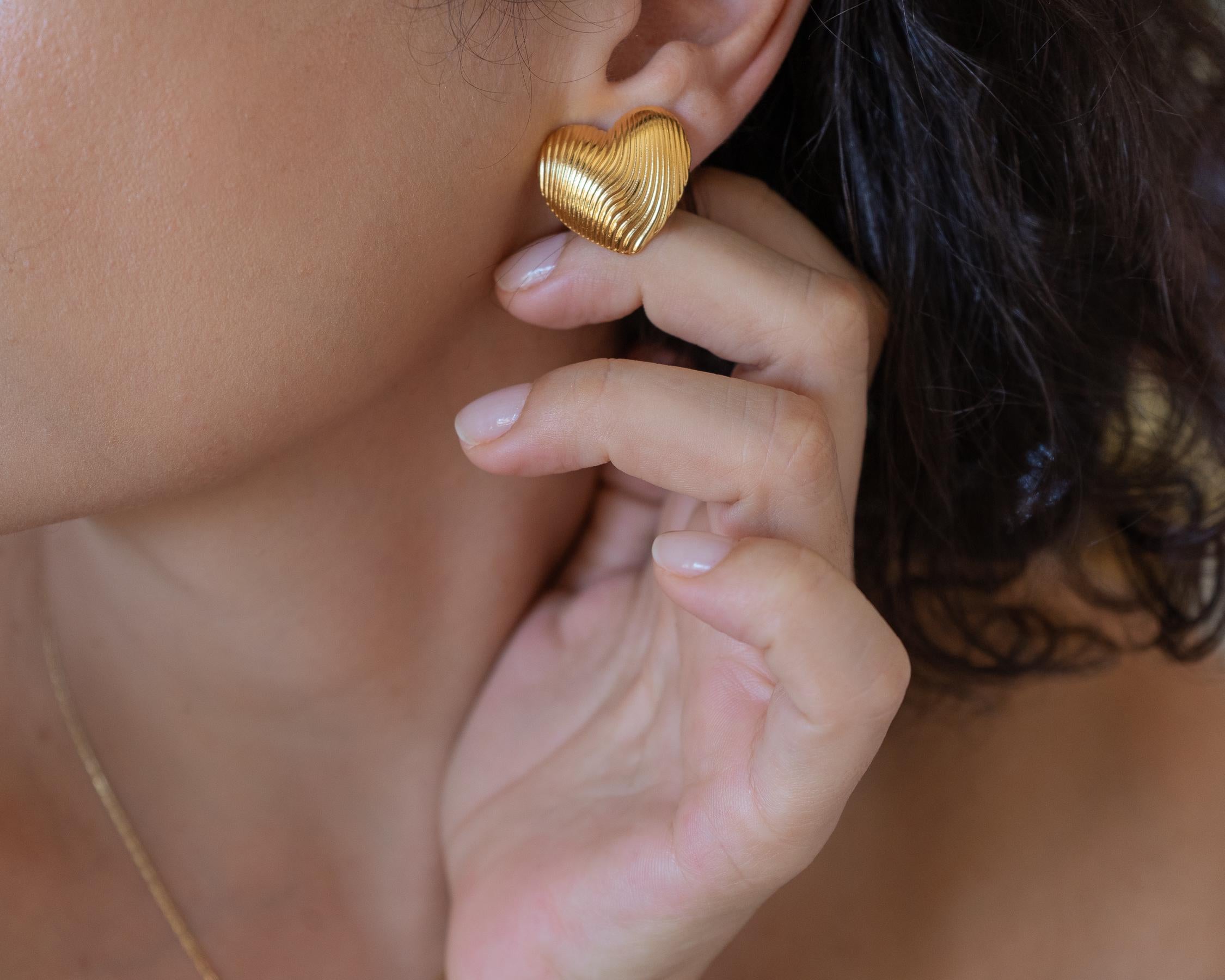 Discover the Medium Gold Heart Stud Earrings, a chic addition to your jewelry collection. Crafted with gold plating, these lovely push-back earrings feature a lined design that adds a touch of sophistication. Their medium size makes them the perfect statement piece to elevate both your everyday and special occasion looks.