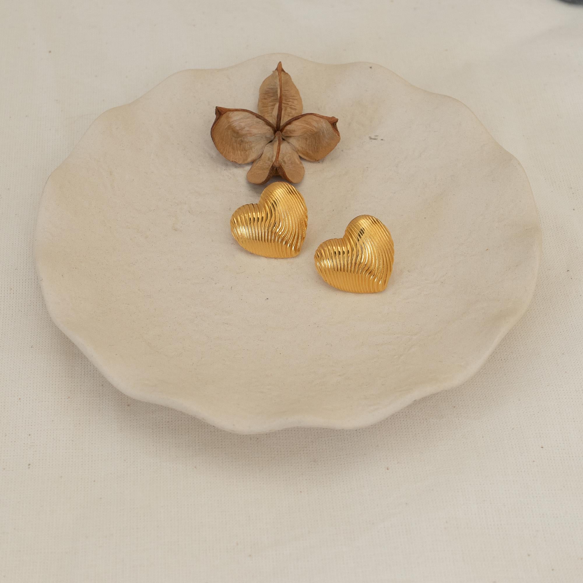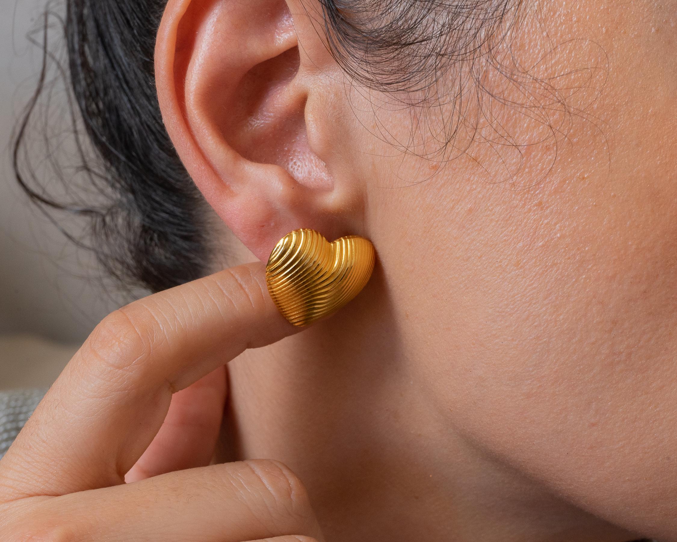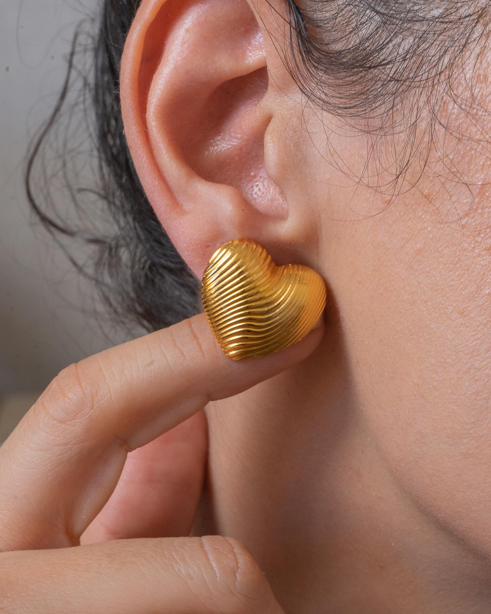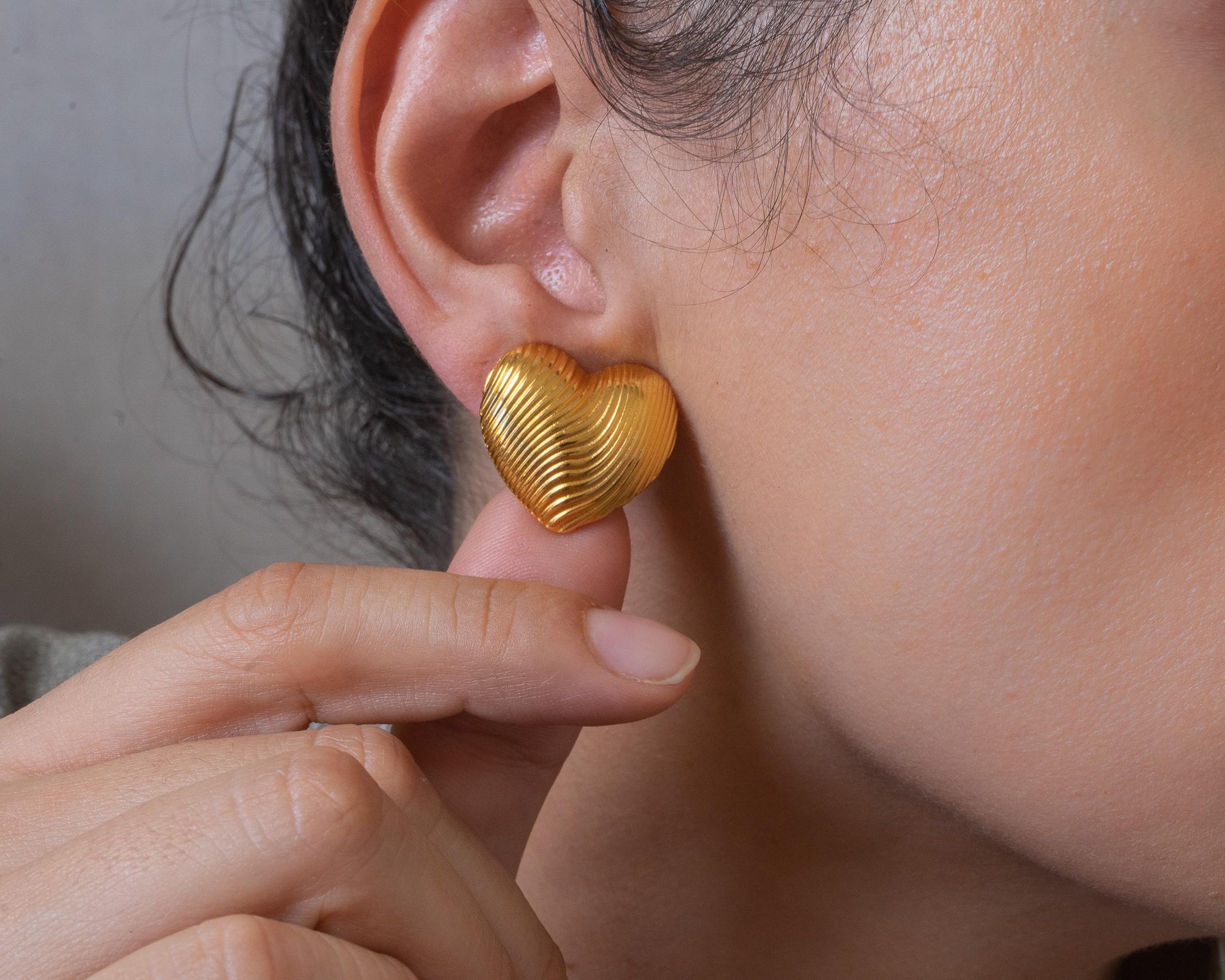 Discover the Medium Gold Heart Stud Earrings, a chic addition to your jewelry collection. Crafted with gold plating, these lovely push-back earrings feature a lined design that adds a touch of sophistication. Their medium size makes them the perfect statement piece to elevate both your everyday and special occasion looks.