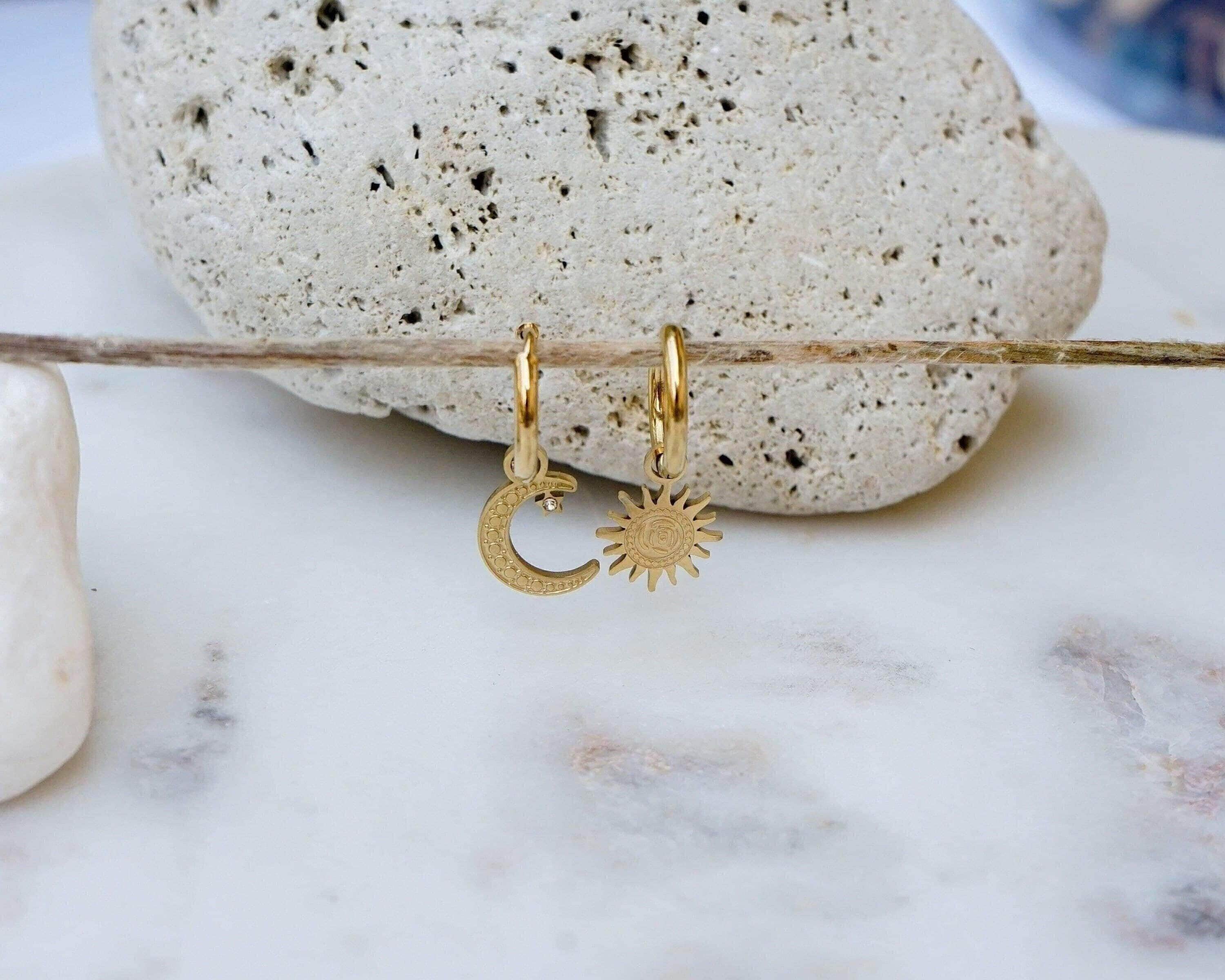 Illuminate your style with these delicate mismatched gold hoop earrings, featuring charming sun and moon designs. Versatile and dainty, these small hoops are an essential addition to any jewelry collection. Whether you choose to showcase the moon on one side and the sun on the other, or opt for a bold statement by wearing them together in the same ear, these earrings are sure to elevate your look.