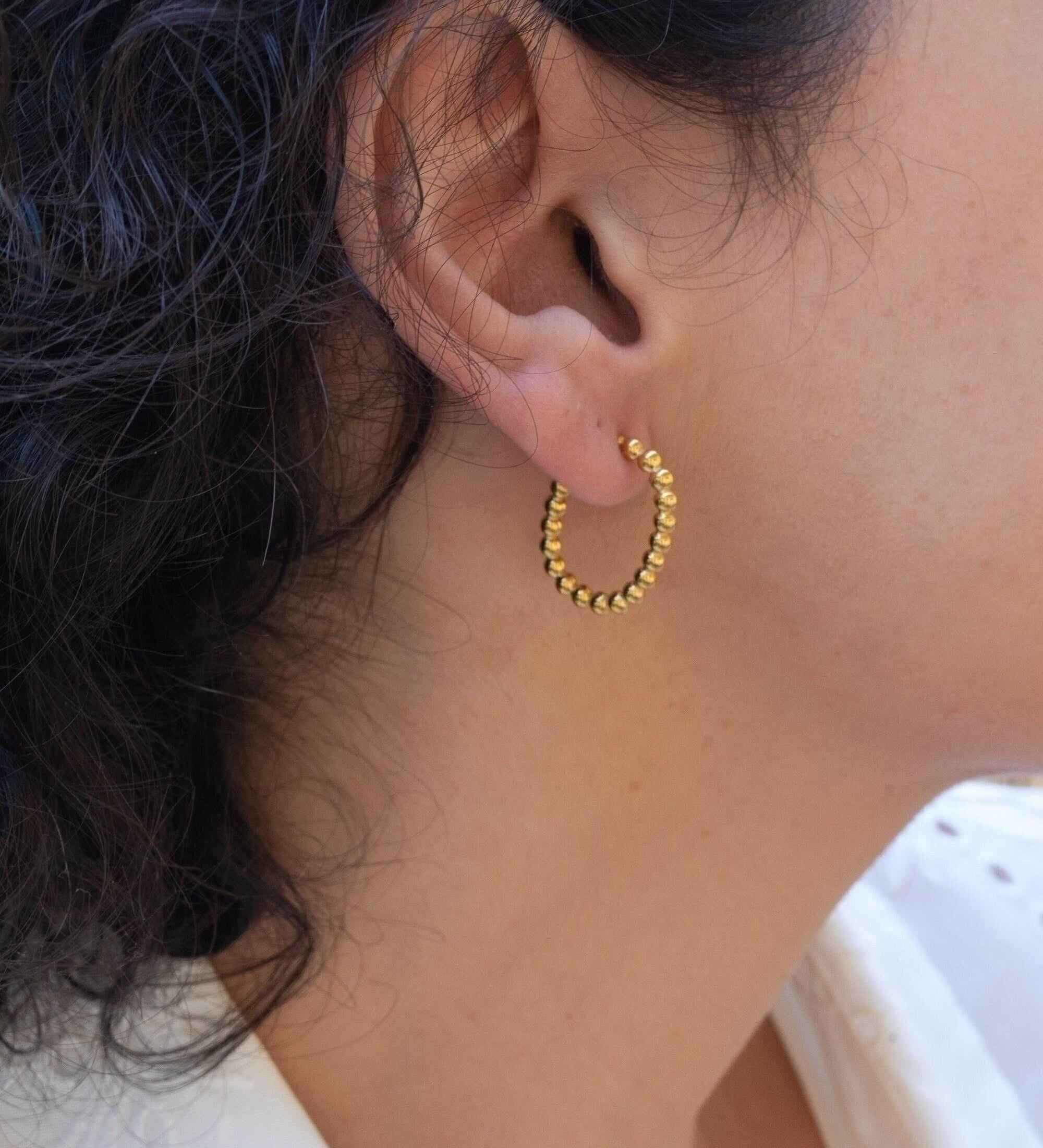 Gold Stainless Steel Thick Round Beaded Hoop Earrings