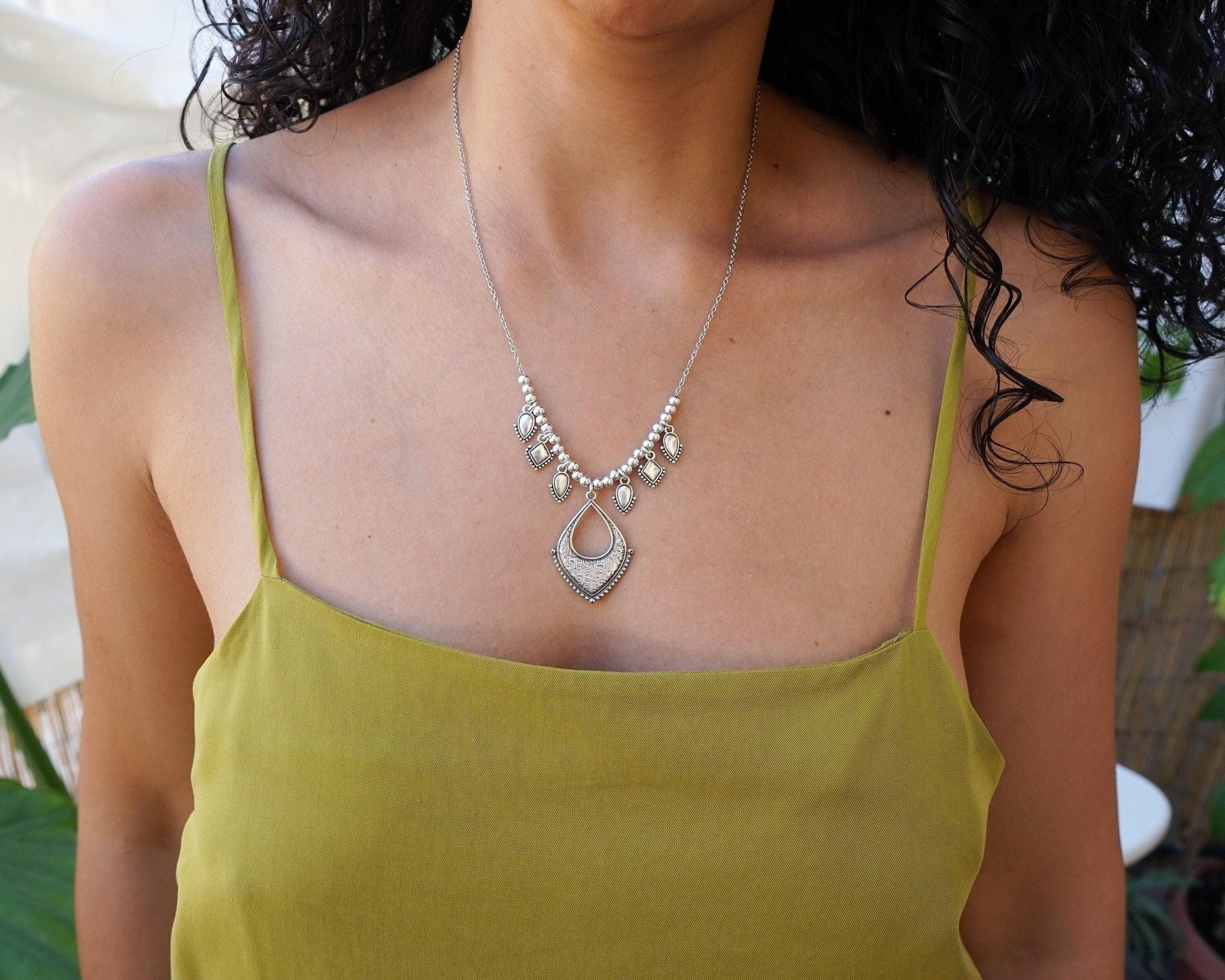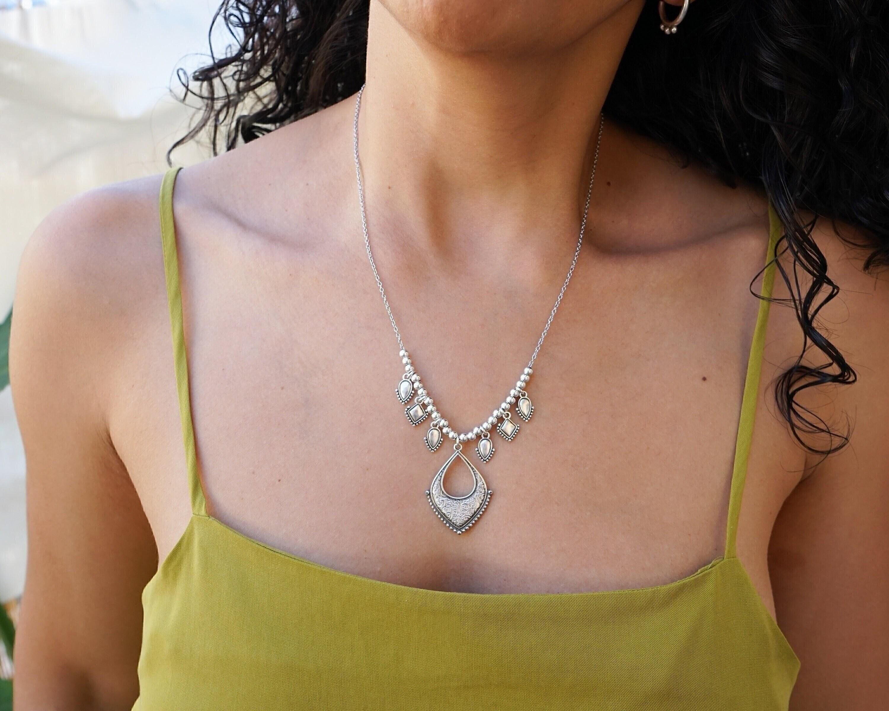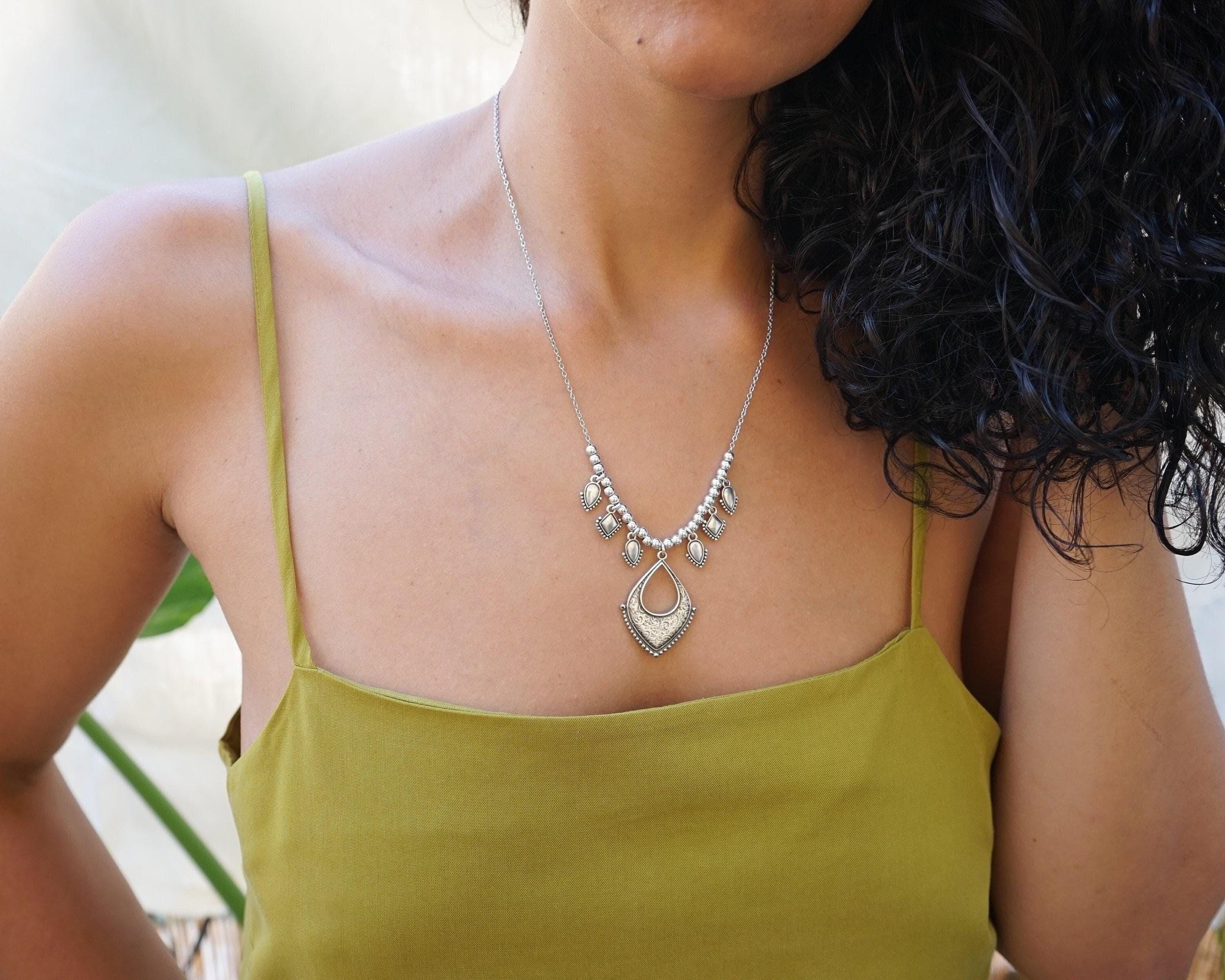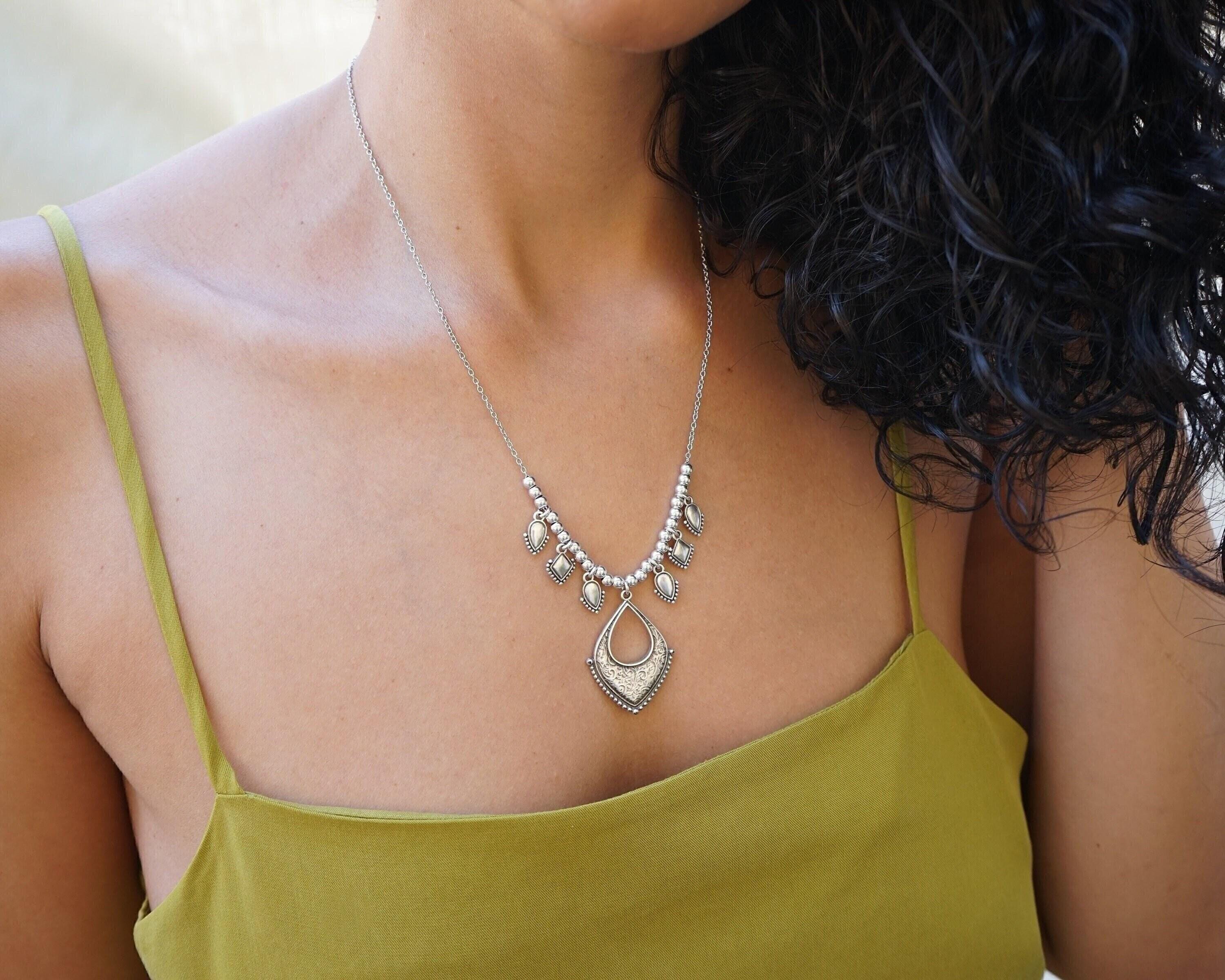 A taste of Turkish style, this necklace is made with an antique silver rhombus drop pendant with grains and small teardrop-rhombus charms used as tassels.