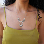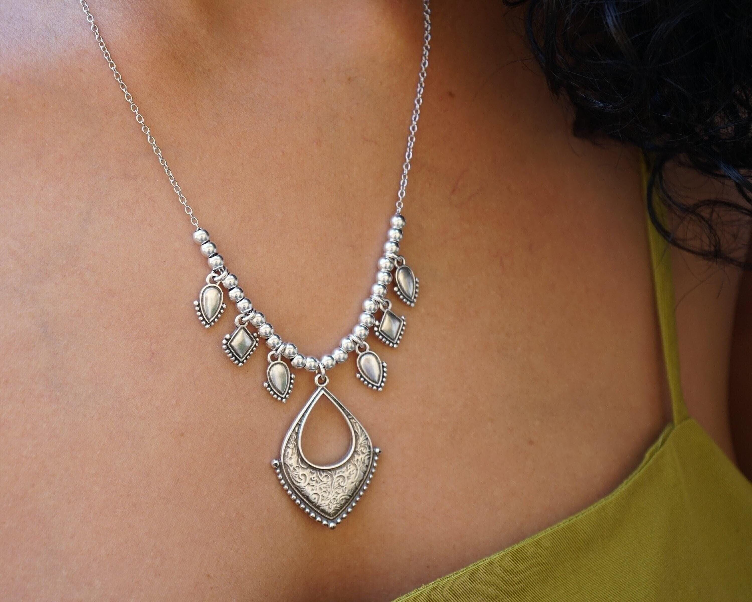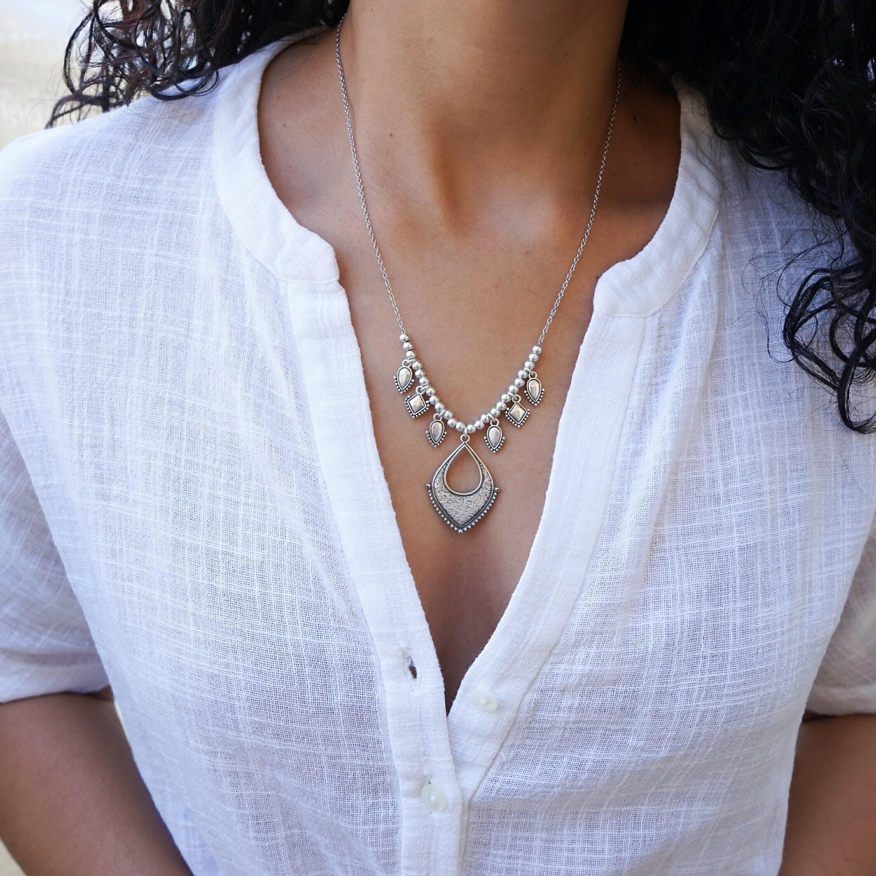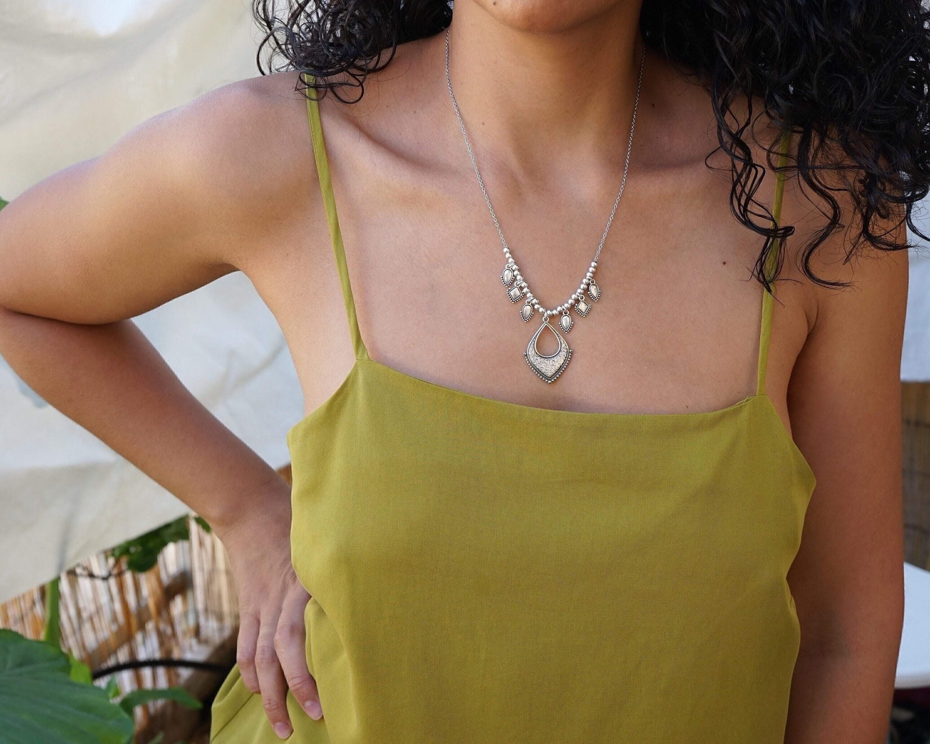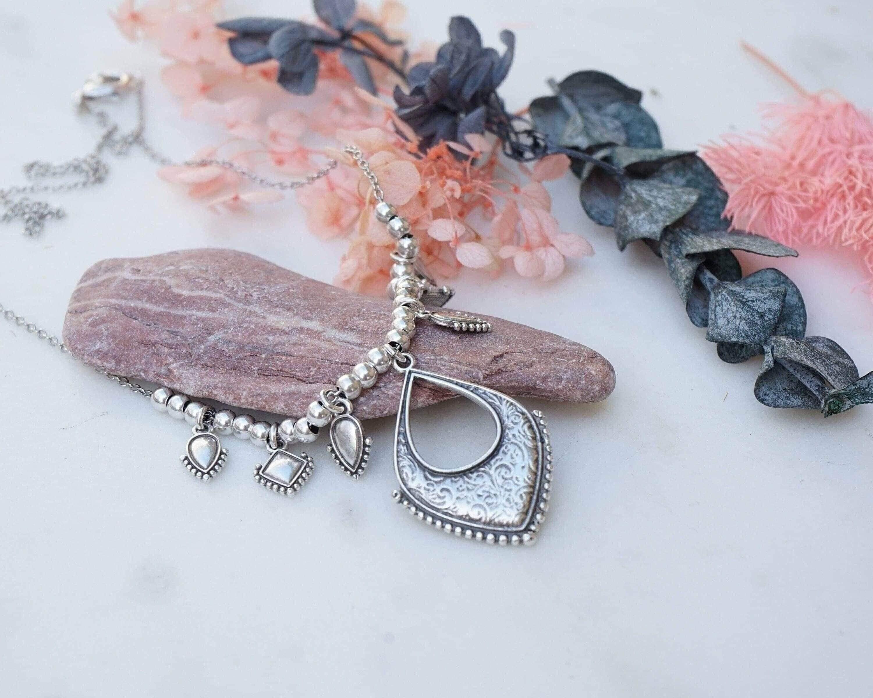 A taste of Turkish style, this necklace is made with an antique silver rhombus drop pendant with grains and small teardrop-rhombus charms used as tassels.