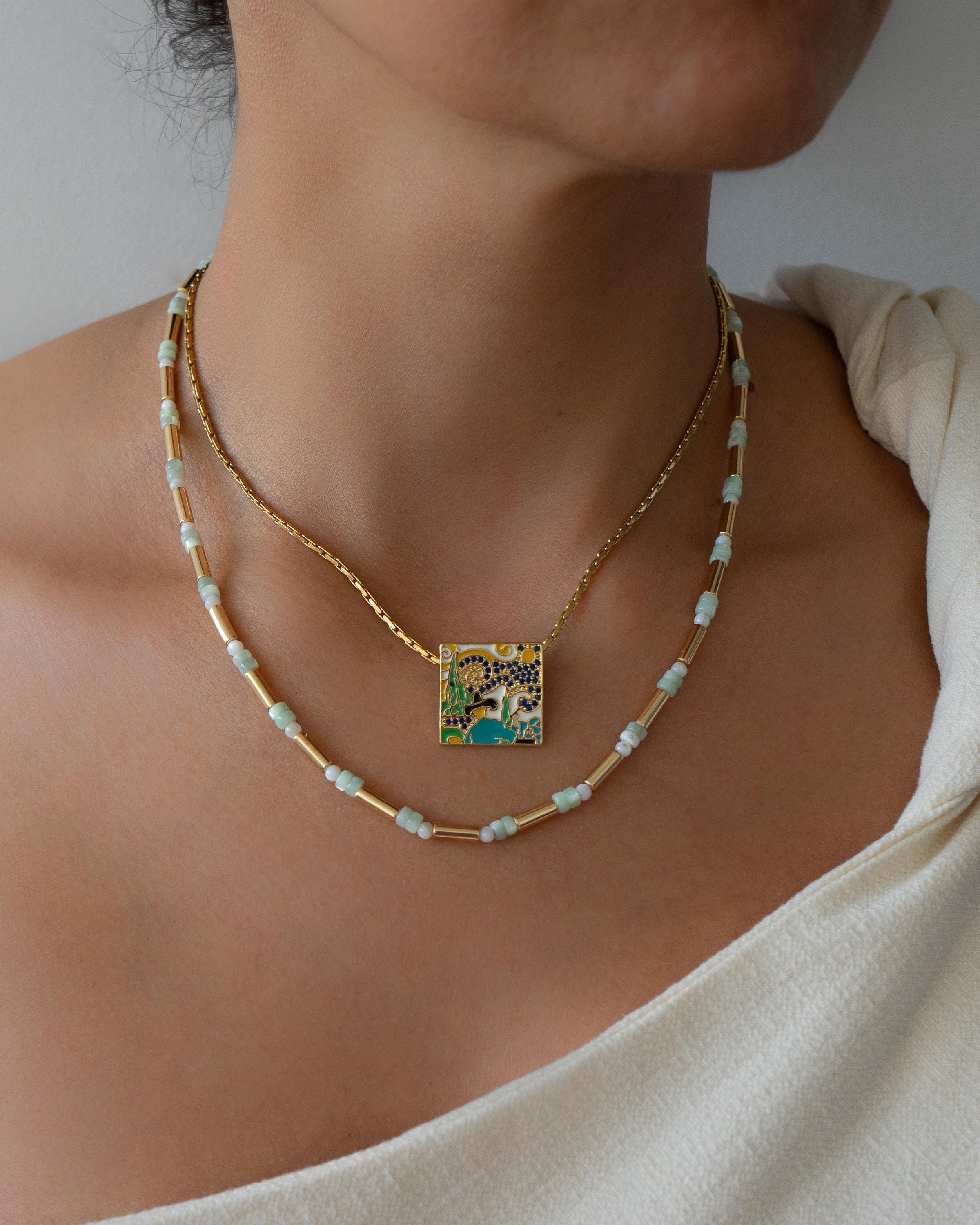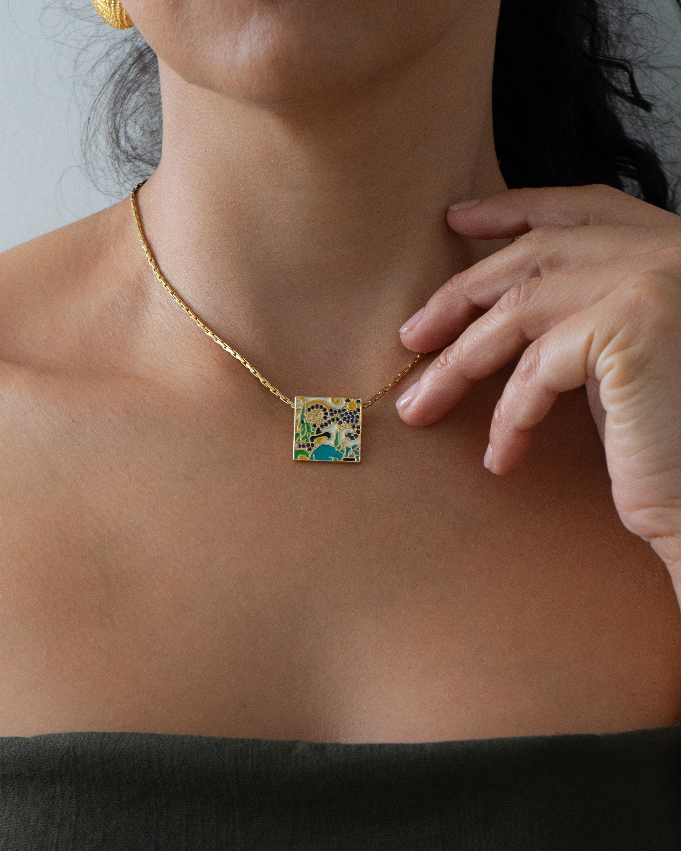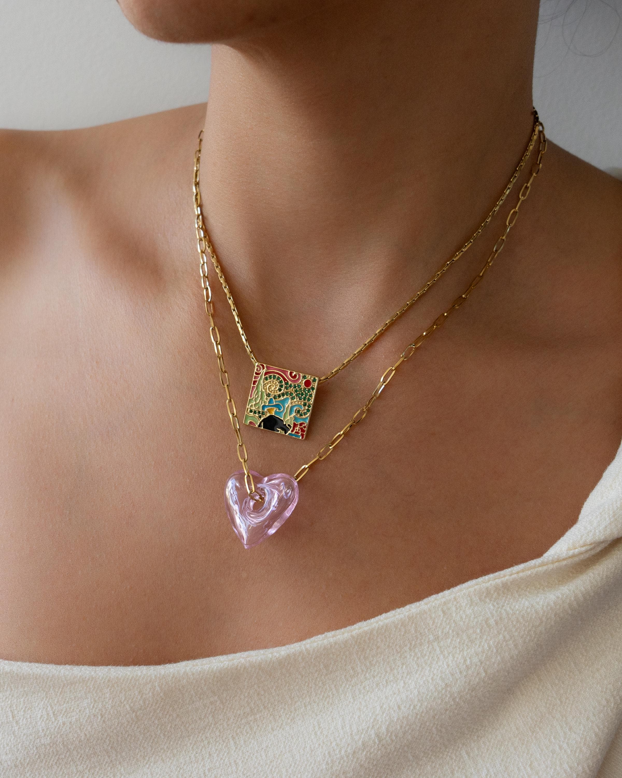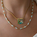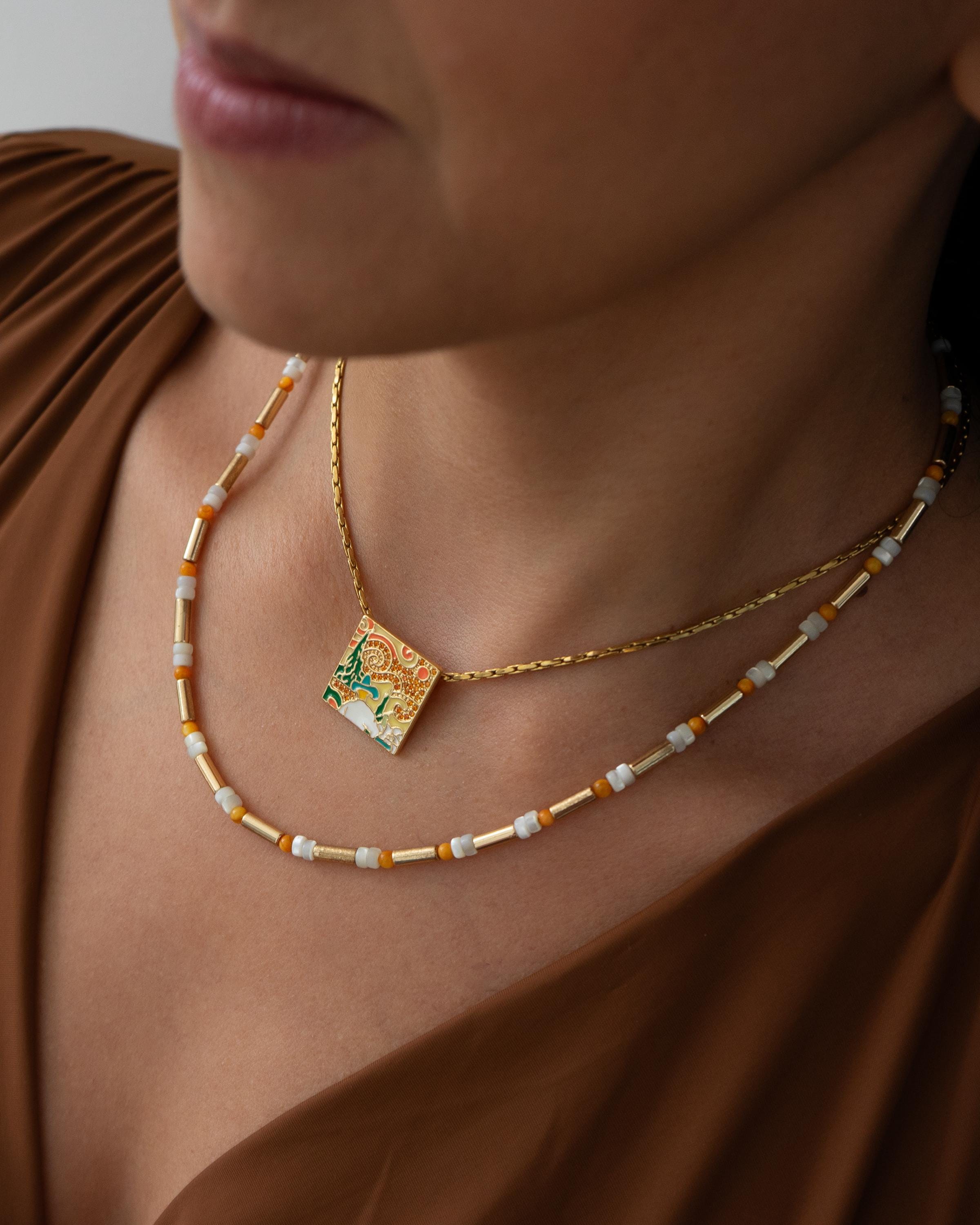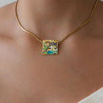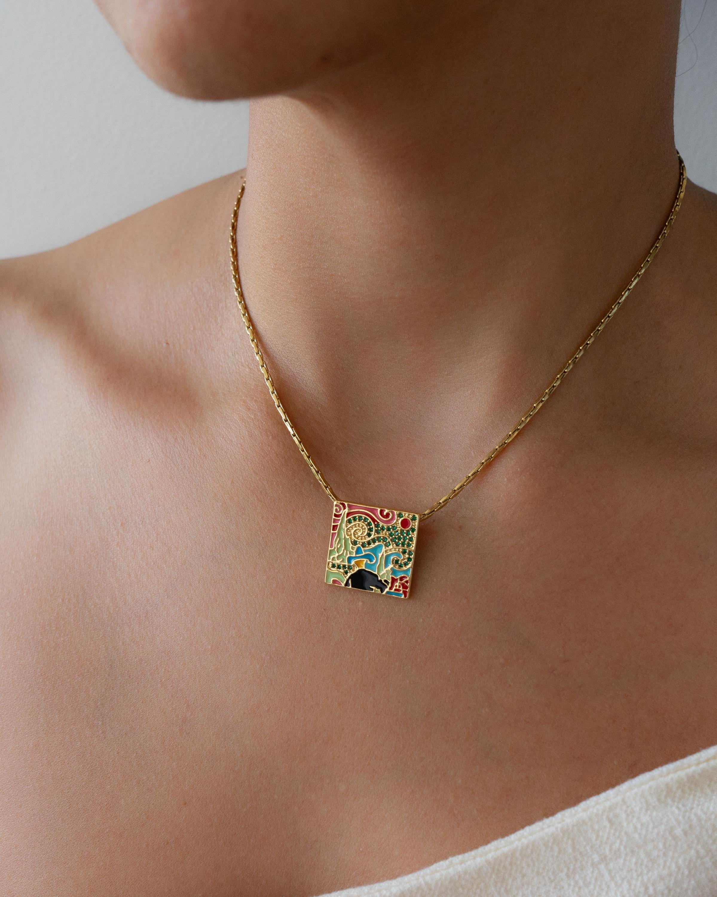 This square enamel pendant features vibrant, detailed patterns framed in gold plating — a miniature artwork hanging gracefully from a sleek stainless steel cobra chain. Perfect worn solo or layered with other necklaces for a personalized look.