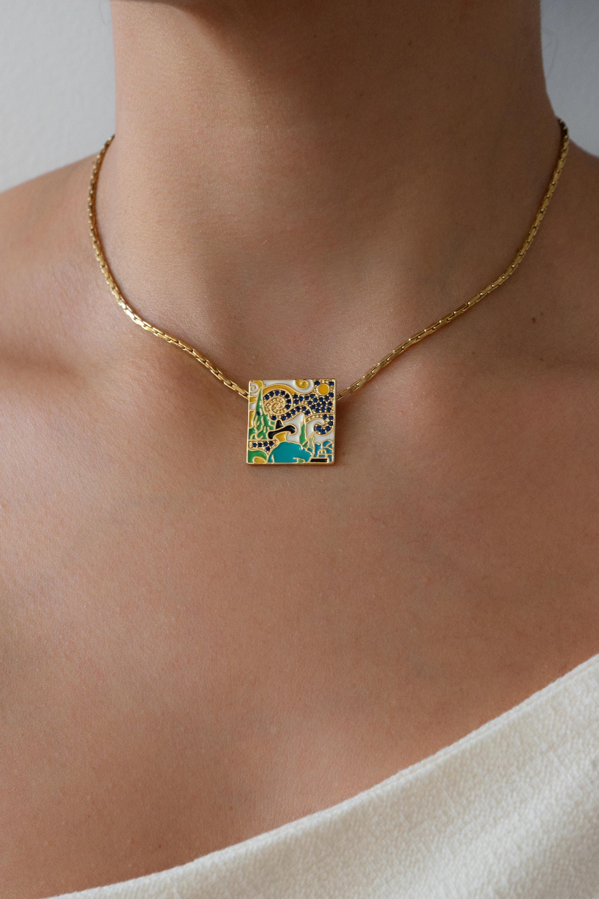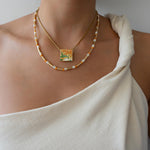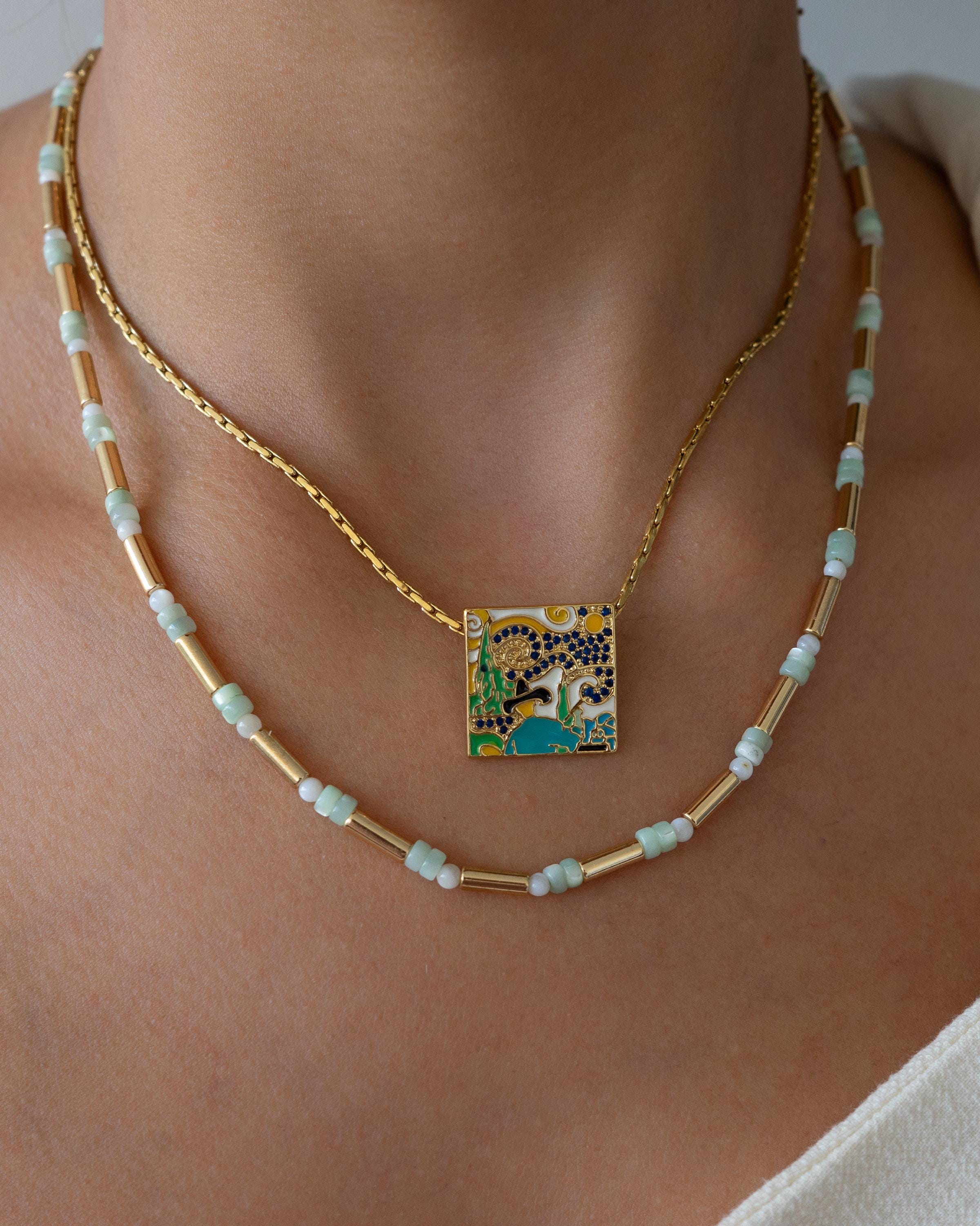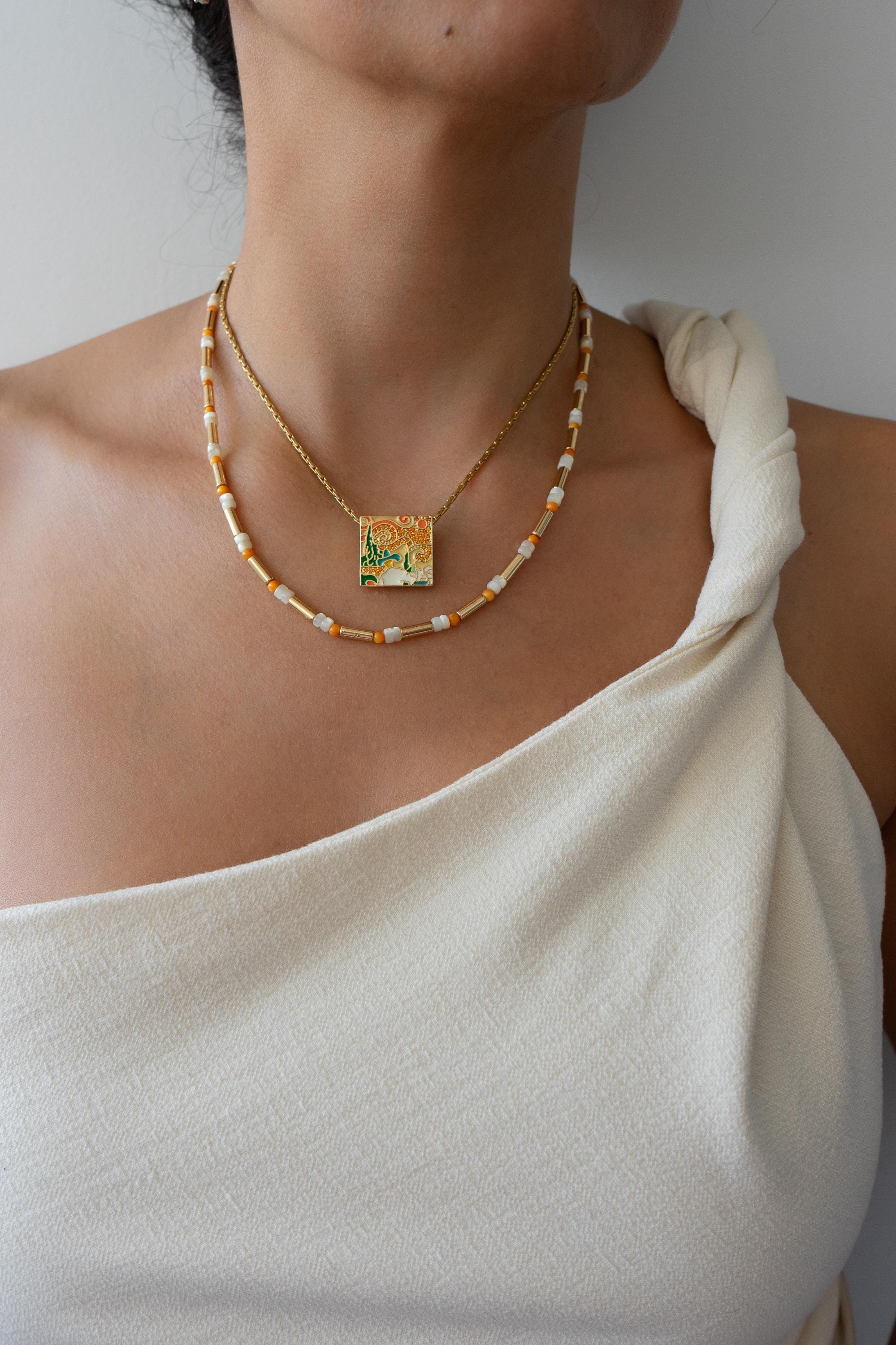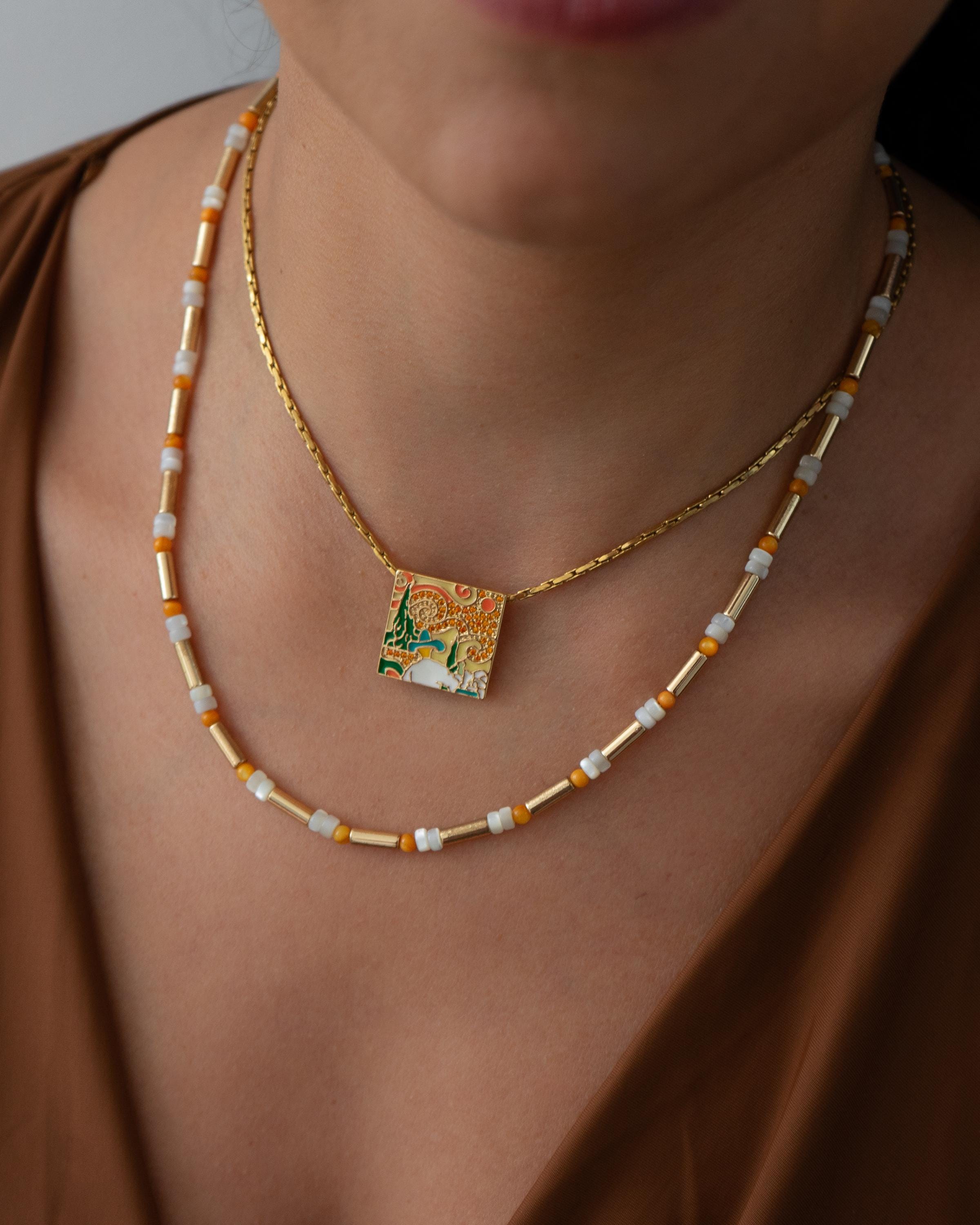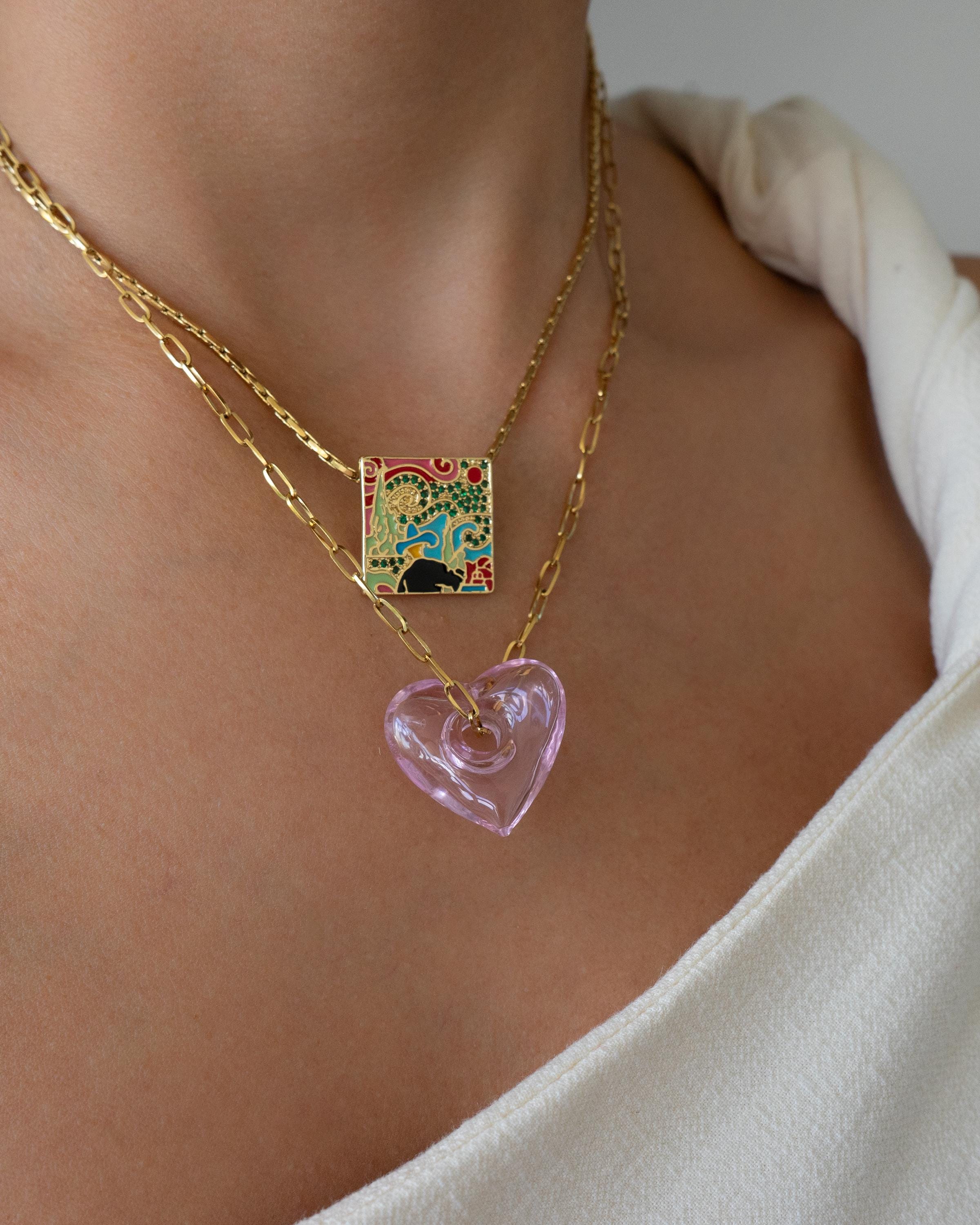 This square enamel pendant features vibrant, detailed patterns framed in gold plating — a miniature artwork hanging gracefully from a sleek stainless steel cobra chain. Perfect worn solo or layered with other necklaces for a personalized look.
