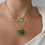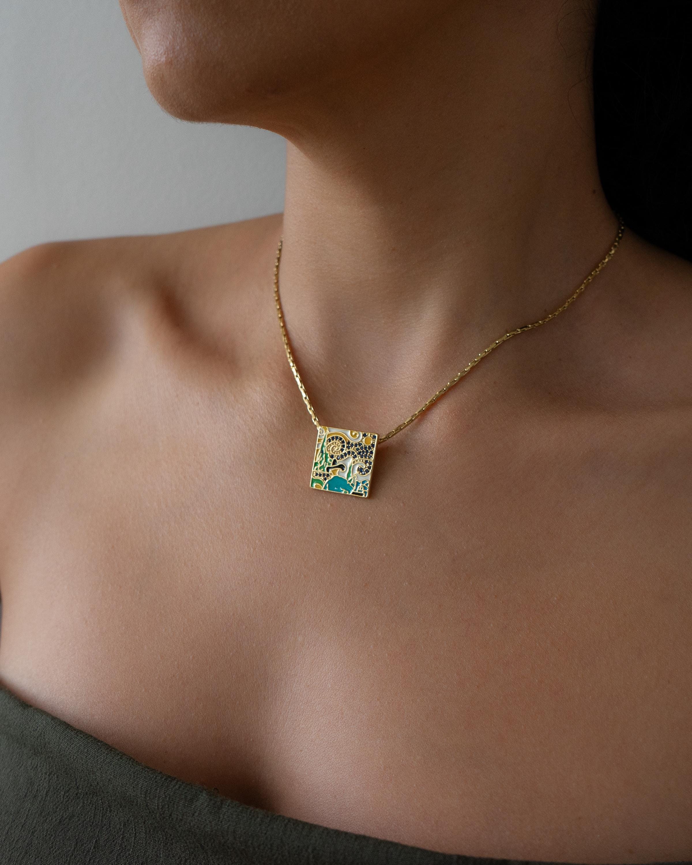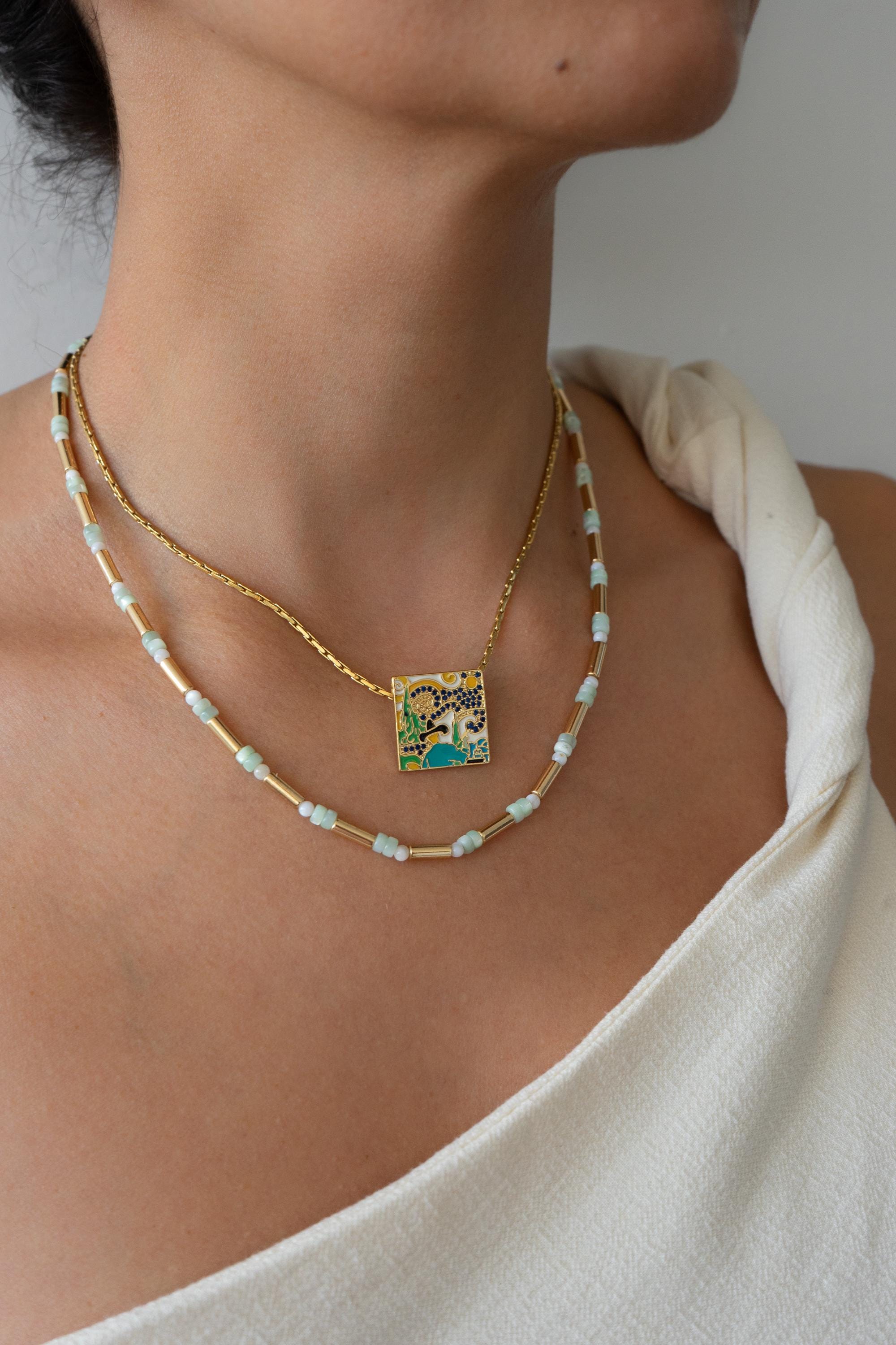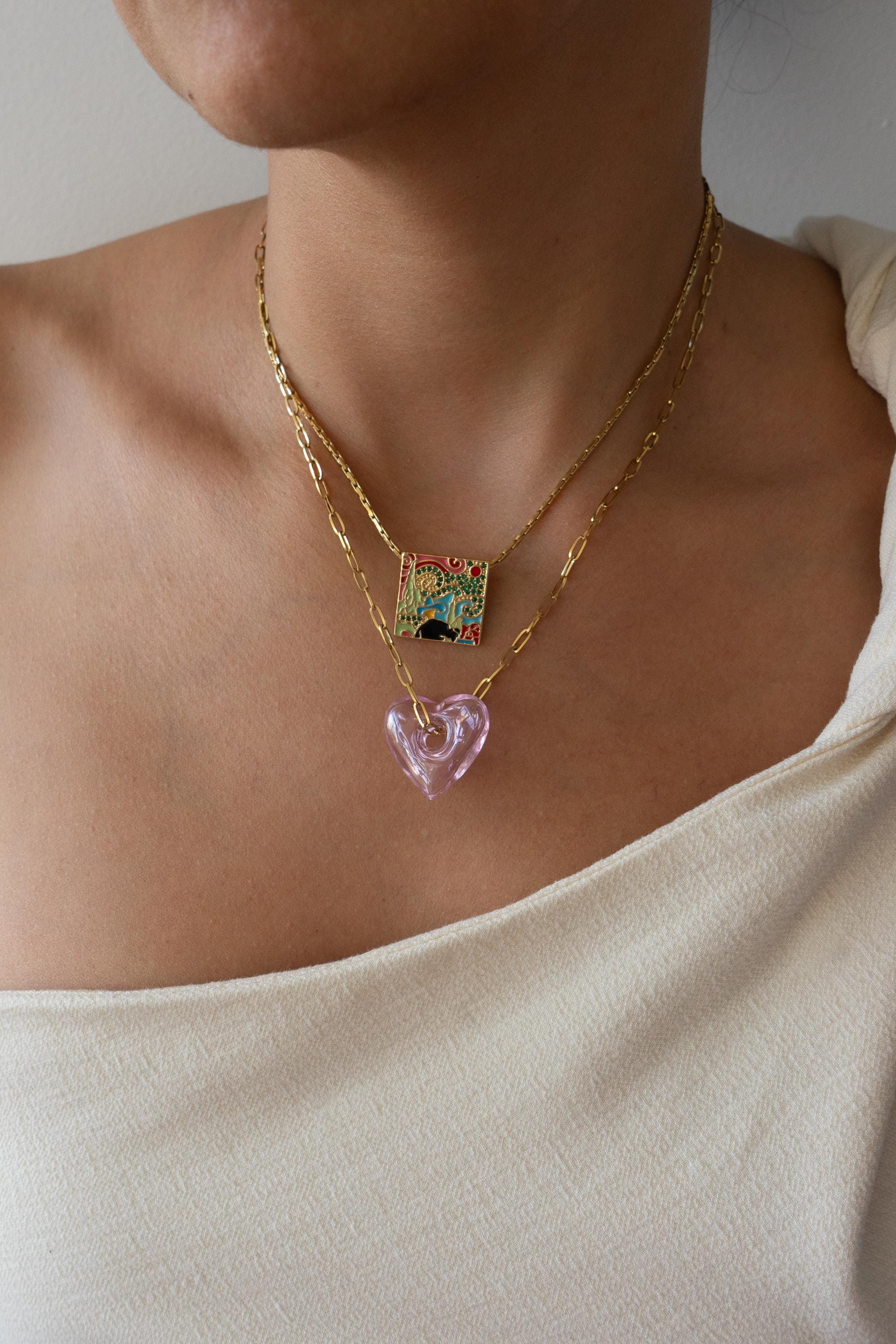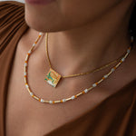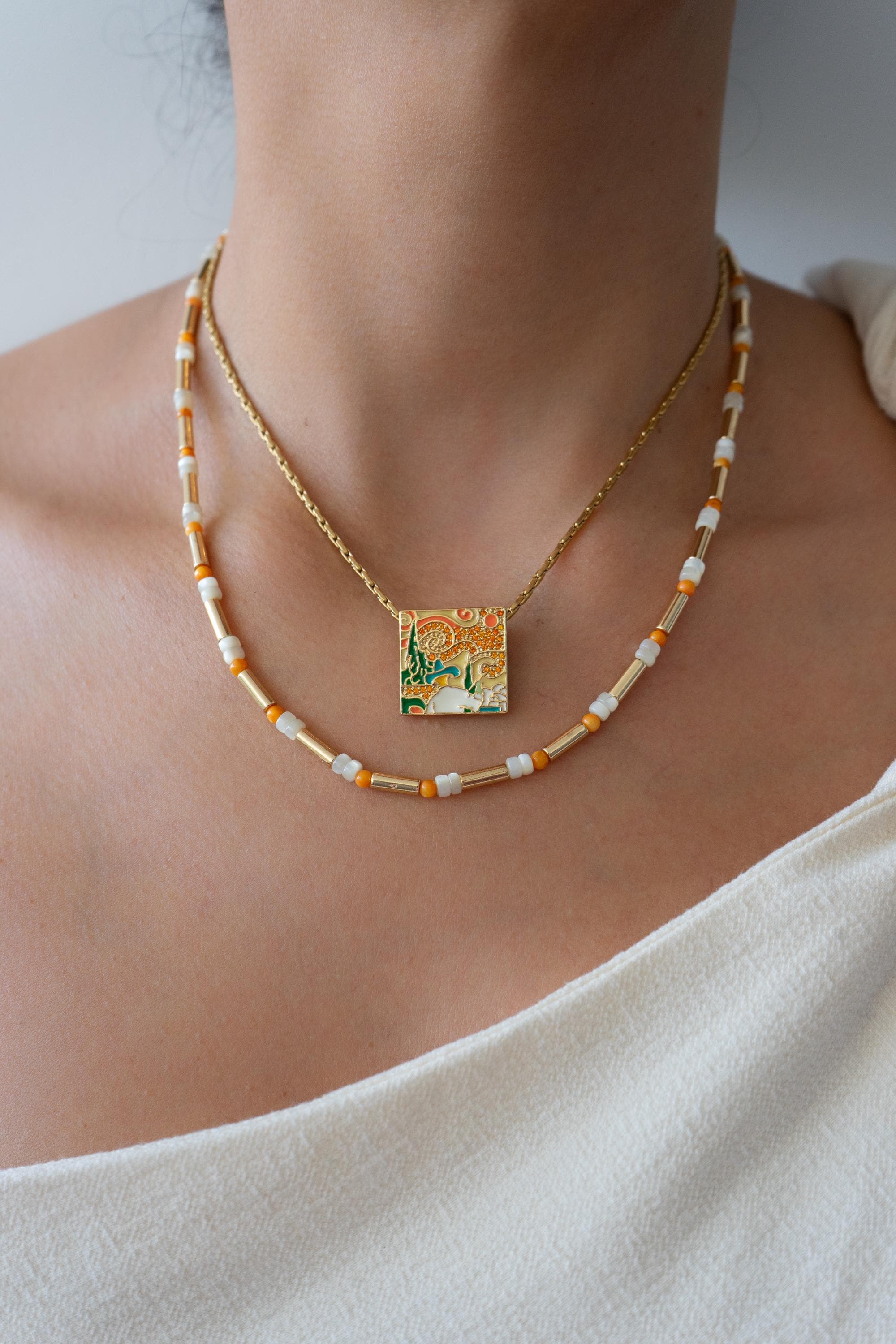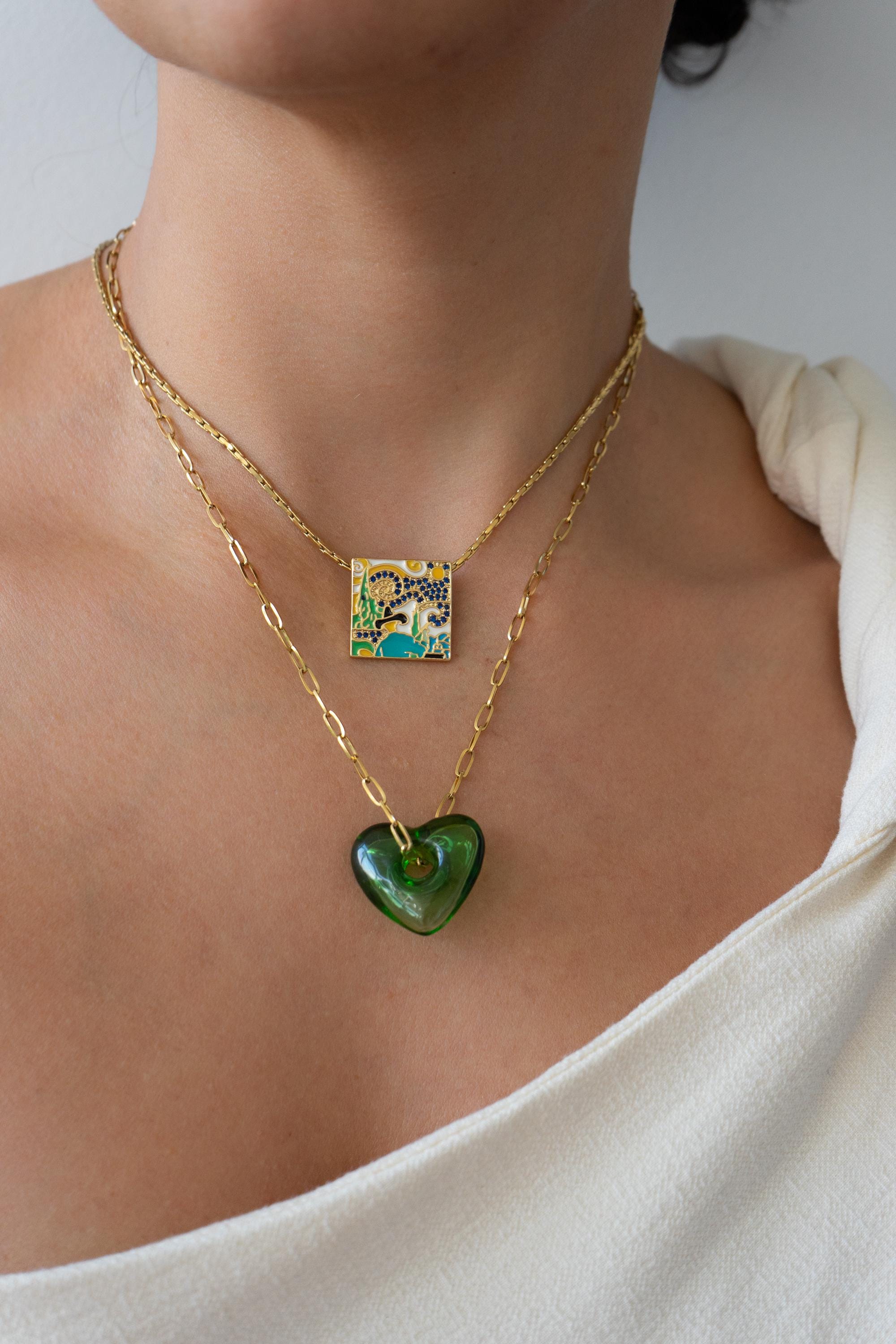 This square enamel pendant features vibrant, detailed patterns framed in gold plating — a miniature artwork hanging gracefully from a sleek stainless steel cobra chain. Perfect worn solo or layered with other necklaces for a personalized look.