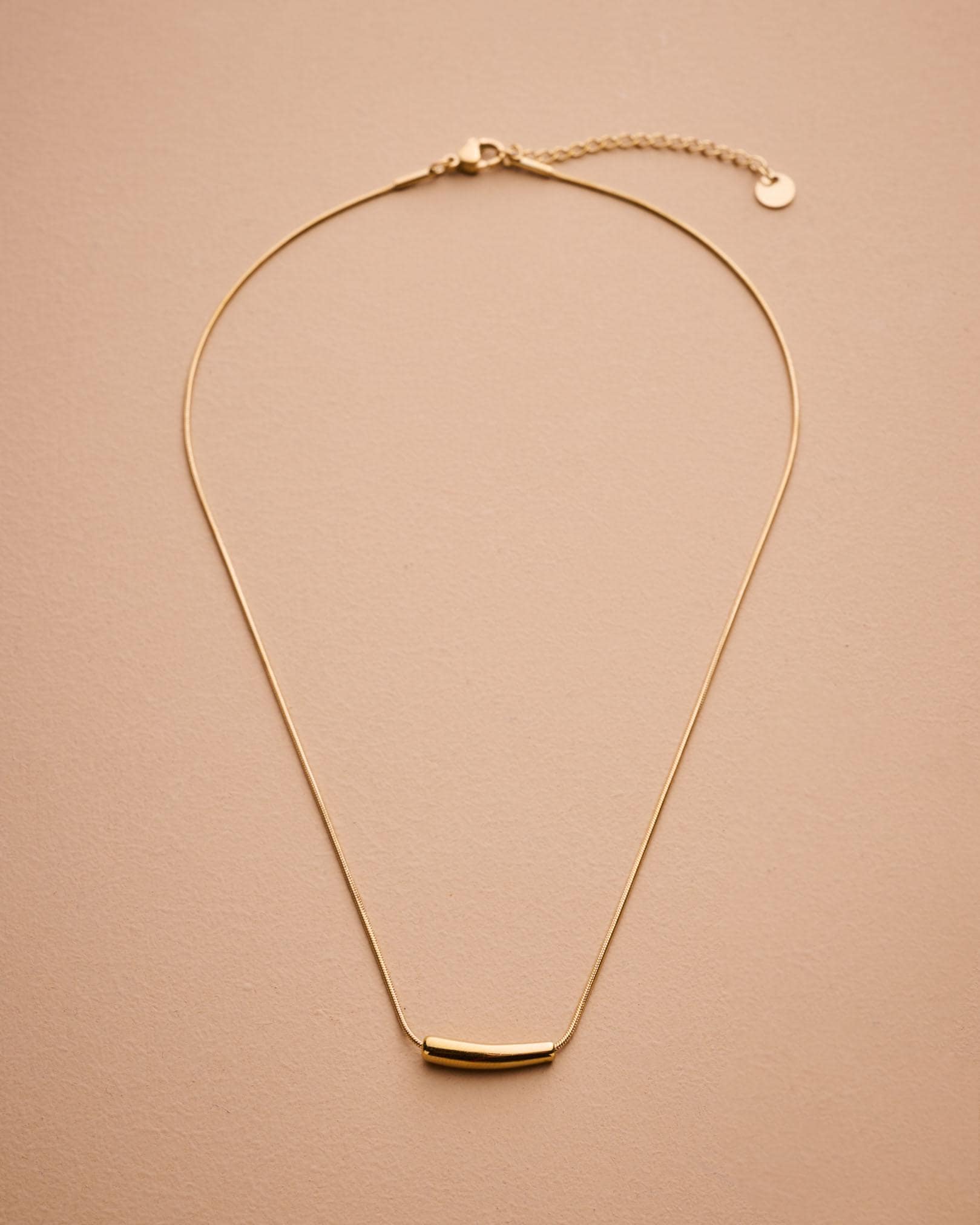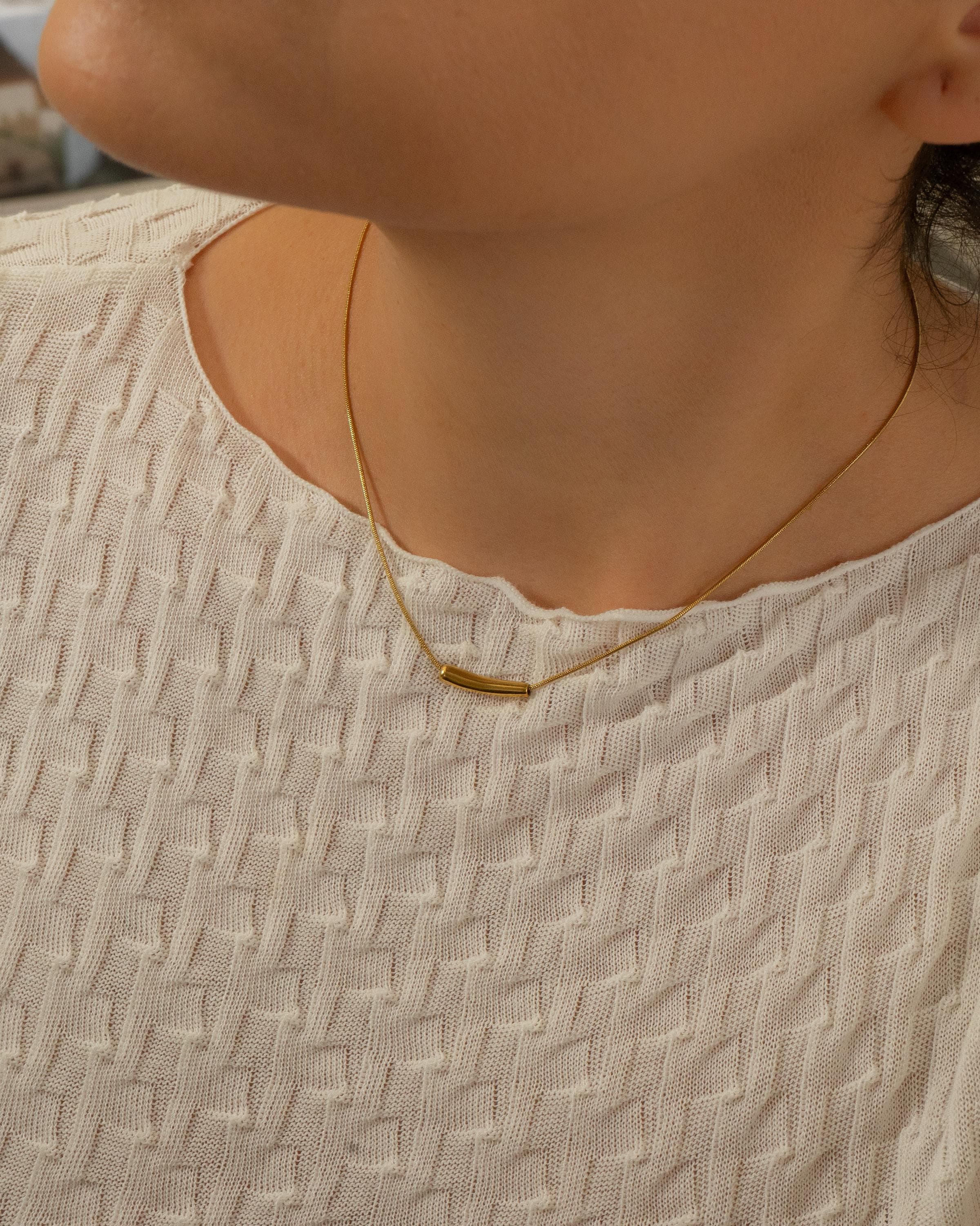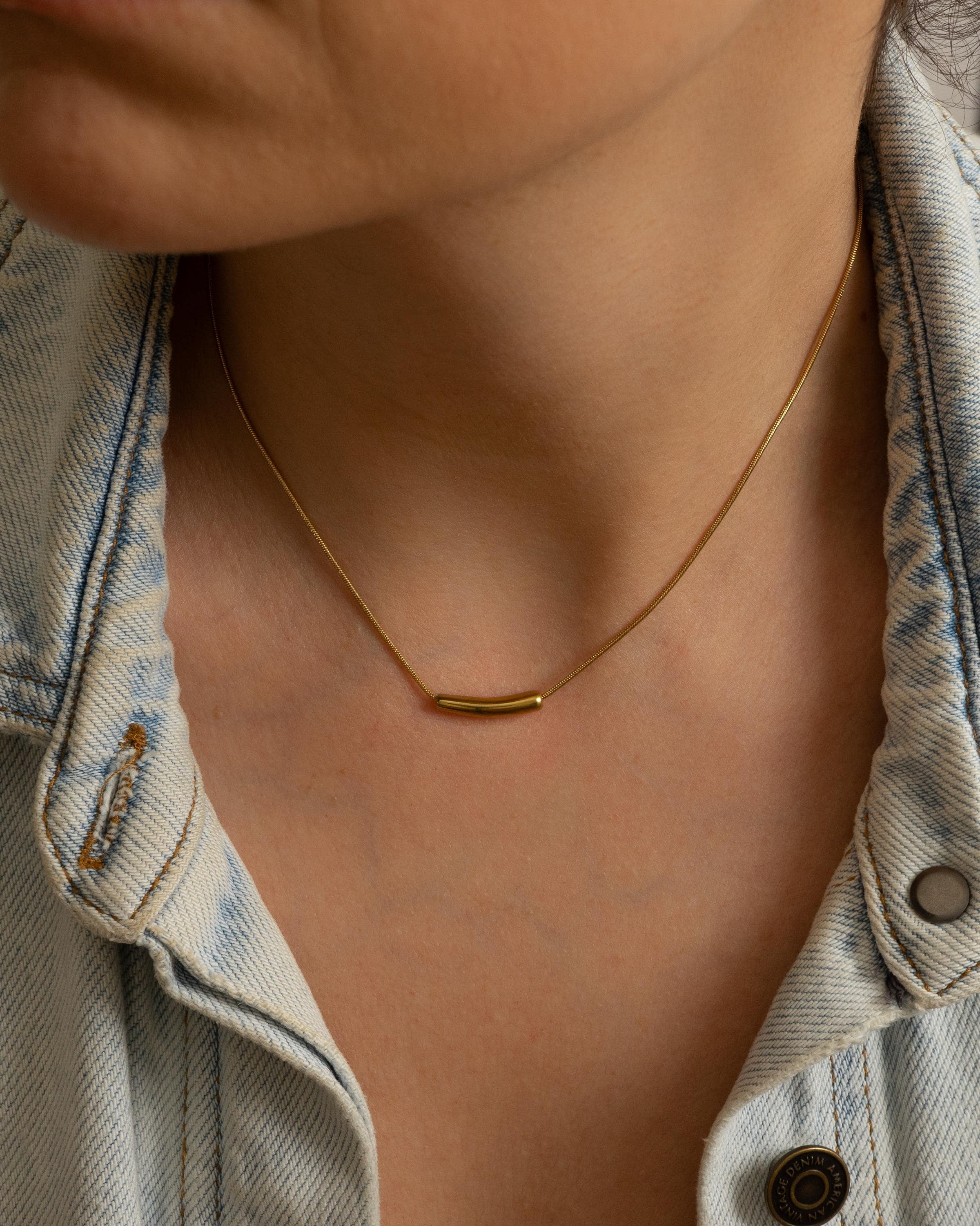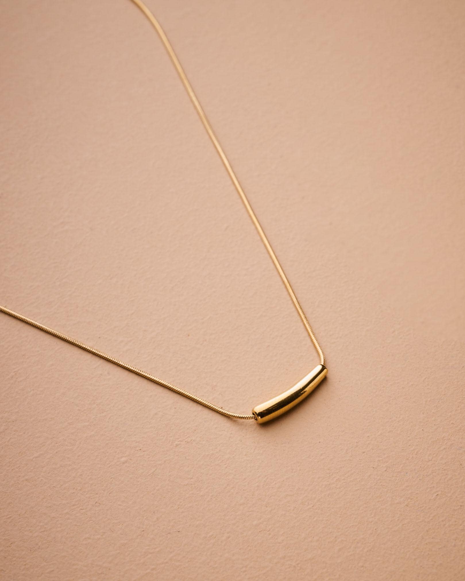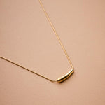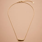 A sleek and minimal gold necklace featuring a polished bar pendant threaded on a round snake chain. Its smooth, curved bar (5x20mm) adds a refined modern touch that catches the light beautifully, making it the perfect piece for both day and night looks.