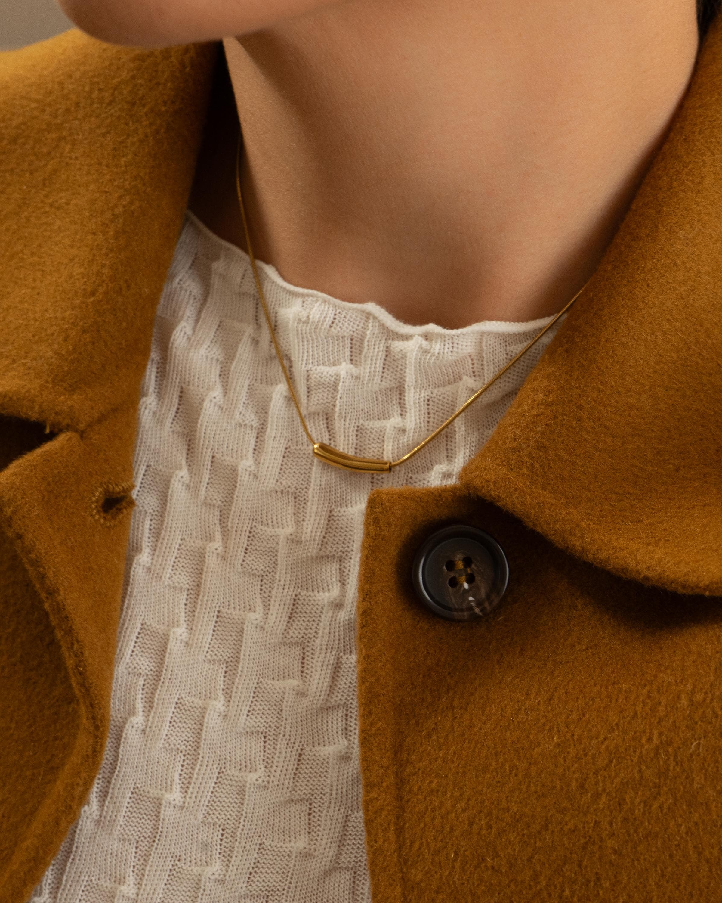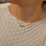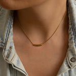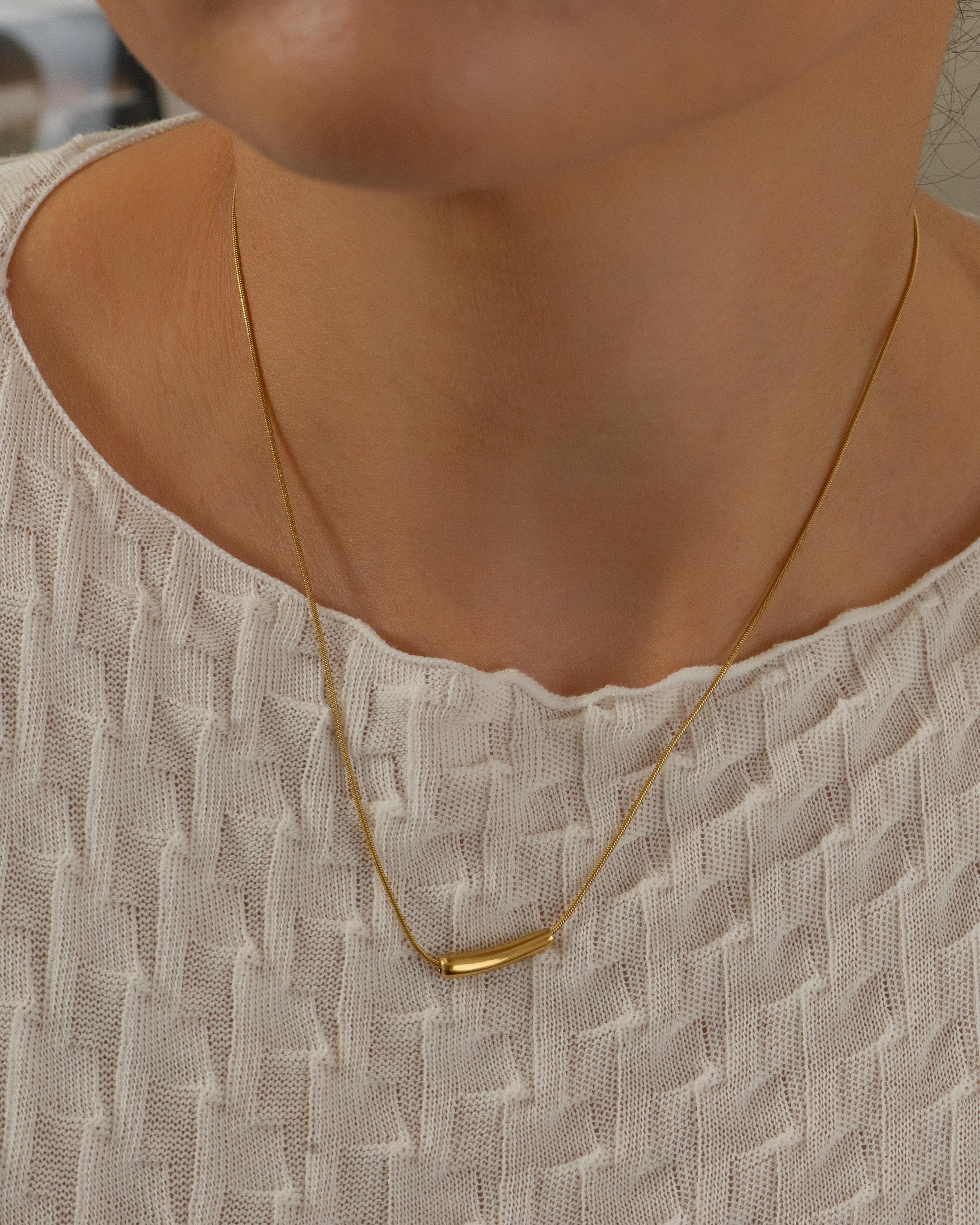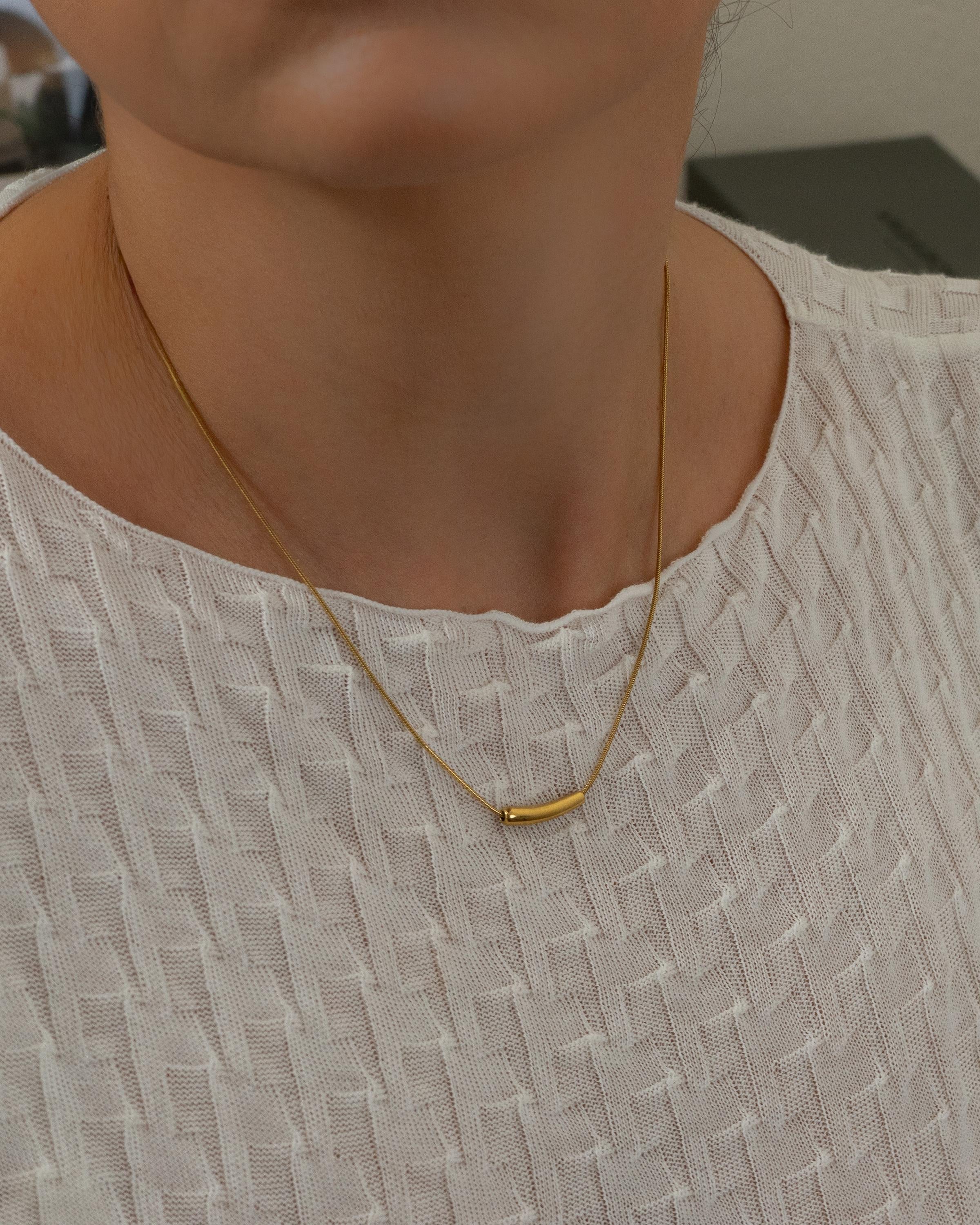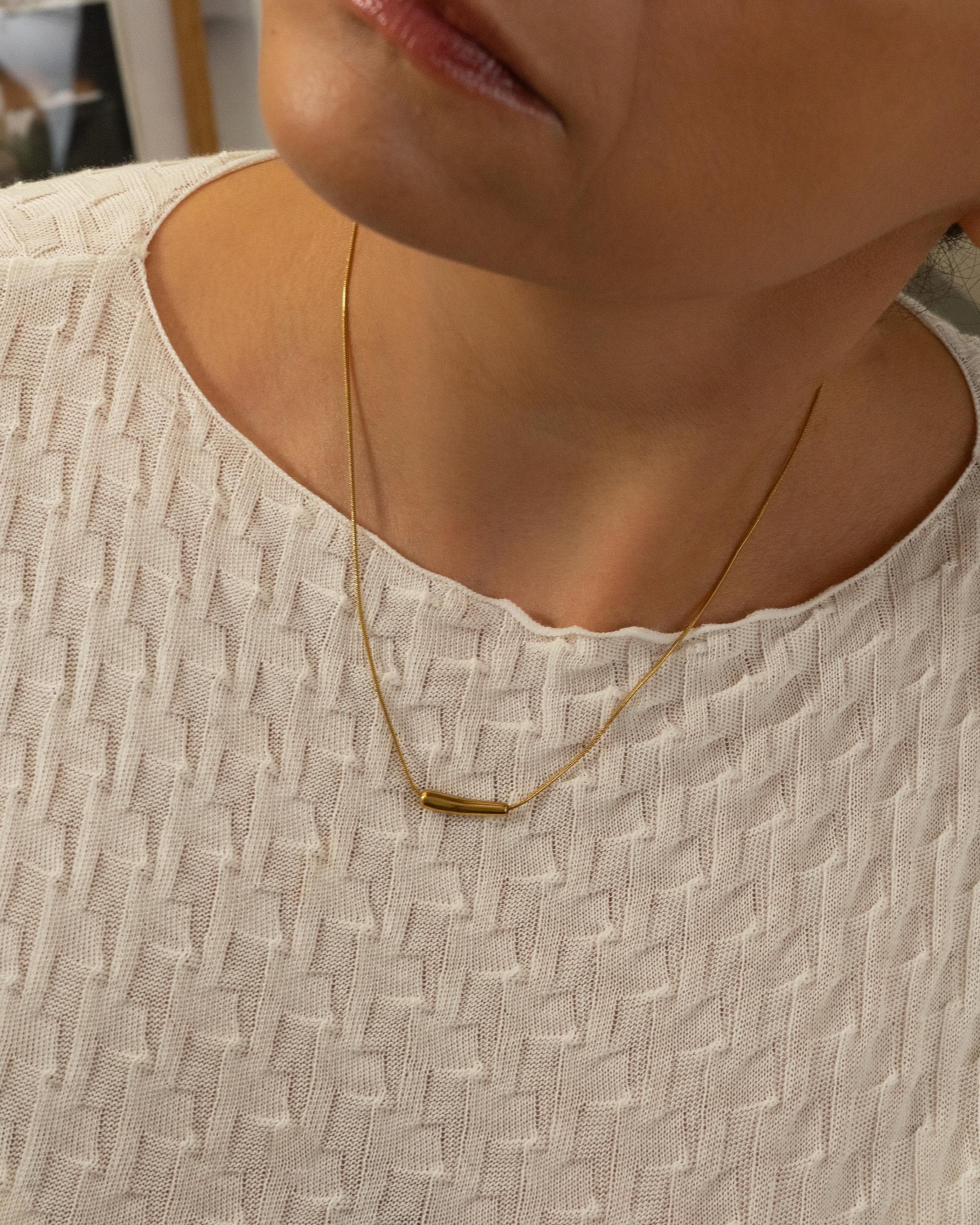 A sleek and minimal gold necklace featuring a polished bar pendant threaded on a round snake chain. Its smooth, curved bar (5x20mm) adds a refined modern touch that catches the light beautifully, making it the perfect piece for both day and night looks.