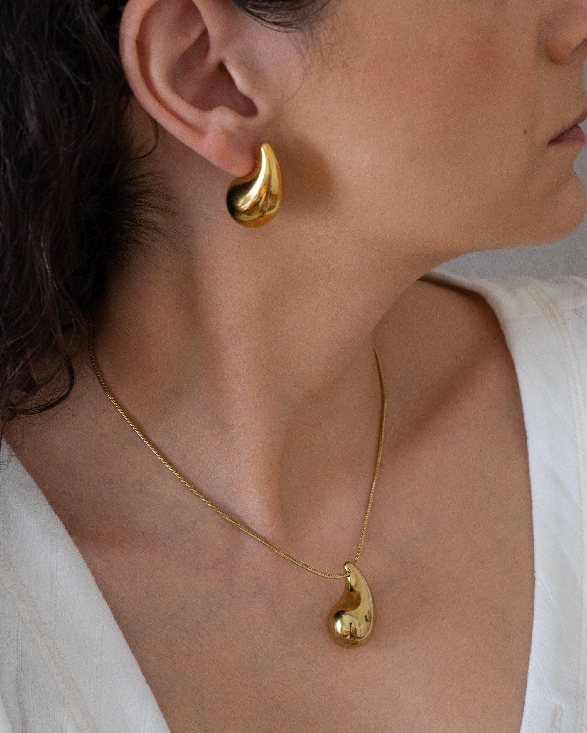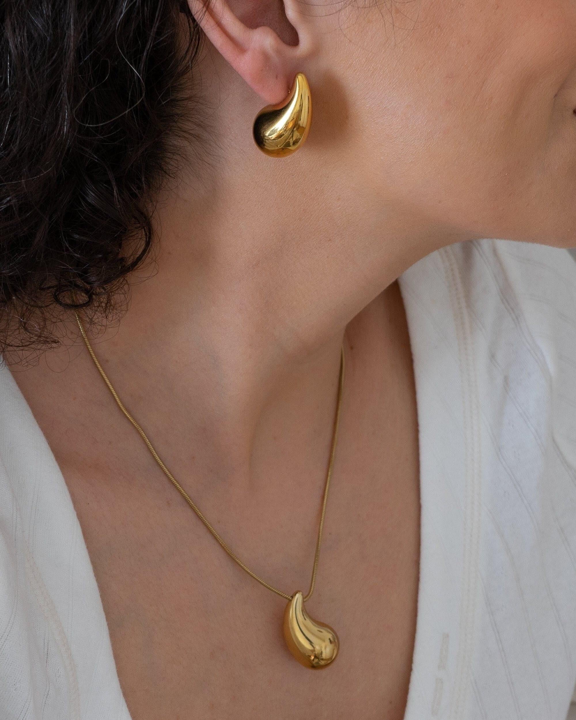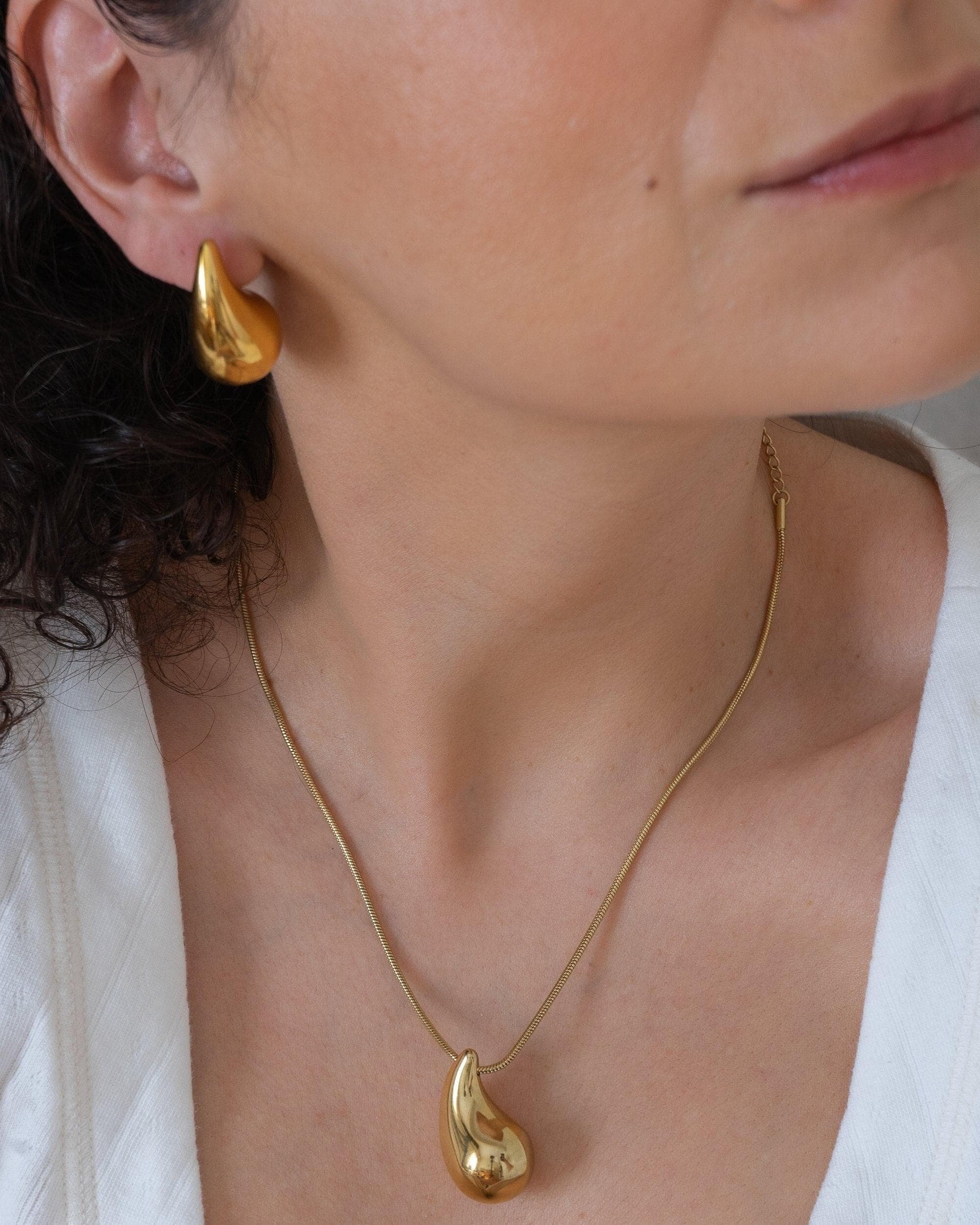 Elevate your accessory game with the Gold Bold Drop Necklace, the ideal companion to our Gold Bold Earrings. This statement piece is a must-have for the season, designed to complement your fresh and modern aesthetic effortlessly. The Gold Bold Drop Necklace features a stunning drop pendant that adds an elegant touch to your outfit, whether you're dressing up for a night out or adding flair to your everyday look.