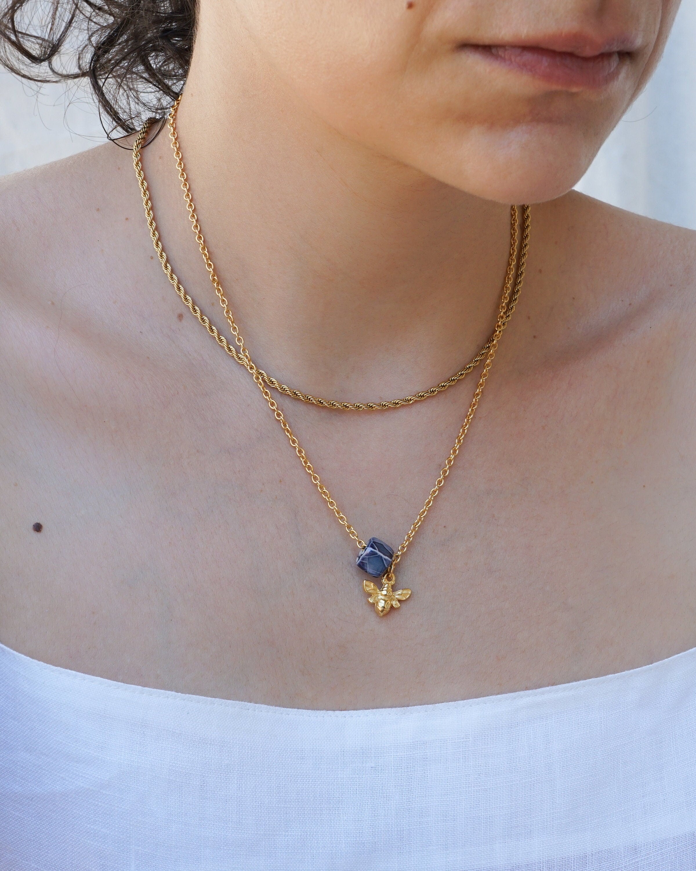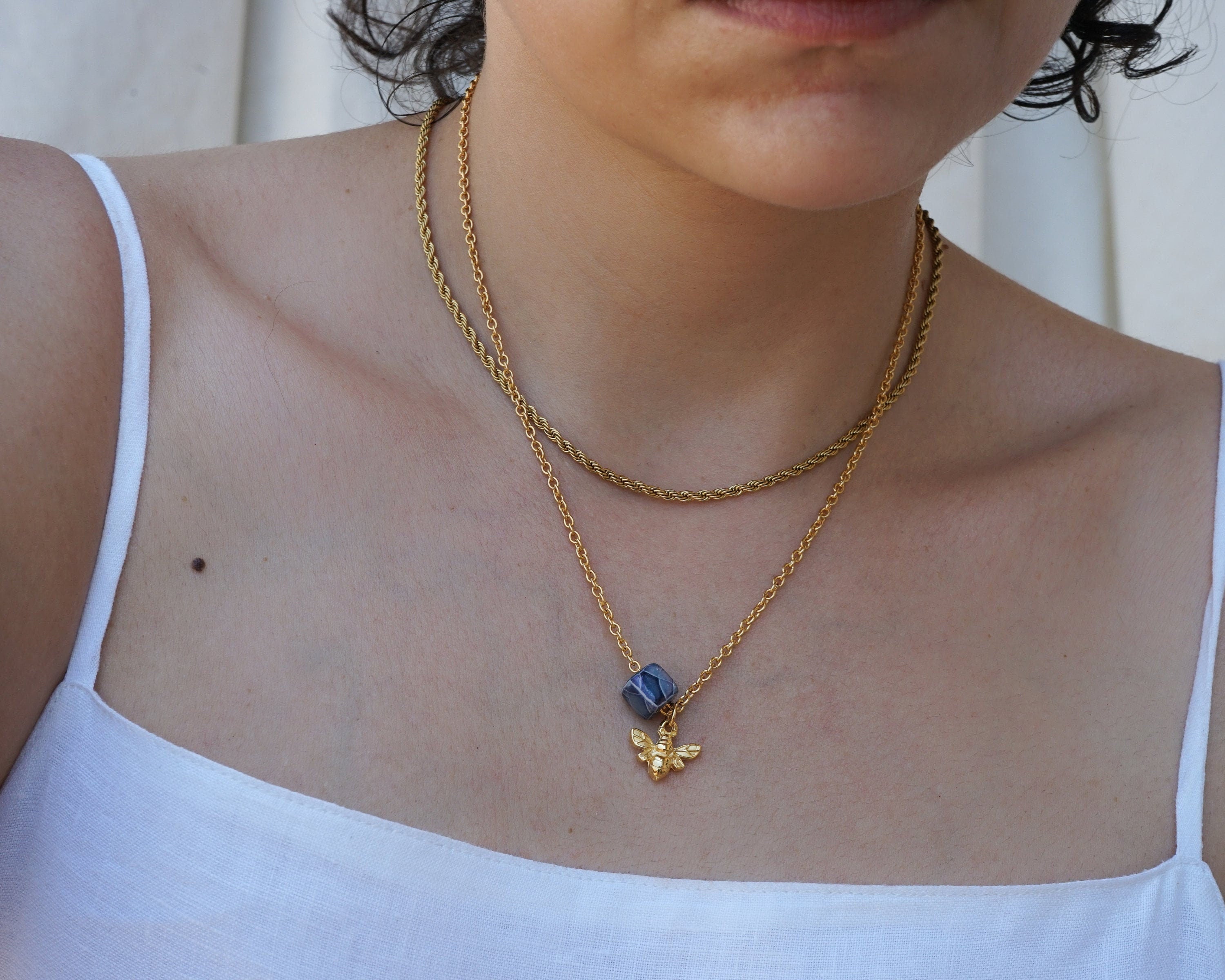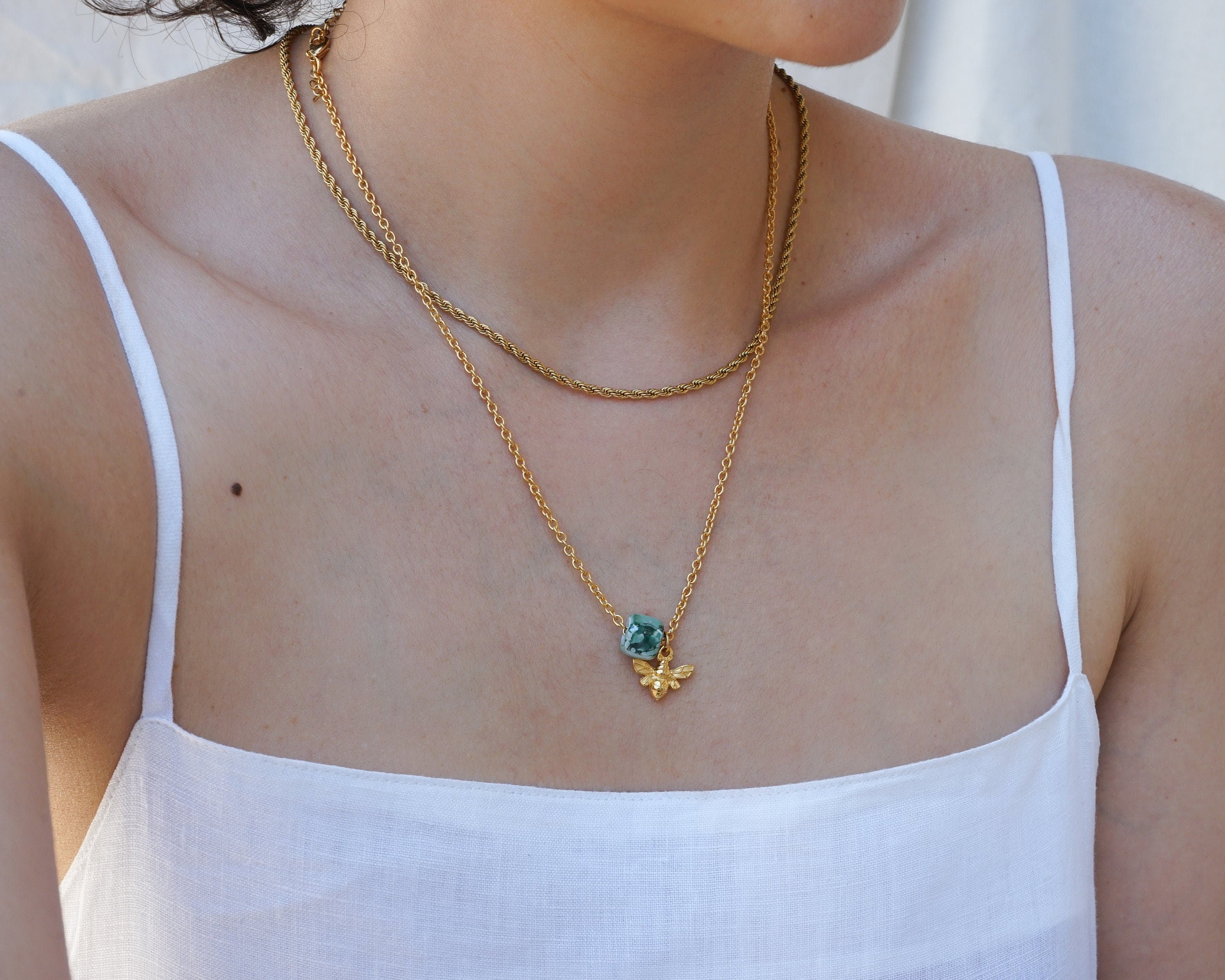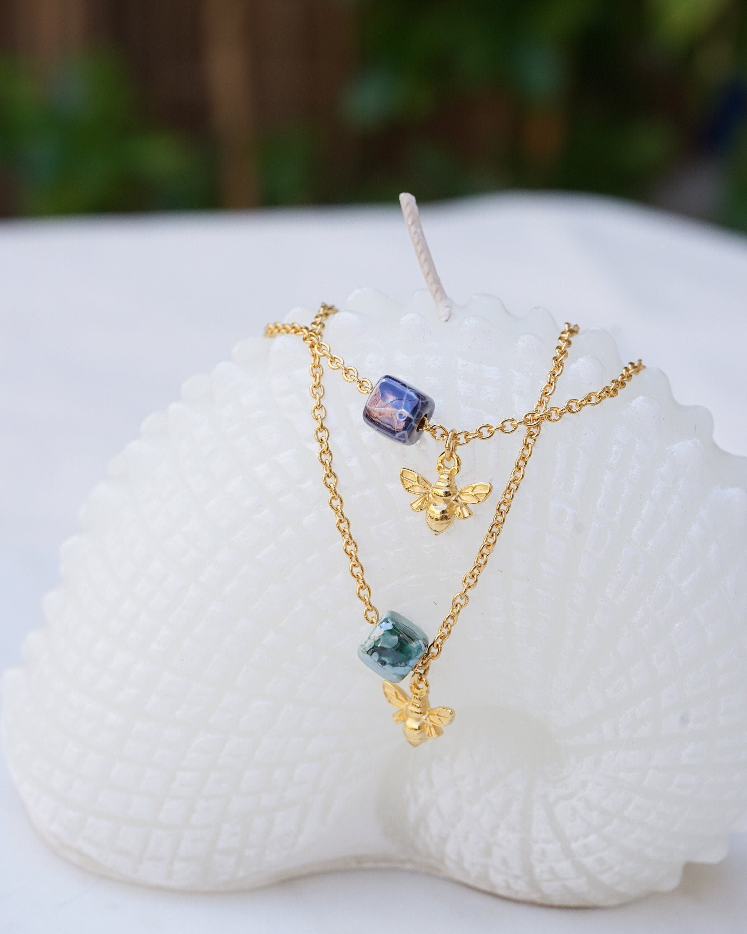 This exquisite necklace features a 24k gold-plated Bumble Bee pendant, accompanied by a square enamel-glazed ceramic bead available in white or blue. This thoughtful combination is designed to ward off negative energies, making it not only beautiful but also meaningful. Ideal for everyday wear or special occasions, this necklace stands out on its own or can be elegantly layered with your favorite pieces. Its contemporary style adds a fresh touch to any outfit, ensuring you look chic and polished. The high-quality materials used in this piece are durable, maintaining their beauty over time without wearing off.