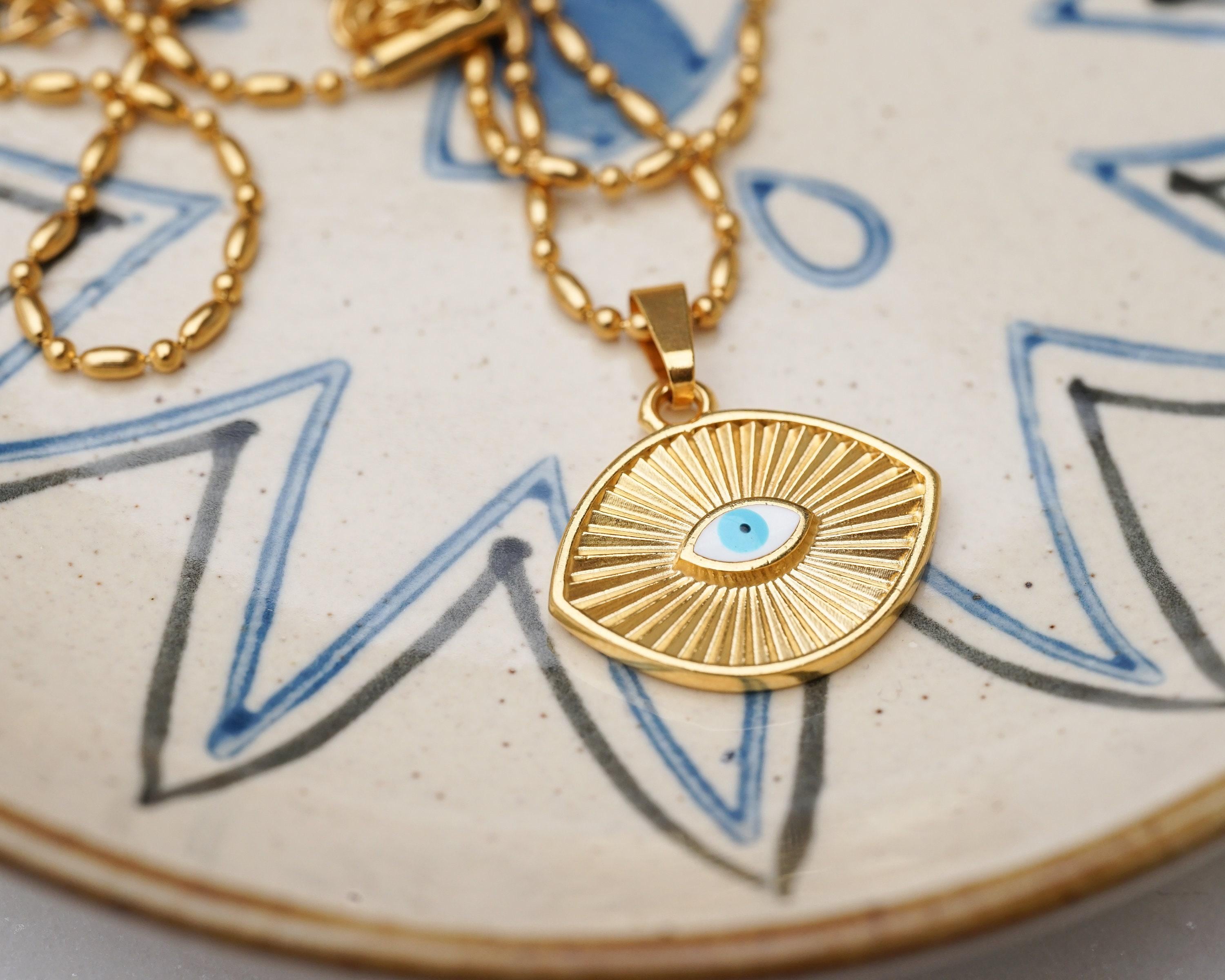 Gold Dainty Eye Protection Pendant w BlackEvil Eye Enamel