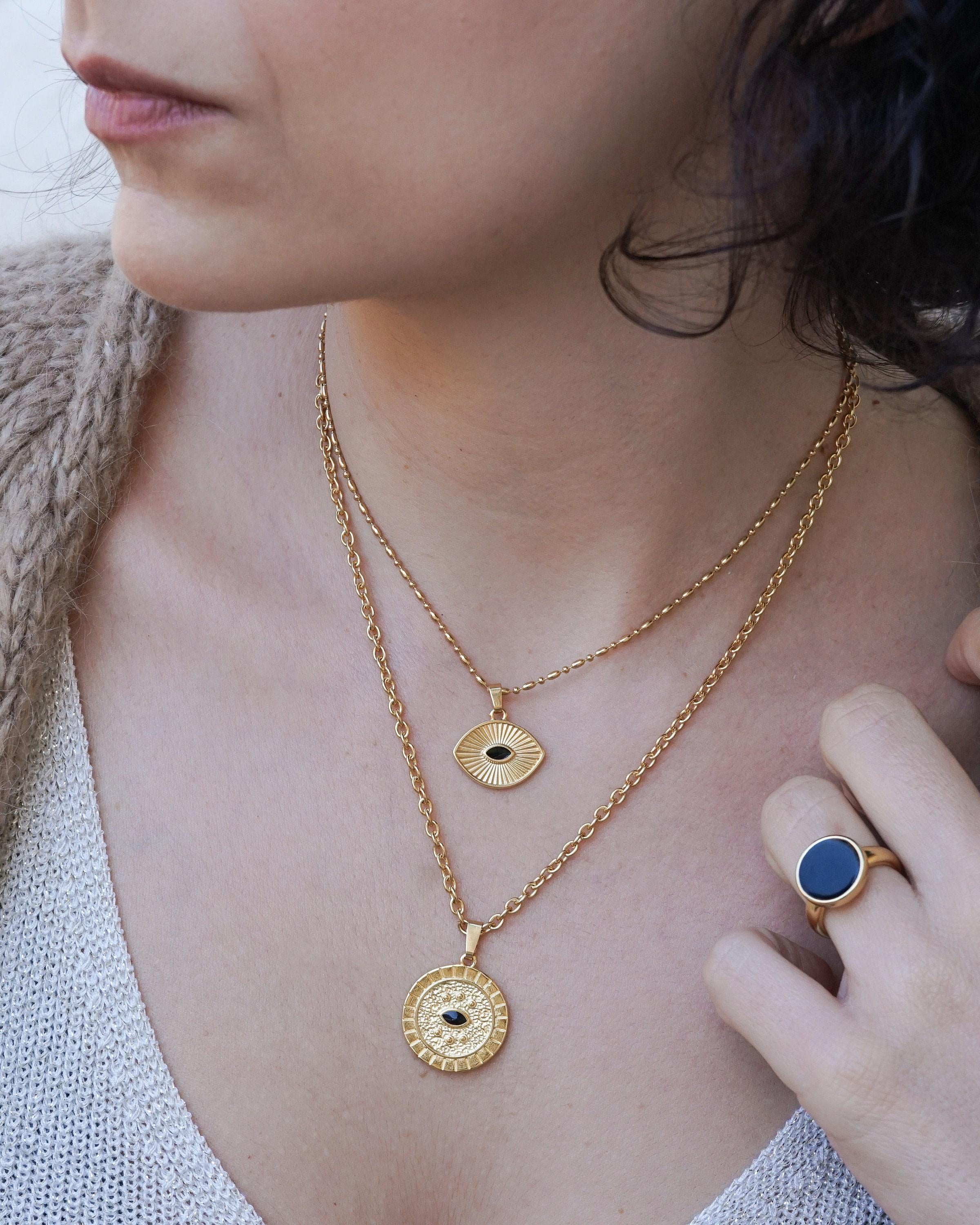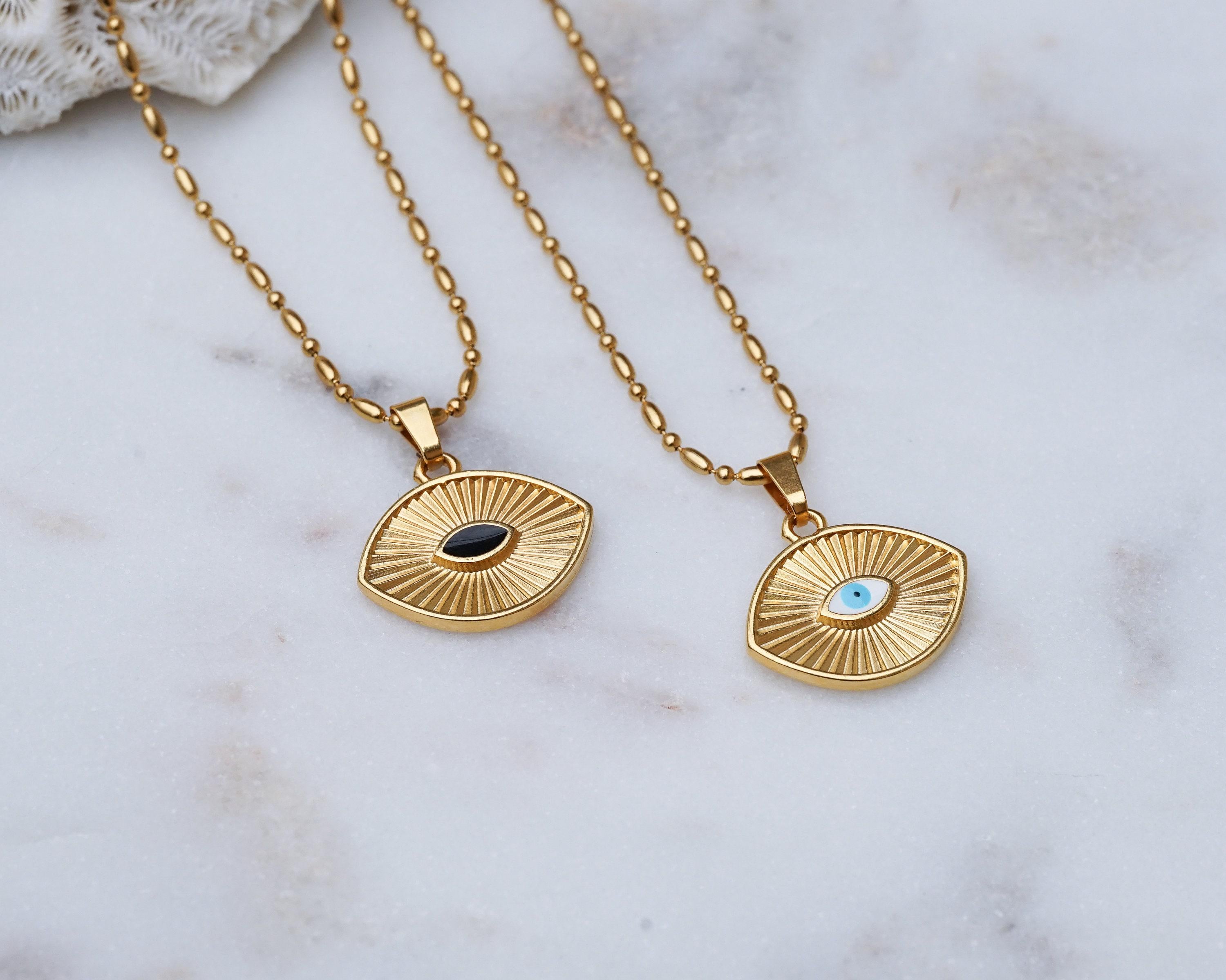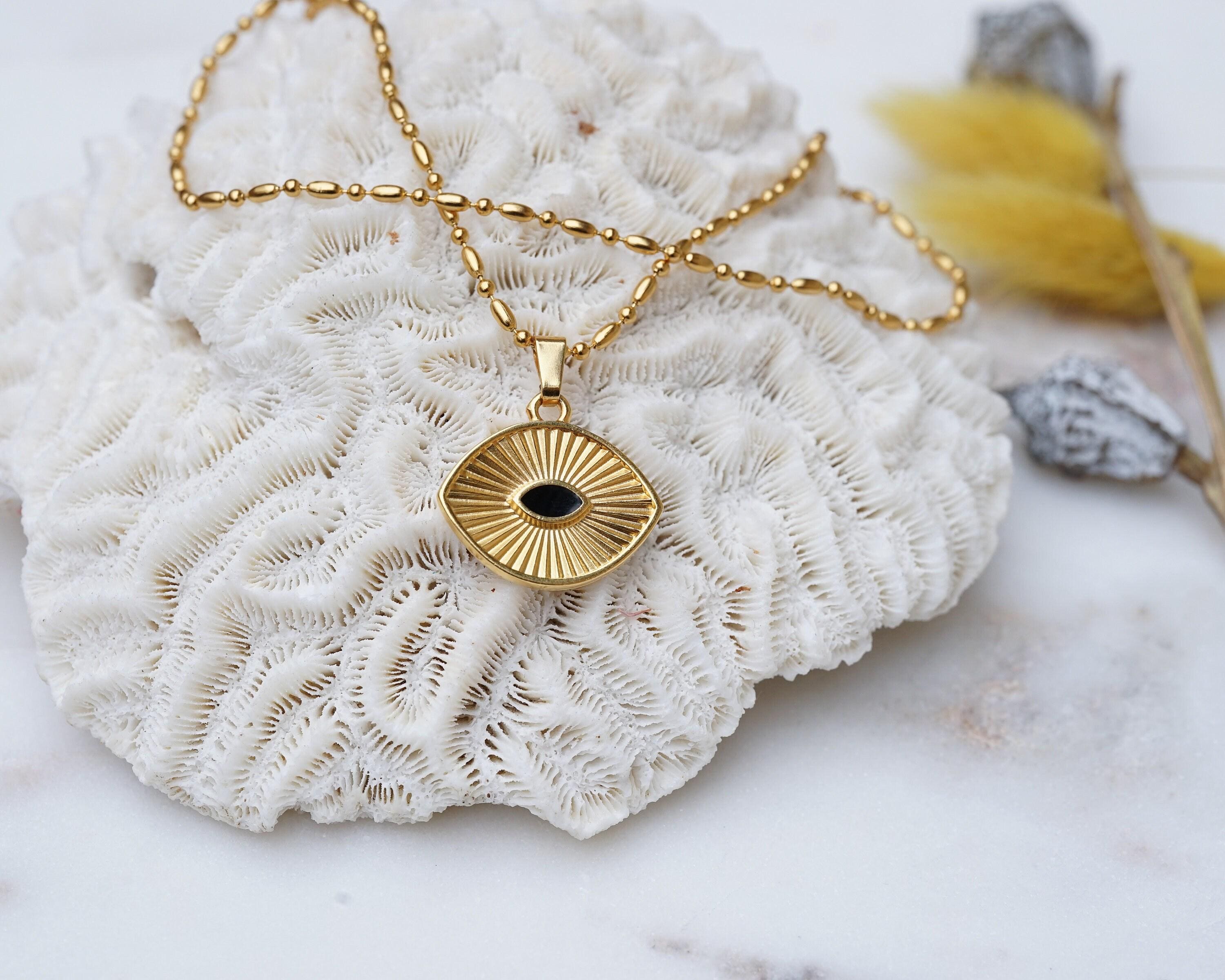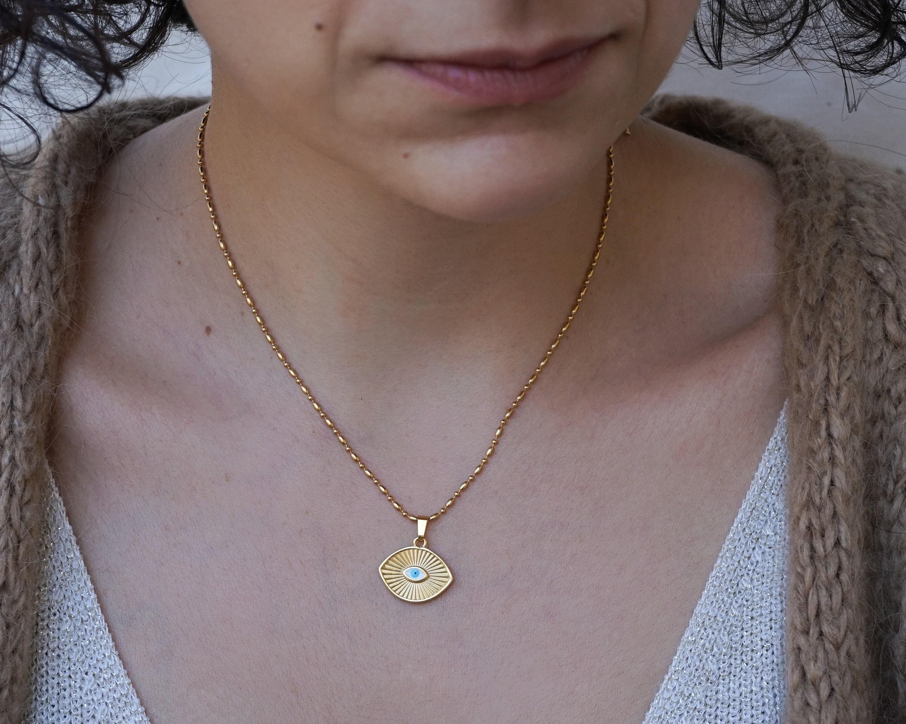 A unique modern enamel Eye necklace with Evil eye/Black enamel, in a beaded oval-round stainless steel chain. A beautiful, meaningful necklace that you can wear everyday or save for a special occasion. This necklace looks great on its own or your can layer it with your favourite necklaces.It’s special and perfect for a fresh and modern look. These materials remain beautiful and do not wear off.