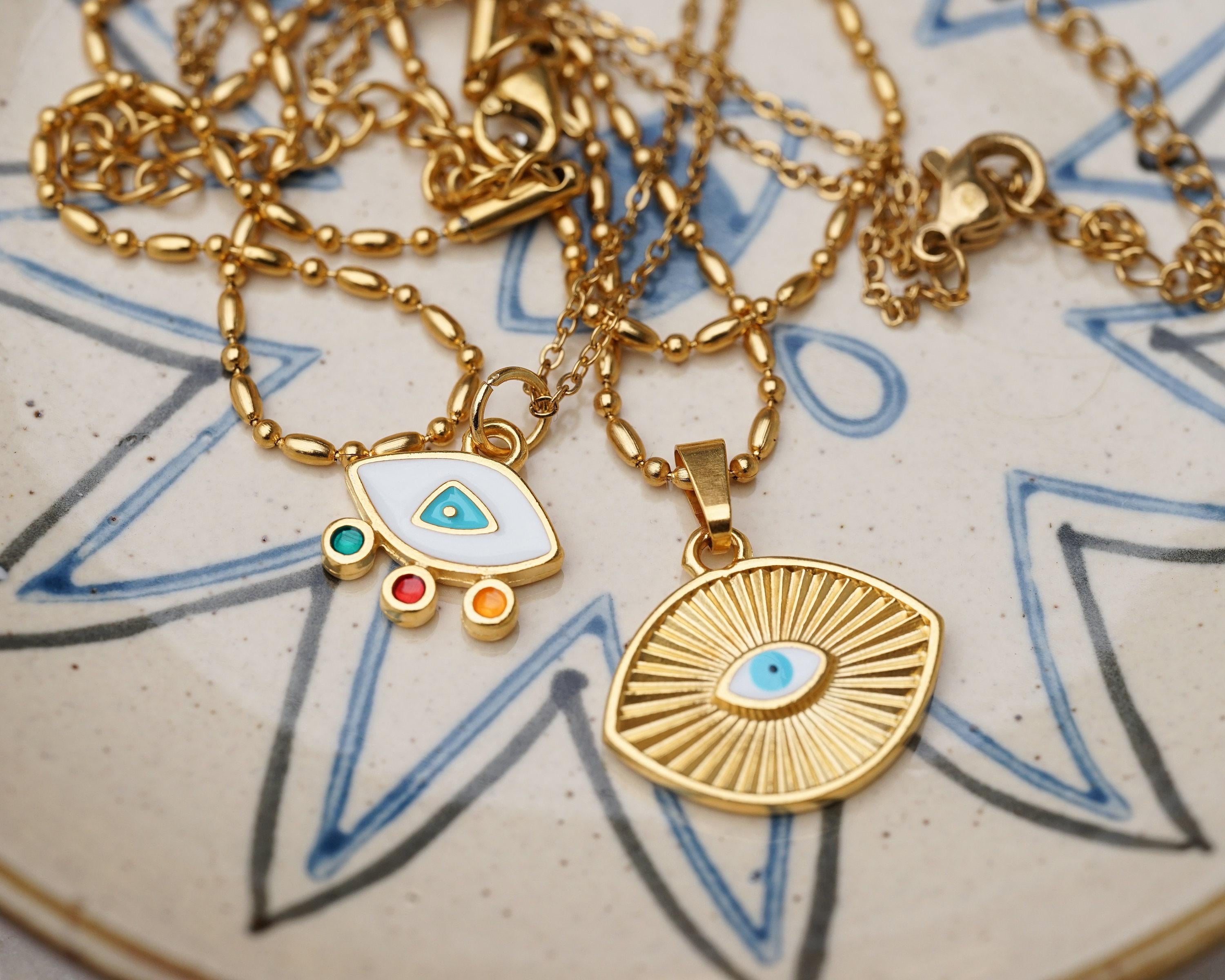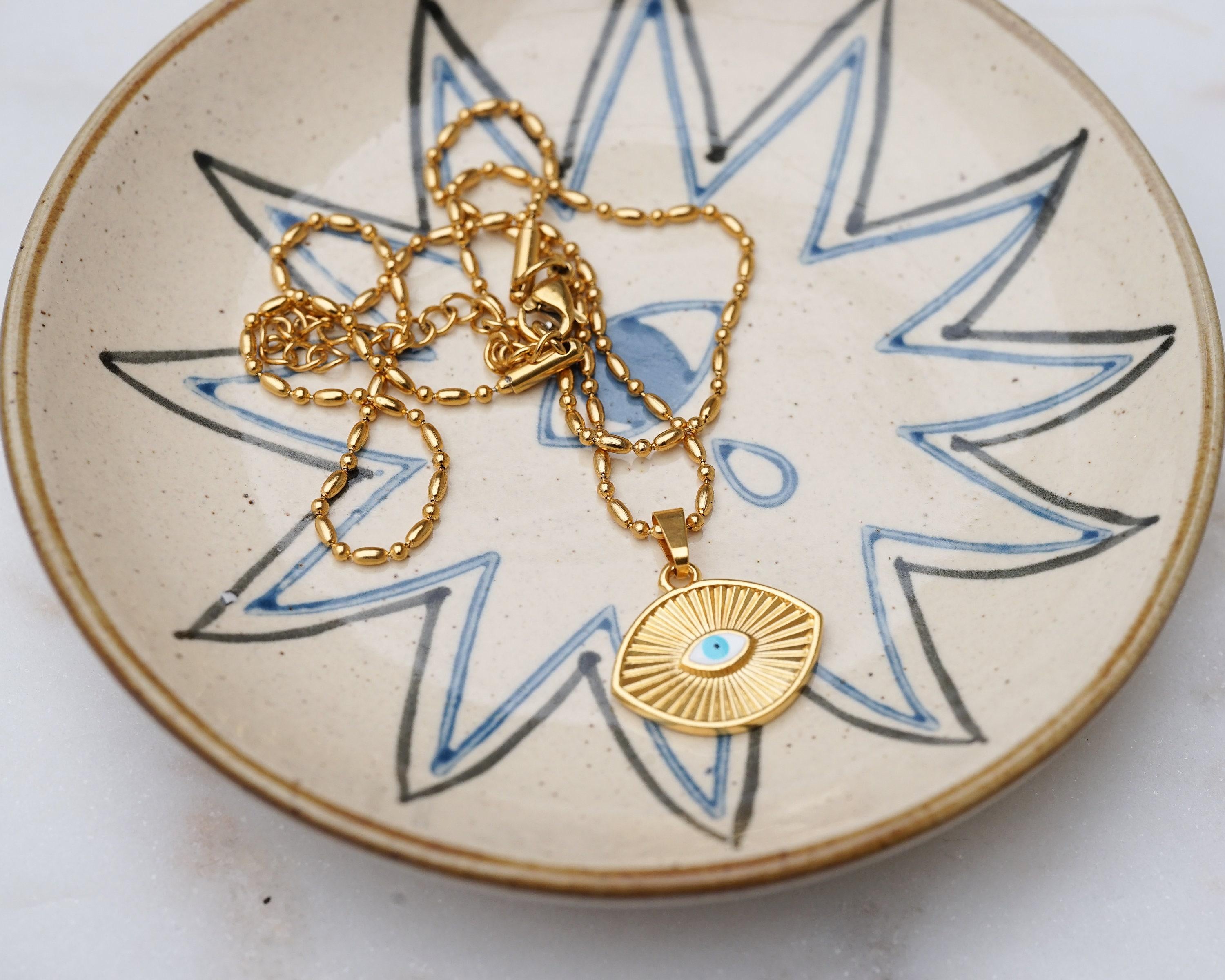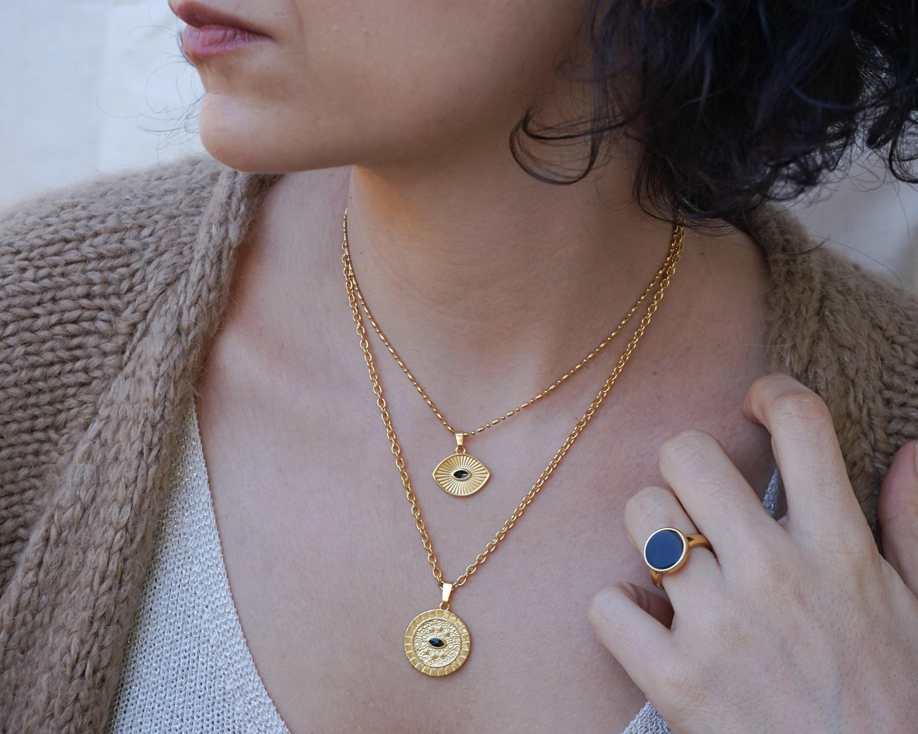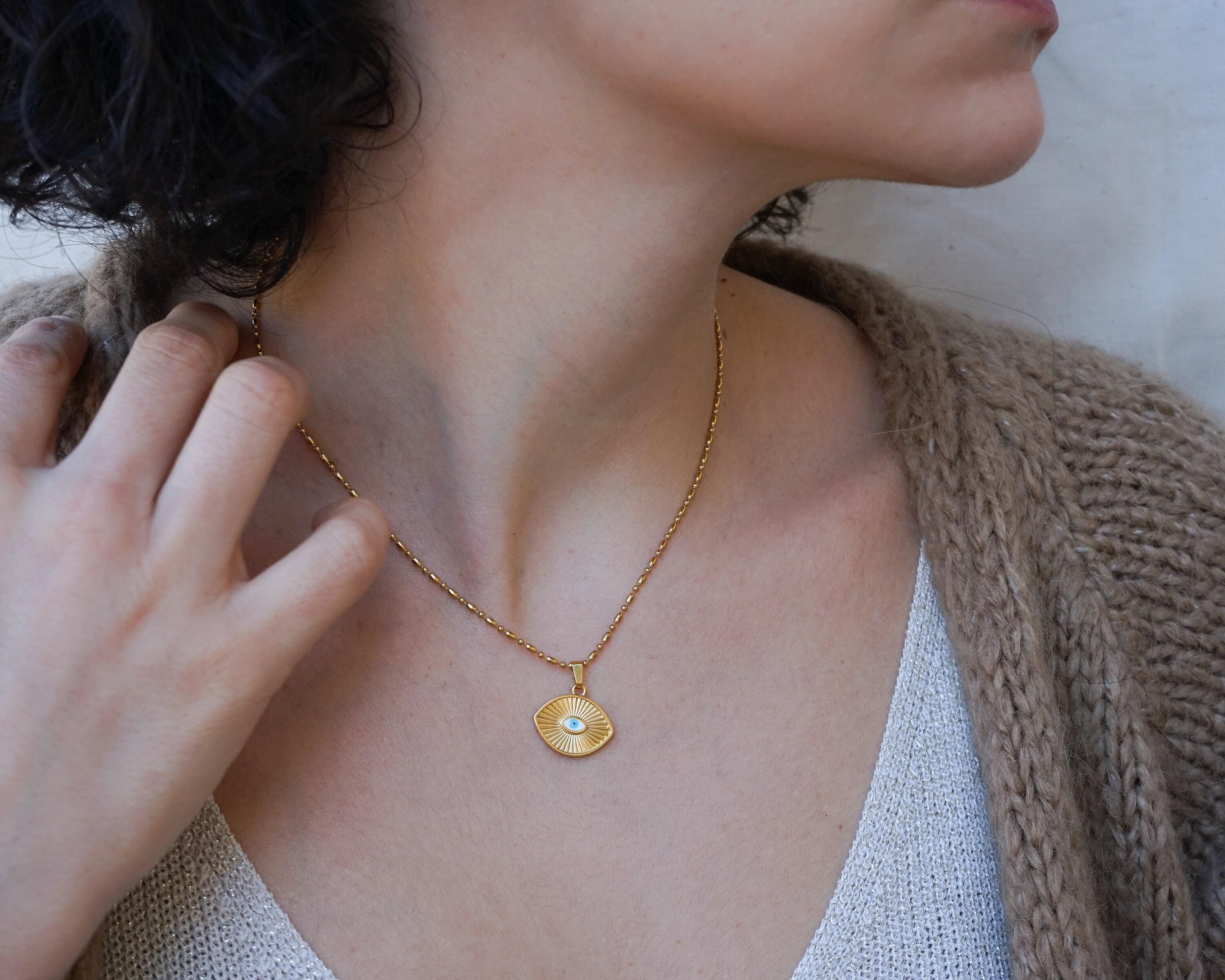 A unique modern enamel Eye necklace with Evil eye/Black enamel, in a beaded oval-round stainless steel chain. A beautiful, meaningful necklace that you can wear everyday or save for a special occasion. This necklace looks great on its own or your can layer it with your favourite necklaces.It’s special and perfect for a fresh and modern look. These materials remain beautiful and do not wear off.