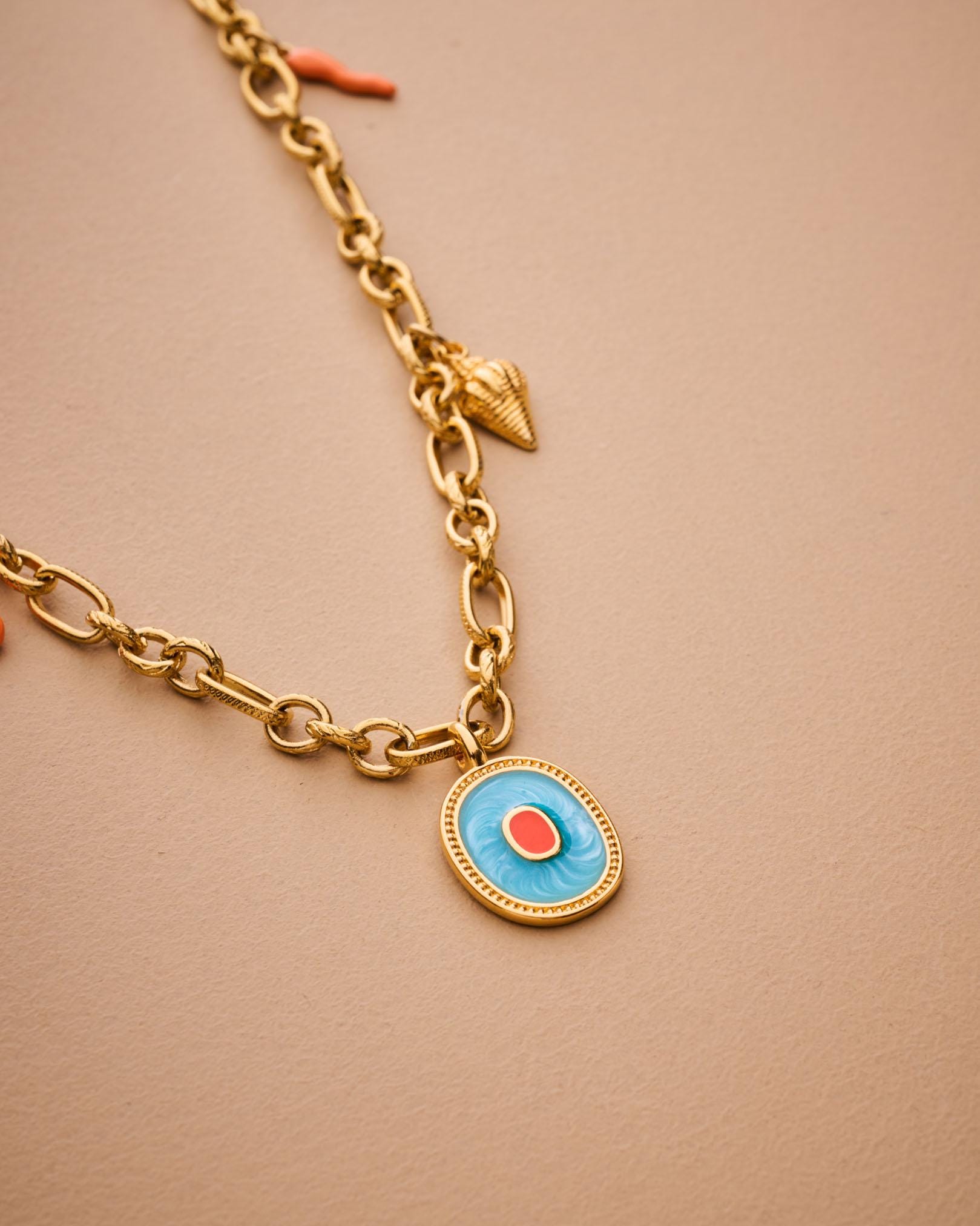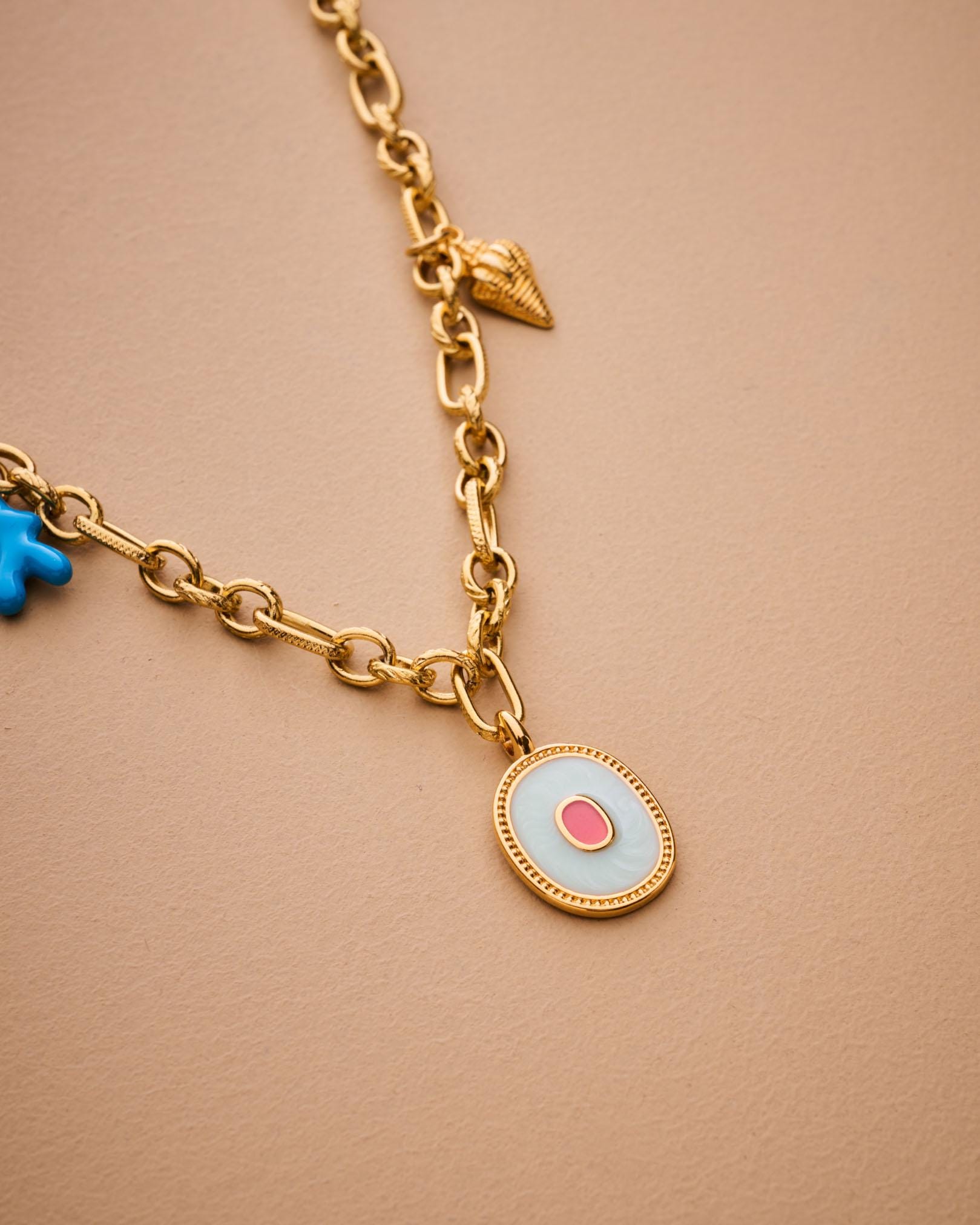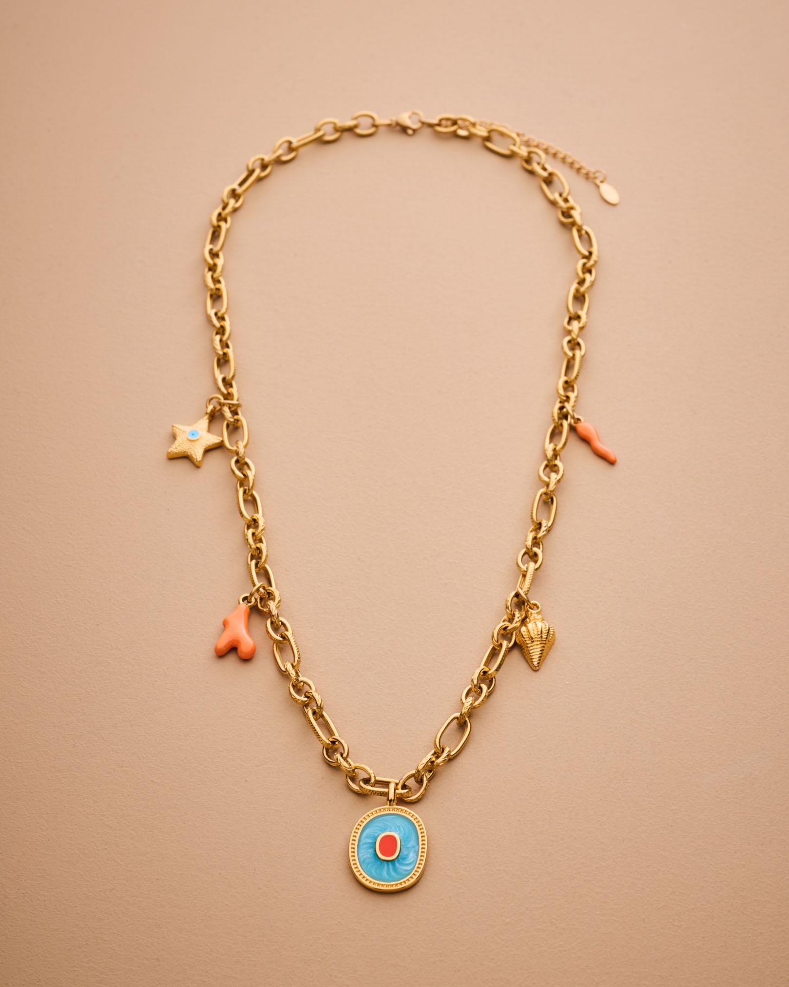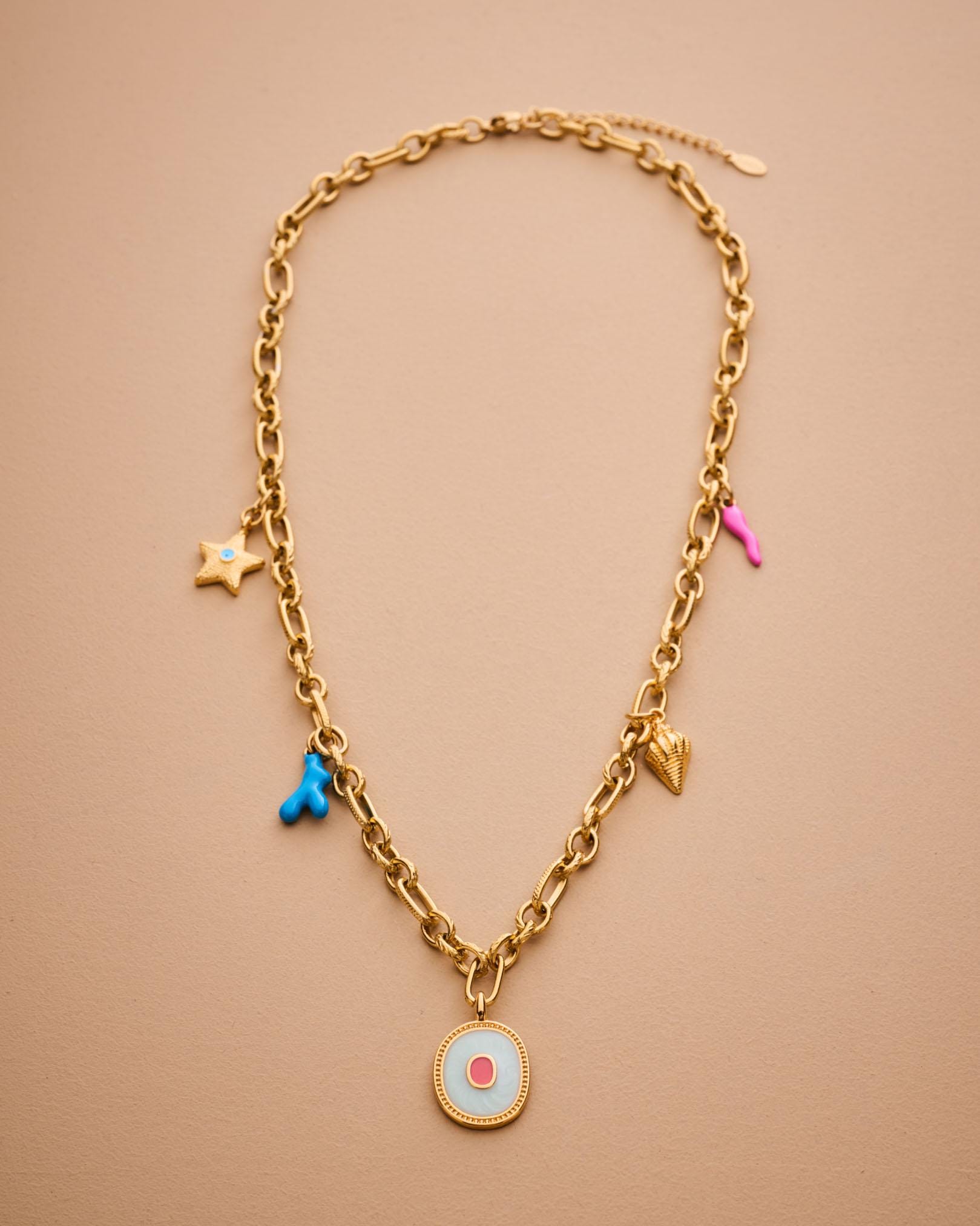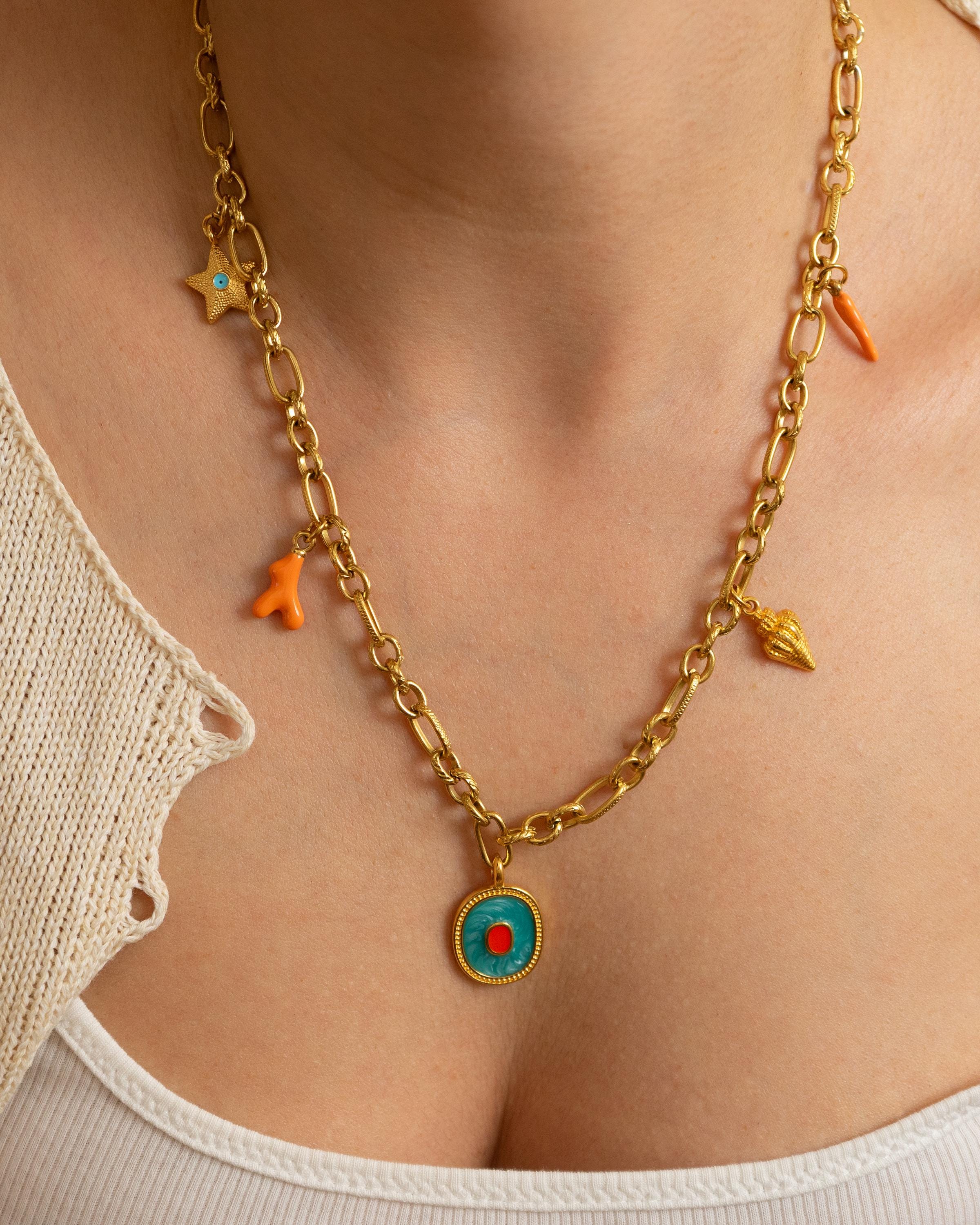MATERIALS • Gold stainless steel chain – water-friendly and tarnish-resistant • Gold-plated zamak with glossy enamel • Coral-motif enamel charms in stainless steel