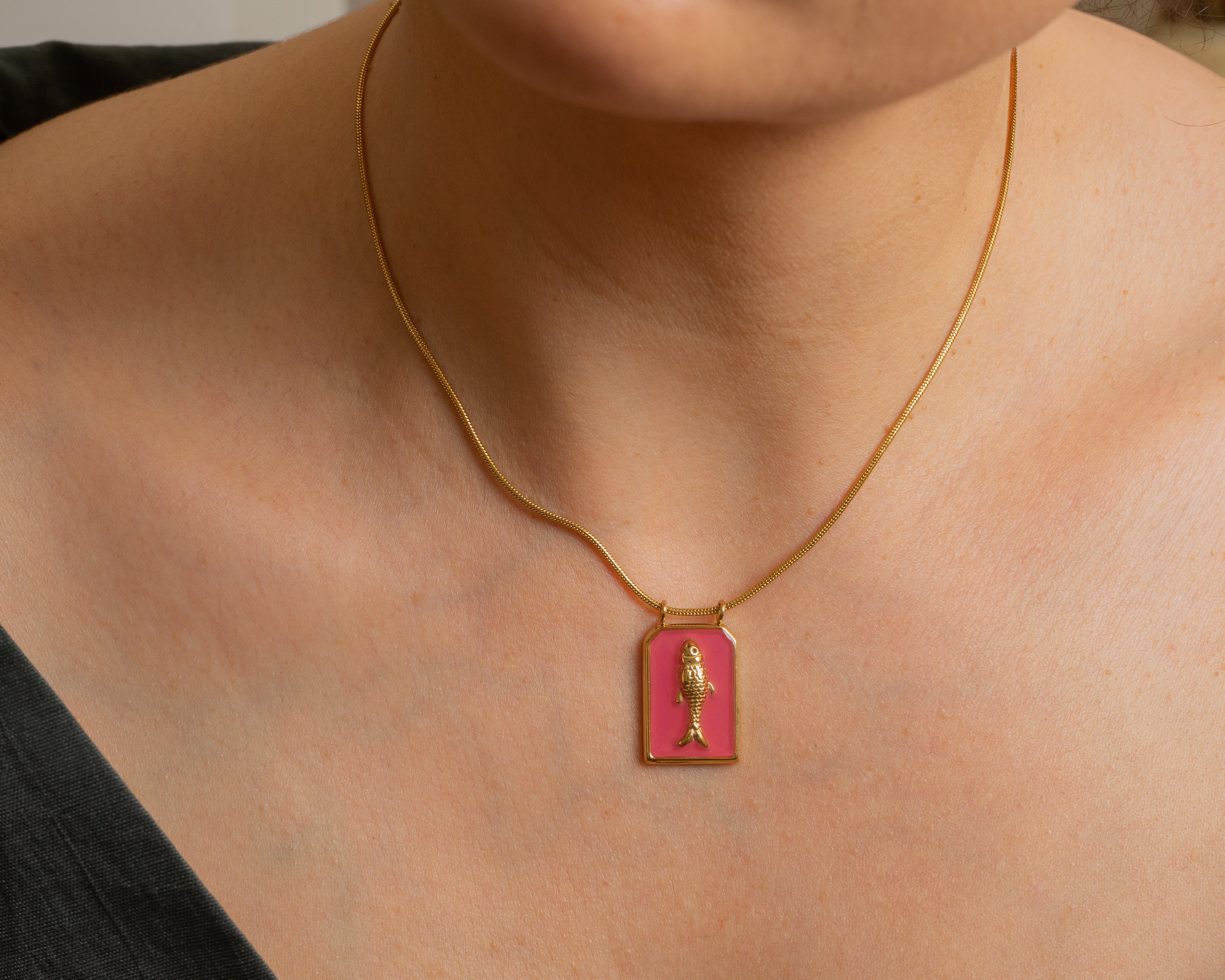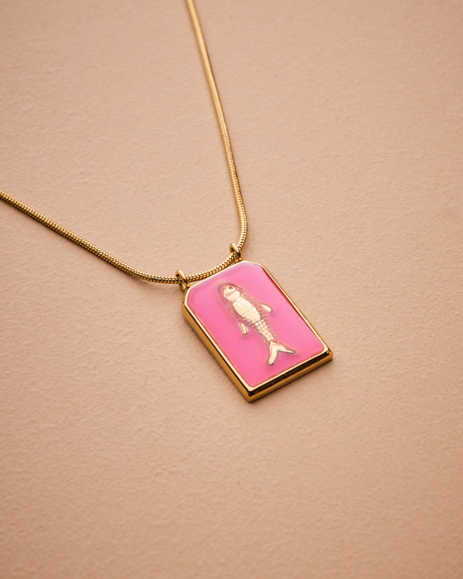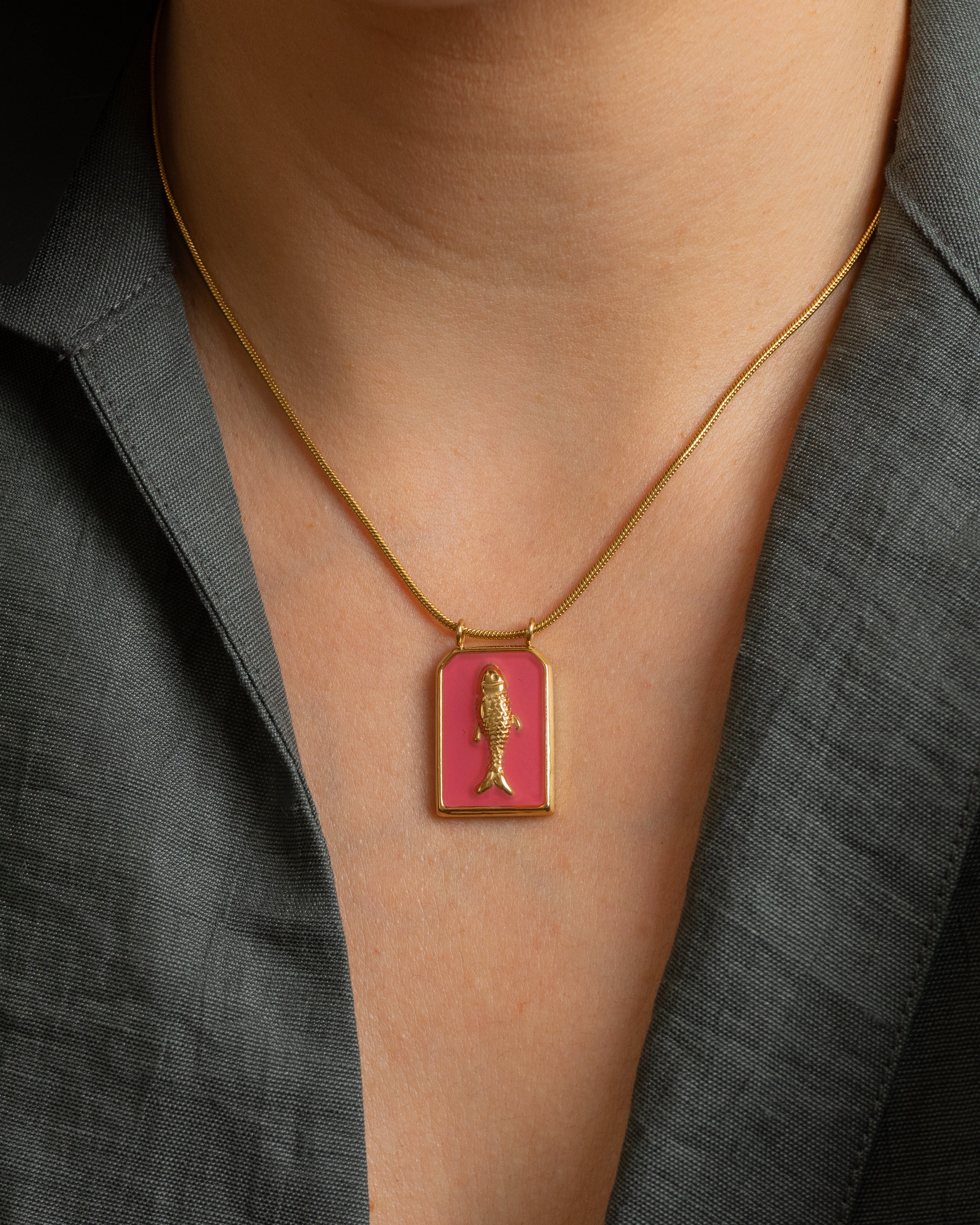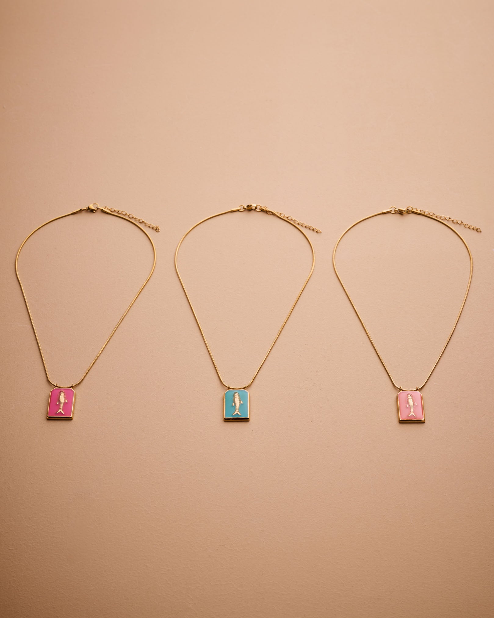 This gold-tone necklace features a 27×16 mm fish pendant in glossy enamel, available in three dreamy shades: fuchsia, turquoise, or baby pink. The stylized fish motif adds a touch of symbolism—freedom, movement, and flow—while the polished gold stainless steel keeps it durable and tarnish-resistant.