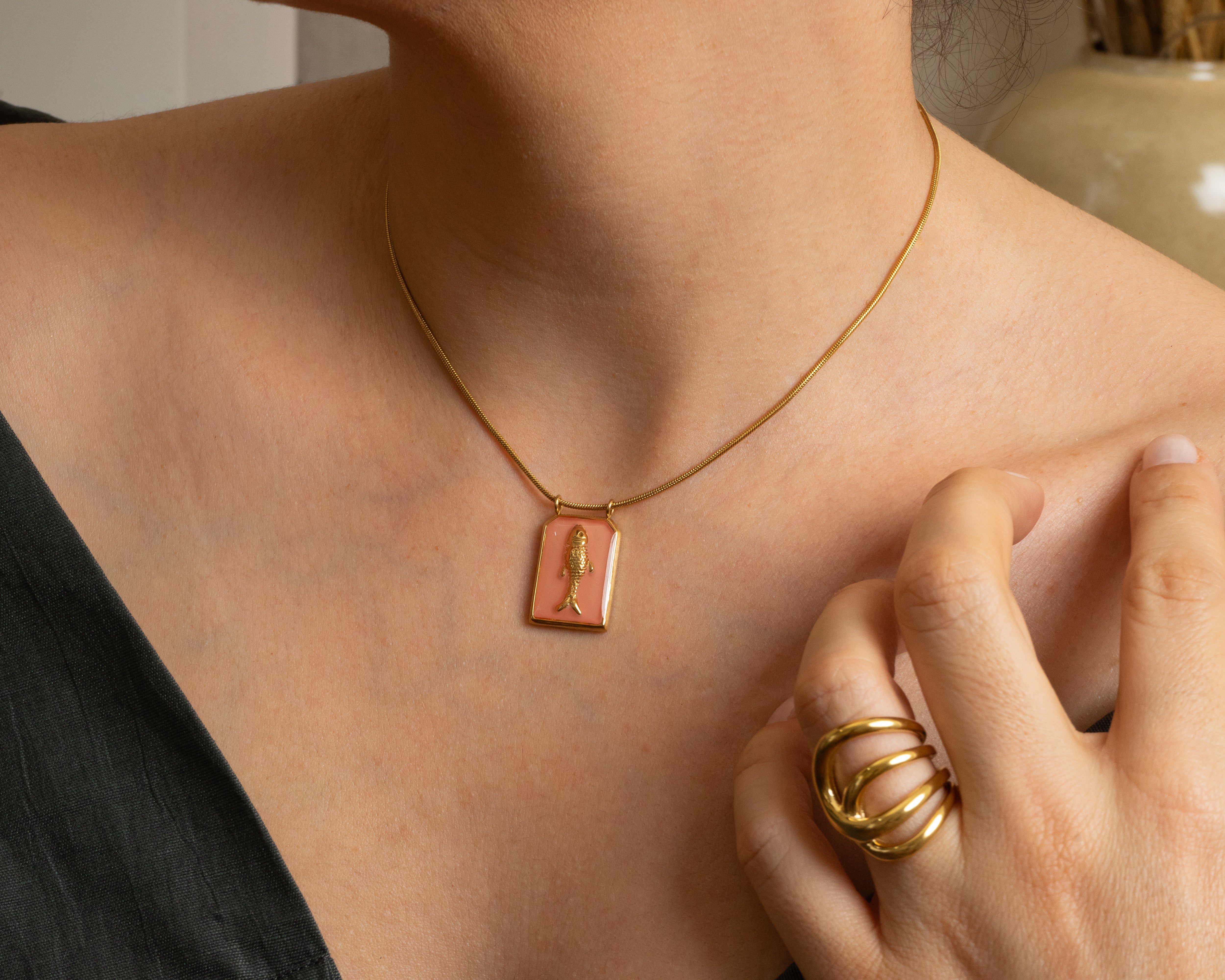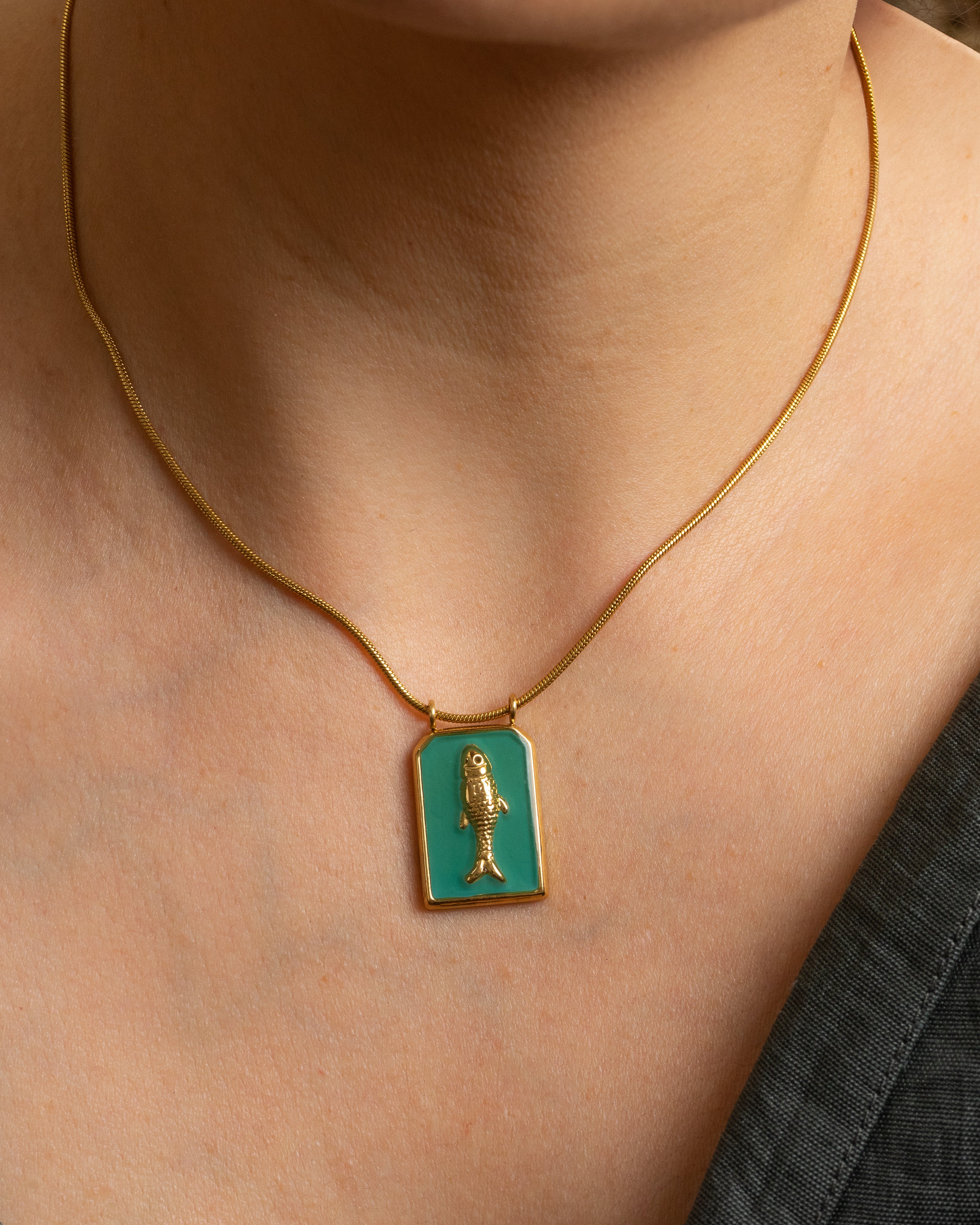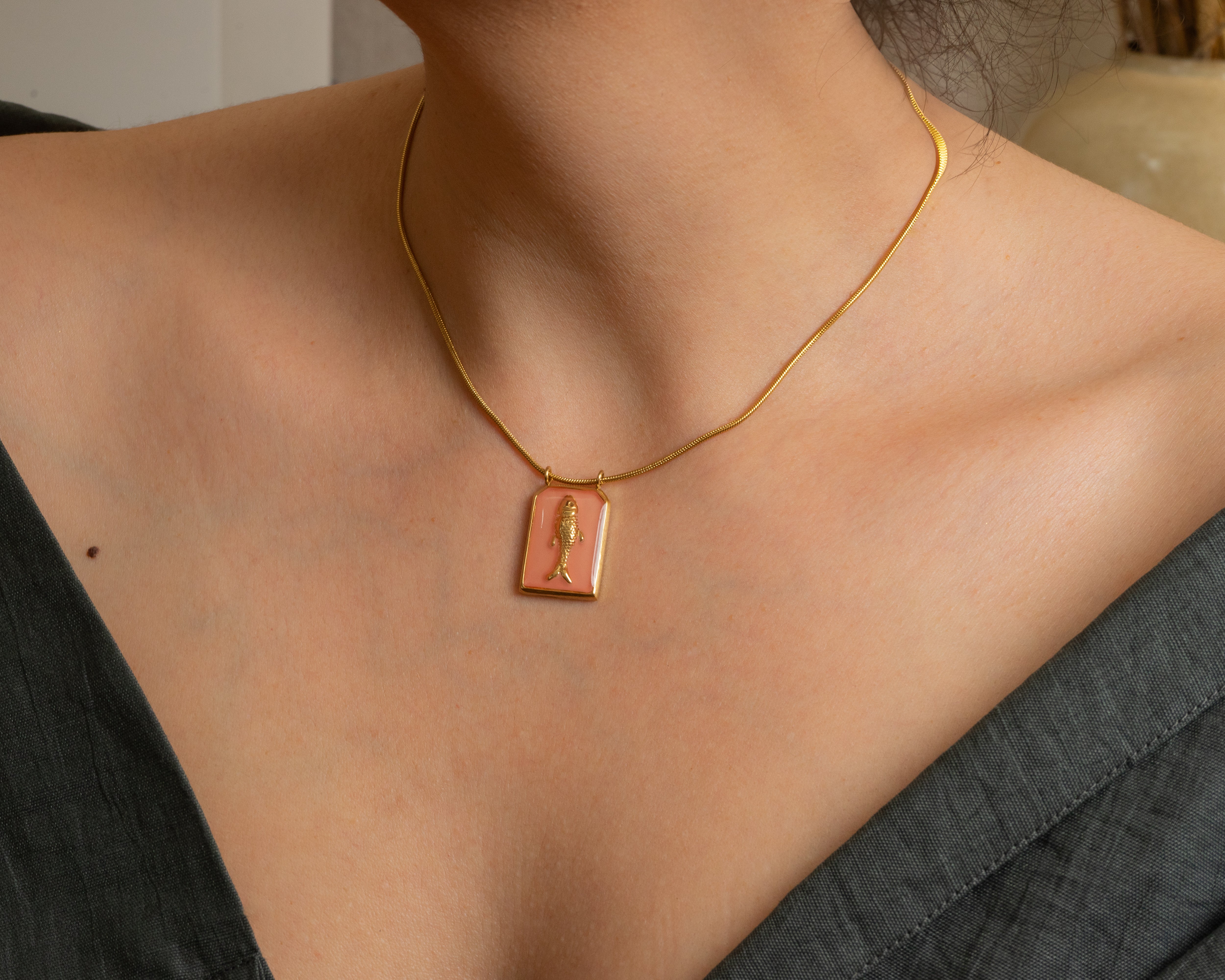 This gold-tone necklace features a 27×16 mm fish pendant in glossy enamel, available in three dreamy shades: fuchsia, turquoise, or baby pink. The stylized fish motif adds a touch of symbolism—freedom, movement, and flow—while the polished gold stainless steel keeps it durable and tarnish-resistant.
