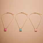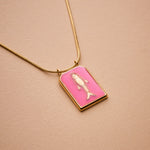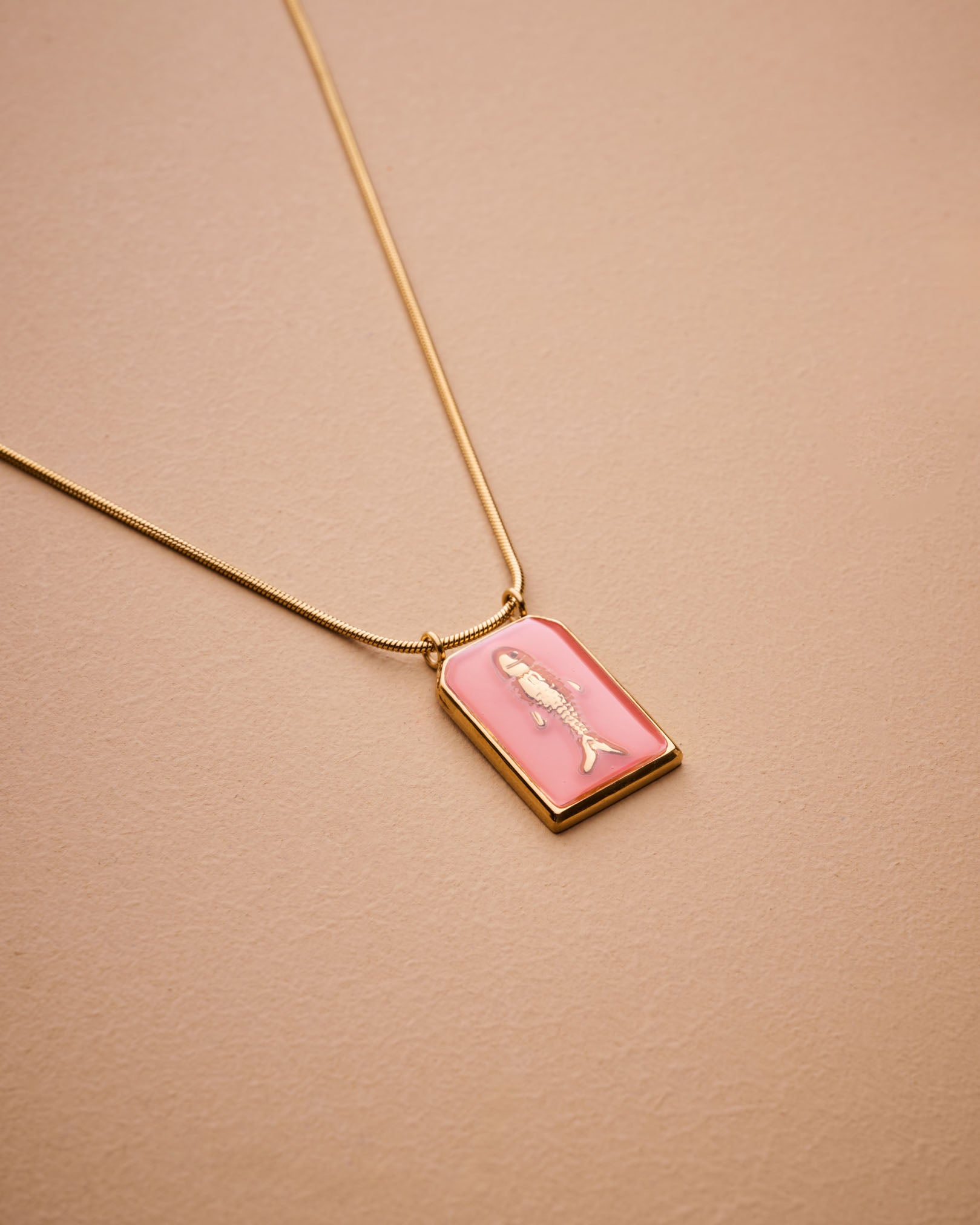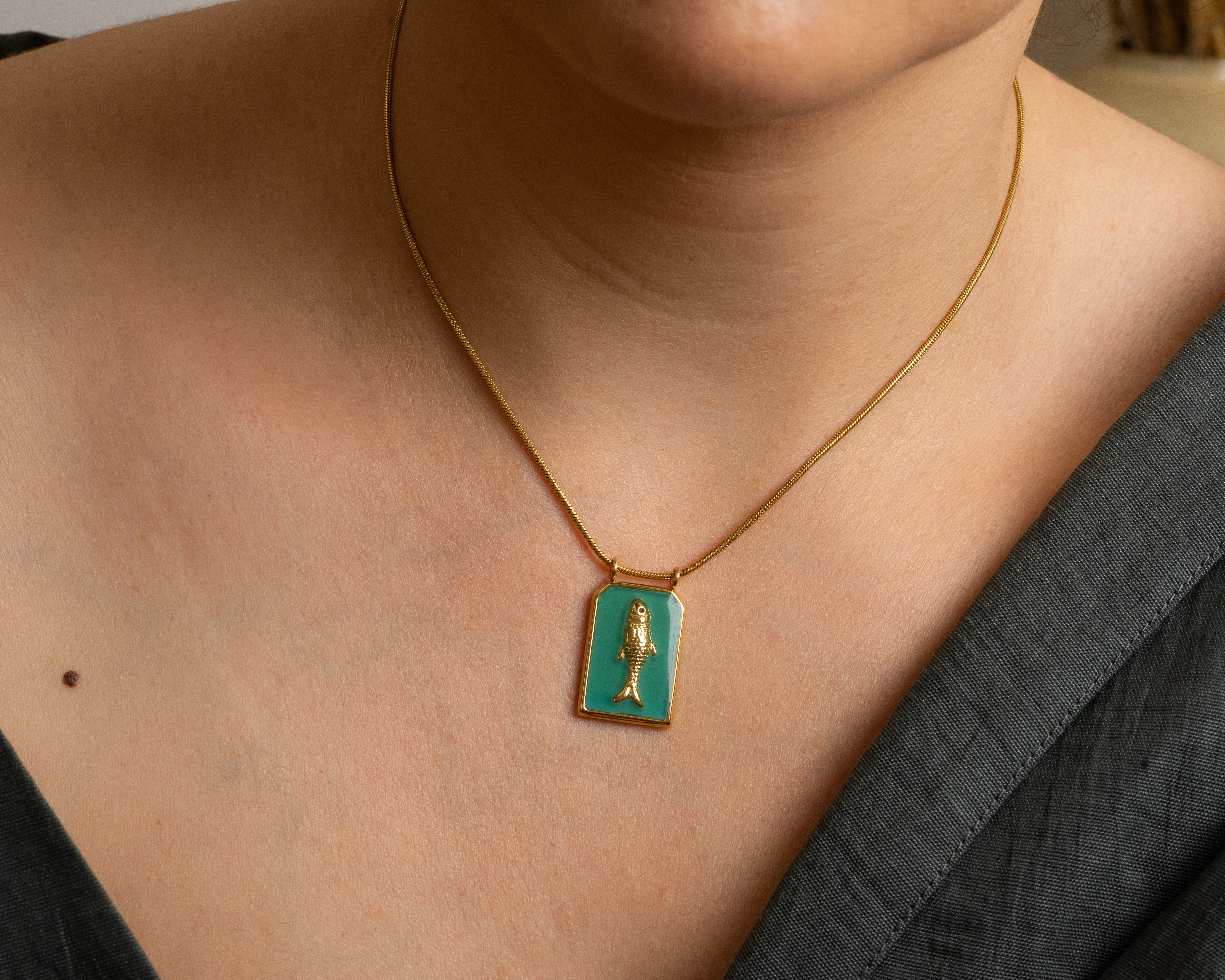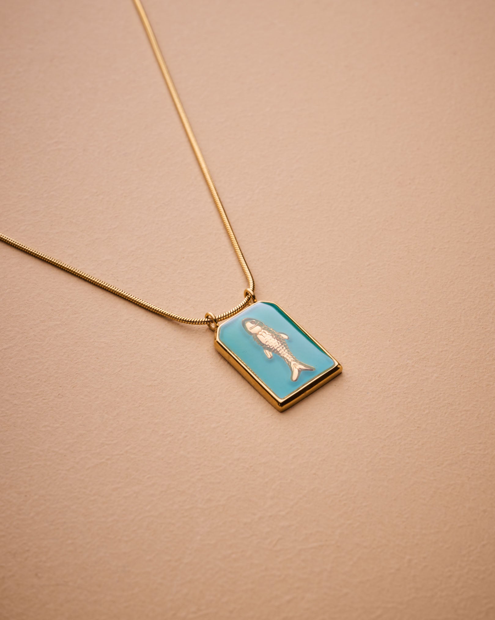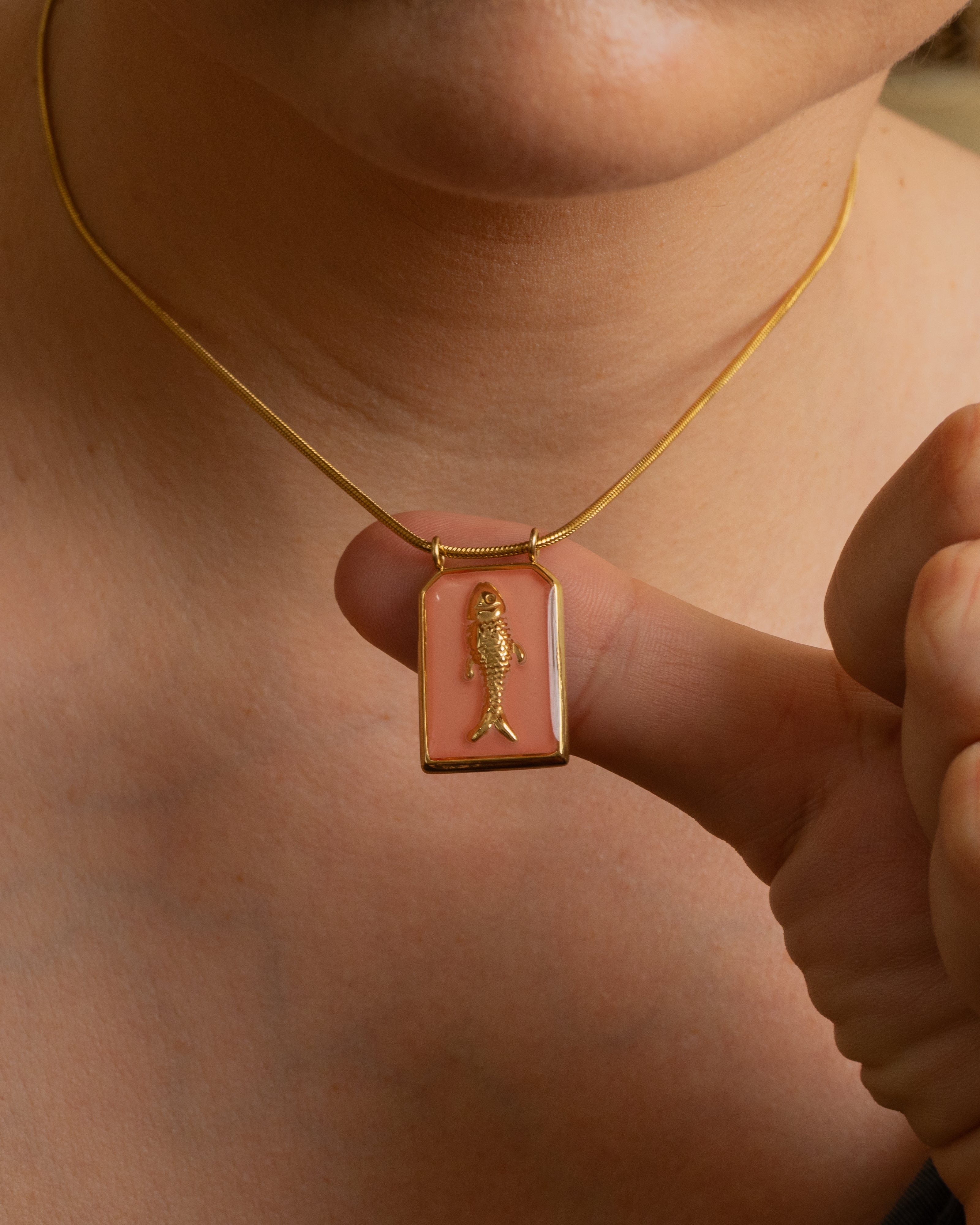This gold-tone necklace features a 27×16 mm fish pendant in glossy enamel, available in three dreamy shades: fuchsia, turquoise, or baby pink. The stylized fish motif adds a touch of symbolism—freedom, movement, and flow—while the polished gold stainless steel keeps it durable and tarnish-resistant.