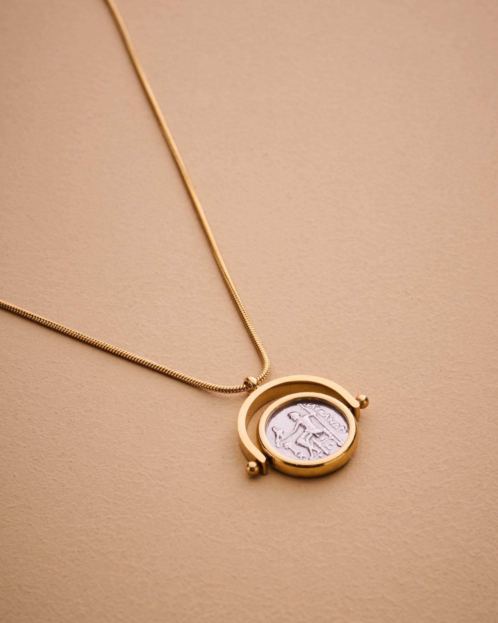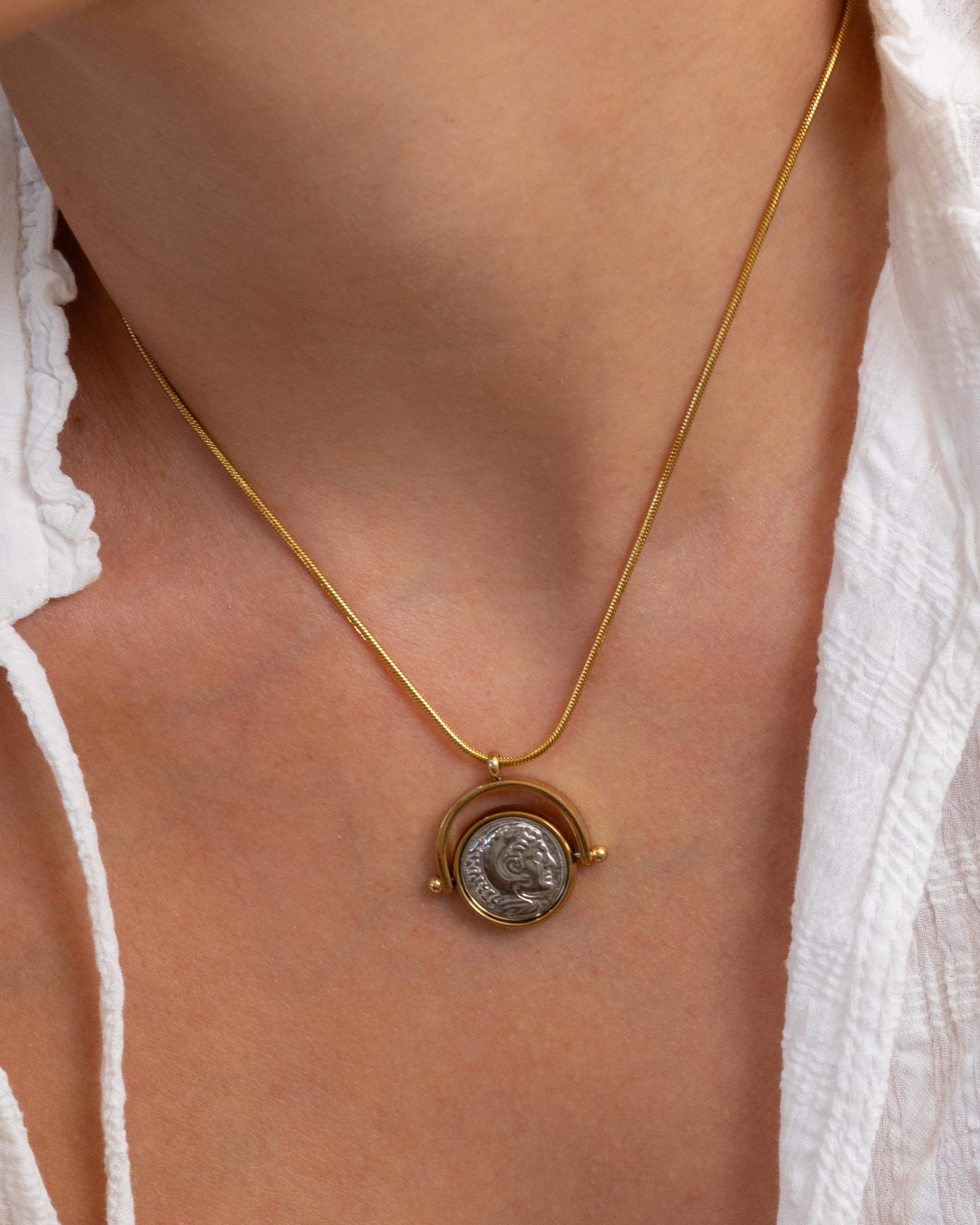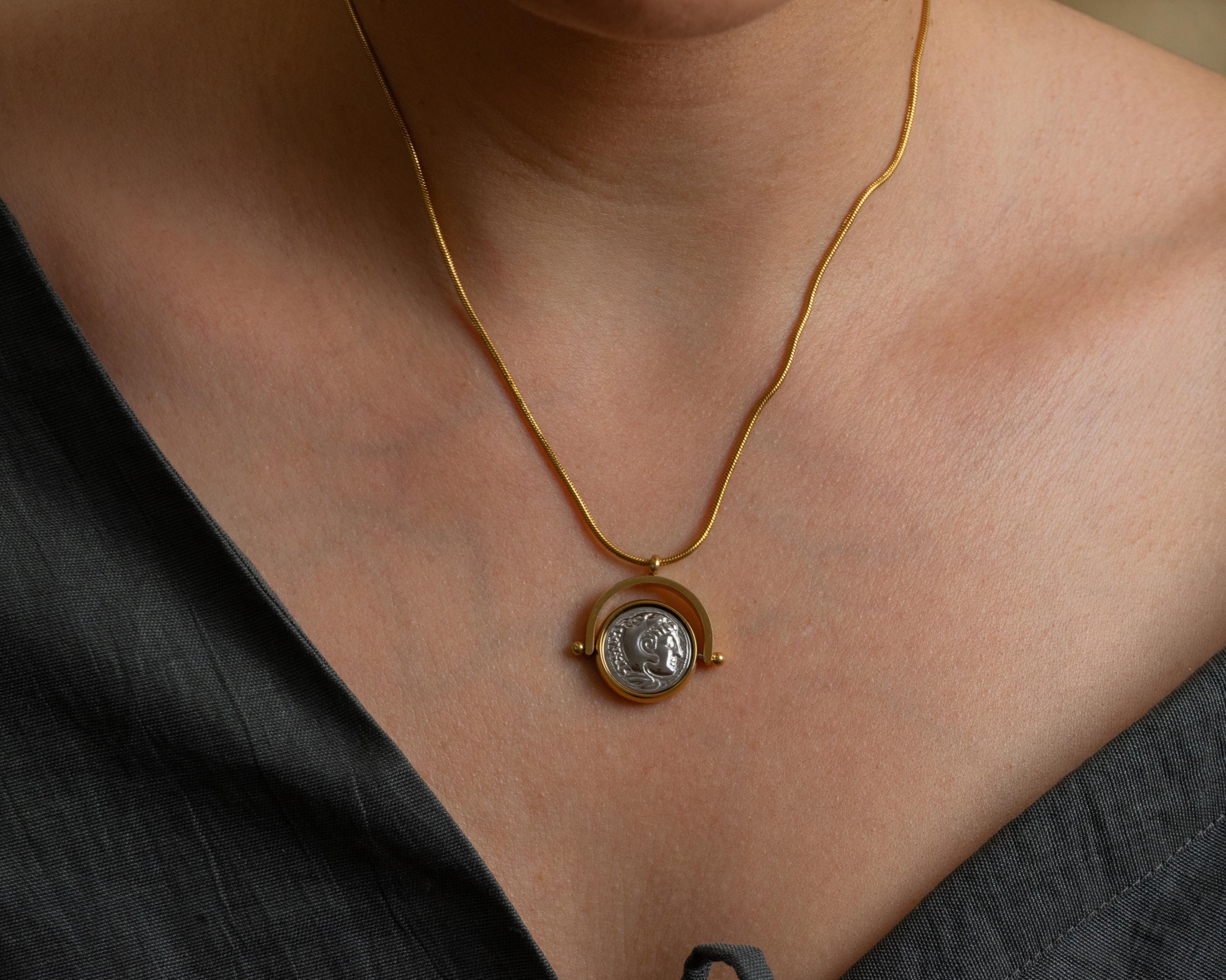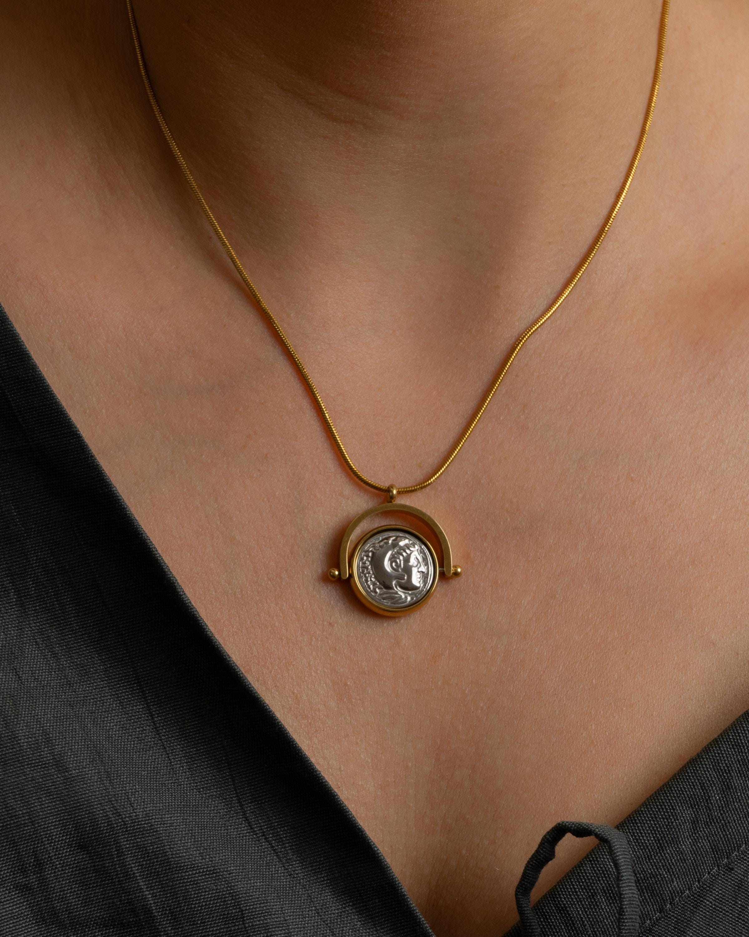 This Hercules & Zeus Swivel Coin Necklace is a unique statement piece inspired by ancient Greek mythology. Featuring a 17mm two-tone stainless steel pendant with Hercules on one side and Zeus on the other, the medallion swivels within a modern gold-plated frame.