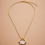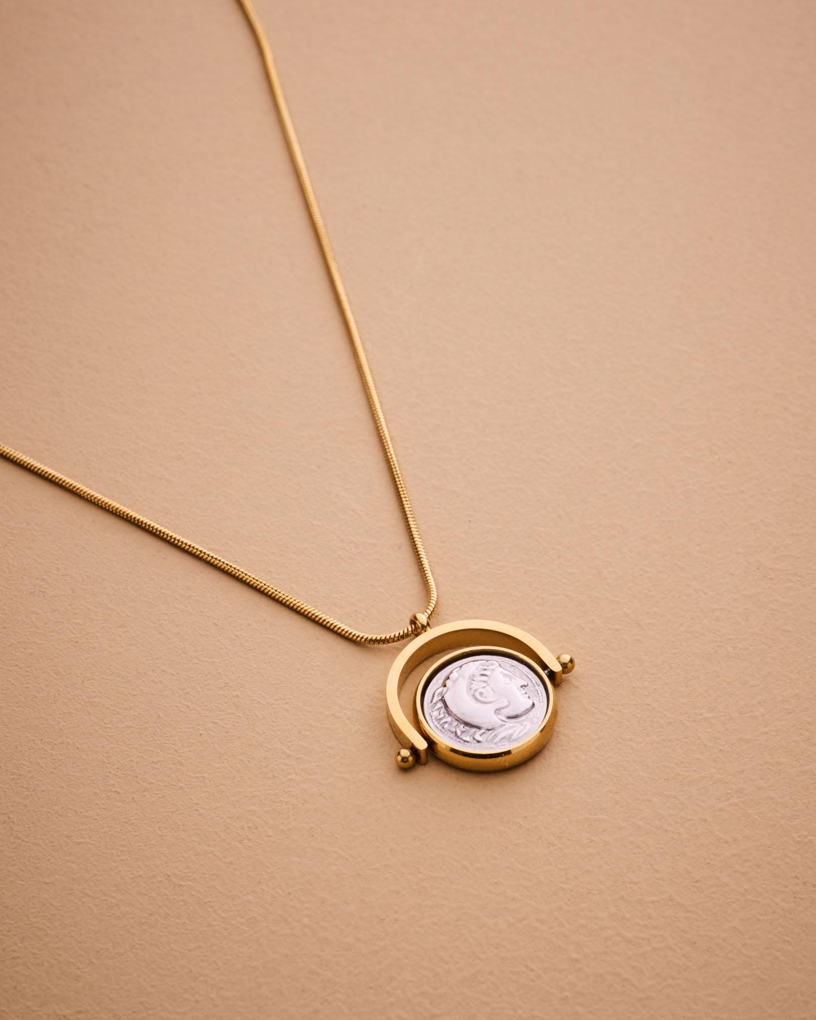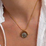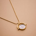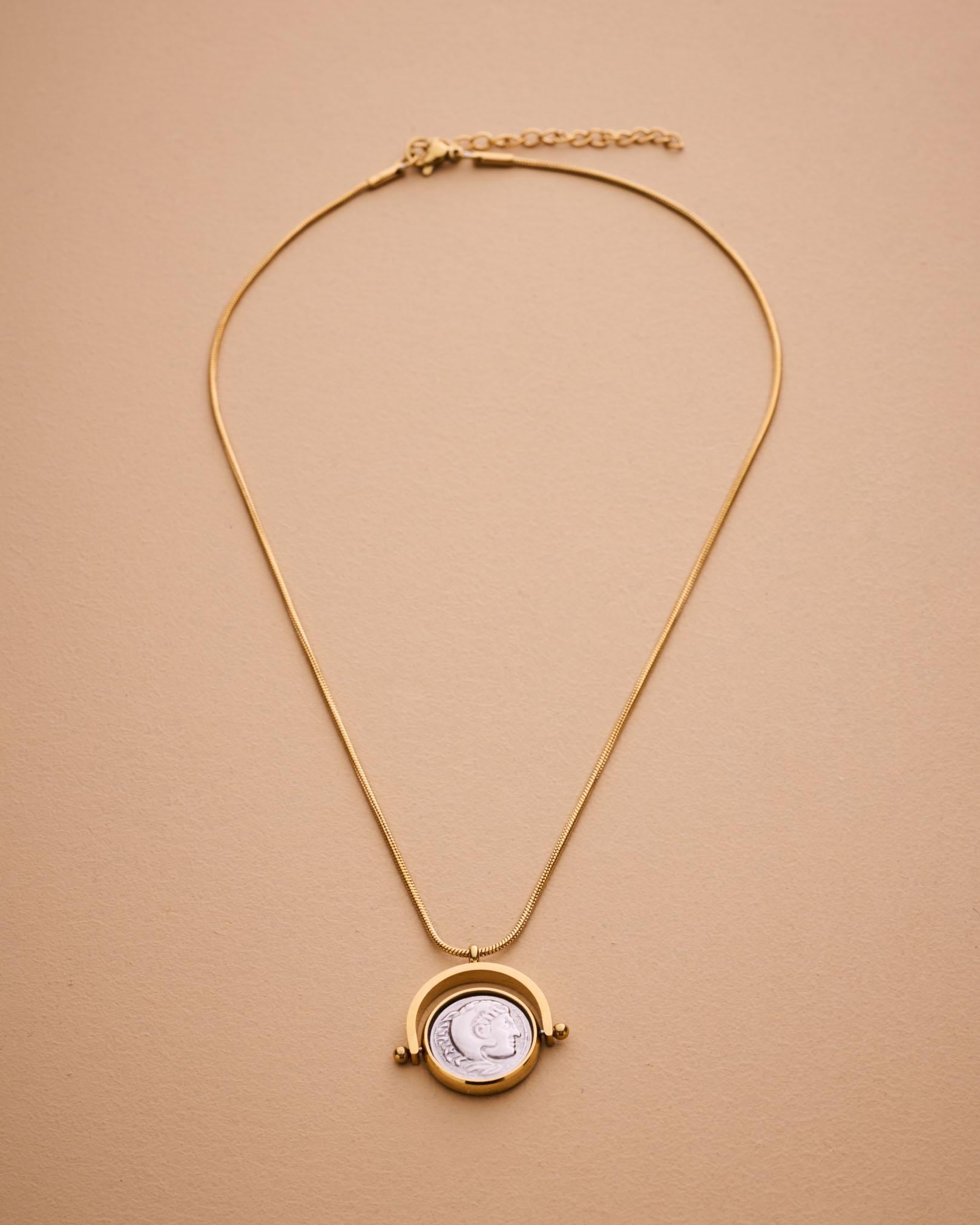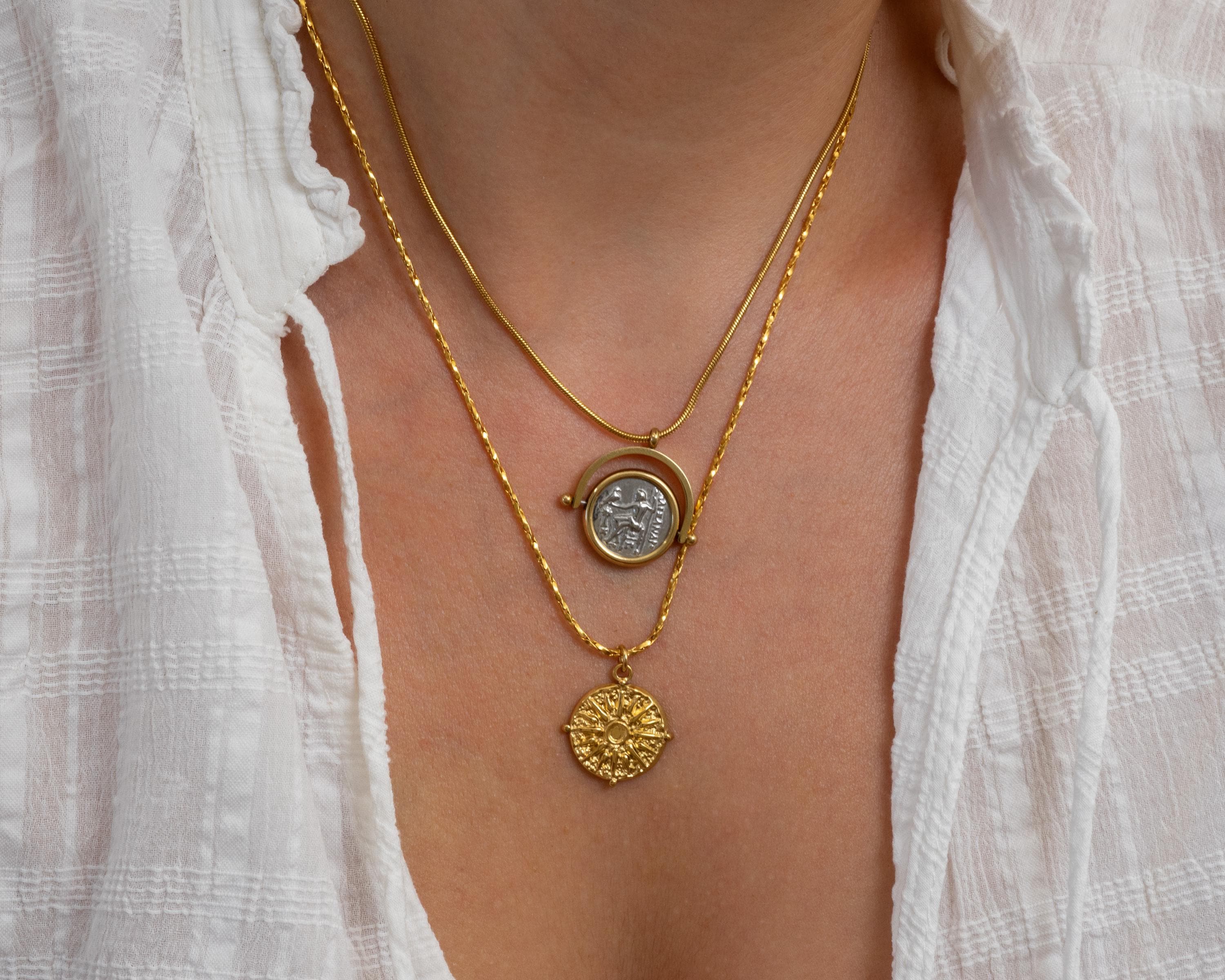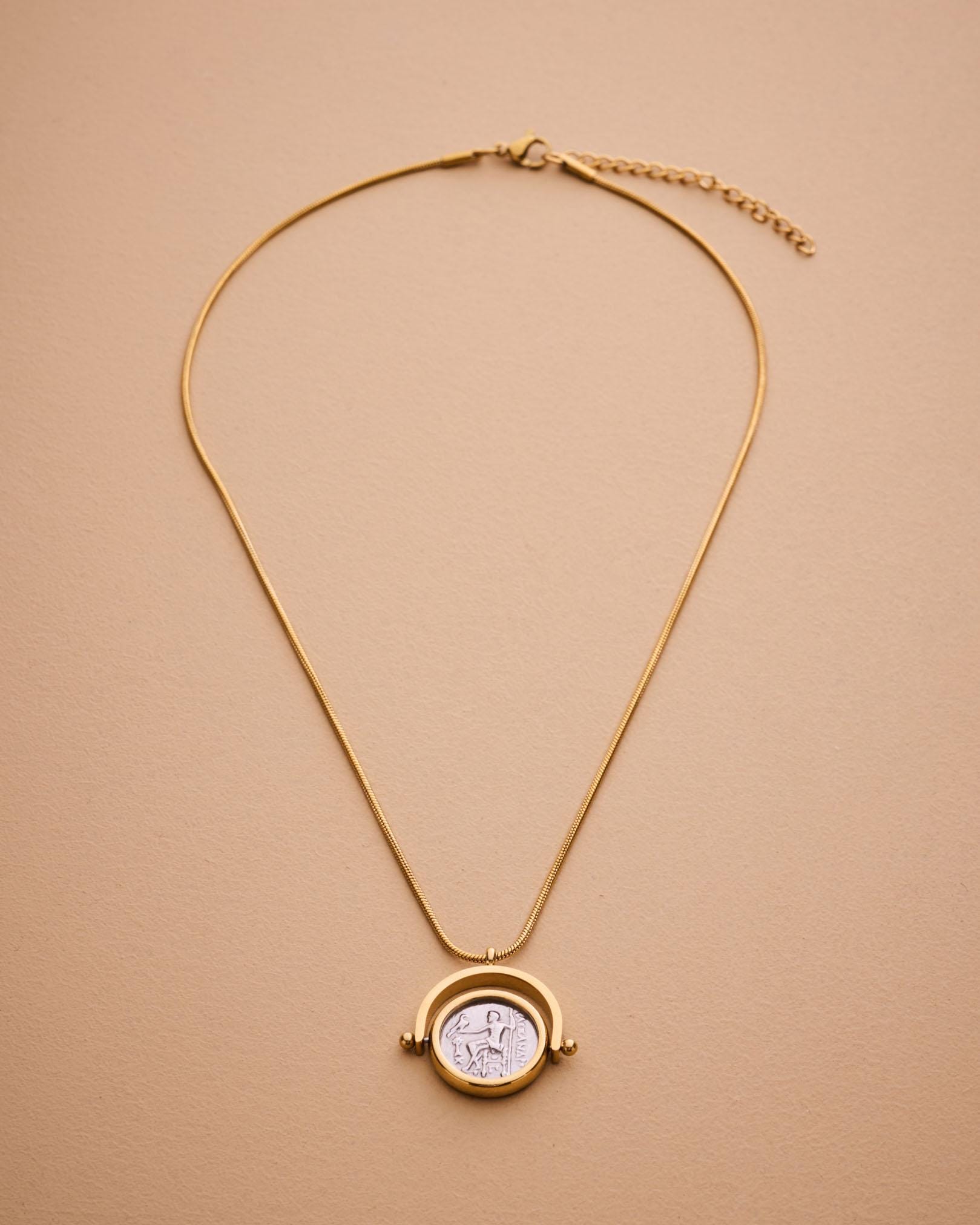 This Hercules & Zeus Swivel Coin Necklace is a unique statement piece inspired by ancient Greek mythology. Featuring a 17mm two-tone stainless steel pendant with Hercules on one side and Zeus on the other, the medallion swivels within a modern gold-plated frame.