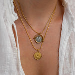 - Finish: Two-tone coin (silver and gold), gold snake chain