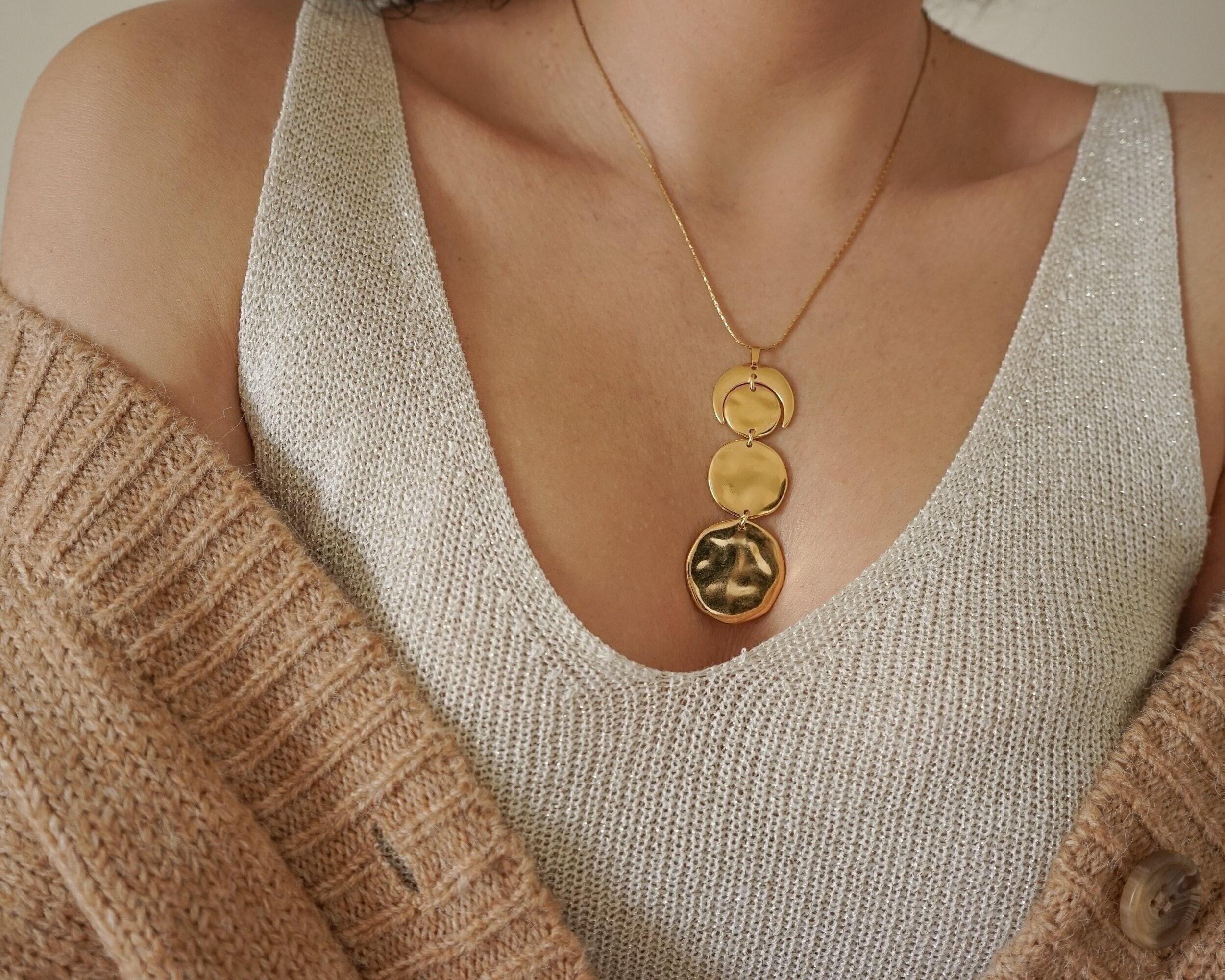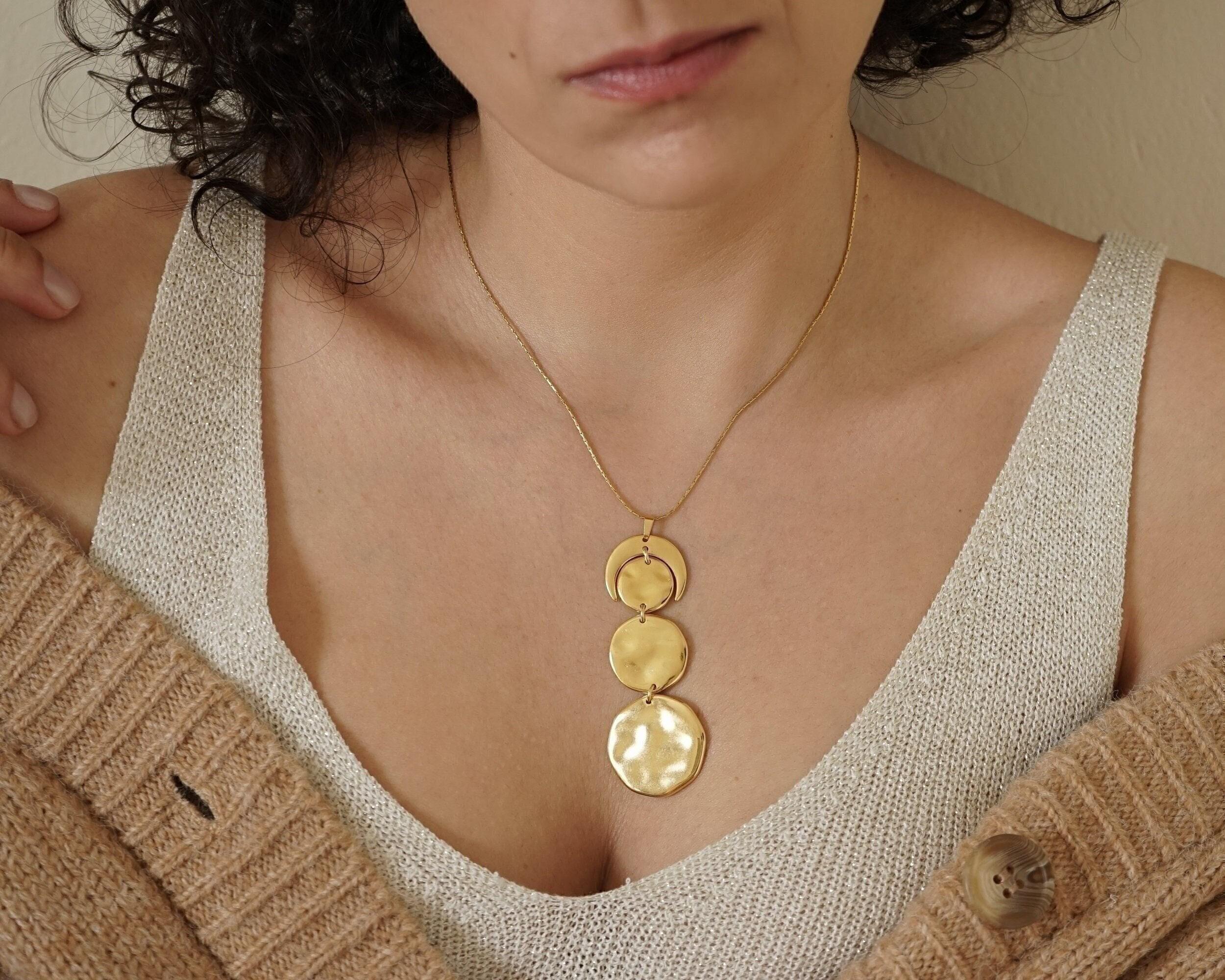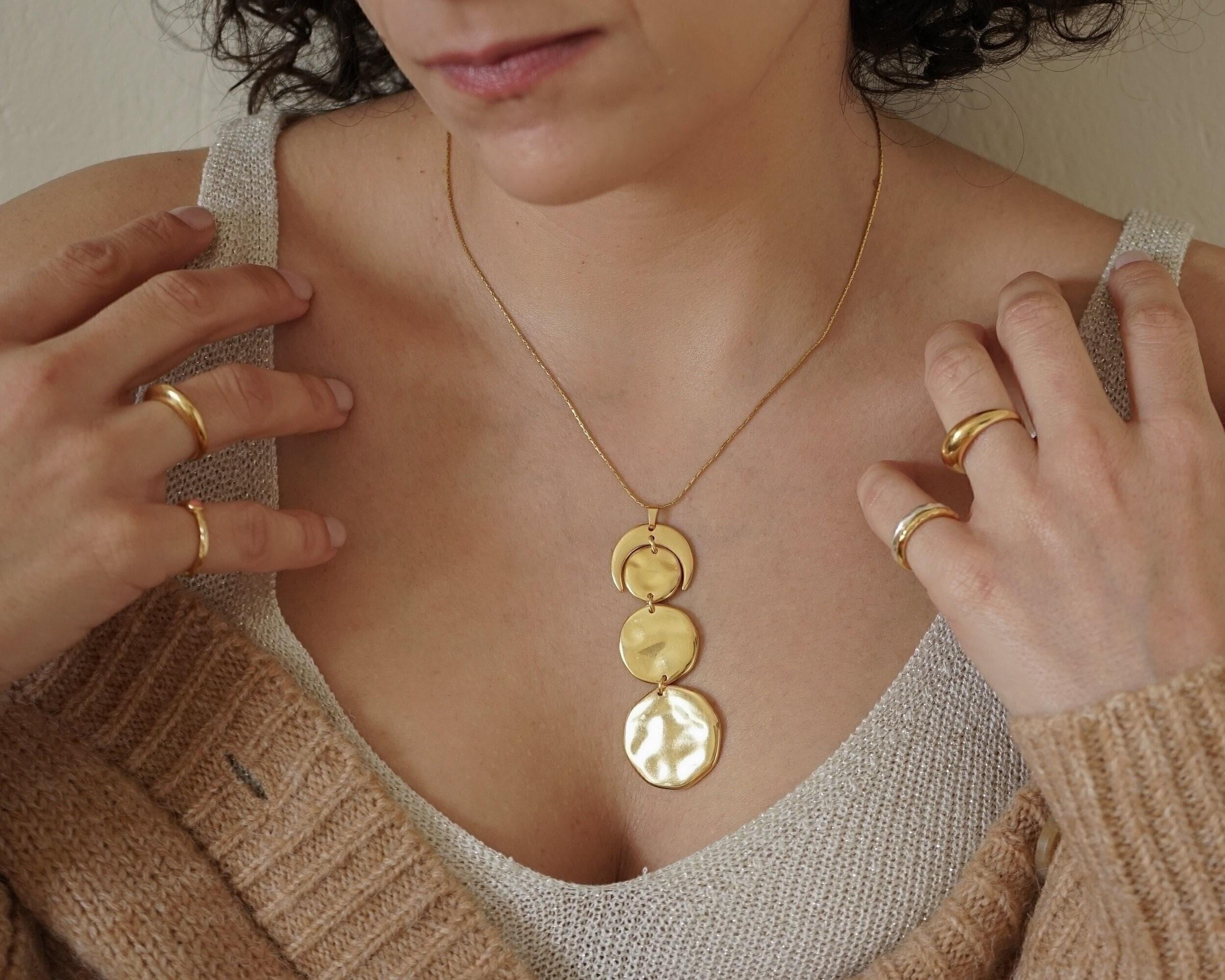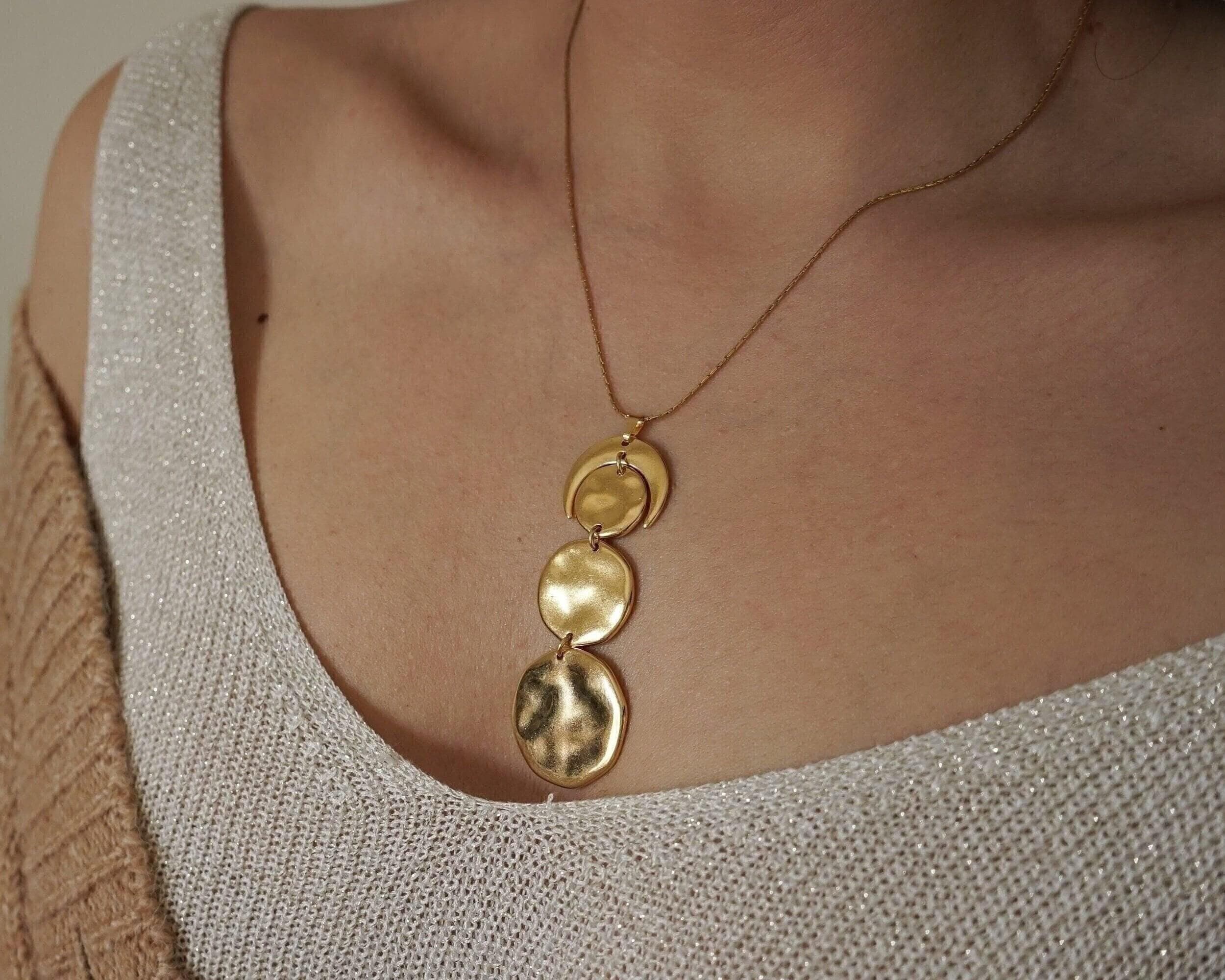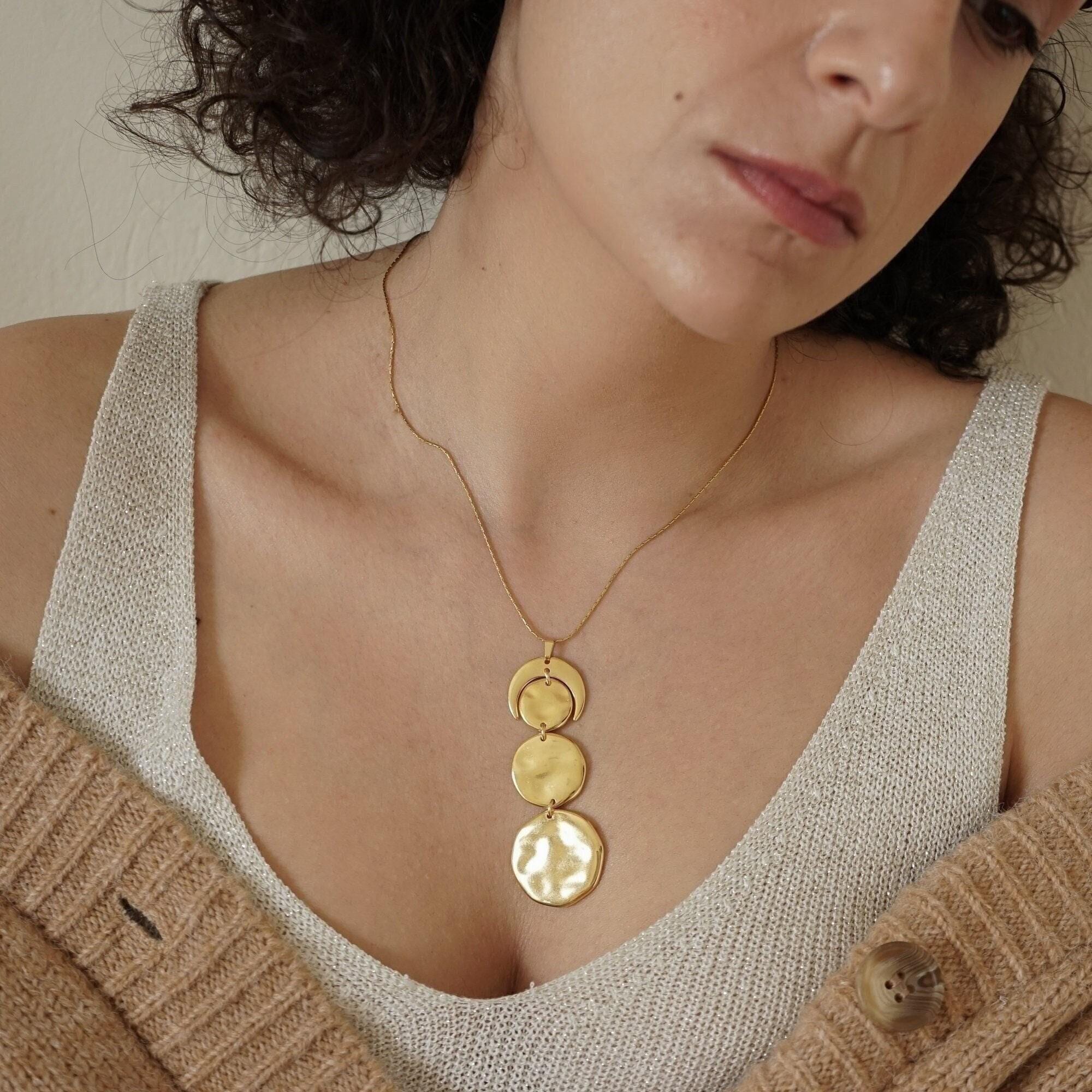 Get ready to shine this season with our fabulous Gold Hammered Discs Necklace! This stunning gold-plated necklace is designed to turn heads and add a touch of glamour to any outfit. Featuring three chic hammered coin connectors in different sizes, along with a lovely moon connector, it’s the perfect accessory for jumpers, T-shirts, or even those elegant silk shirts in your wardrobe.