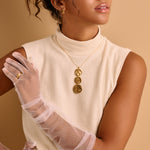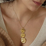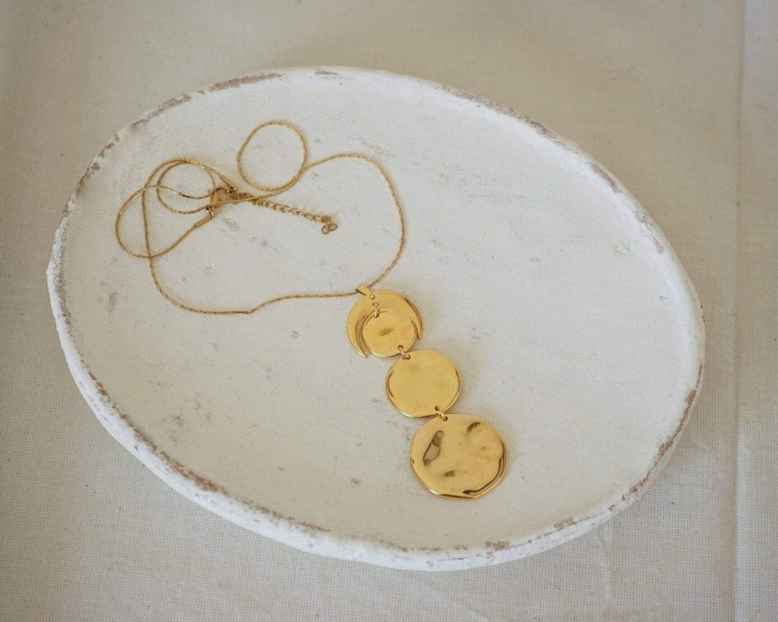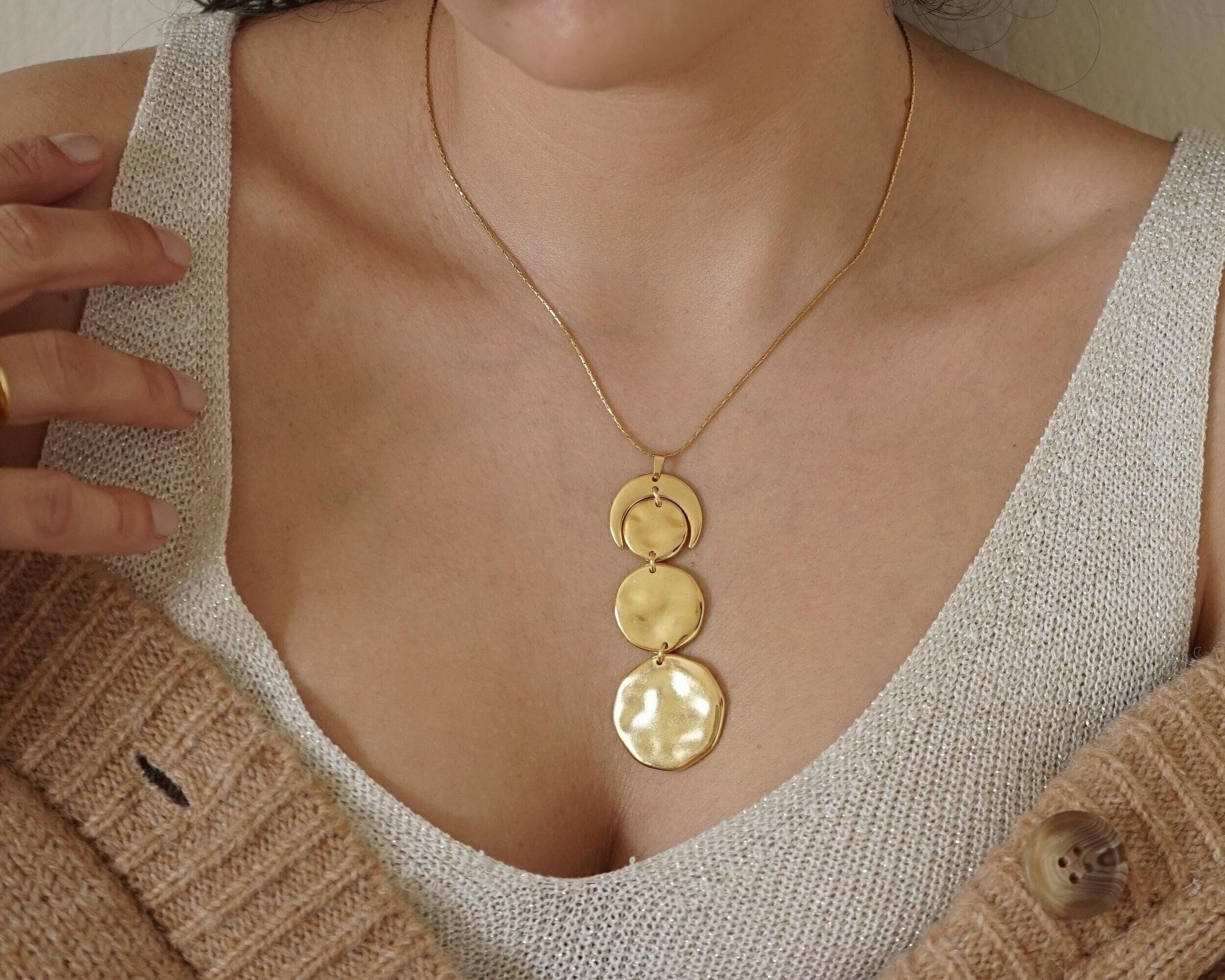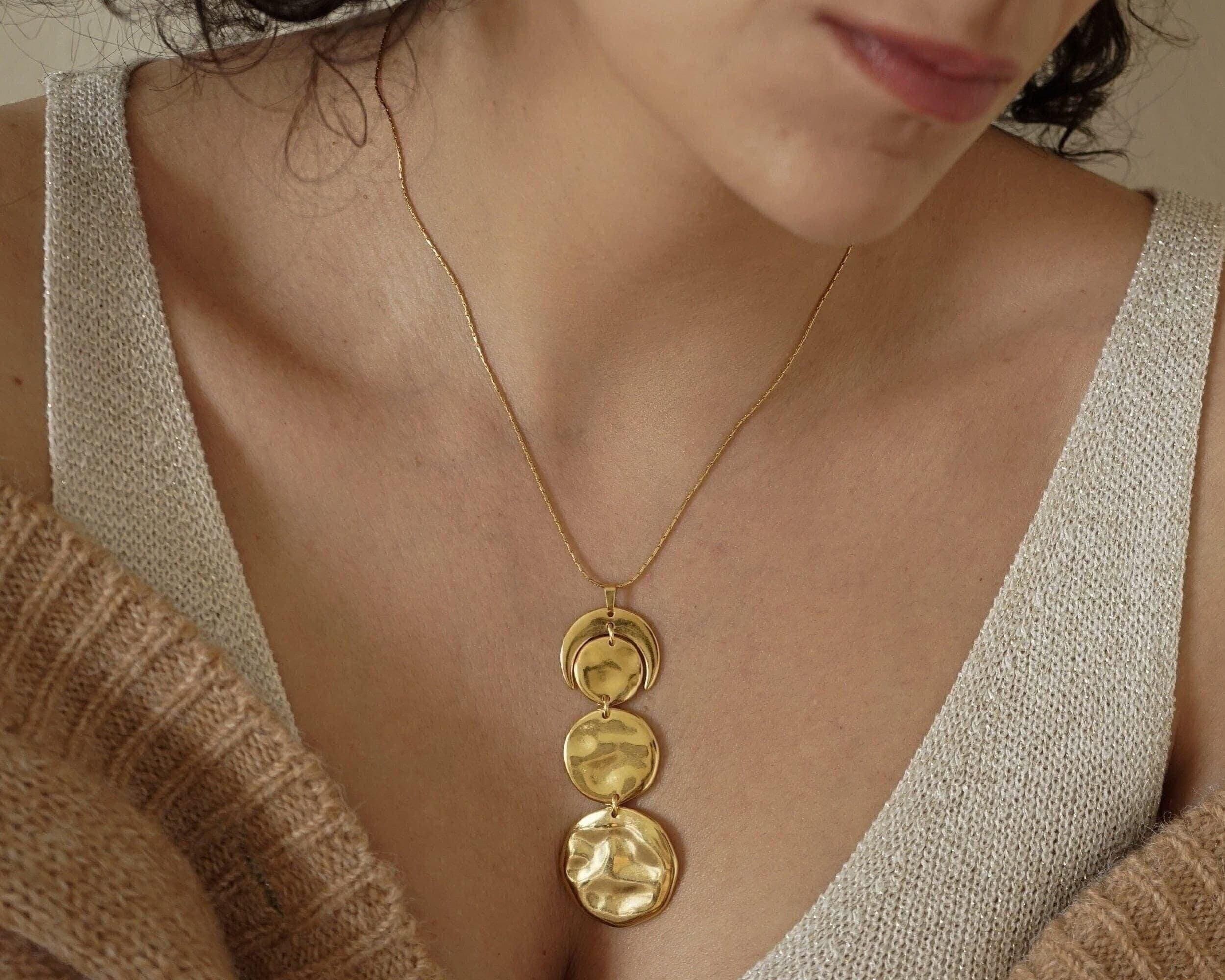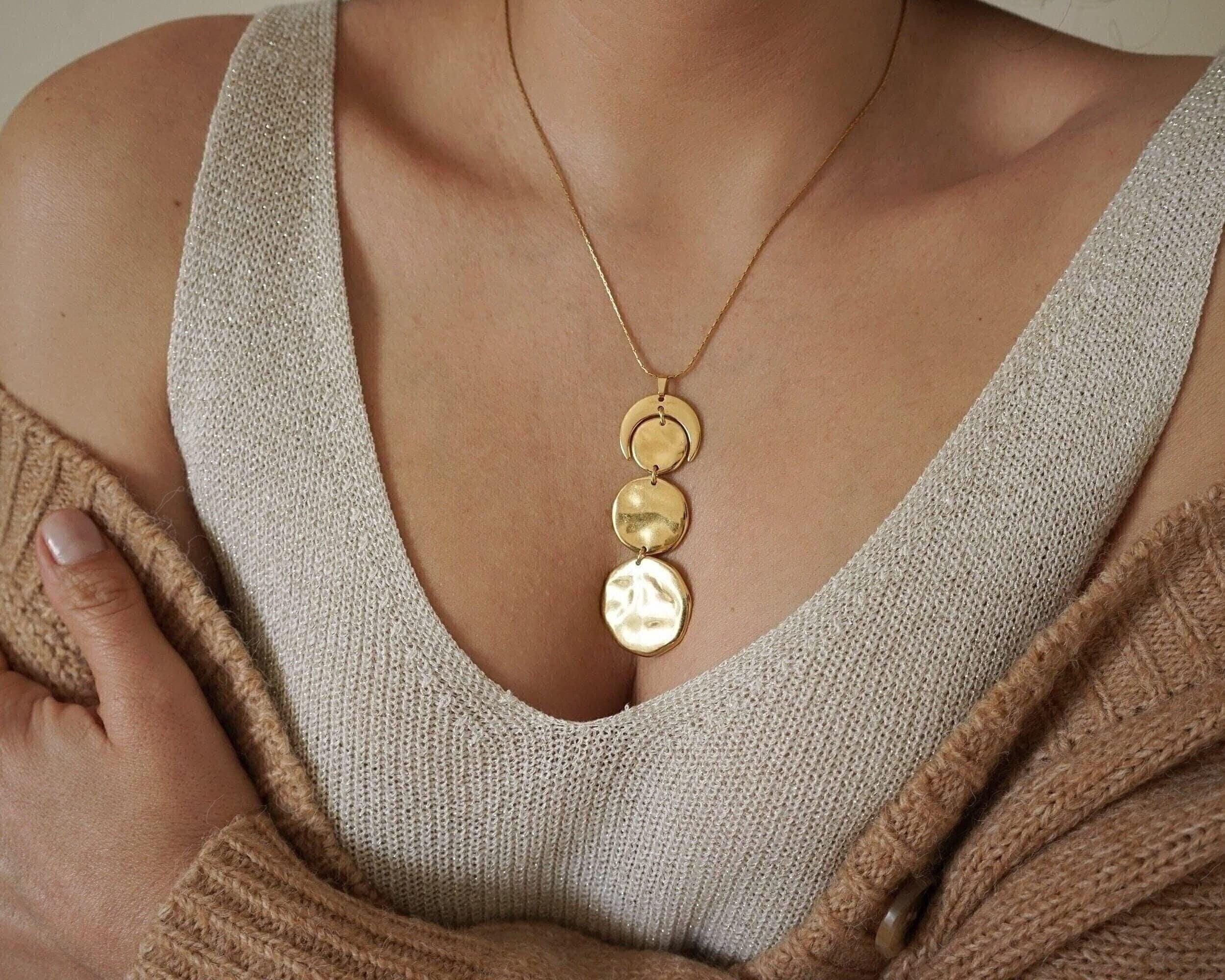Get ready to shine this season with our fabulous Gold Hammered Discs Necklace! This stunning gold-plated necklace is designed to turn heads and add a touch of glamour to any outfit. Featuring three chic hammered coin connectors in different sizes, along with a lovely moon connector, it’s the perfect accessory for jumpers, T-shirts, or even those elegant silk shirts in your wardrobe.