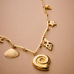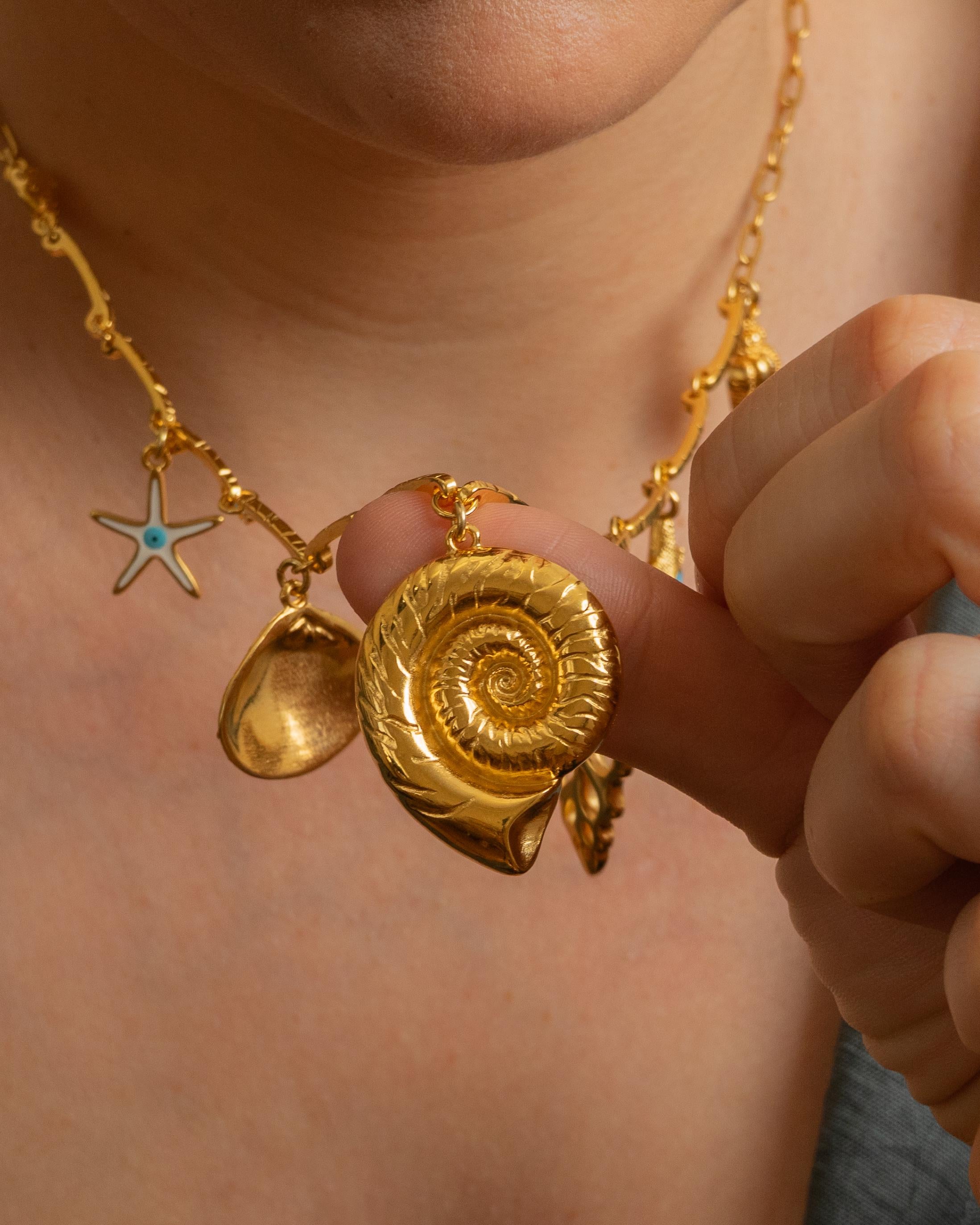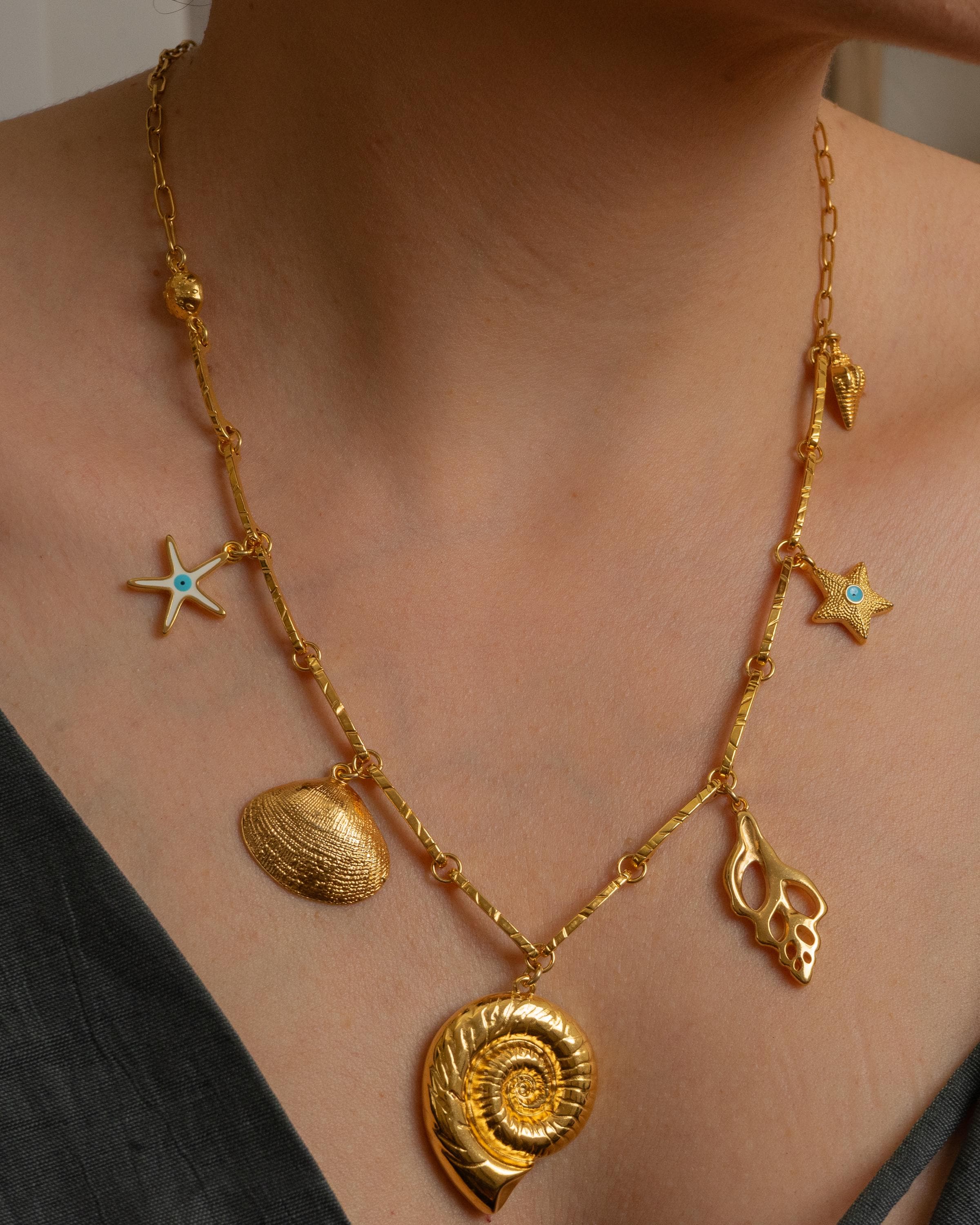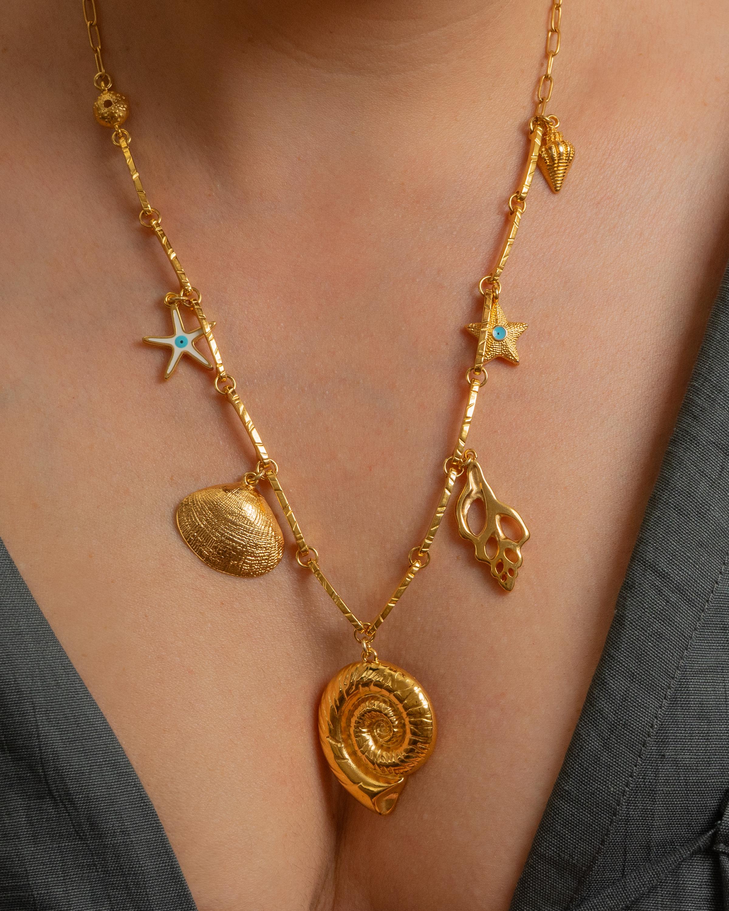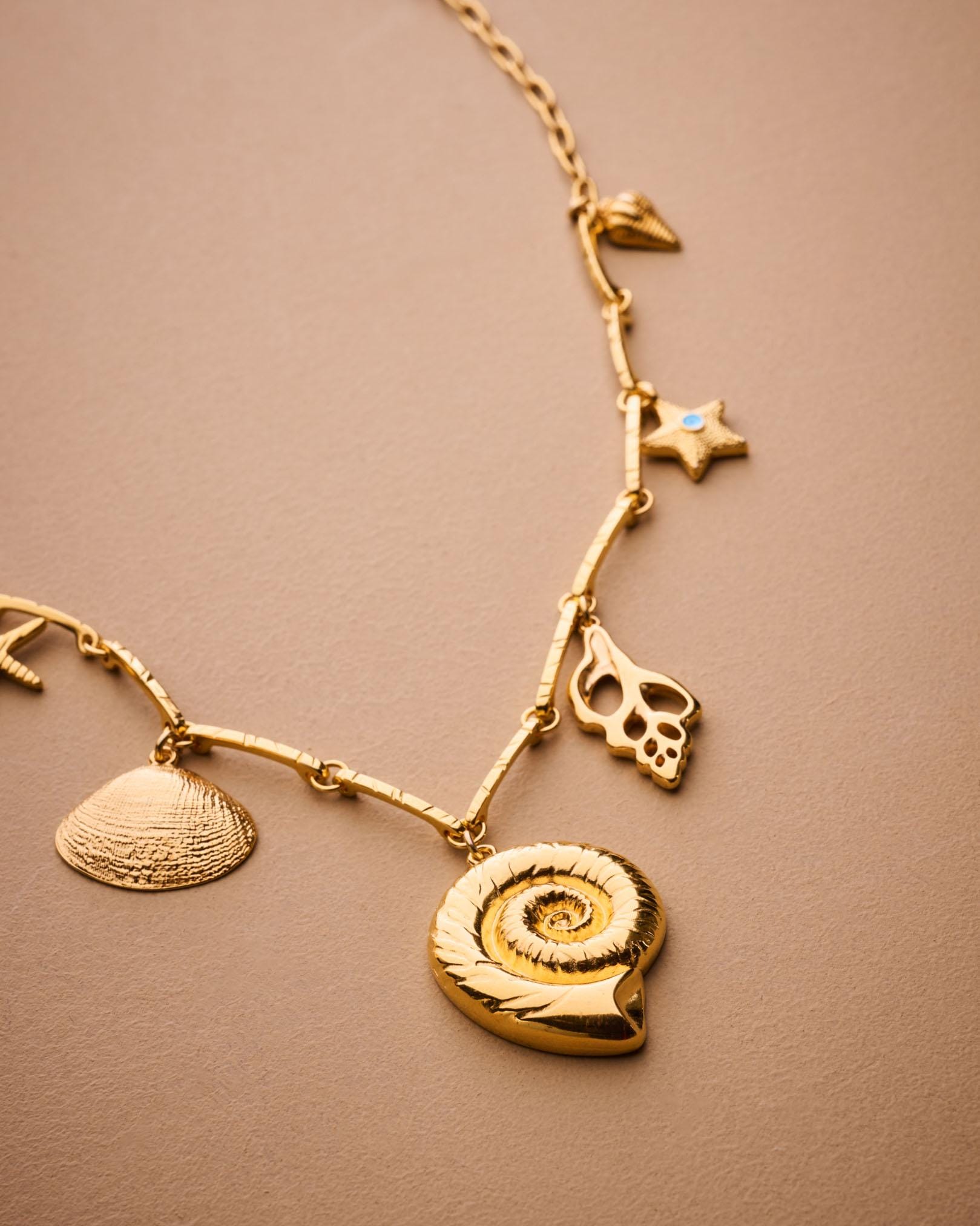 This gold sea charm necklace blends sculptural forms with a sun-drenched finish. Featuring a mix of gold-plated zamak pendants—a detailed nautilus shell, clamshell, and an open Triton motif—this necklace is the ultimate beach-ready statement piece.