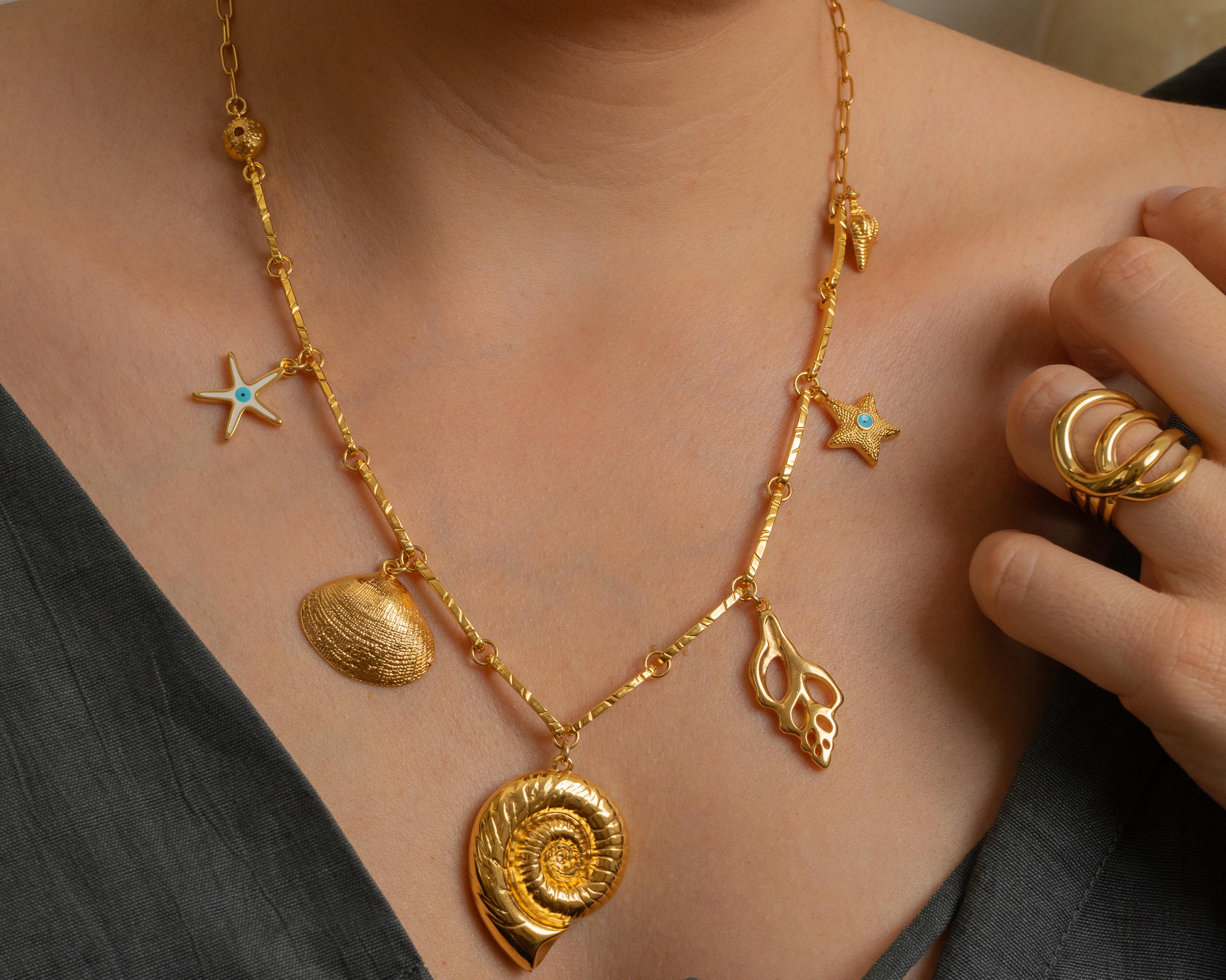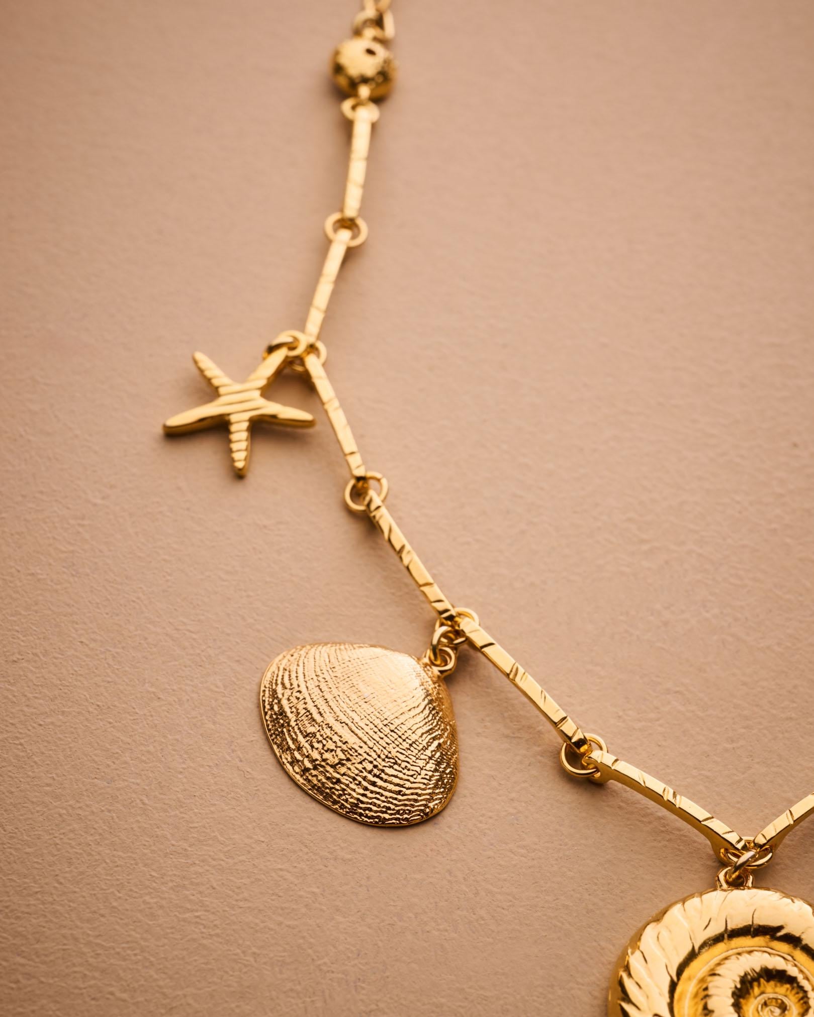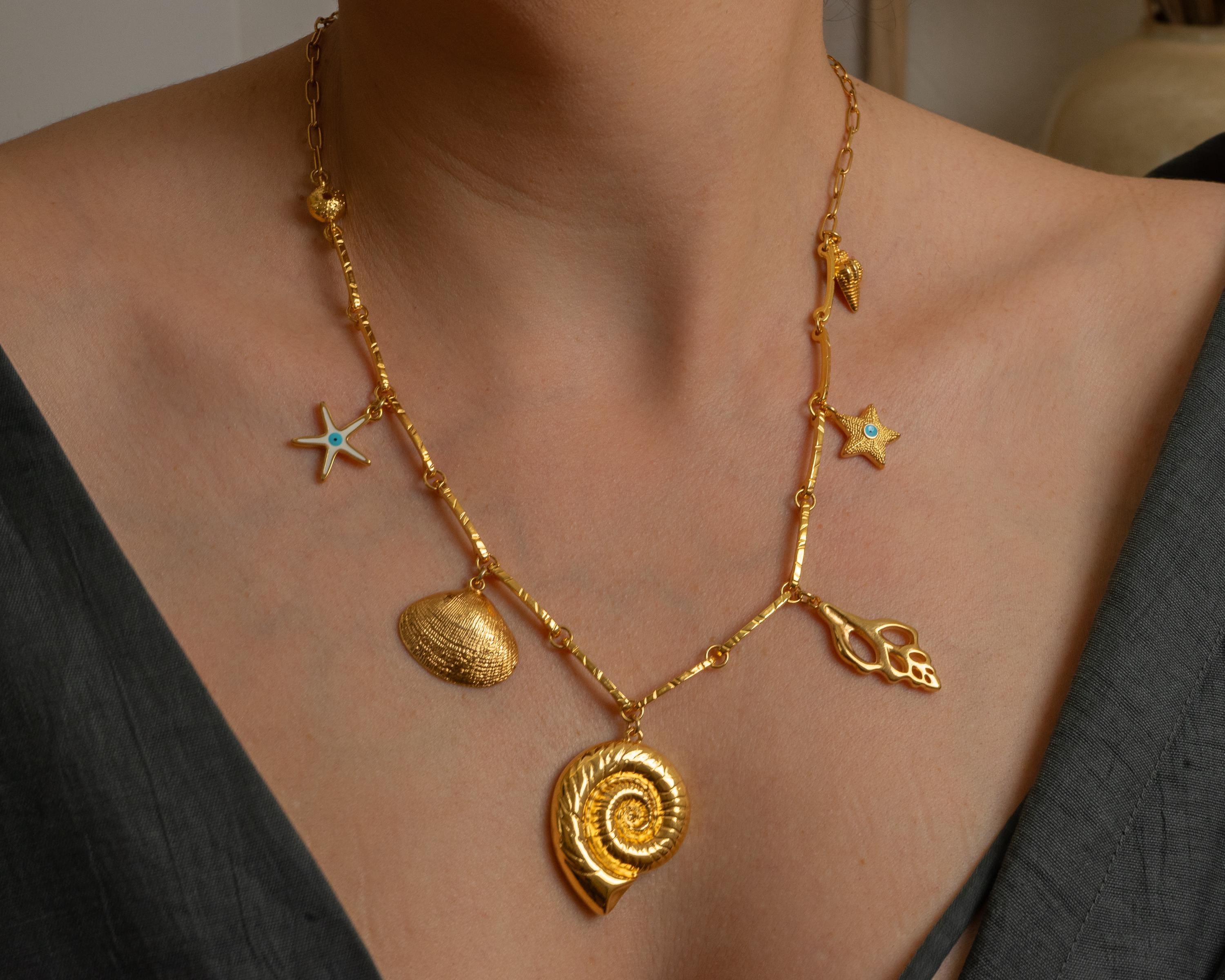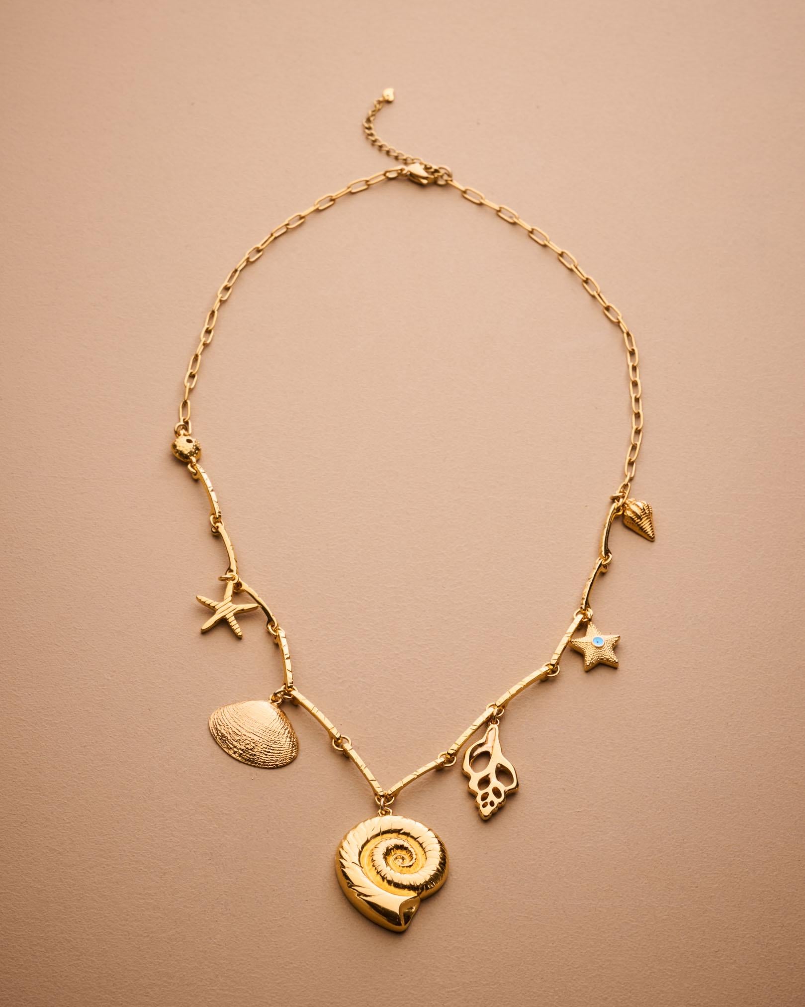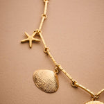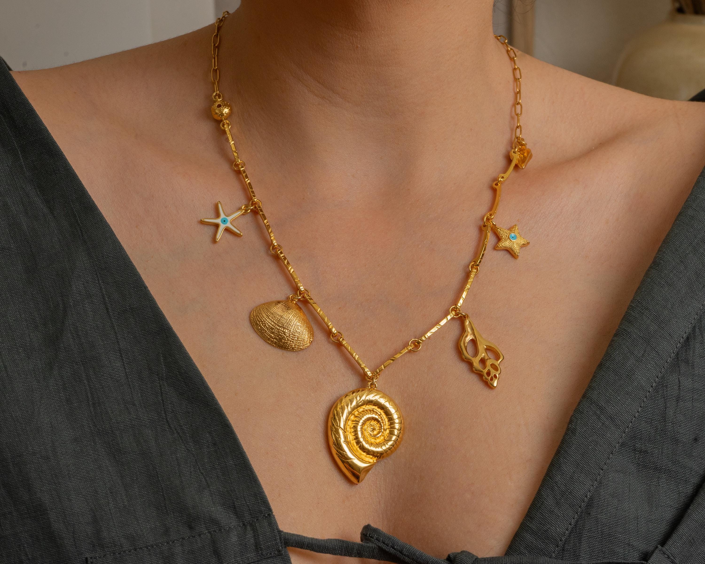 This gold sea charm necklace blends sculptural forms with a sun-drenched finish. Featuring a mix of gold-plated zamak pendants—a detailed nautilus shell, clamshell, and an open Triton motif—this necklace is the ultimate beach-ready statement piece.