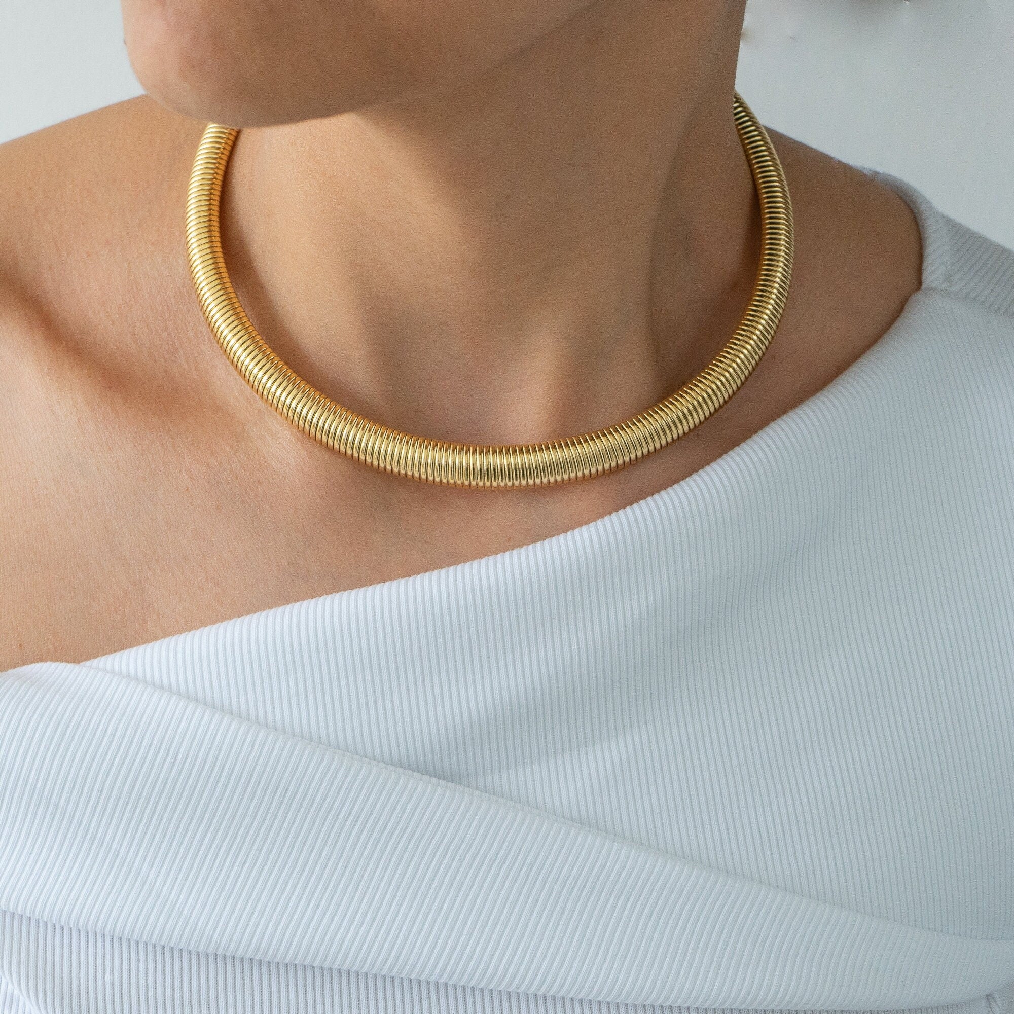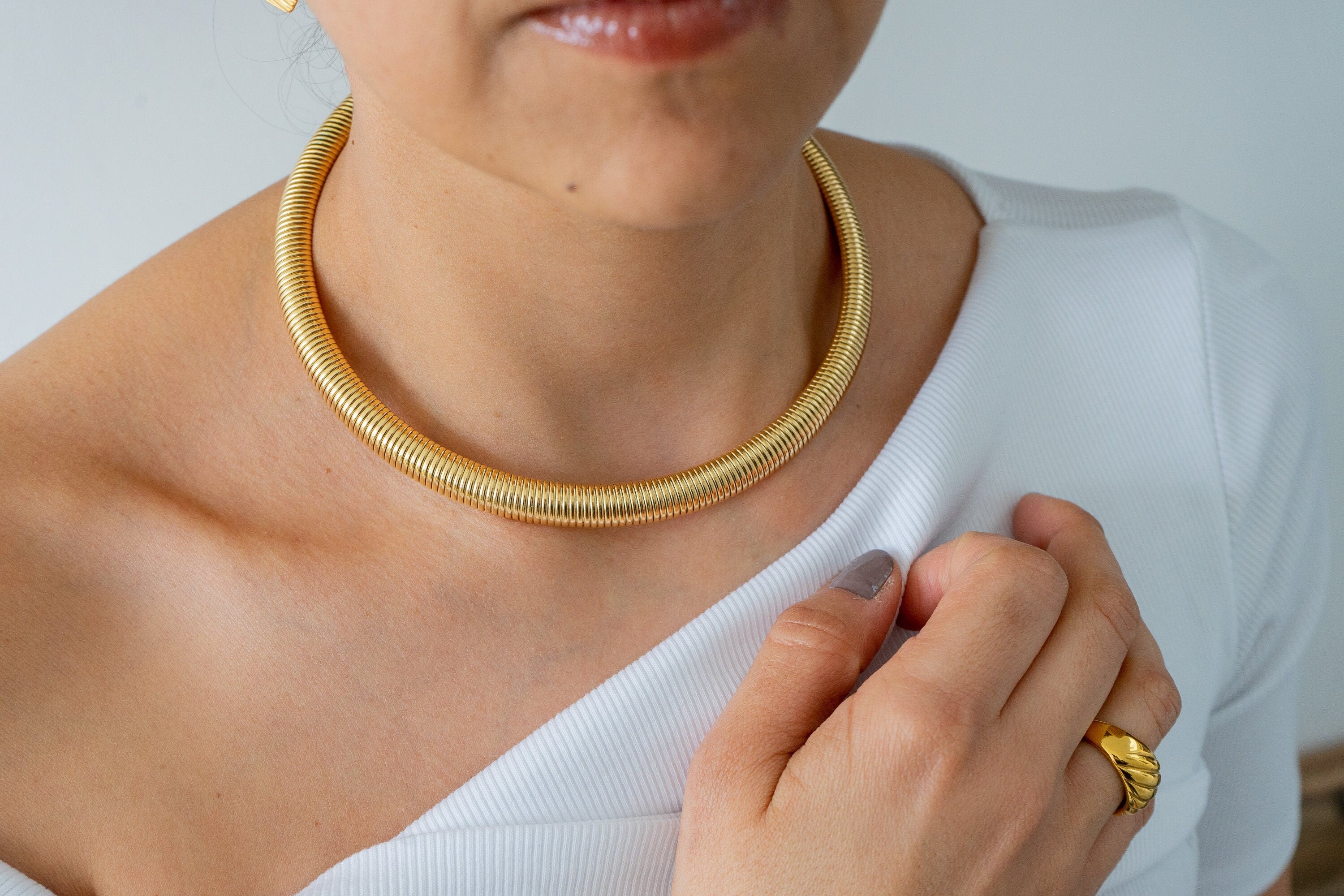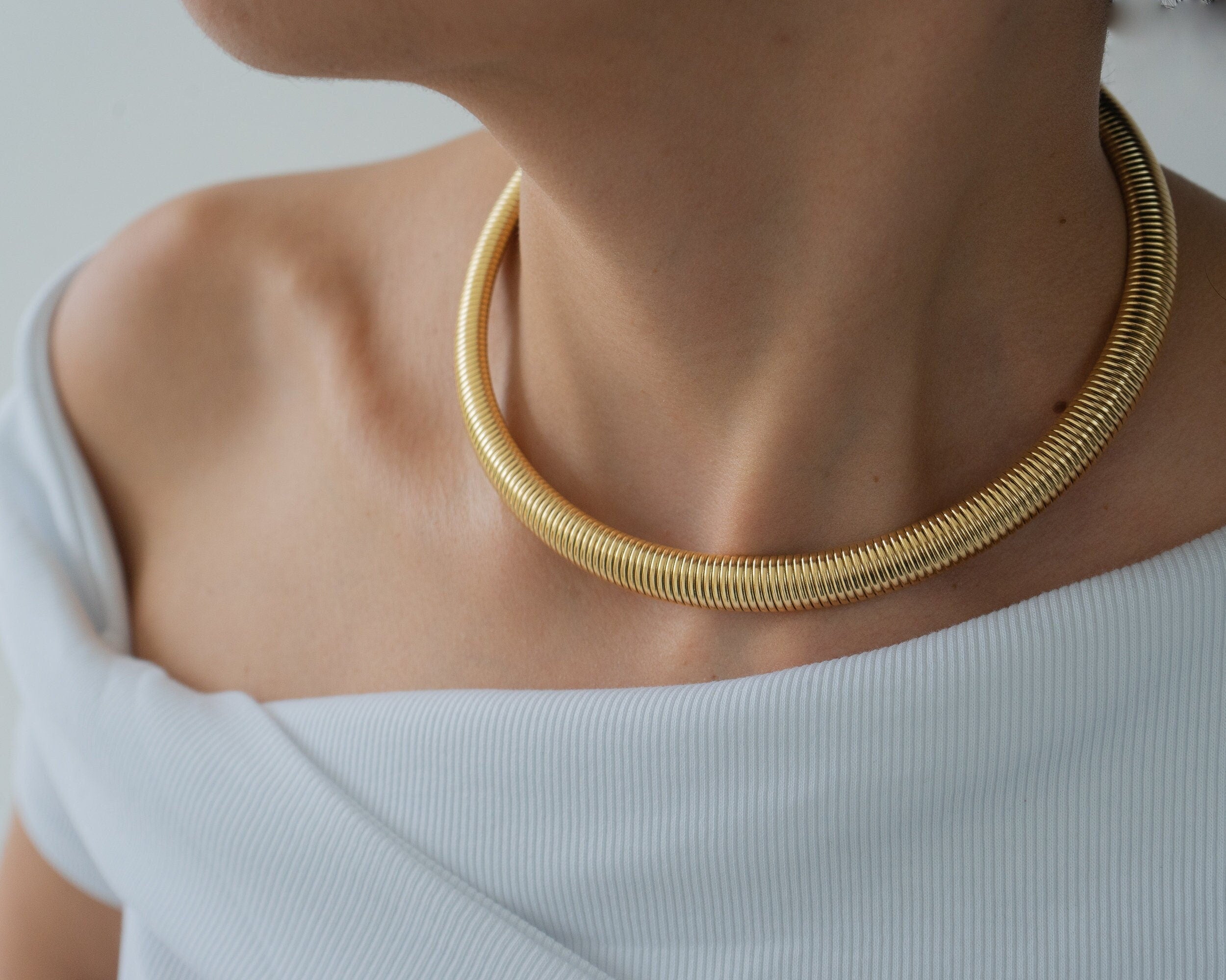Elevate your style this season with the gold oversized snake collar, a striking necklace designed to enhance any outfit. Expertly crafted from high-quality stainless steel, this piece combines strength and durability with rust resistance, ensuring it retains its luster over time. Its smooth, serpentine design catches the light beautifully, making it a versatile accessory that can be worn alone for a bold statement or layered with other necklaces for a unique look.