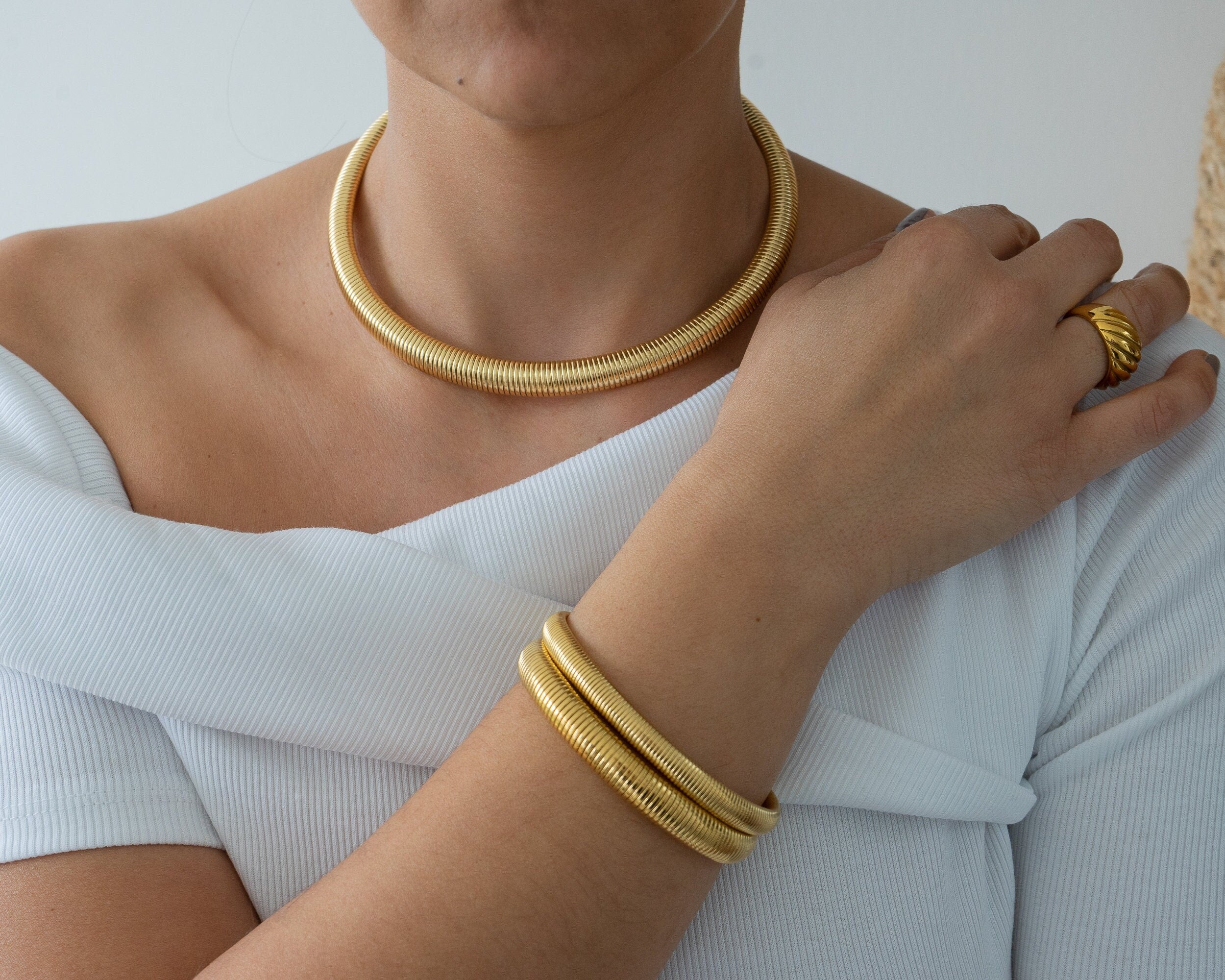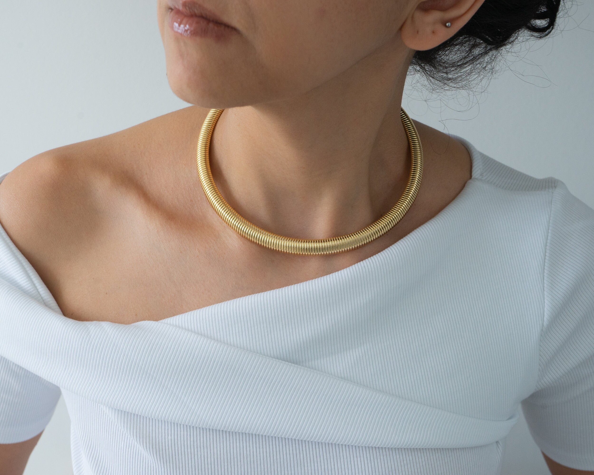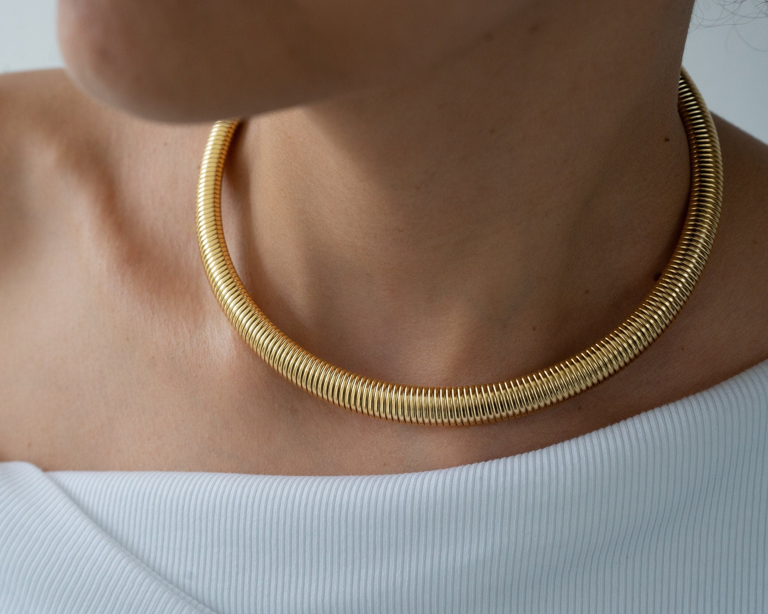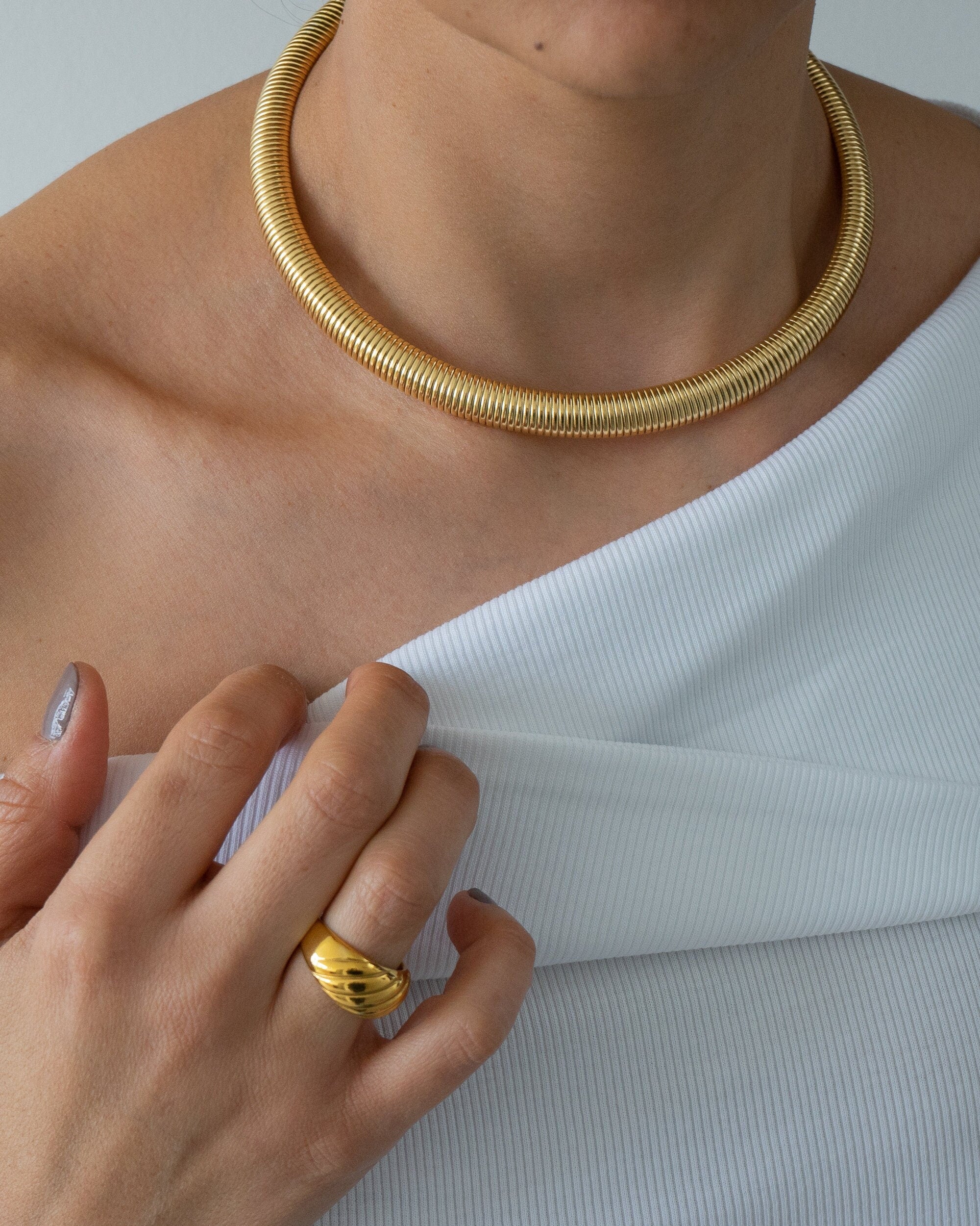 Elevate your style this season with the gold oversized snake collar, a striking necklace designed to enhance any outfit. Expertly crafted from high-quality stainless steel, this piece combines strength and durability with rust resistance, ensuring it retains its luster over time. Its smooth, serpentine design catches the light beautifully, making it a versatile accessory that can be worn alone for a bold statement or layered with other necklaces for a unique look.